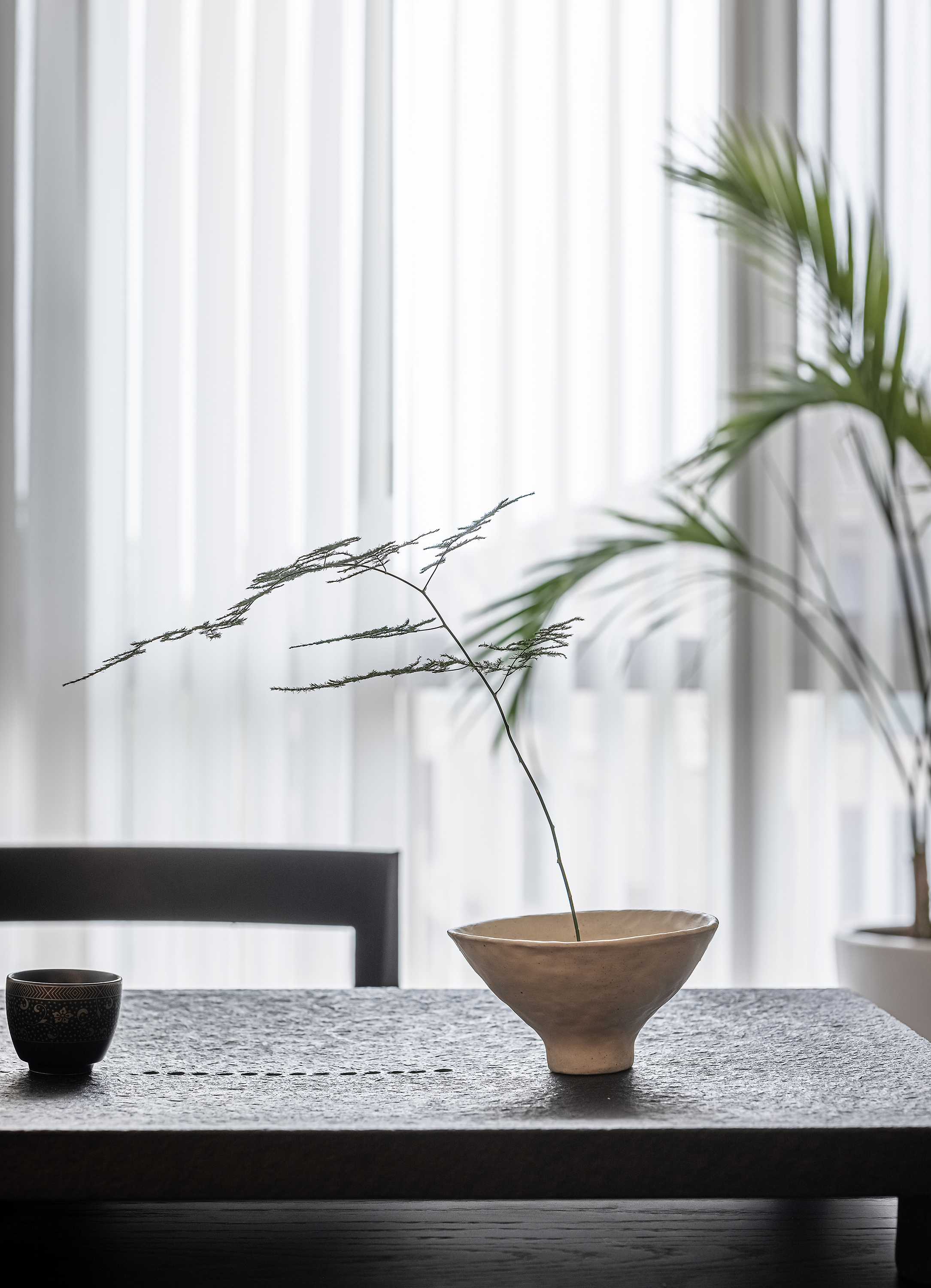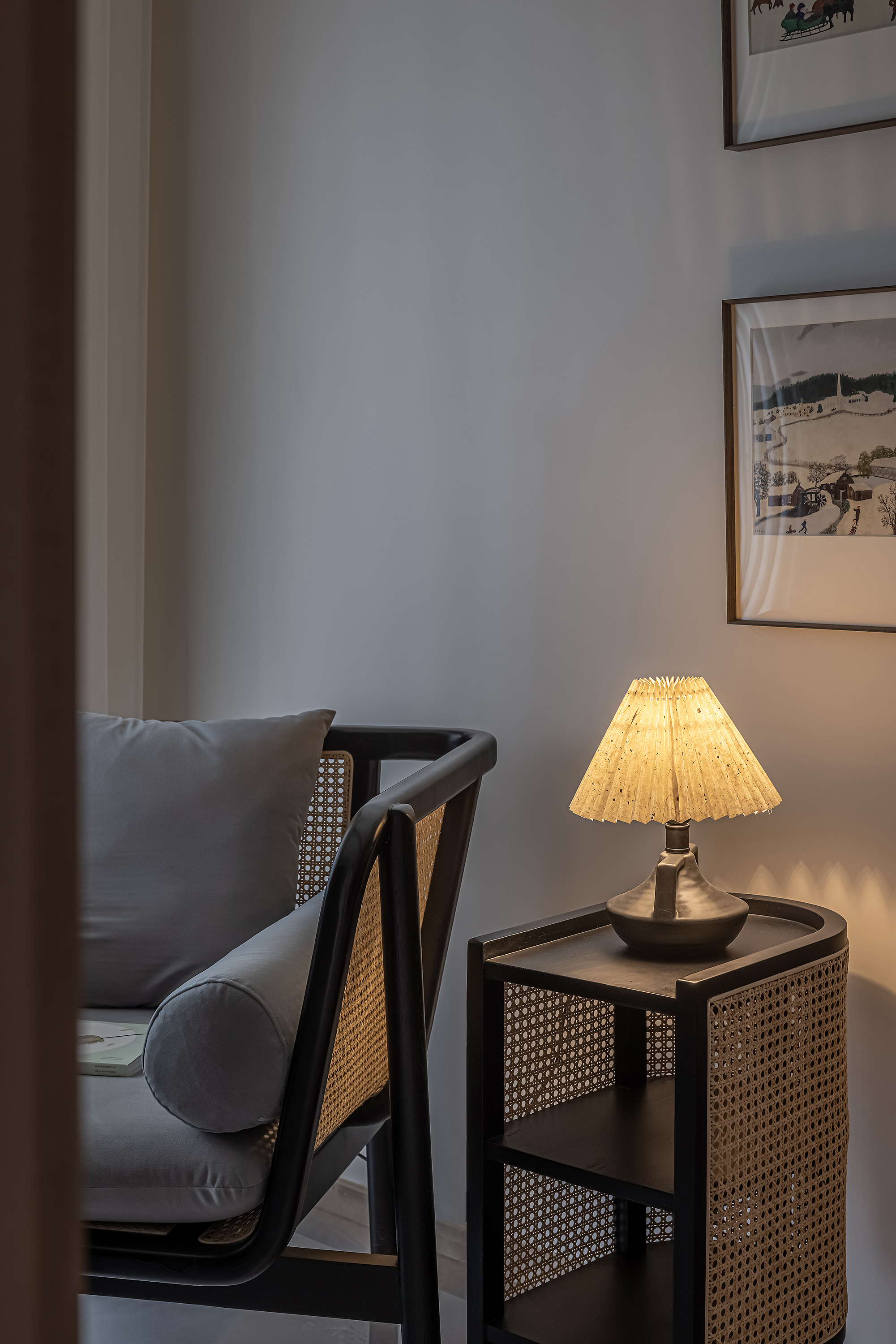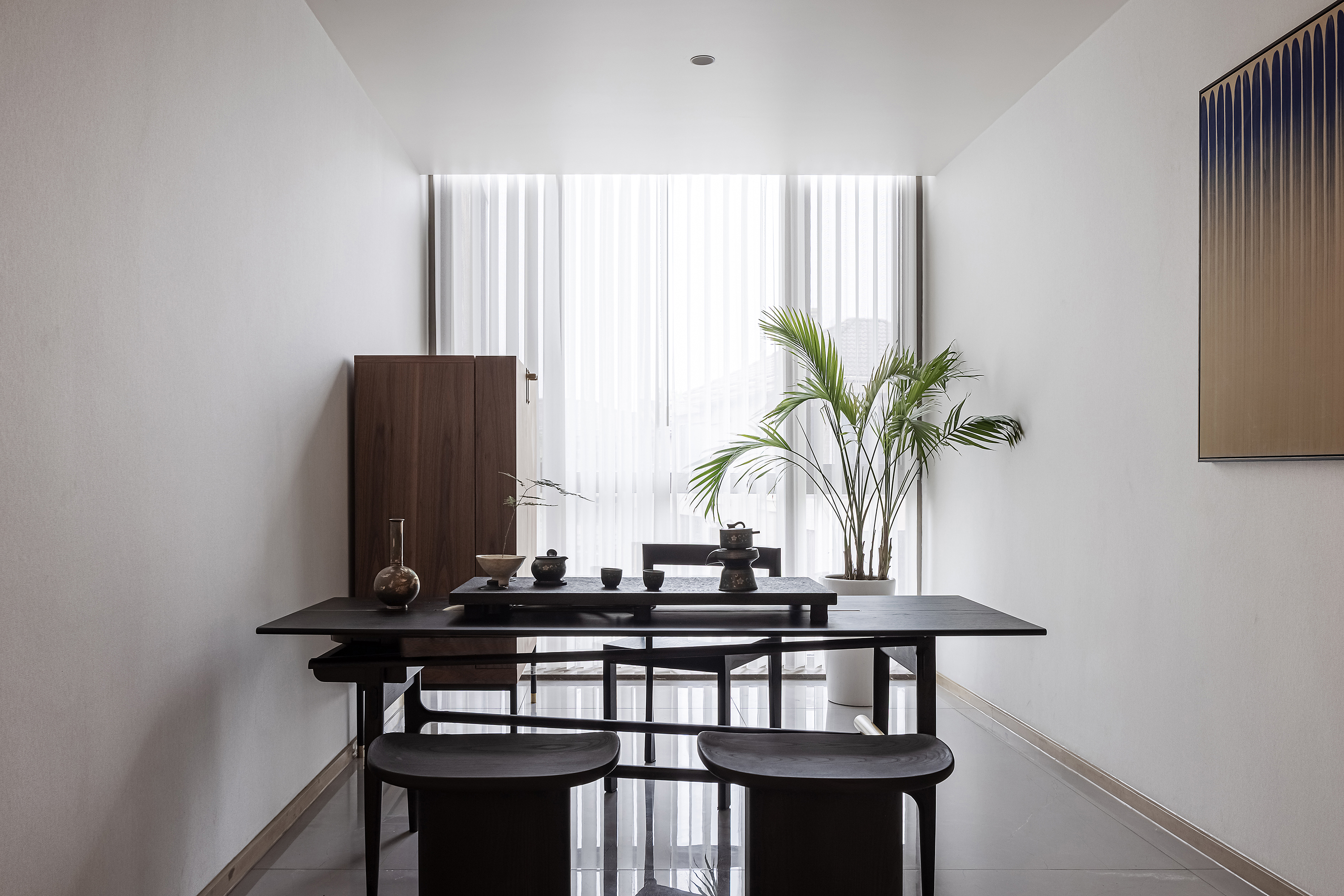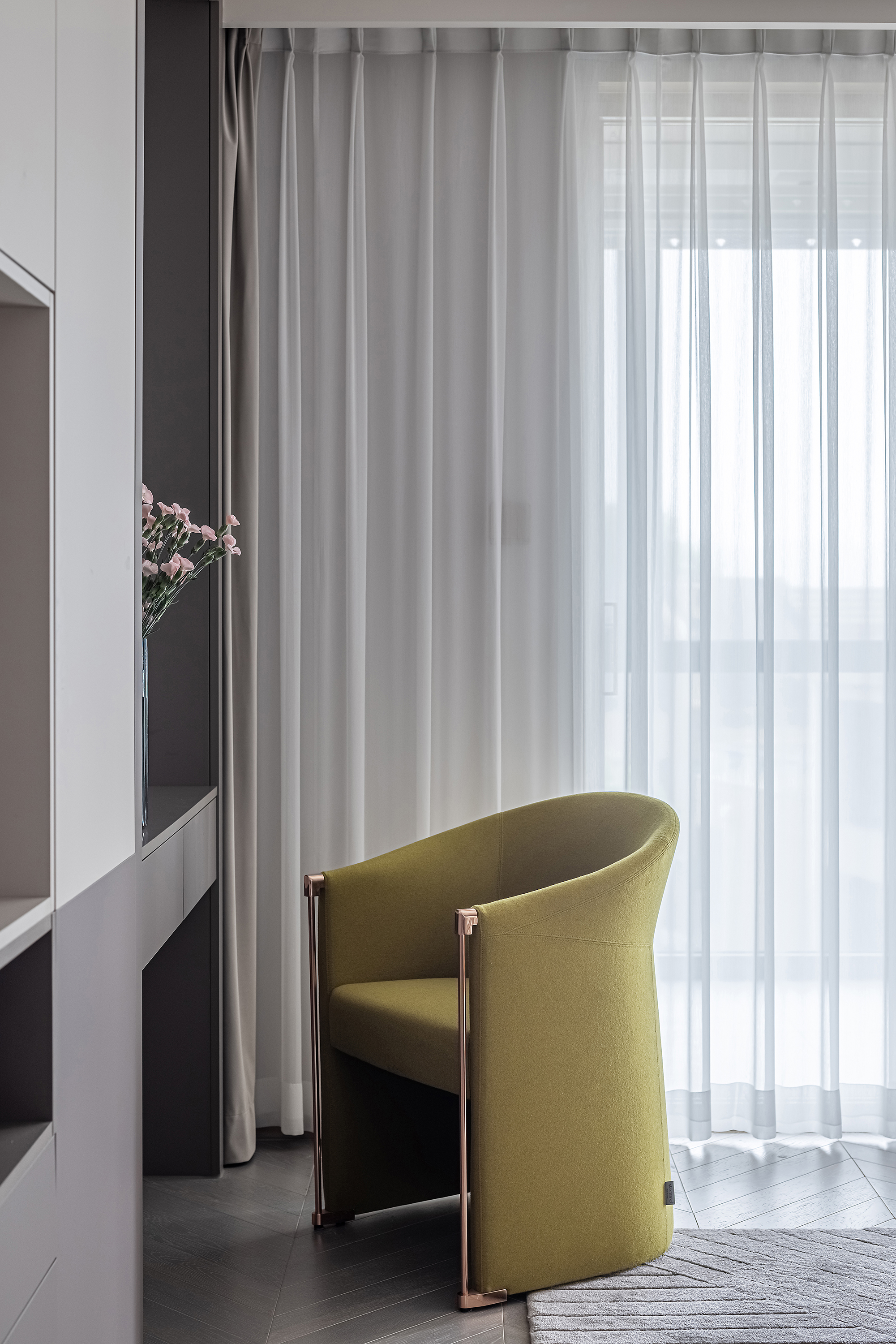 空间意境:本案为复式结构,常住祖孙三代六人,根据业主喜好,整体偏东方韵味,结合居住结构、功能需求,对房屋空间和氛围做设计划分控制,运用木饰面、绒布、素雅色系等元素,让整个空间围绕功能和中式气韵展开,使之达到期望品质而不俗套,满足老中青三代的审美需求。