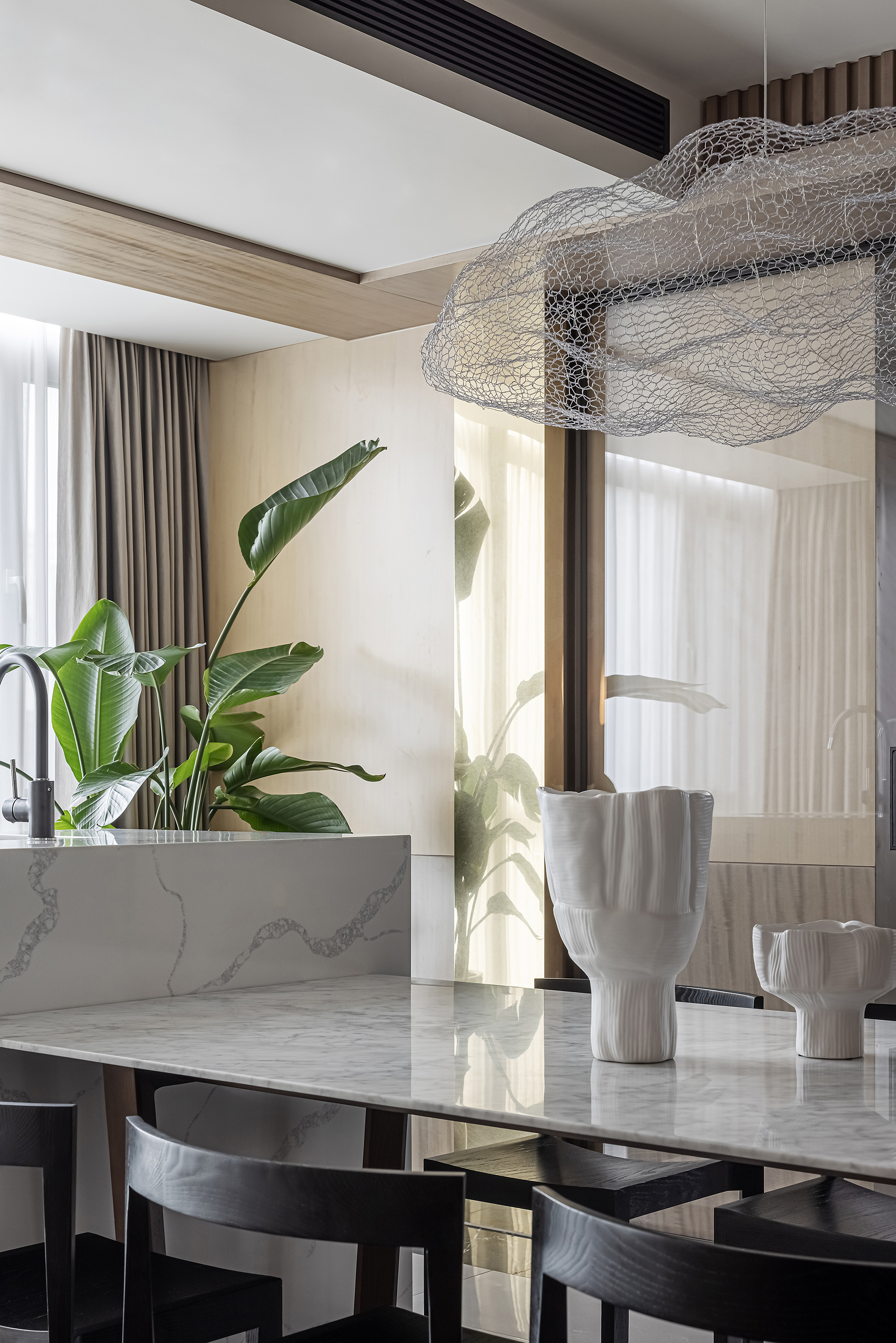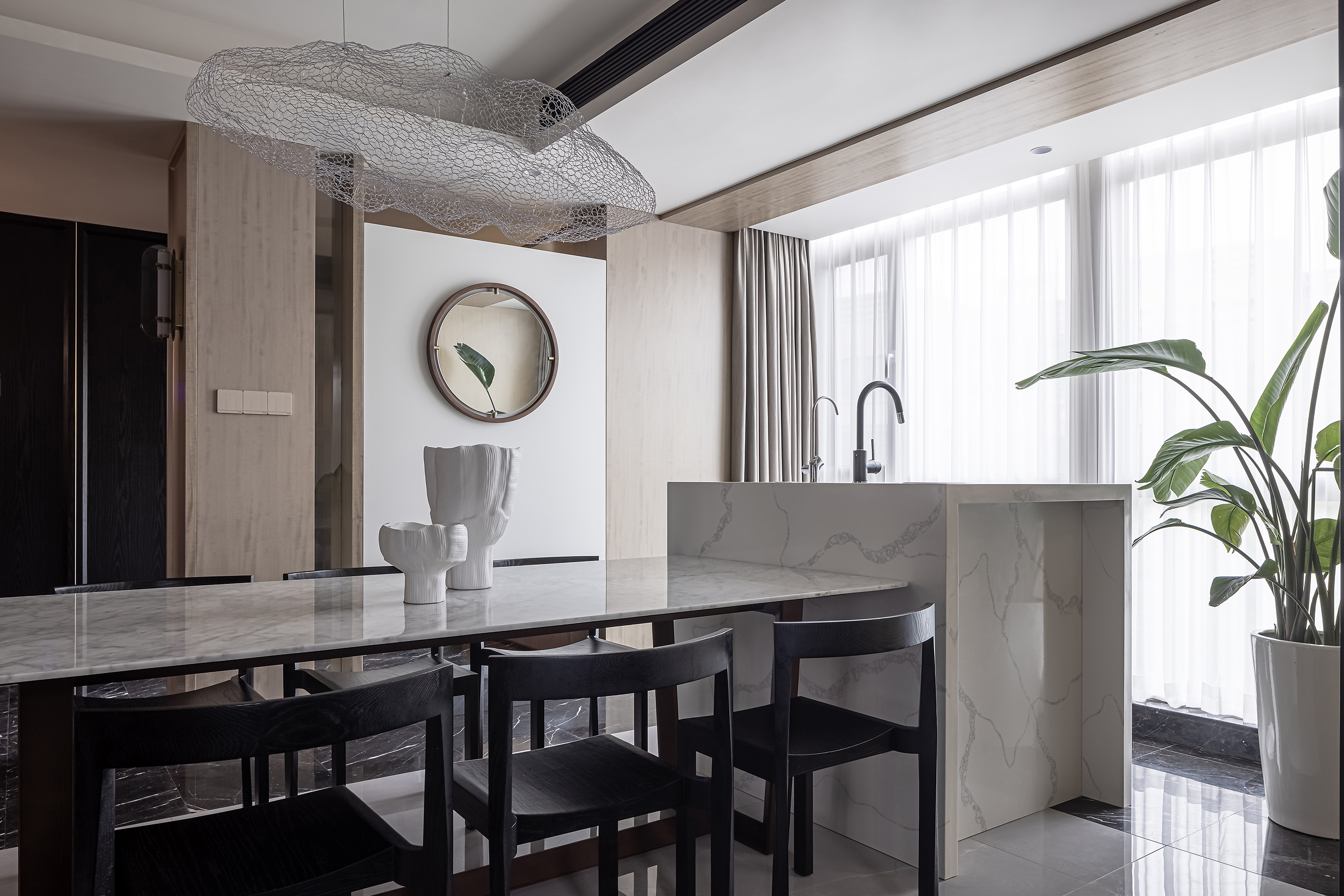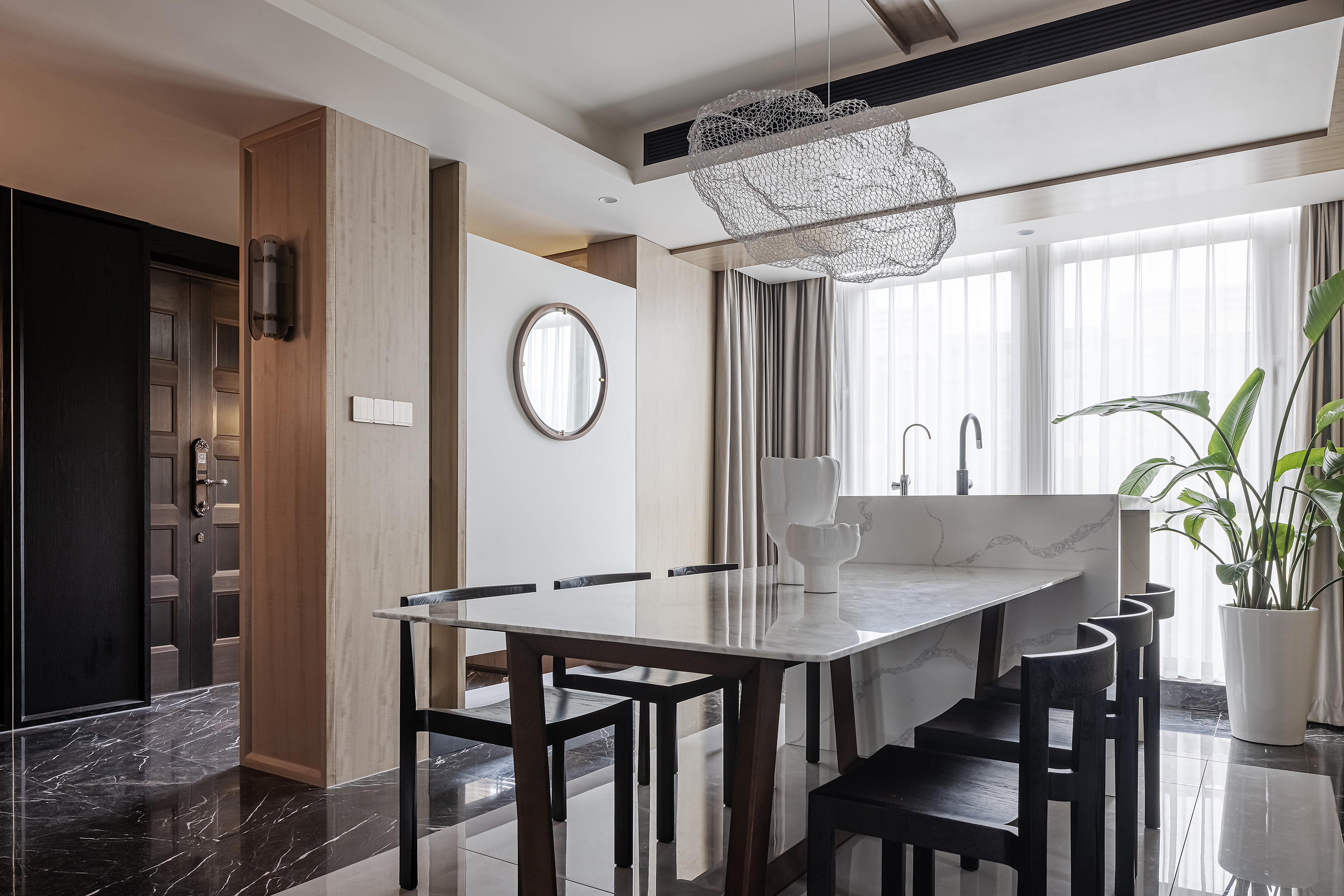 将原有北阳台归纳至餐厅,扩大就餐区面积,轻松放置6人桌,利用空间设置岛台,让就餐环境更加通透明亮,同时也更实用美观;
