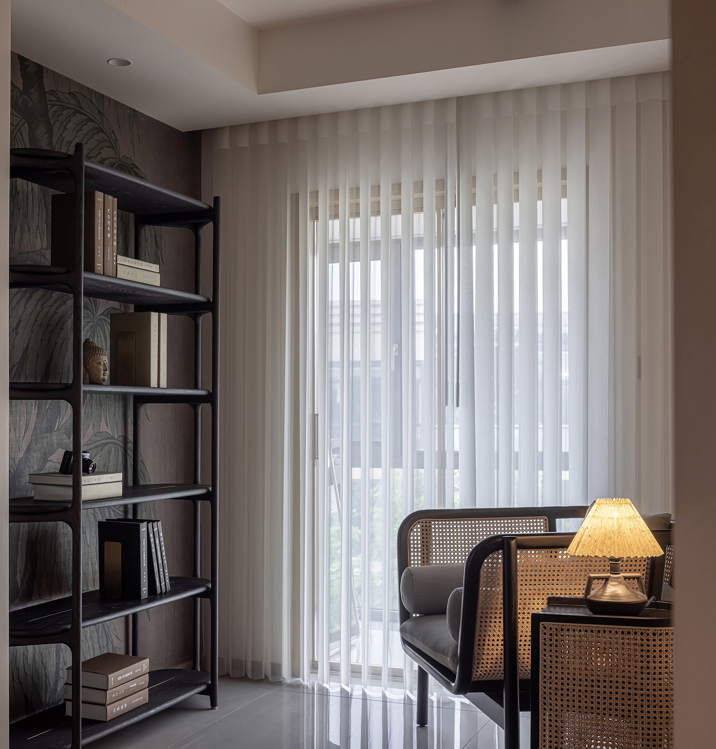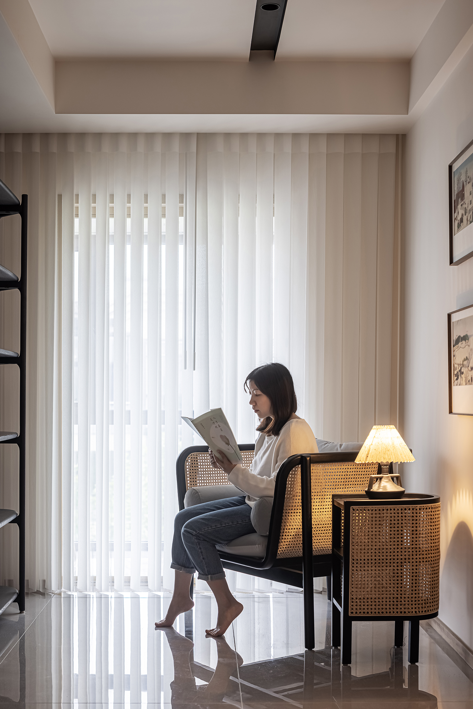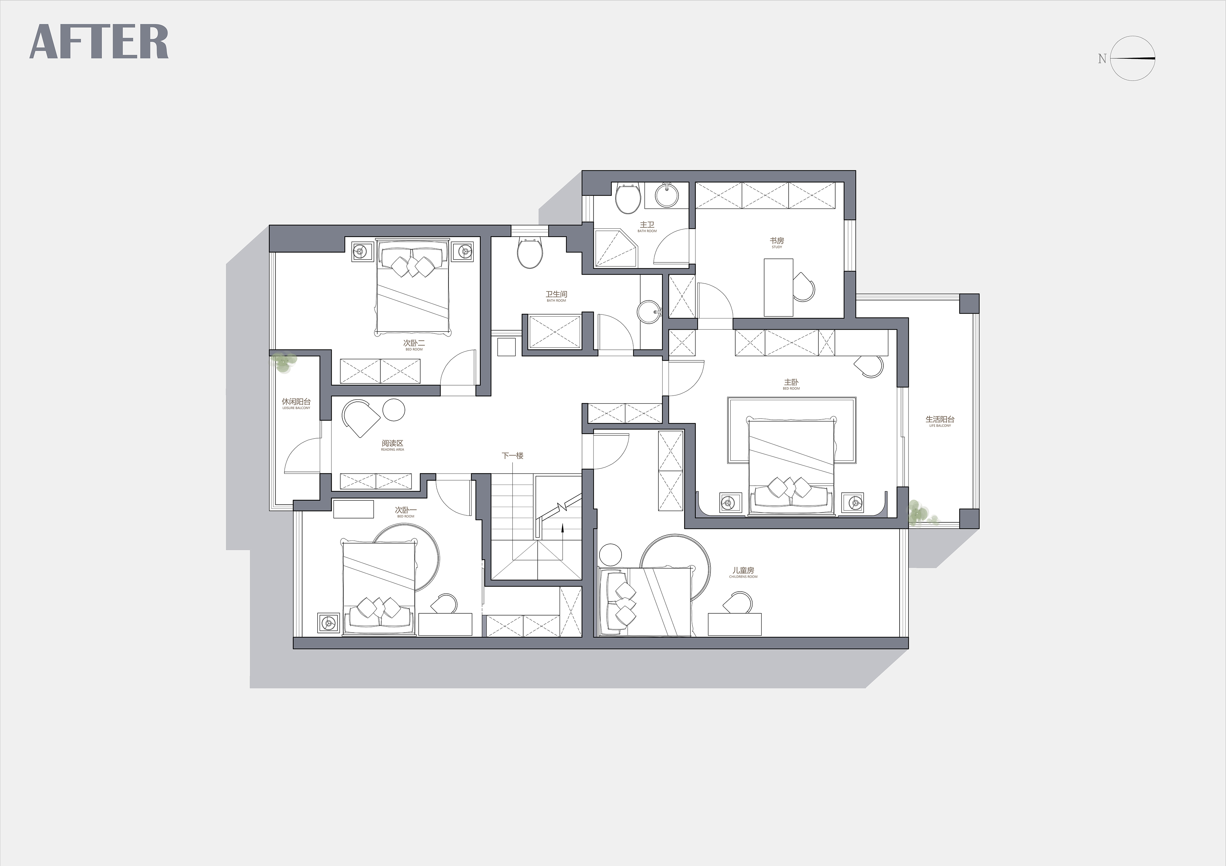 设计改造二层过厅,扩大面积,布置起居阅读室,划分出北设备阳台;