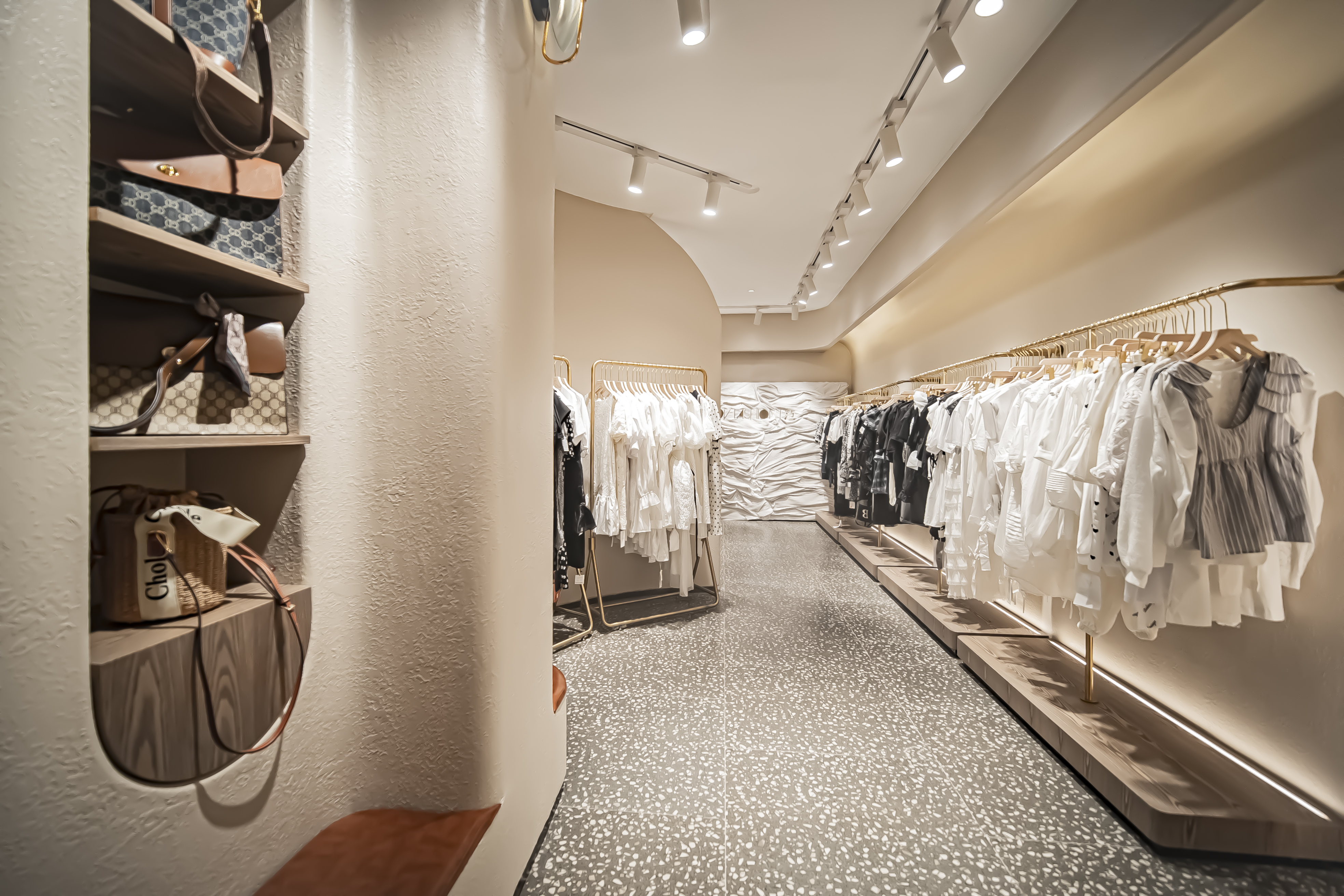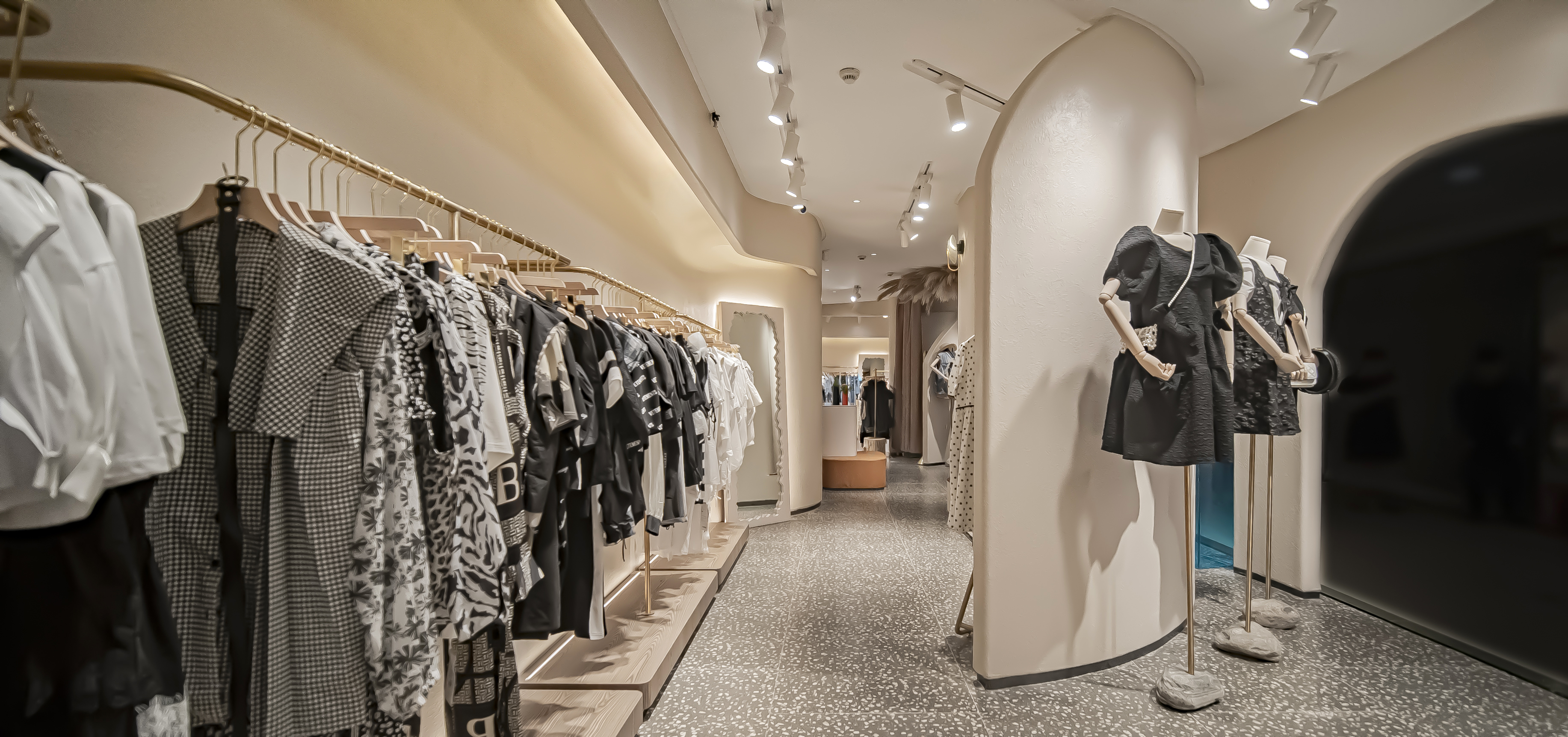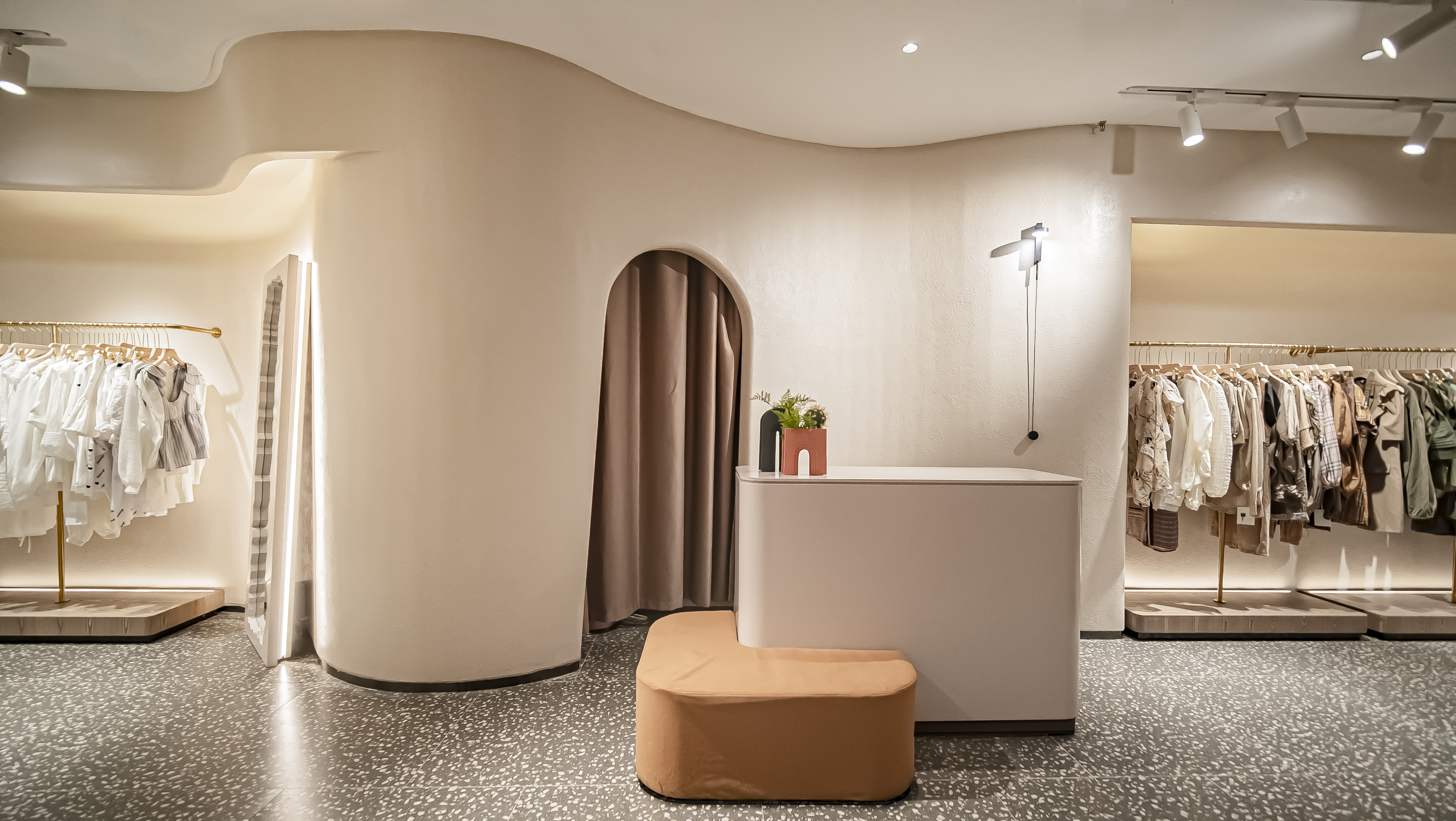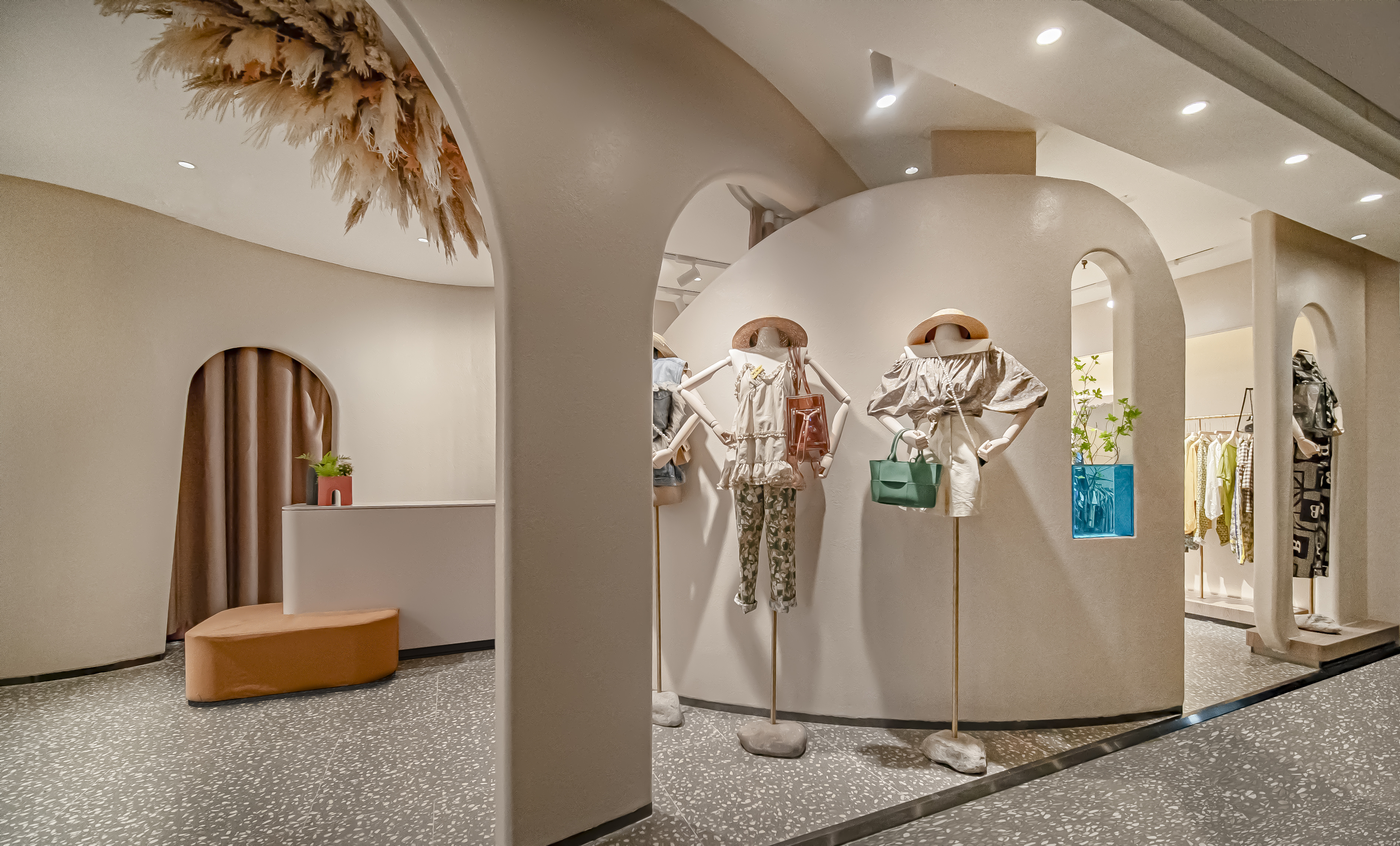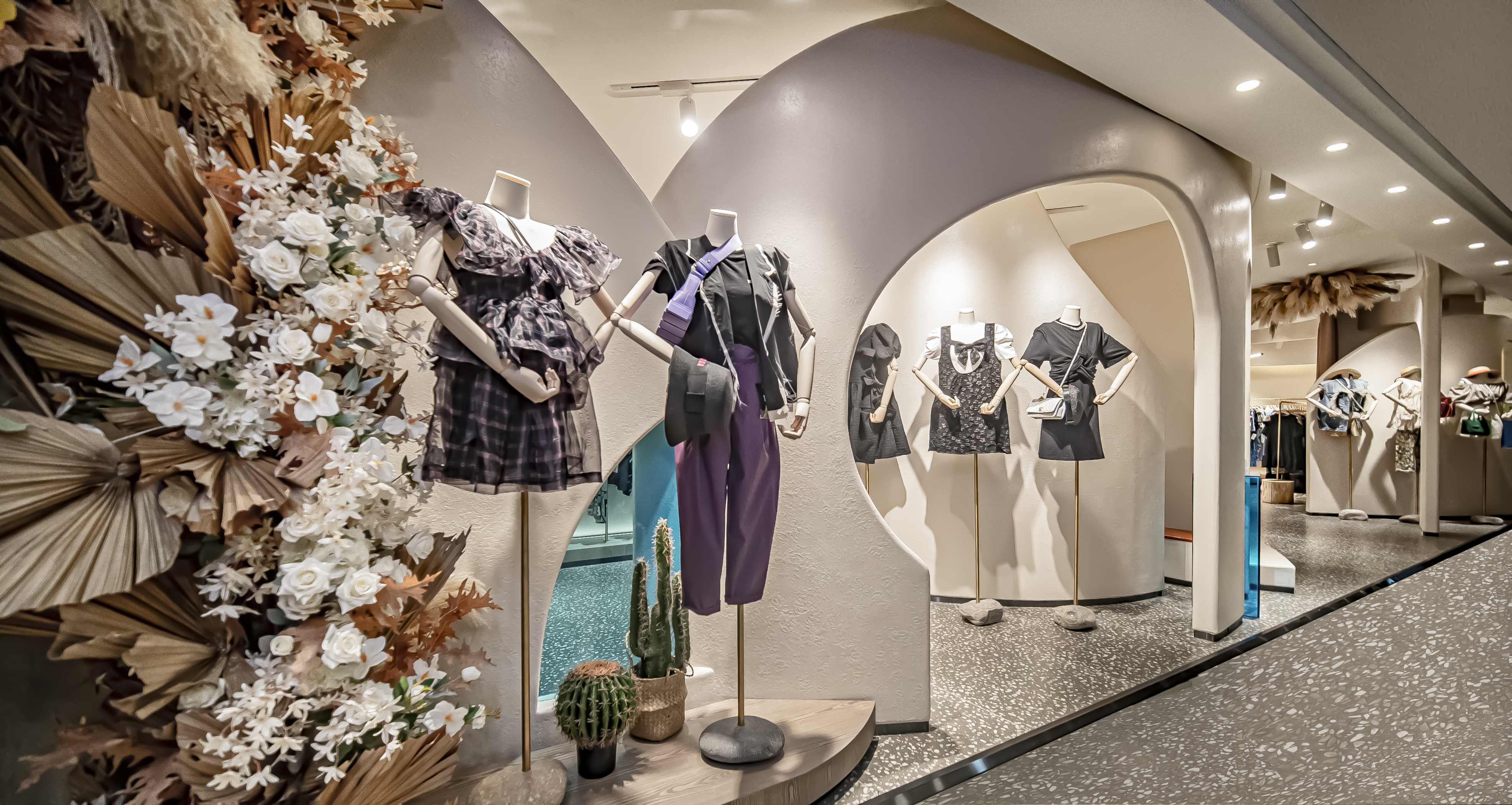 本次设计我们围绕商业模式进行深化和发掘,解决问题,使消费体验更符合场景。为了打造轻松愉悦舒适的购物环境,汲取女性的精神与特质,用温柔的色彩体现富有情调美感的氛围,用曲线的穿插解决空间的矛盾,增添柔美,塑造空间整体气质。