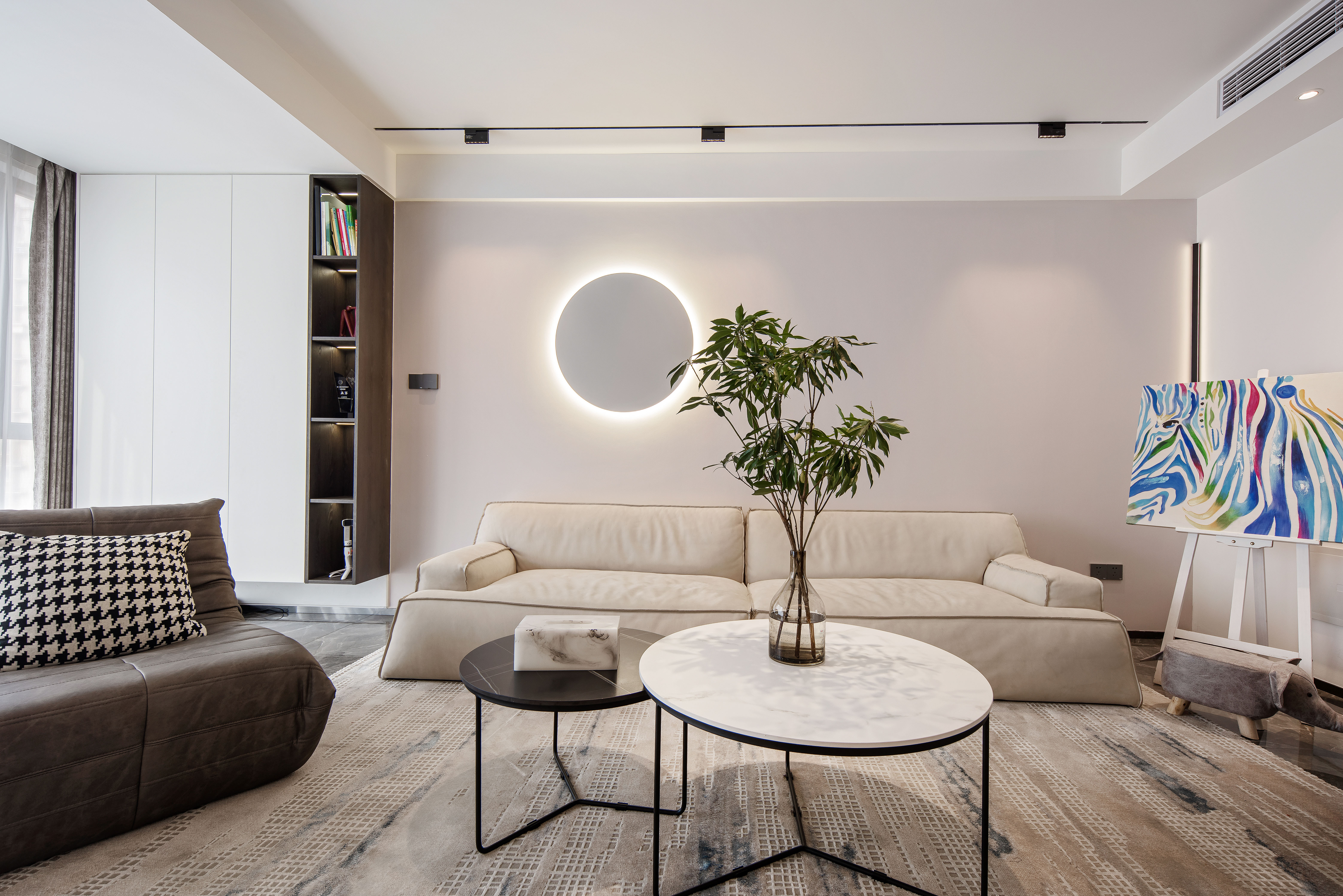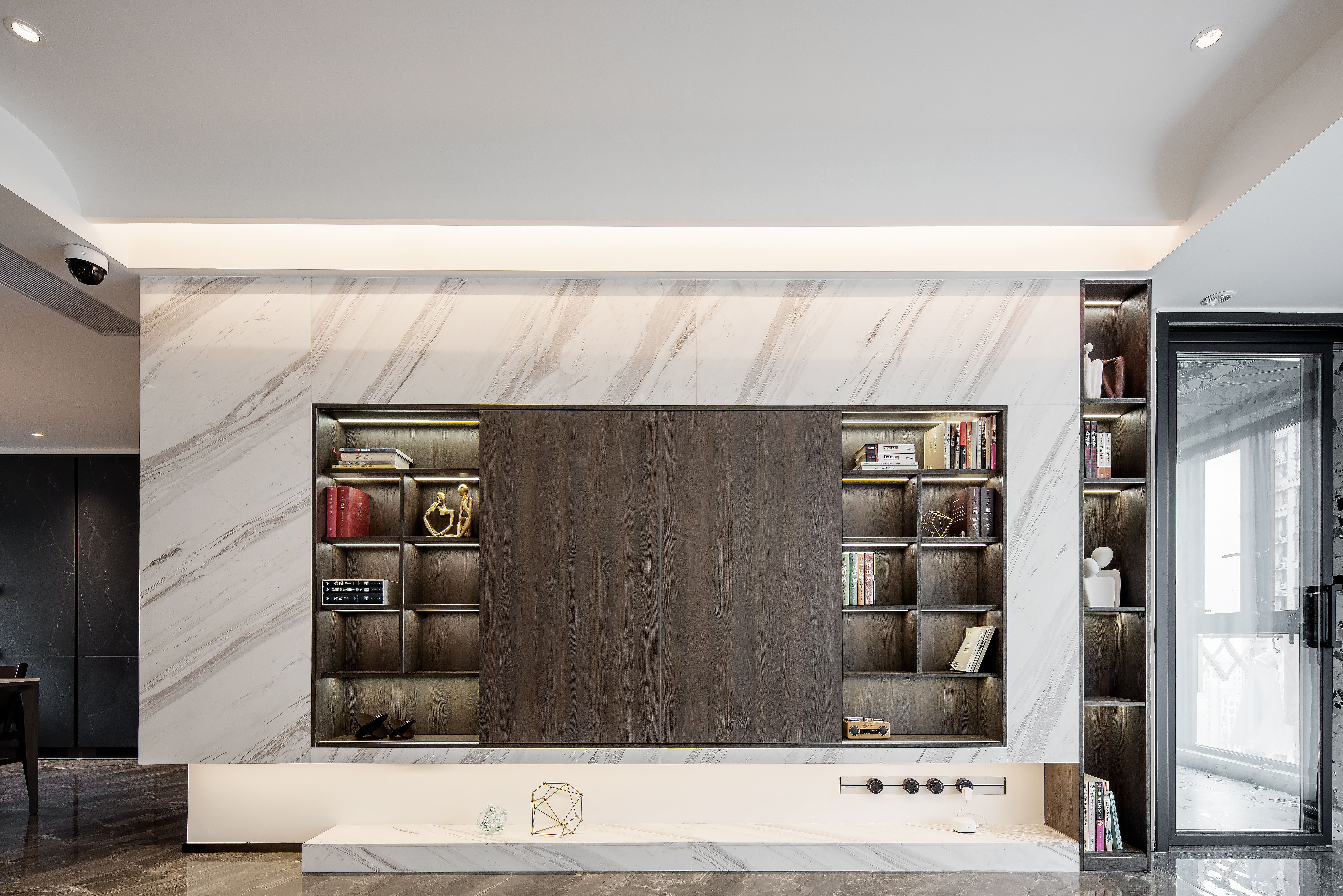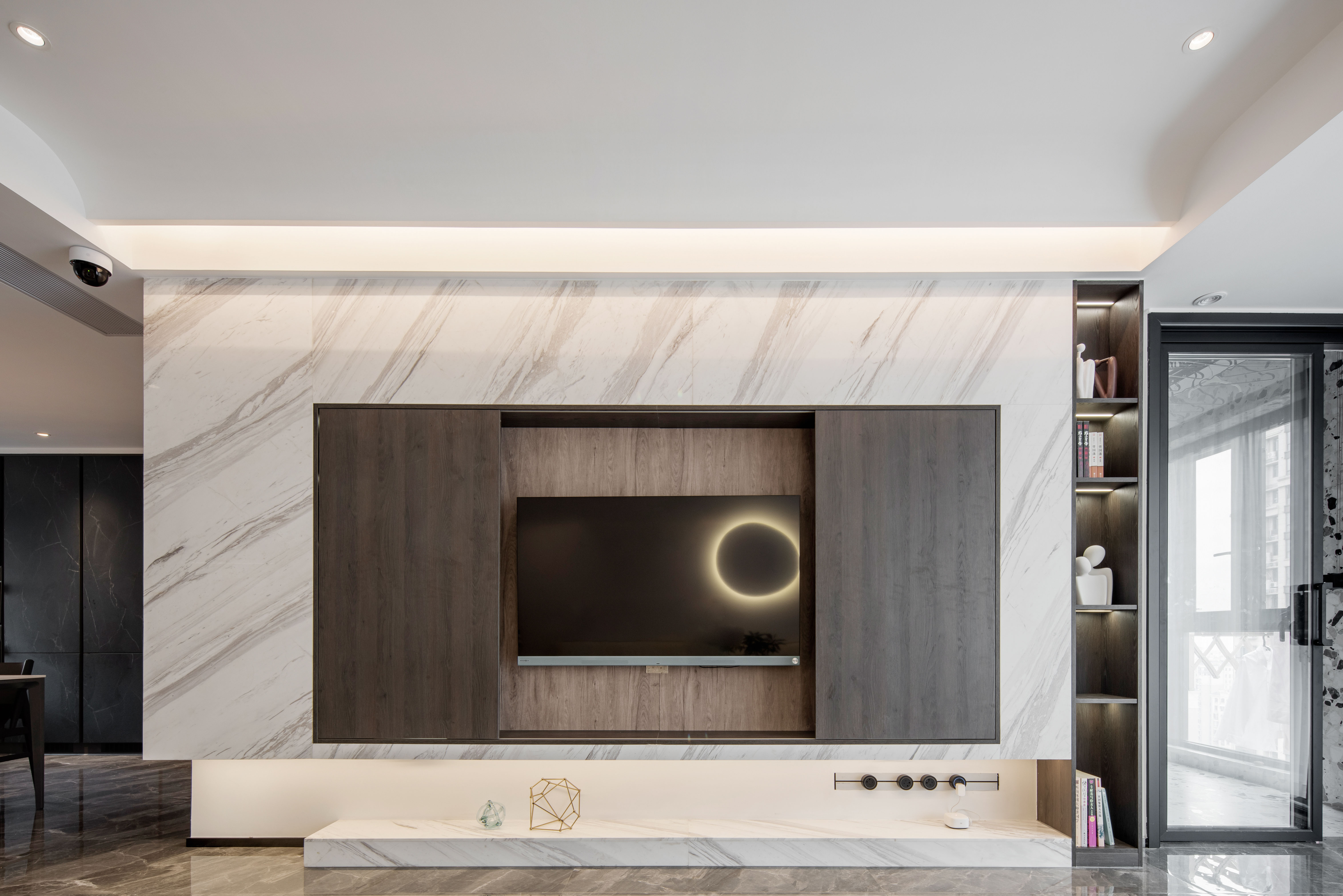 电视背景墙别有洞天,中间的门打开便是电视机,关上便是书柜。带弧状的吊顶设计,映衬着光影更显温度