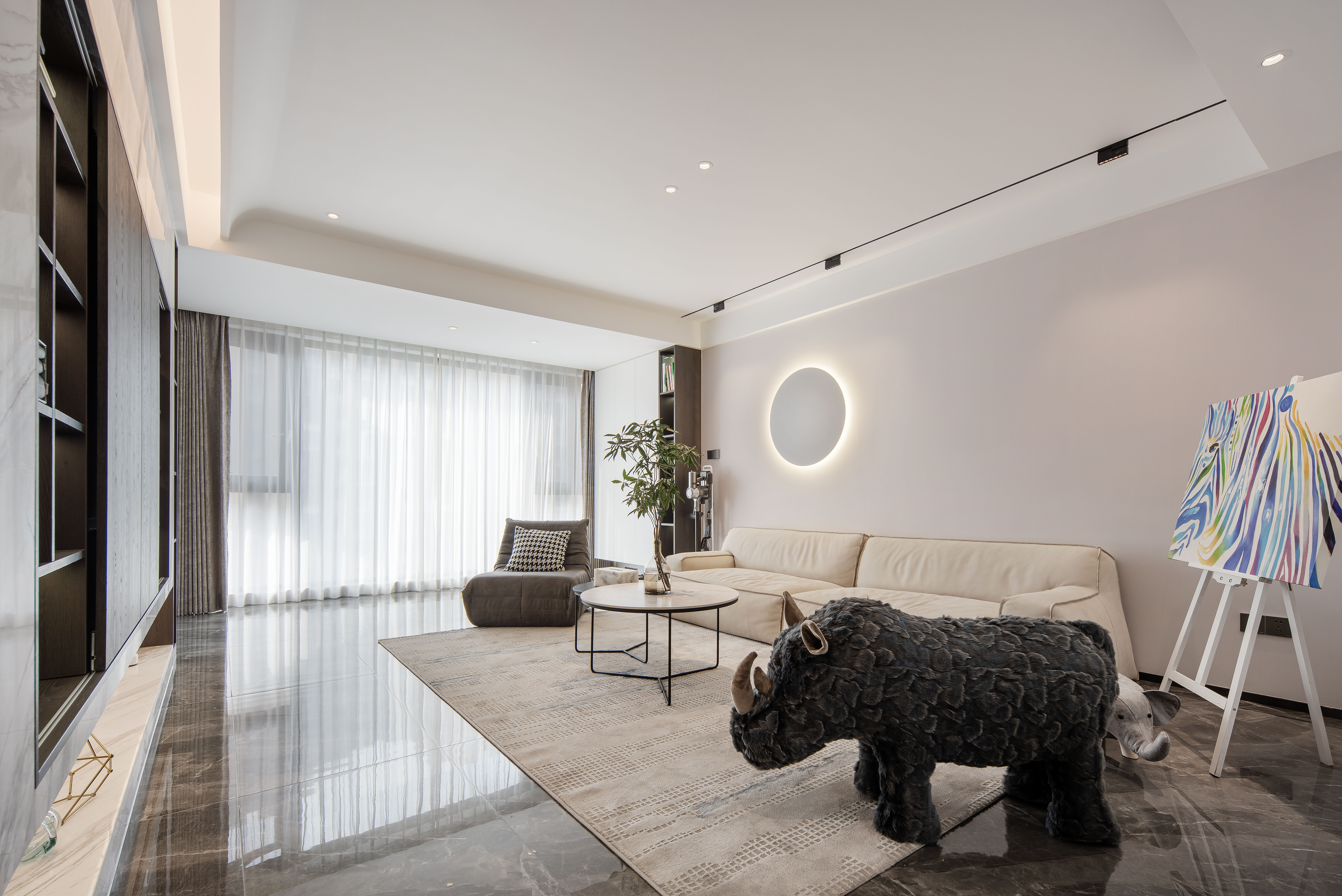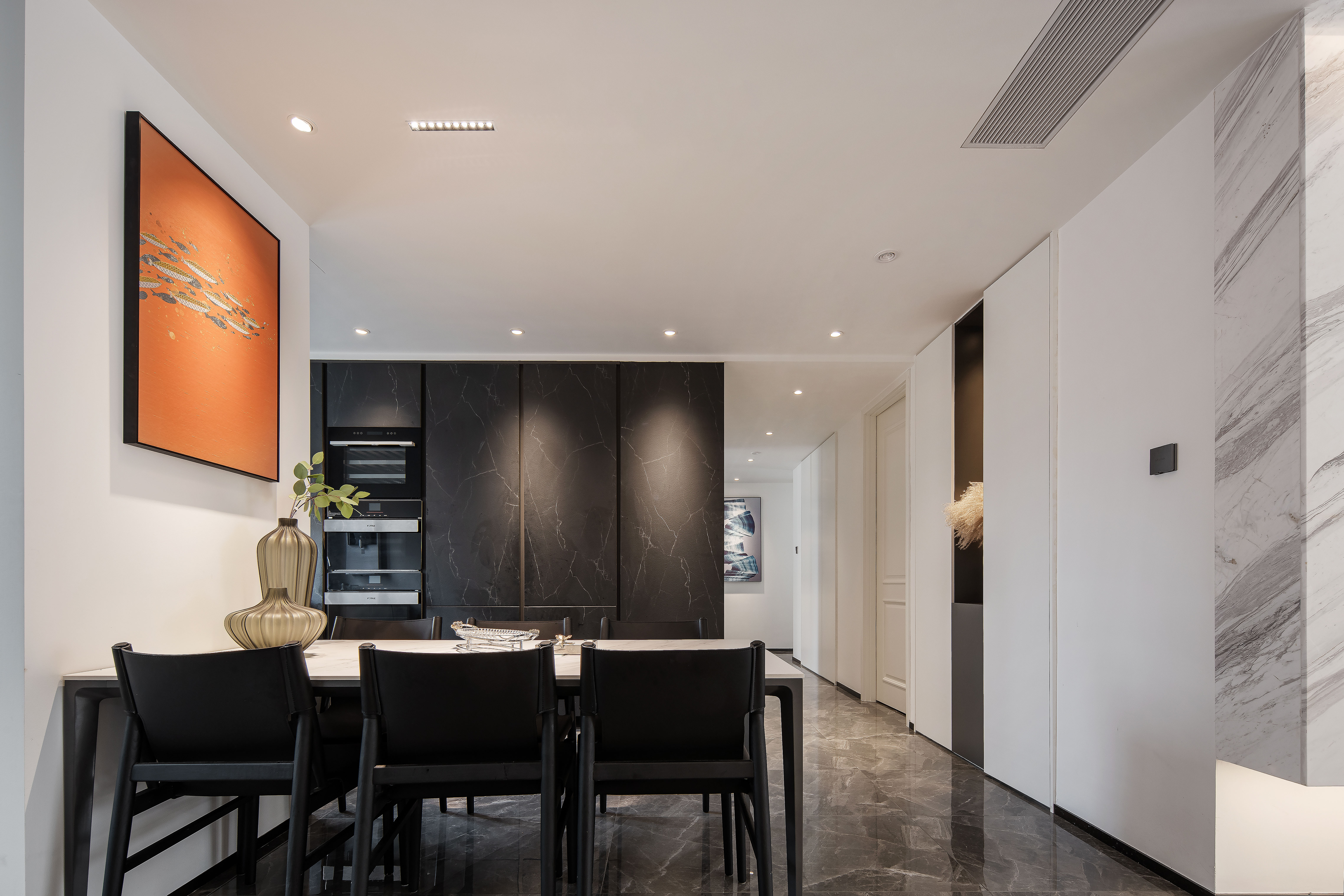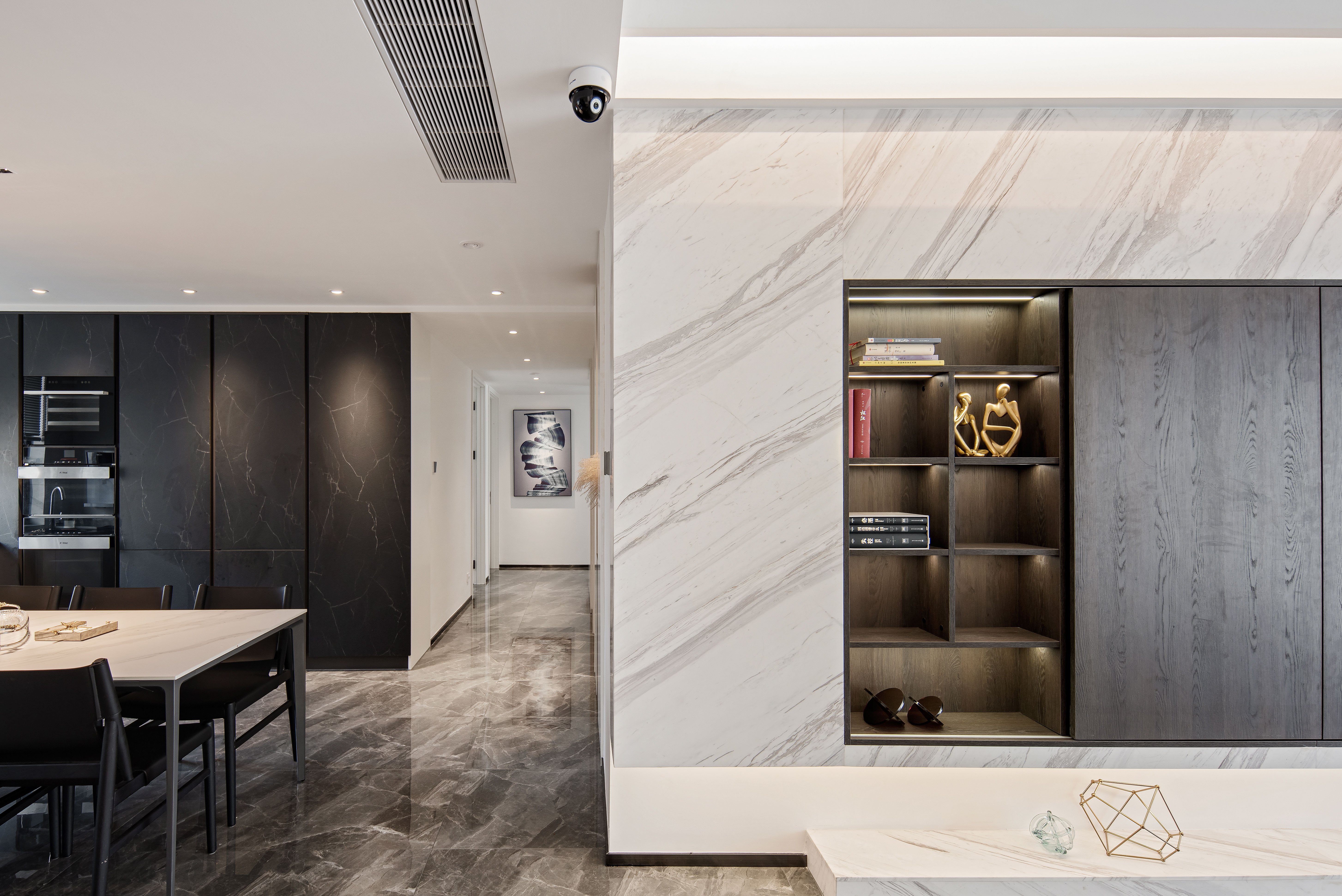 化繁为简的过程中,过道没有刻意地做造型,白色墙体的纯净营造的质感气息,再以深灰色展示区带动视觉活泼感。并且客餐厅充裕的储物空间,满足了一家人的日常收纳