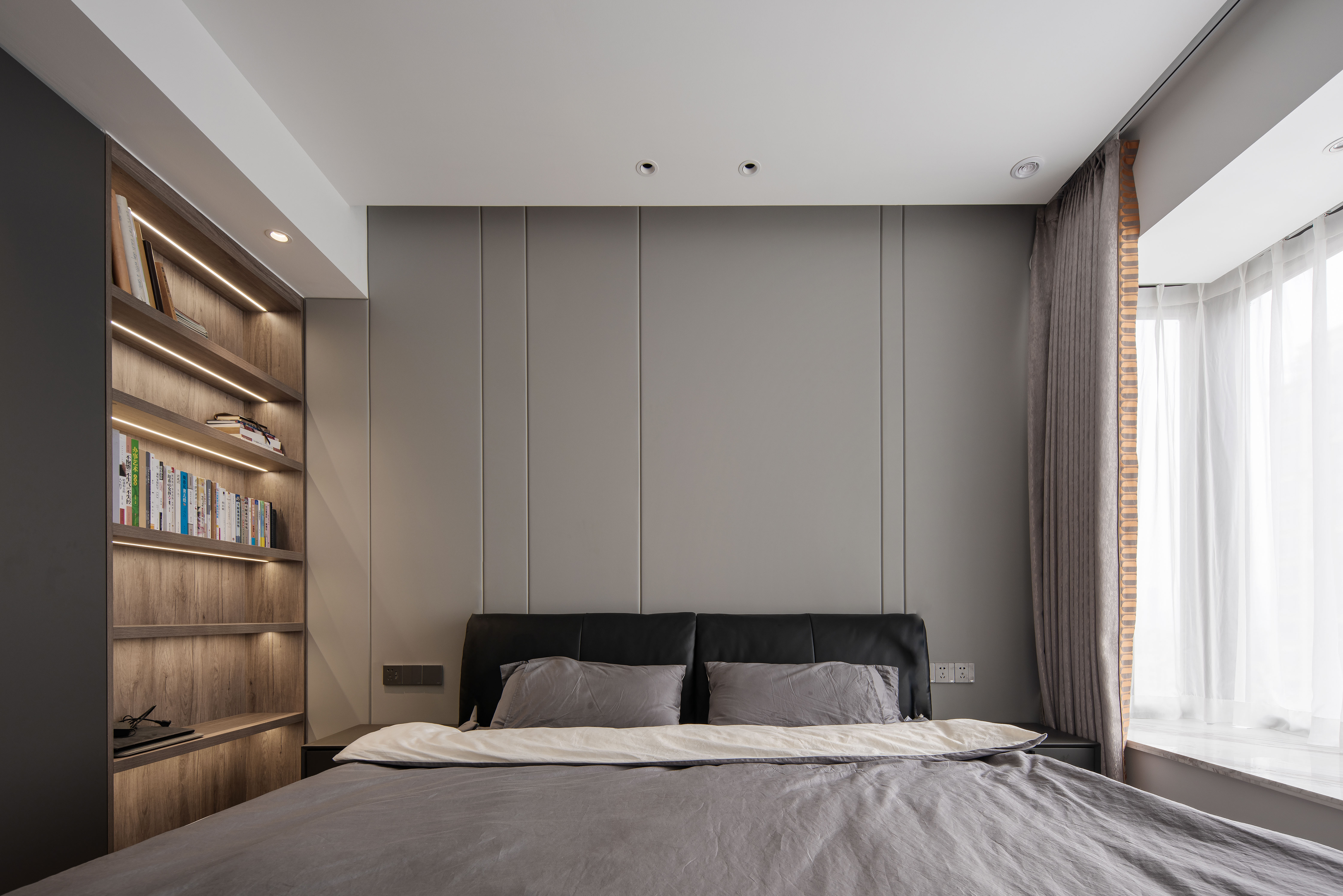 主卧没有过多的装饰,延续了客餐厅黑白灰的基调,加上极简的灯光营造出一种安定感。