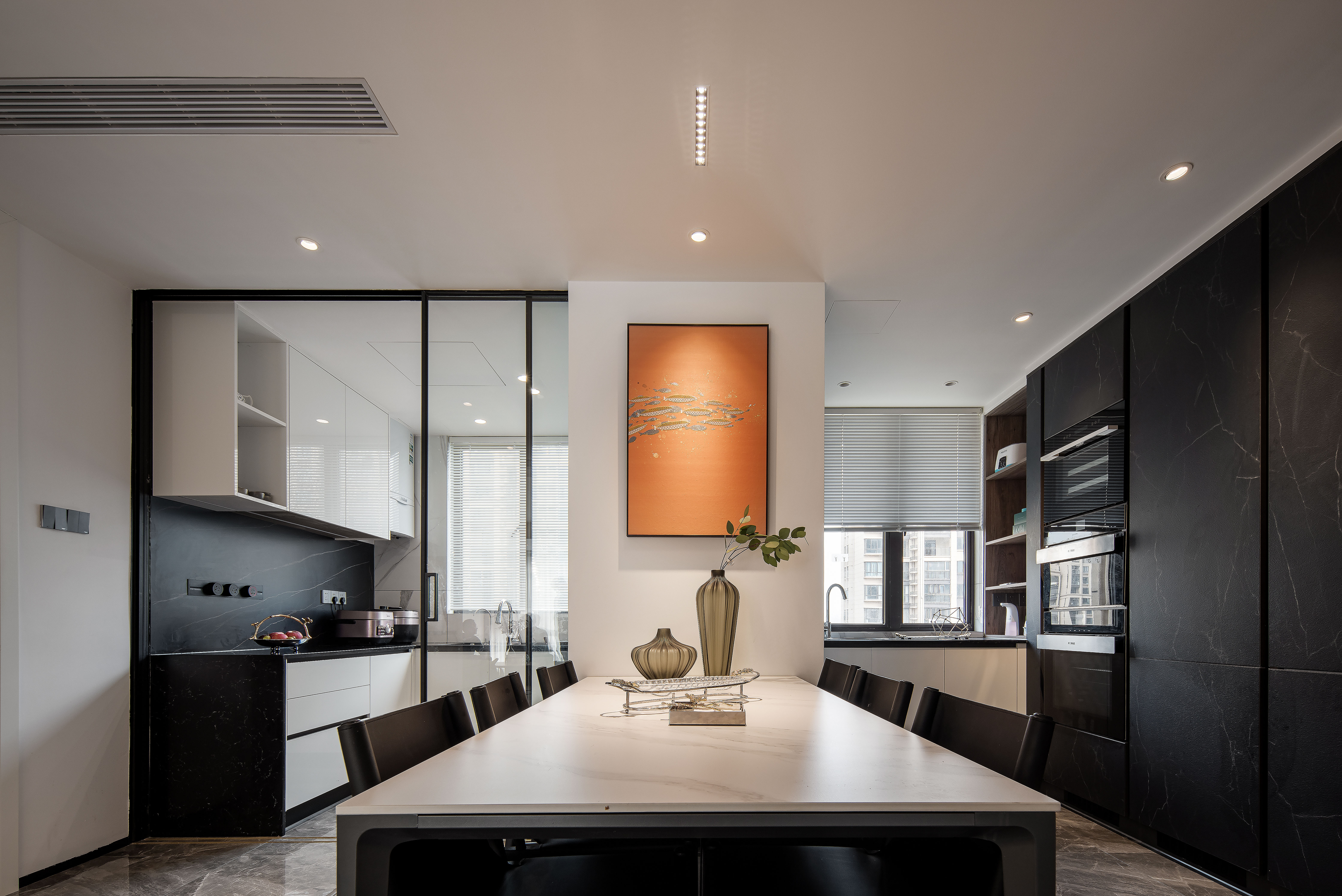 厨房原本的烟道在西厨高柜的地方,但是我们改变了原本建筑结构留给我们的位置,厨房对于中国人来讲,好像是一种文化氛围,有人说将家庭不断缩影回归的那个原点,正是厨房。因此我们给厨房留出了比较大的空间,既可以满足中餐也可以满足西餐,在不使用厨房的时候把联动门打开,藏进隔墙中,也成为了一个敞开式的厨房,与餐厅结合,空间感油然而生,黑色的柜体和岩板搭配极简的灯光创建了现代感的氛围,而白色及少量的烟熏木色很好的中和这份酷黑,让空间与室外的景色和谐相处。