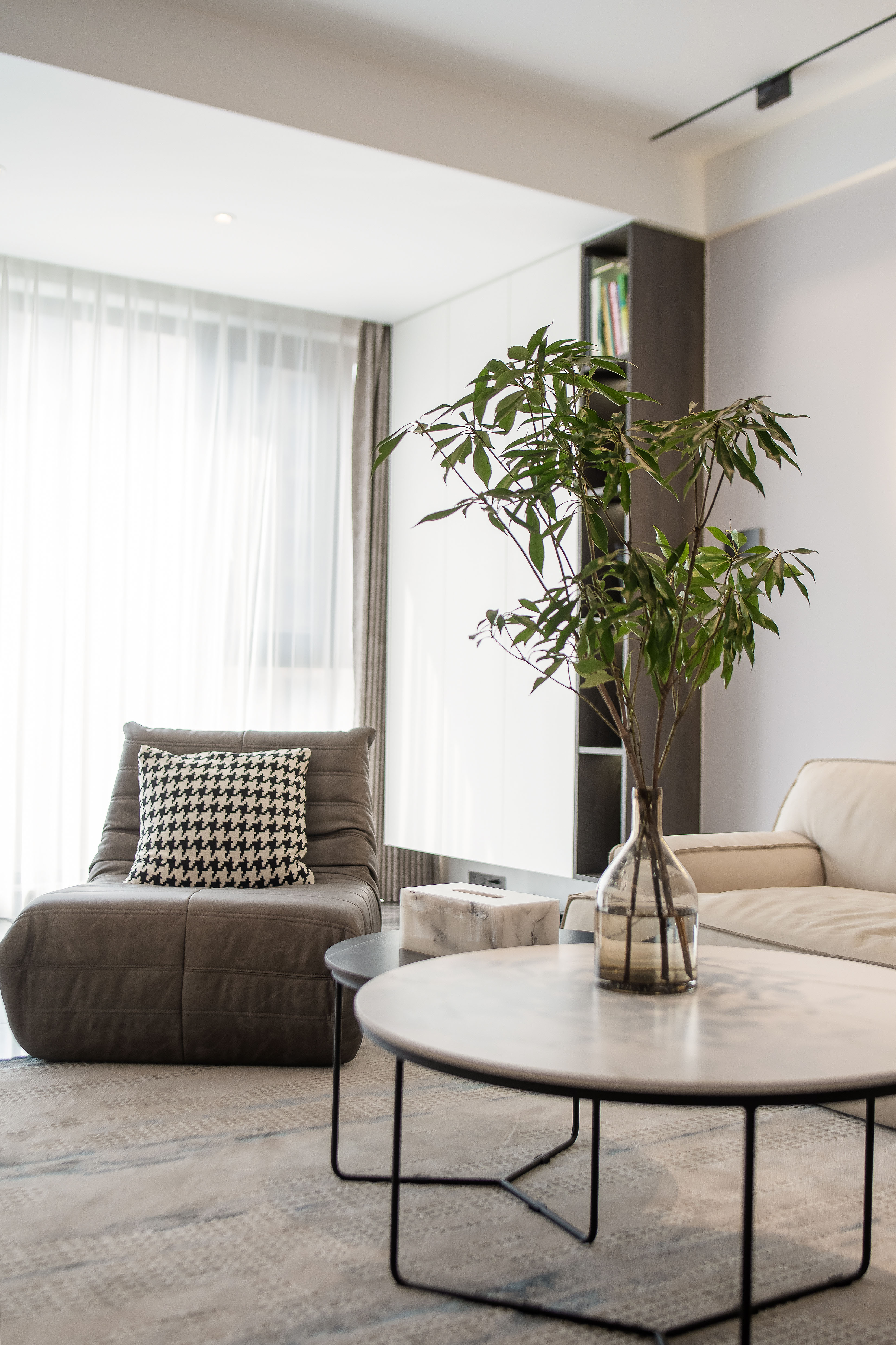 客厅设计秉持着简单而不简约的理念,黑白灰的基调,增加点绿植元素整个空间赋予了生命
