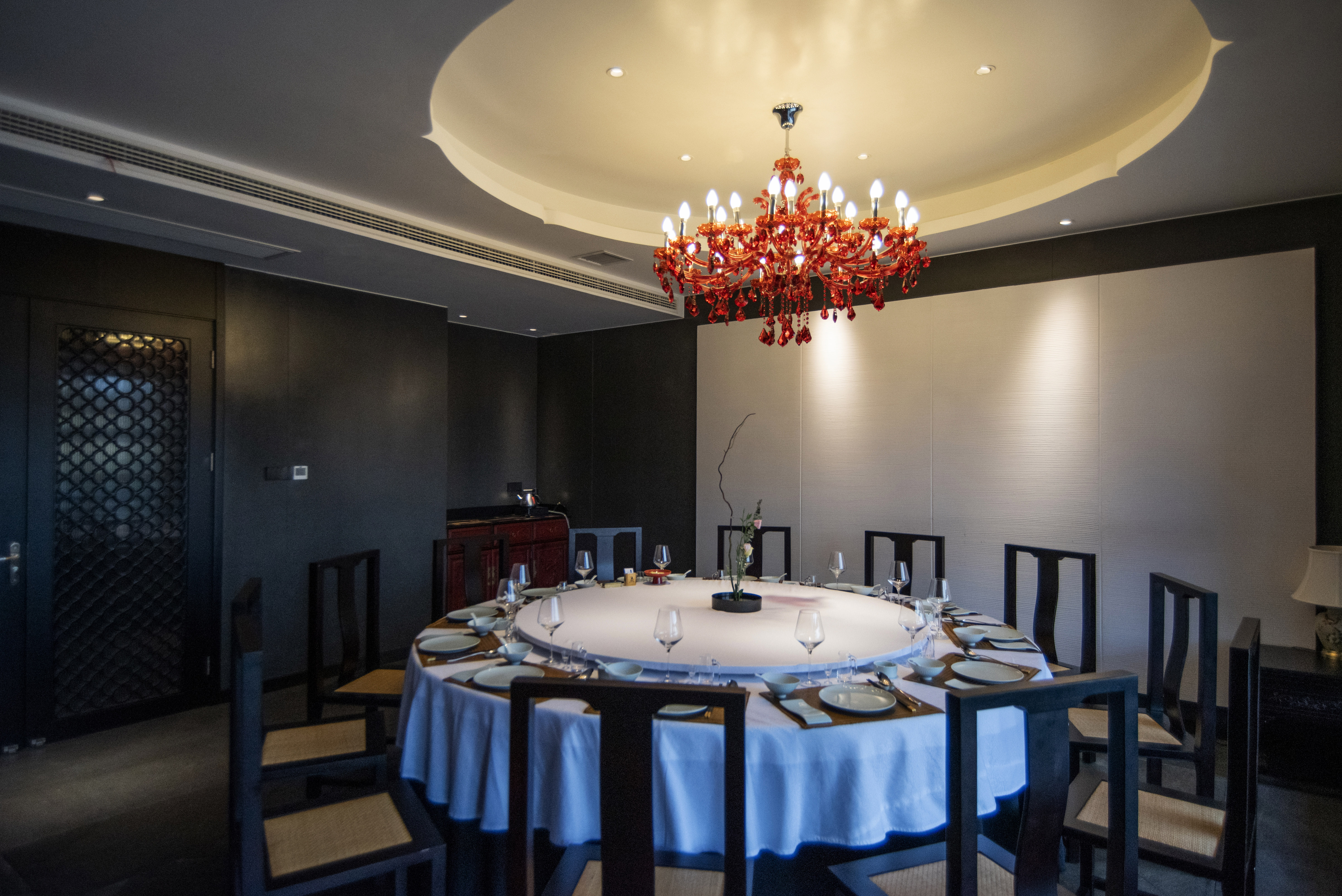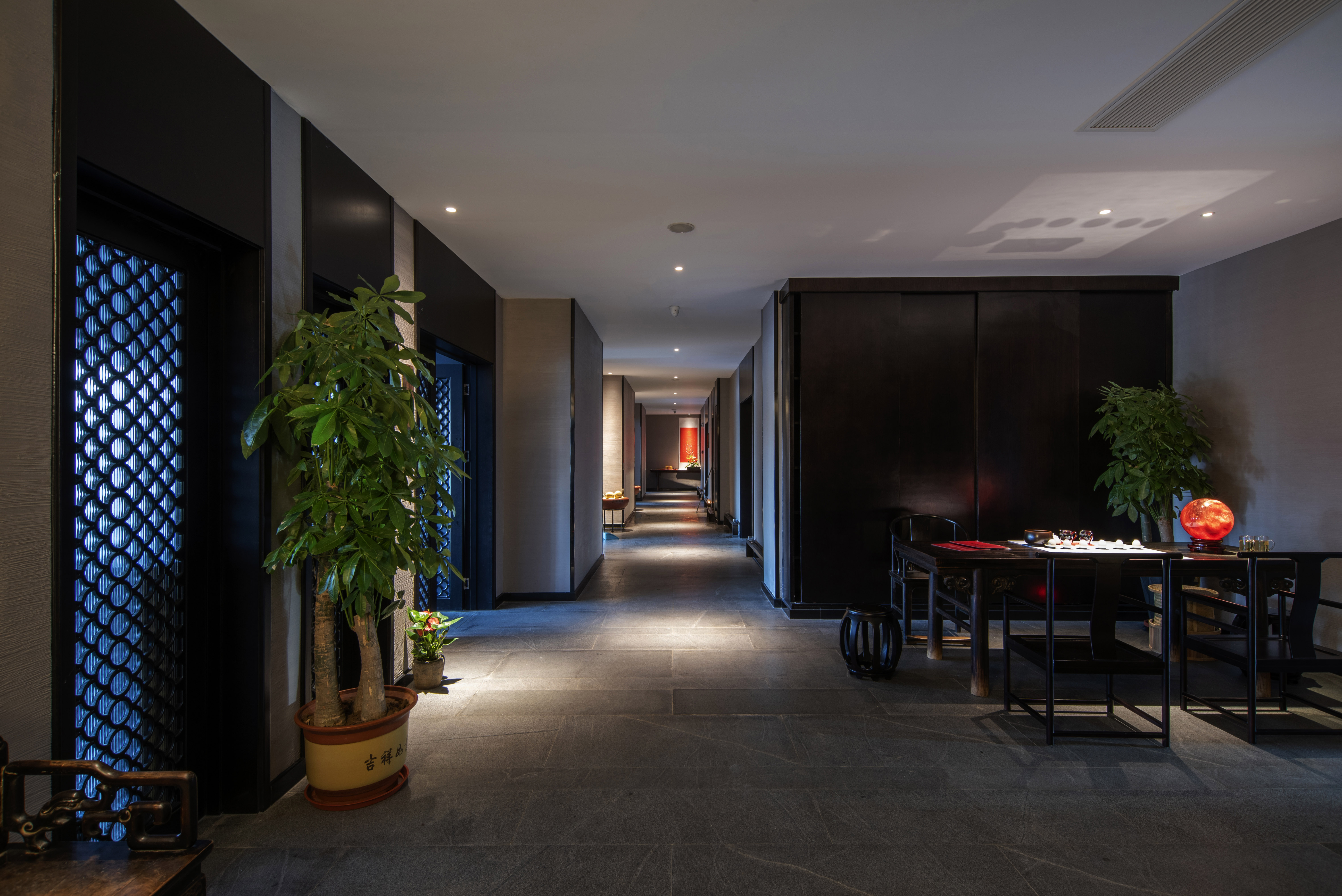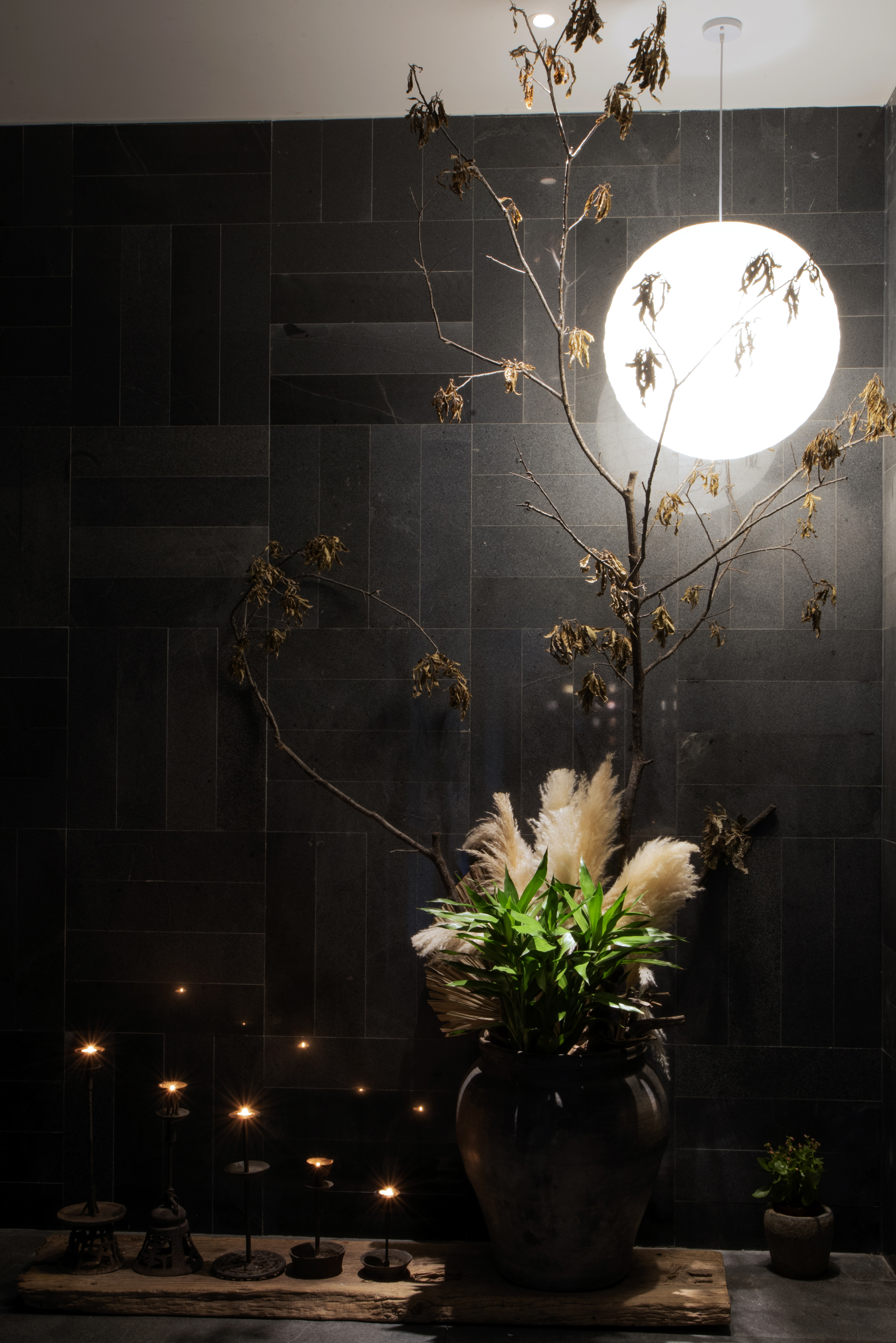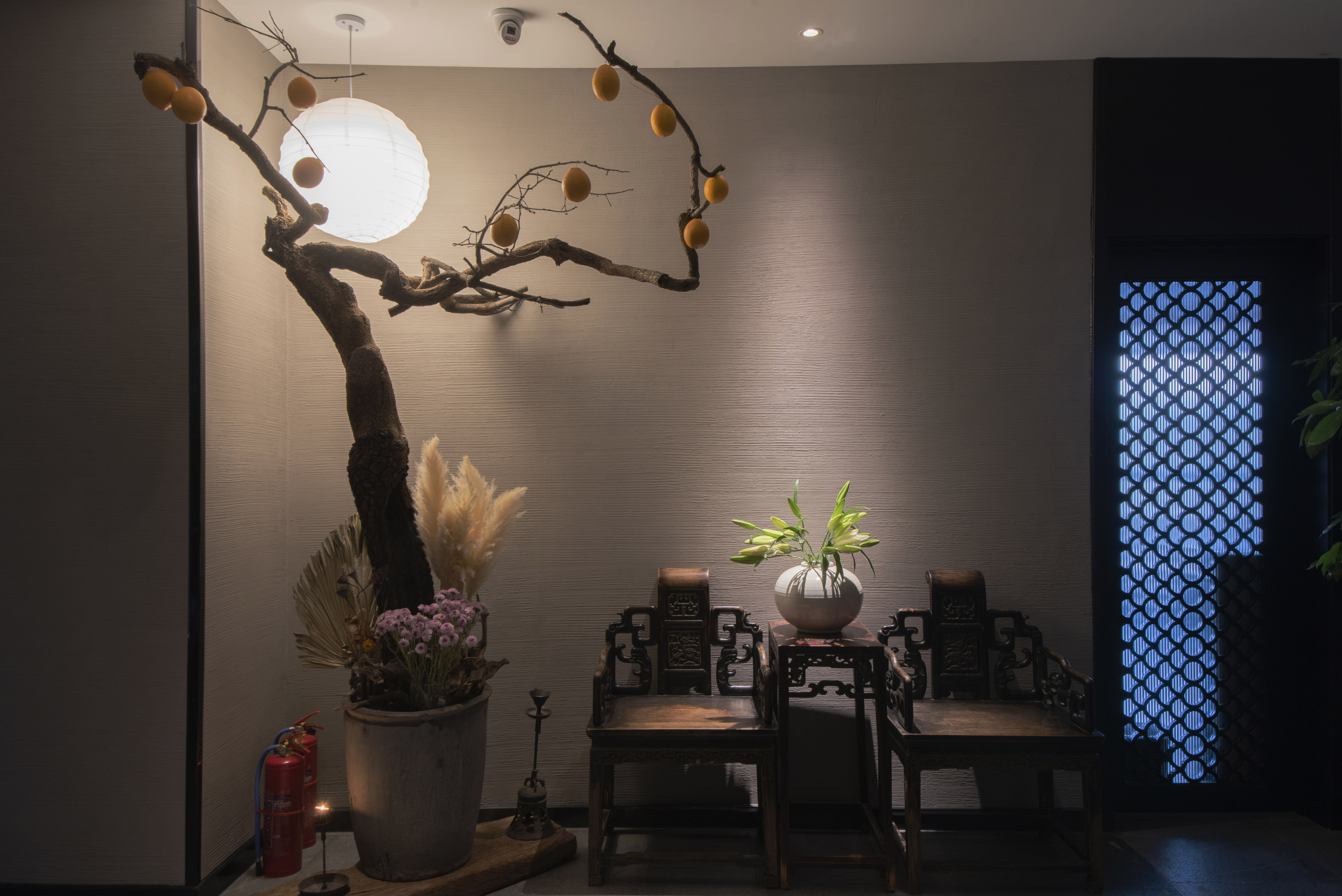极白茶语是本地一家经营安吉白茶和淮阳菜融合高端餐厅。极白,取禅宗始祖达摩修禅品茶之意,故业主期望设计一个有禅意但又不“处处见佛像”,把“佛在心中”茶和餐文化相结合的餐厅。故本案采用原石铺地,用做旧方式去除新石头的戾气,使之既有原始的美又有岁月的积淀感。本案大量采用原生态竹子、干支,新芽、花枝、水果作为装饰,让就餐的人们更有贴近自然修心品茶优雅之处。为了营造隐喻的禅意,本案造型顶都采用了“如意莲”花边碗造型,配深红色的水晶灯犹如佛前琉璃盏;走廊两侧的飘腊使人仿佛进入神圣的殿堂,放松身心,洗涤心灵。