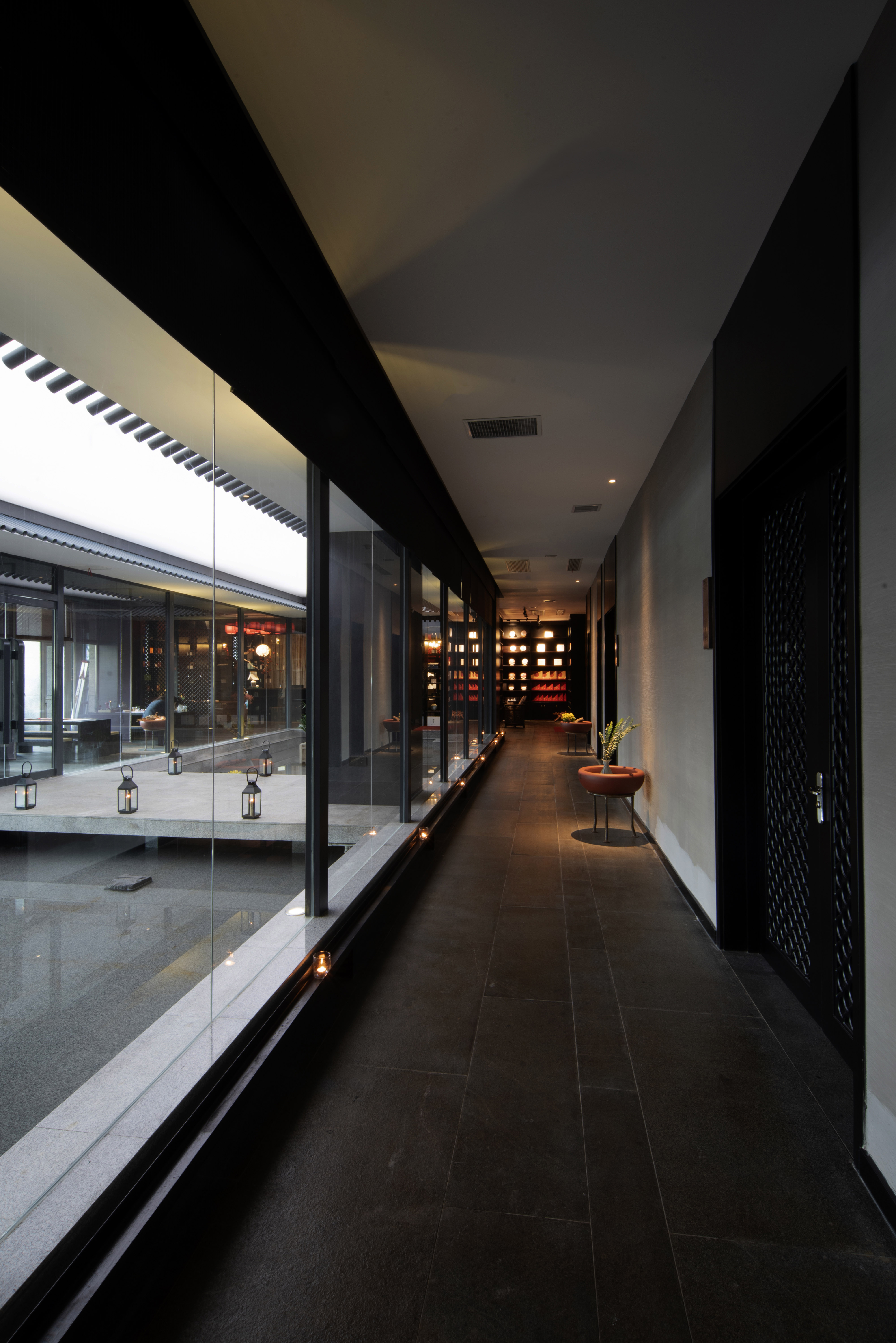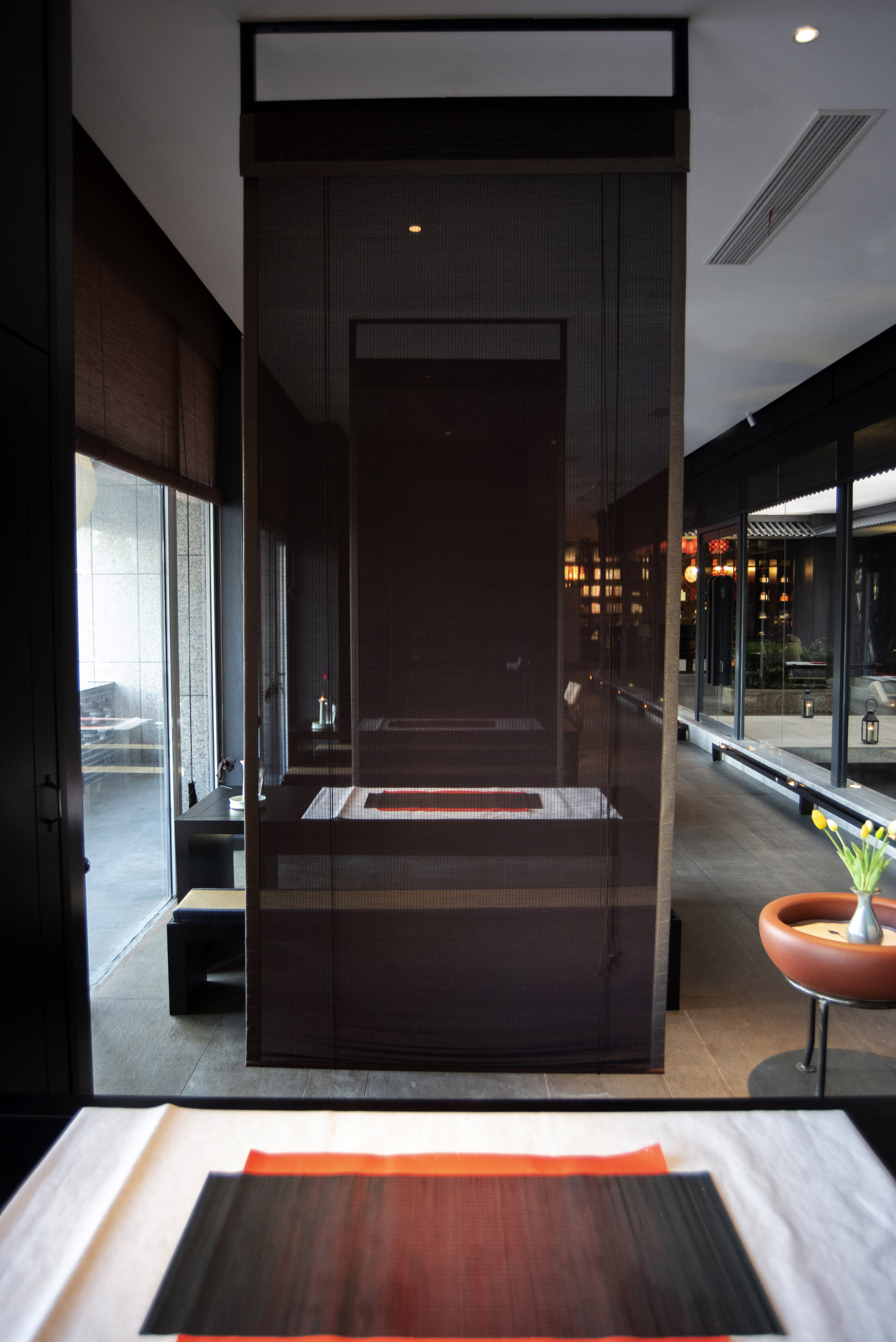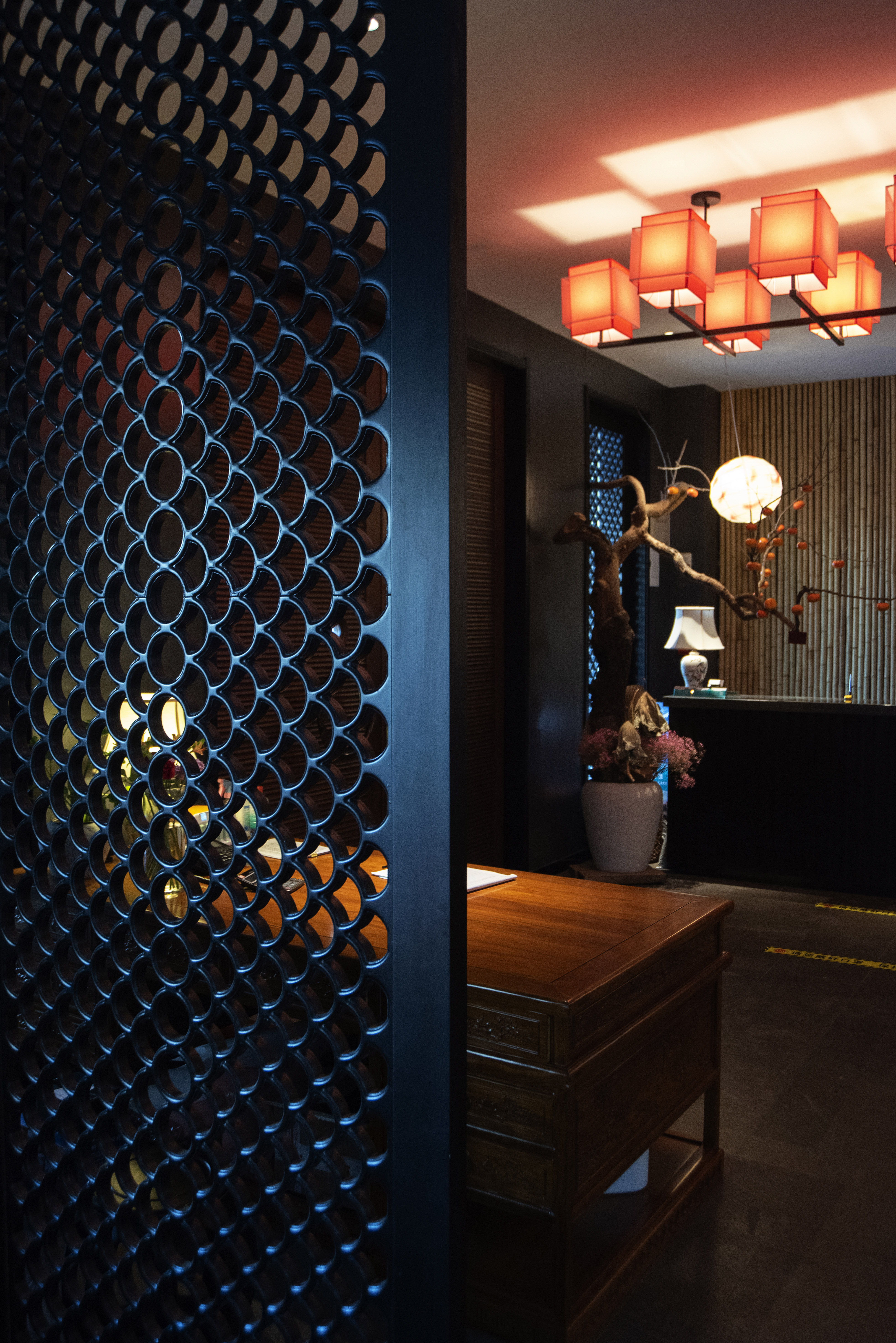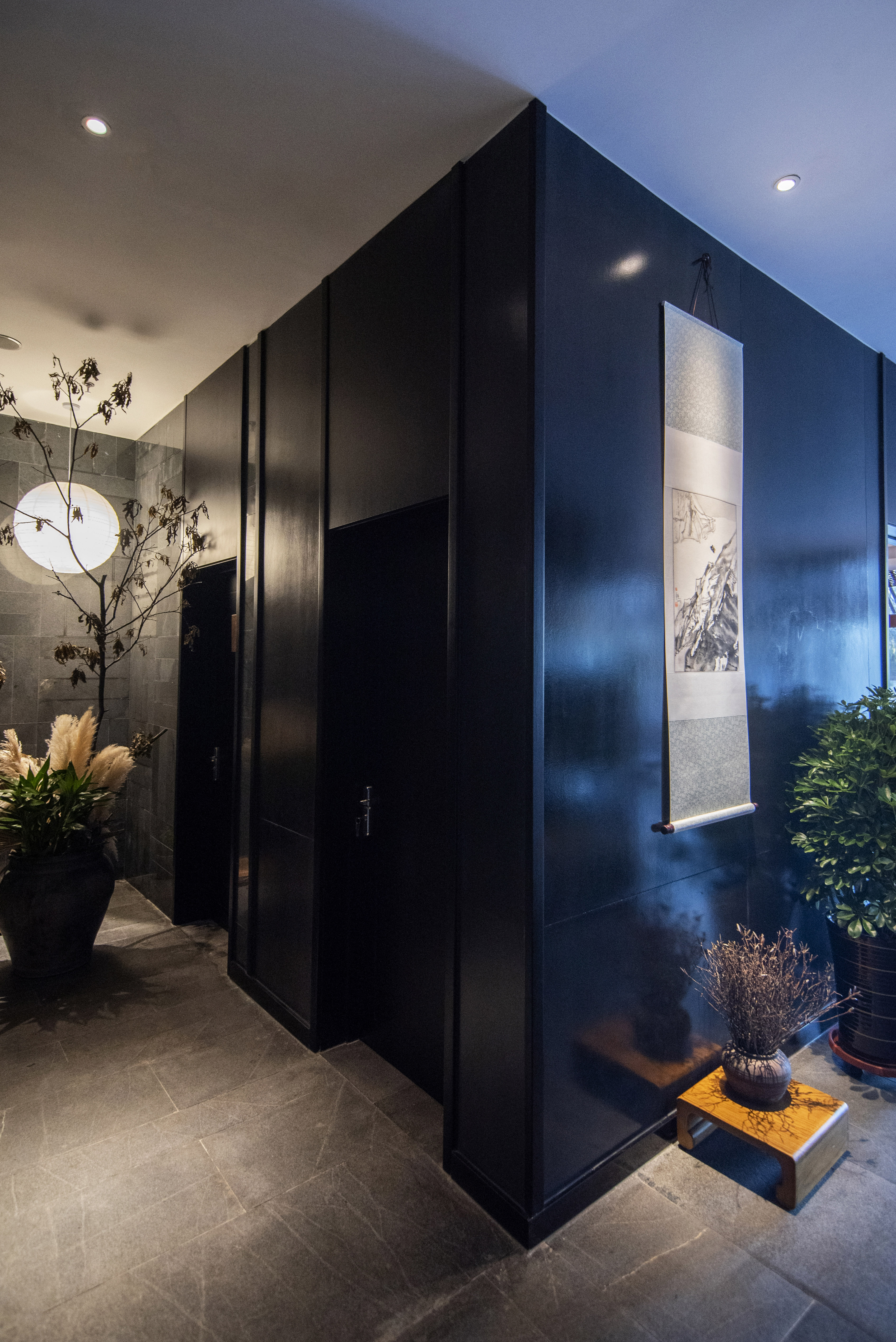 现在的市区出租房,大部分是楼层的底商,虽然接近商圈但又失去了自然建筑营造空间美的自由。本案利用中心80平方的空间建造出一处室内庭院。用发光软膜营造天空,圆钢管营造屋檐,内置水循环系统让屋檐形成滴水,做到“四水归堂”之意,置身其中,古琴声响,四檐滴水荡起涟漪,“桥下”升起薄薄轻雾,鱼儿在水中游弋,如入仙境。使之成为本案最大的中心景观,围绕周围设置雅间,四处“厢房”都能体验到出门即院的感觉。