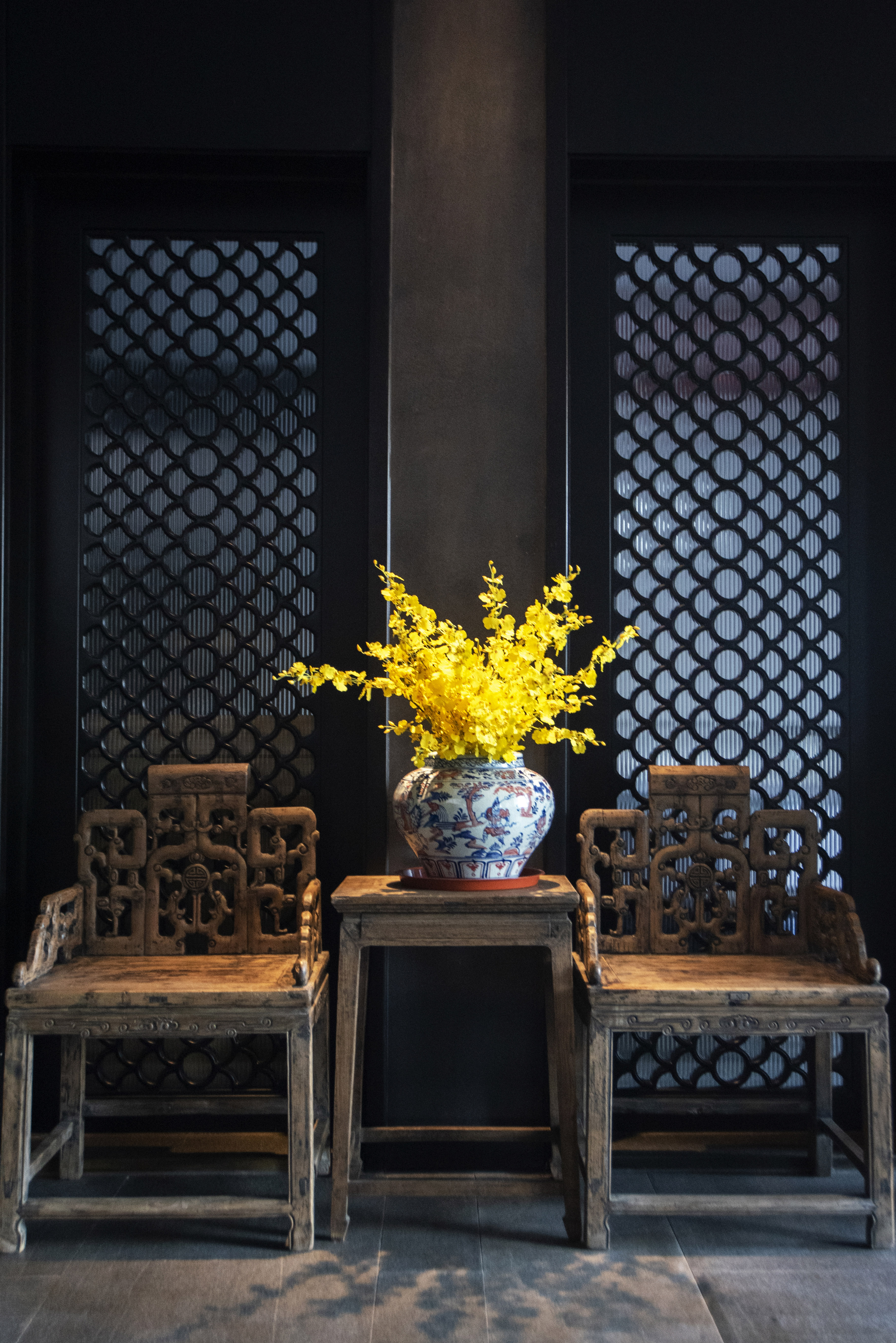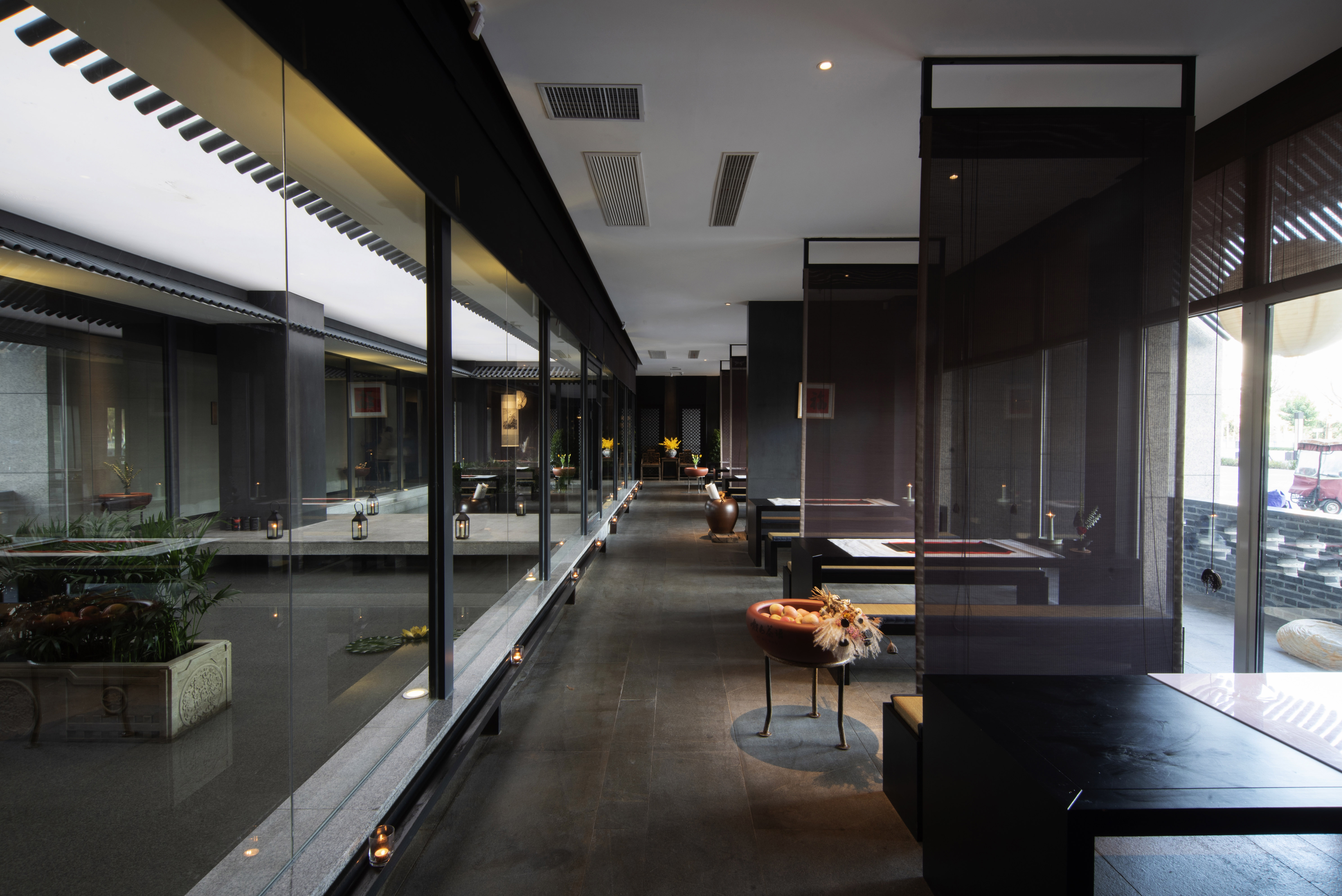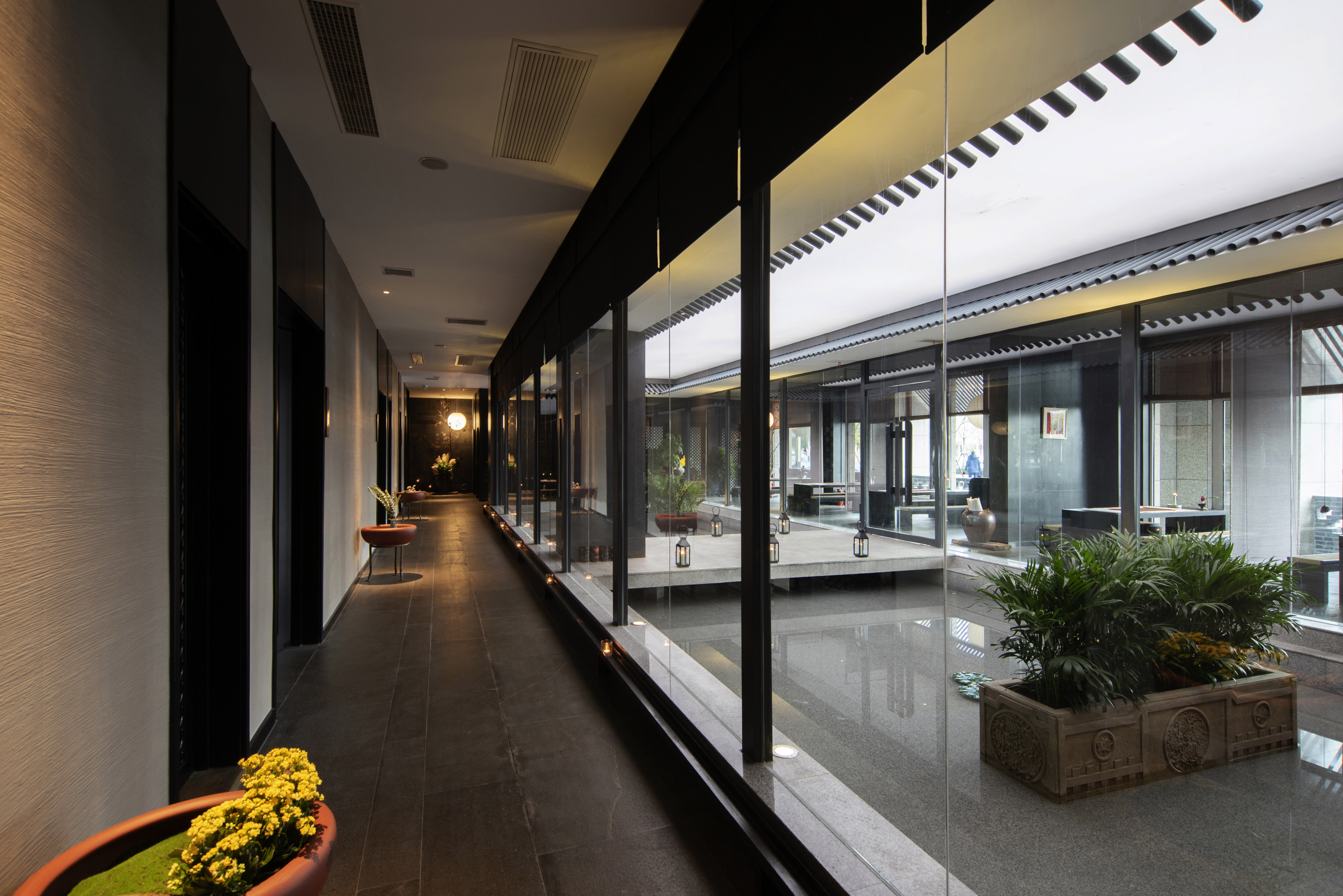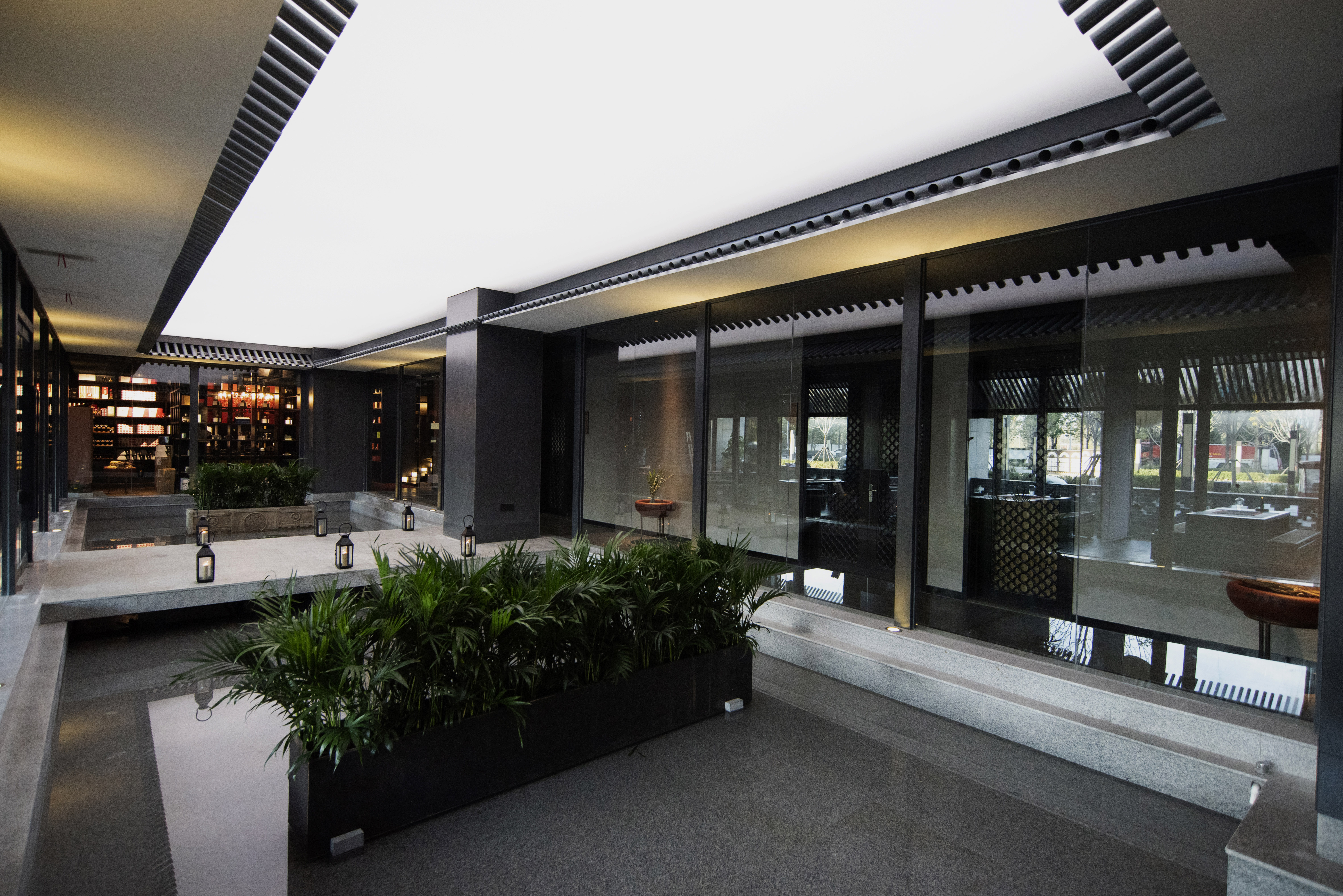 现在的市区出租房,大部分是楼层的底商,虽然接近商圈但又失去了自然建筑营造空间美的自由。本案利用中心80平方的空间建造出一处室内庭院。用发光软膜营造天空,圆钢管营造屋檐,内置水循环系统让屋檐形成滴水,做到“四水归堂”之意,置身其中,古琴声响,四檐滴水荡起涟漪,“桥下”升起薄薄轻雾,鱼儿在水中游弋,如入仙境。使之成为本案最大的中心景观,围绕周围设置雅间,四处“厢房”都能体验到出门即院的感觉。