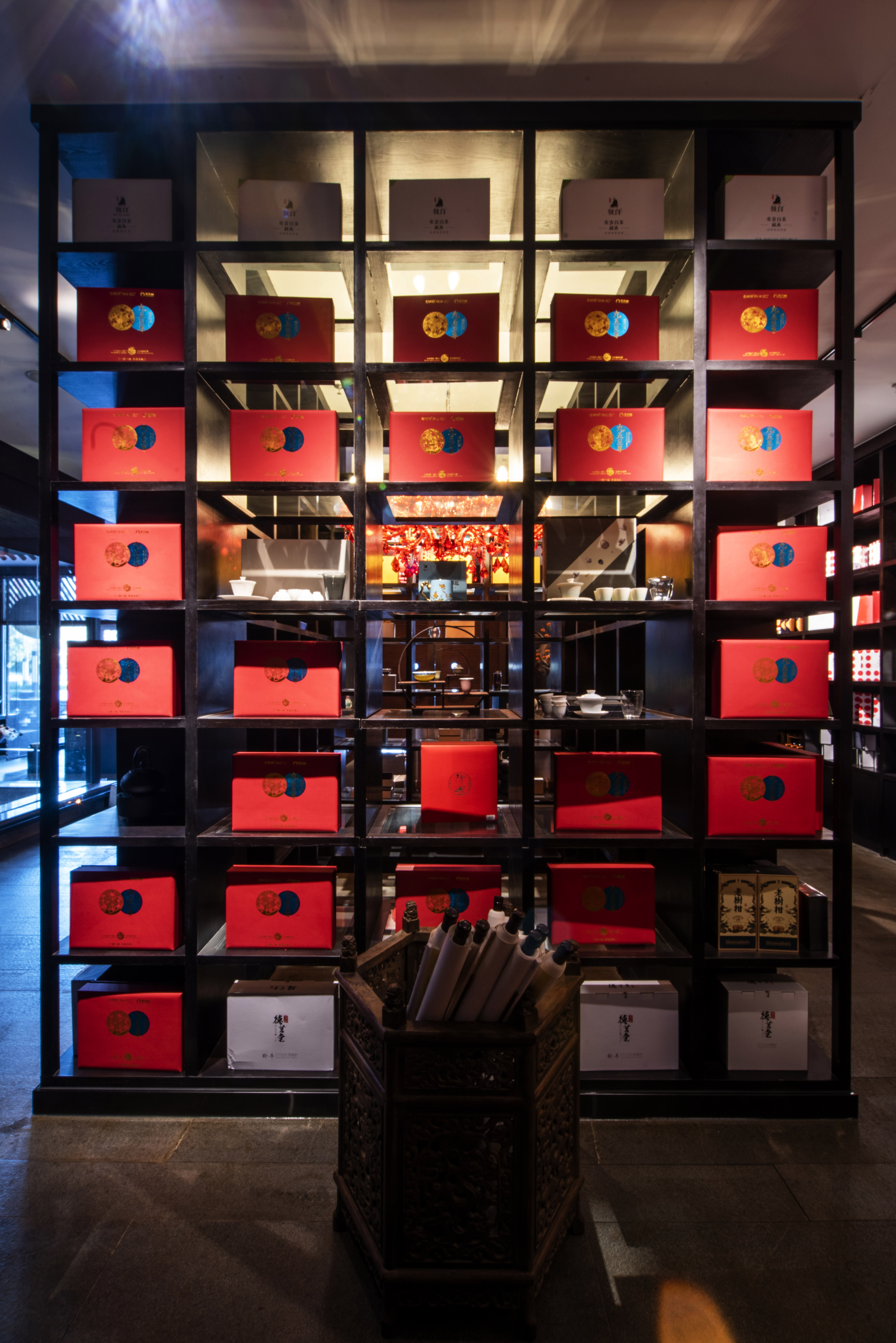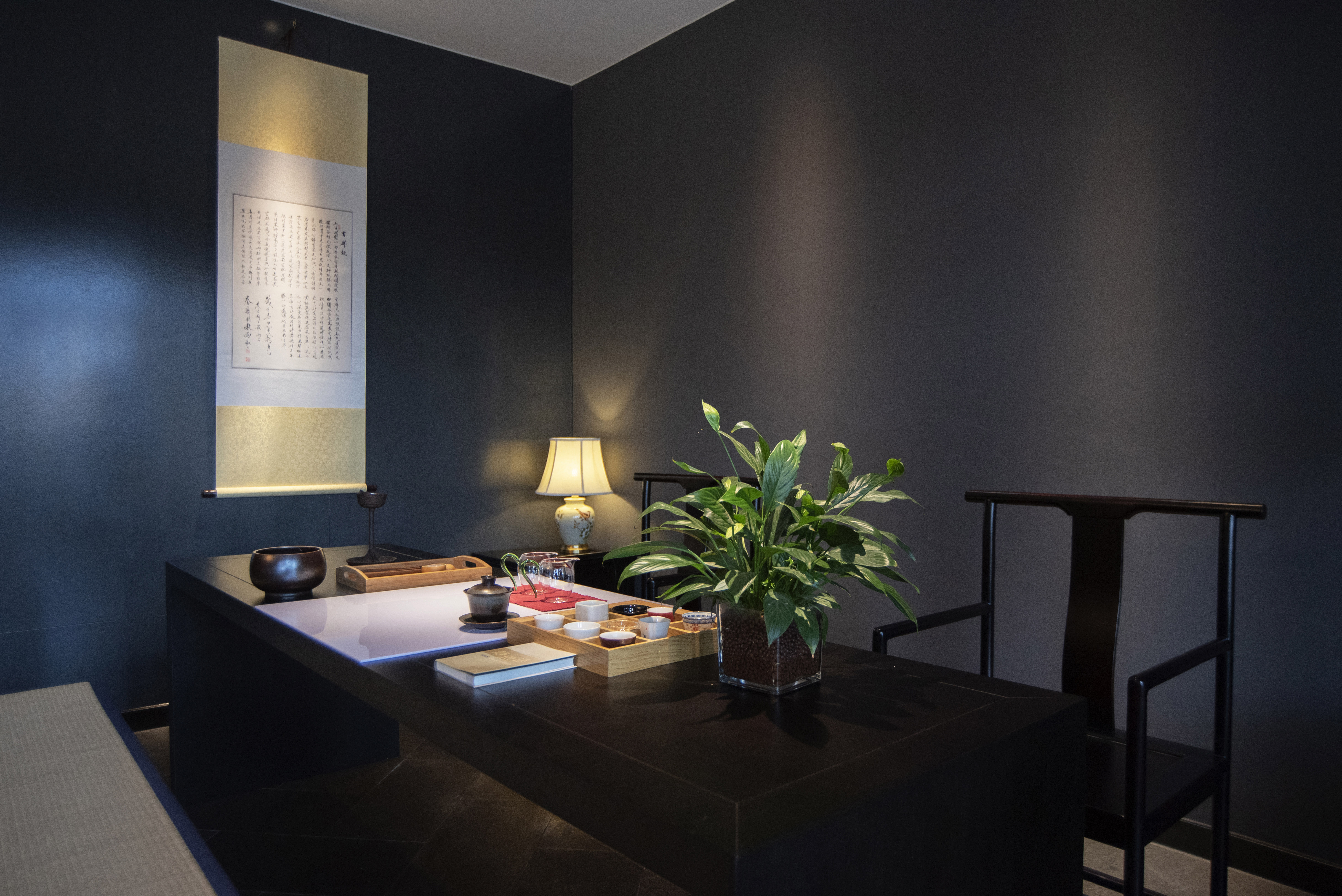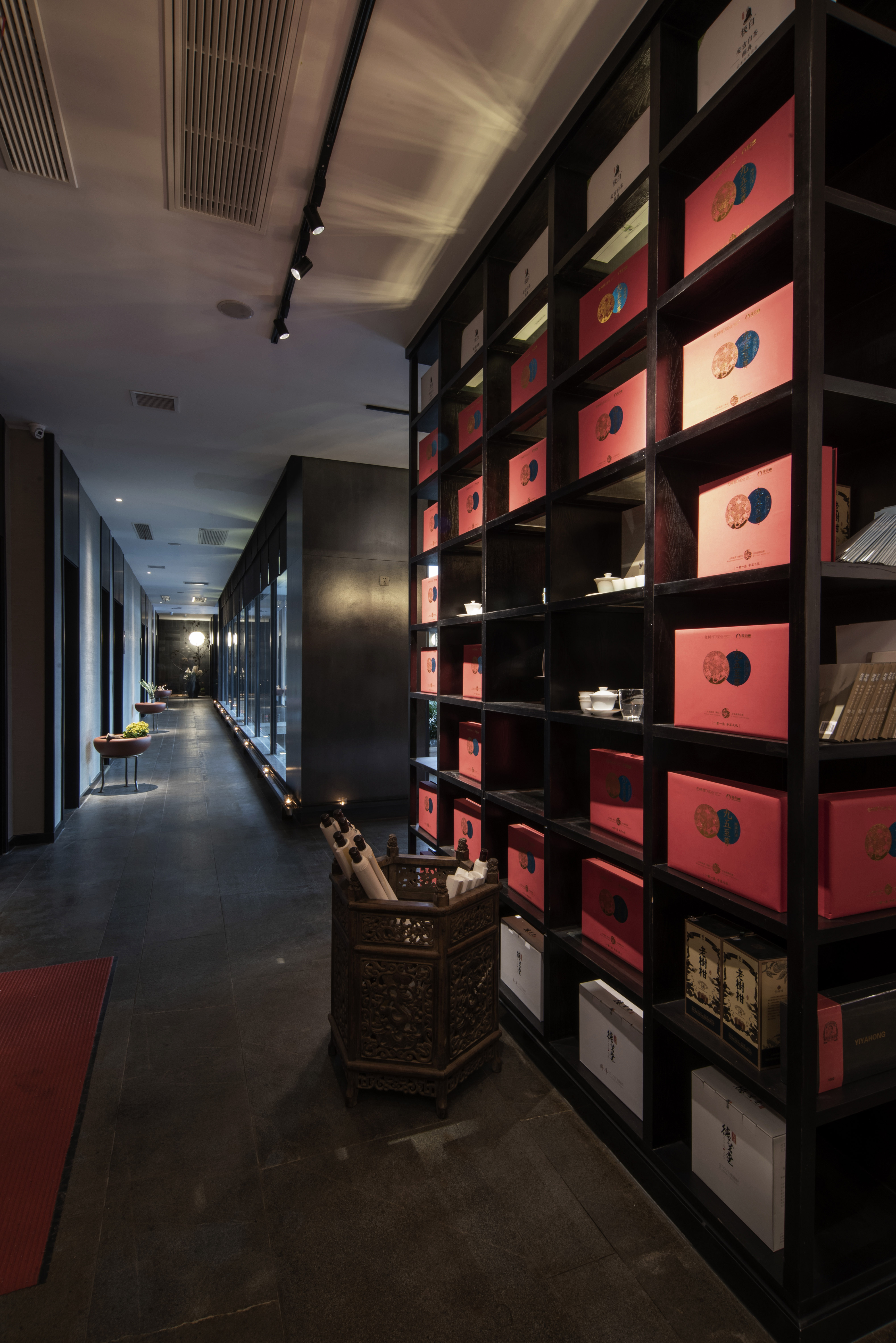 迎门的茶展架,既是摆放茶具和茶的架子,又是一个影壁,目的是为了遮掩后面的楼梯,使之没有“直冲”感,仿若“藏经阁”件件是珍品。