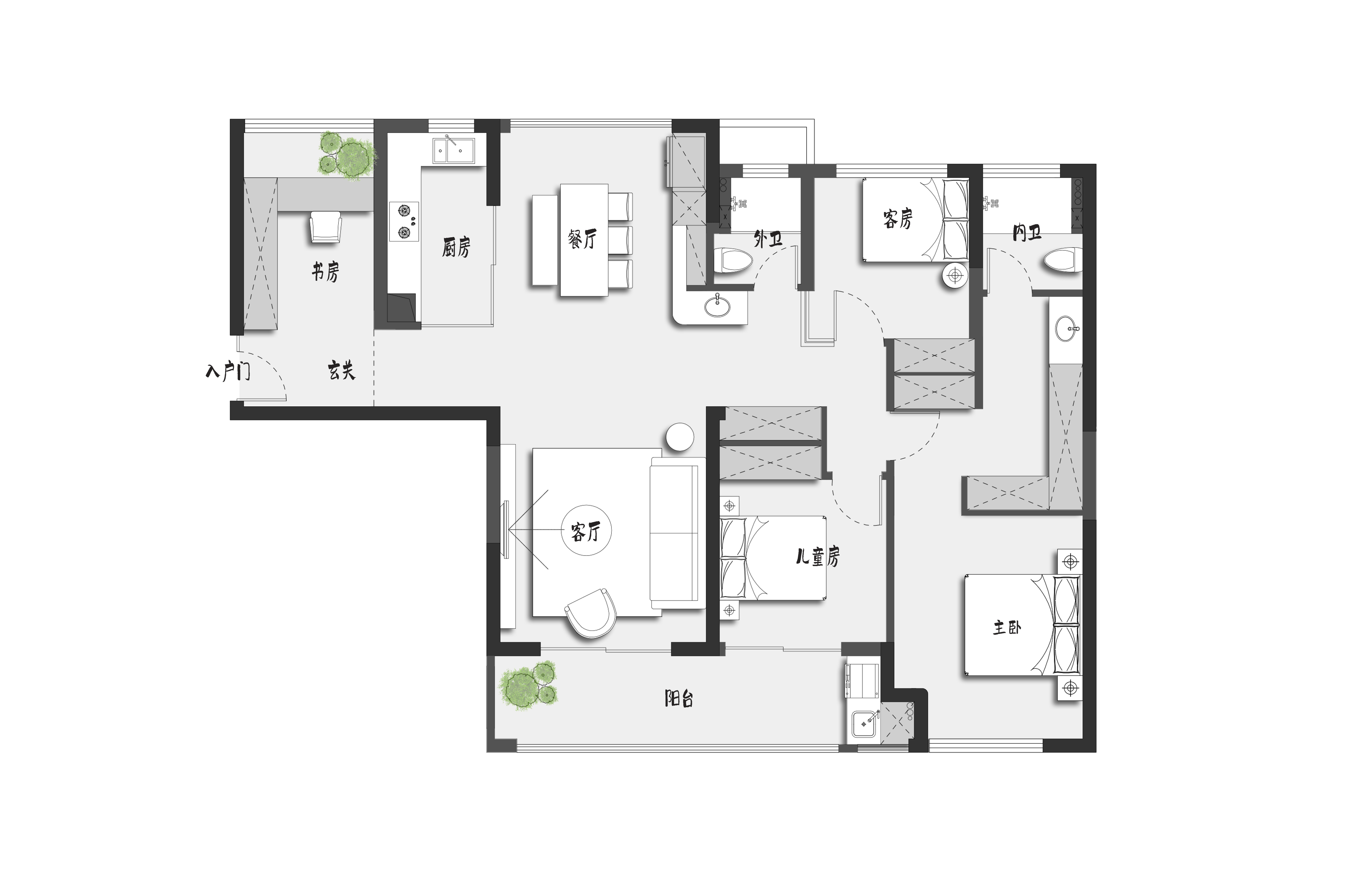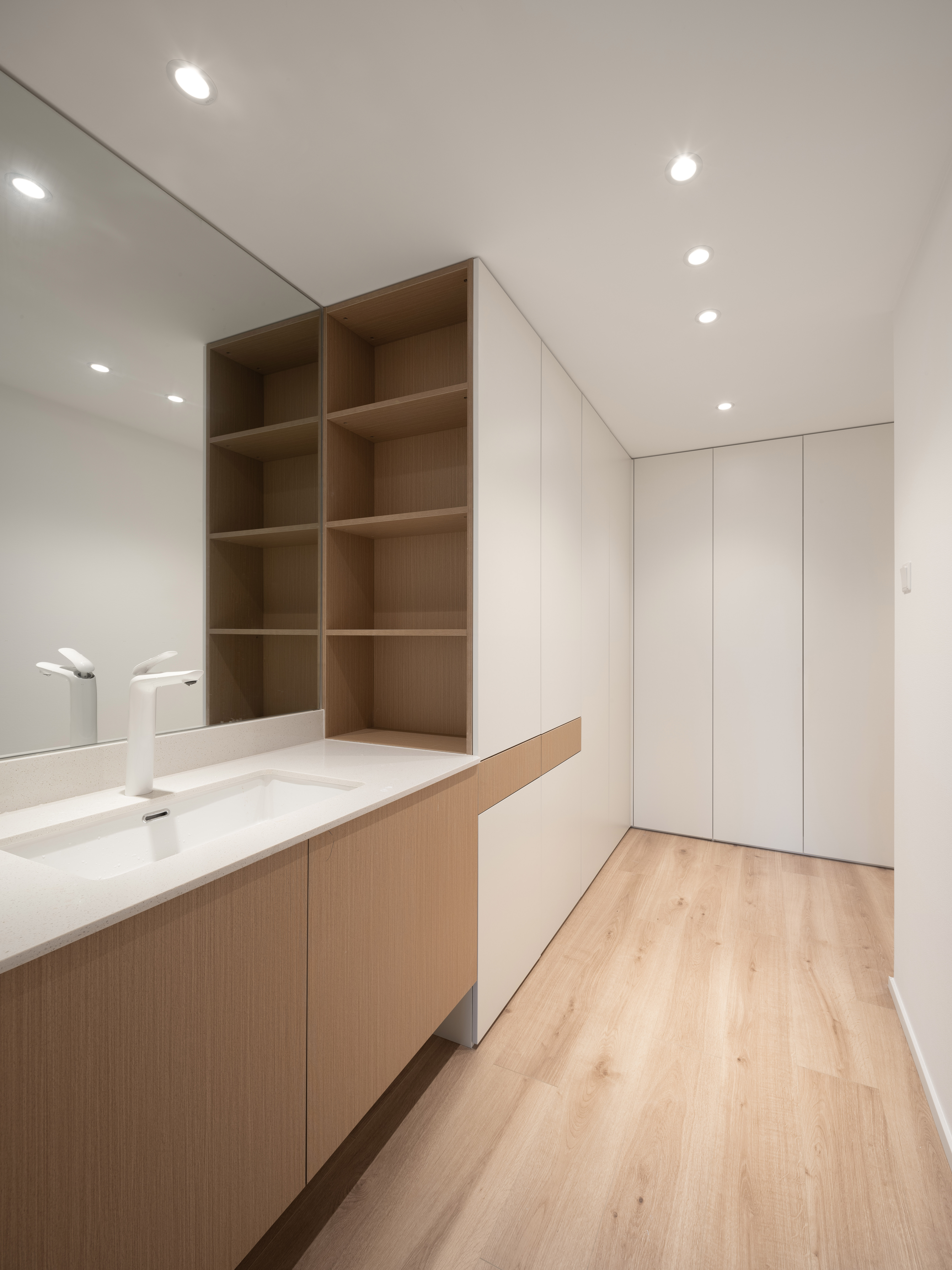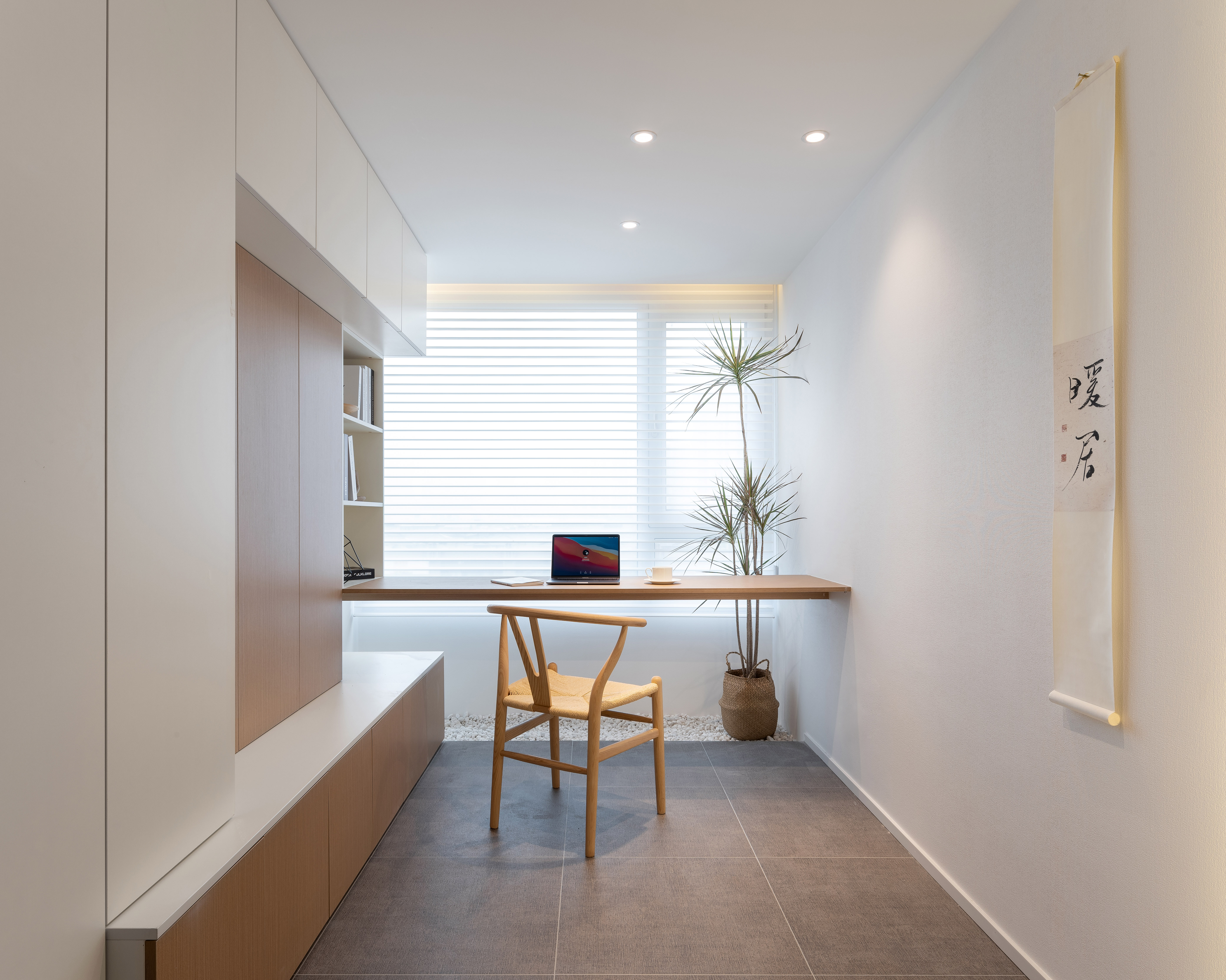 空间布局:打开进门赠送的小房间,使过道采光更充足,进门做了有换鞋区功能的门厅,同时兼具书房功能。厨房采用L型玻璃移门,使视野更开阔,过道明亮。通往卧室的过道缩短,改变主卧门的方向,使主卧增加一排收纳柜。