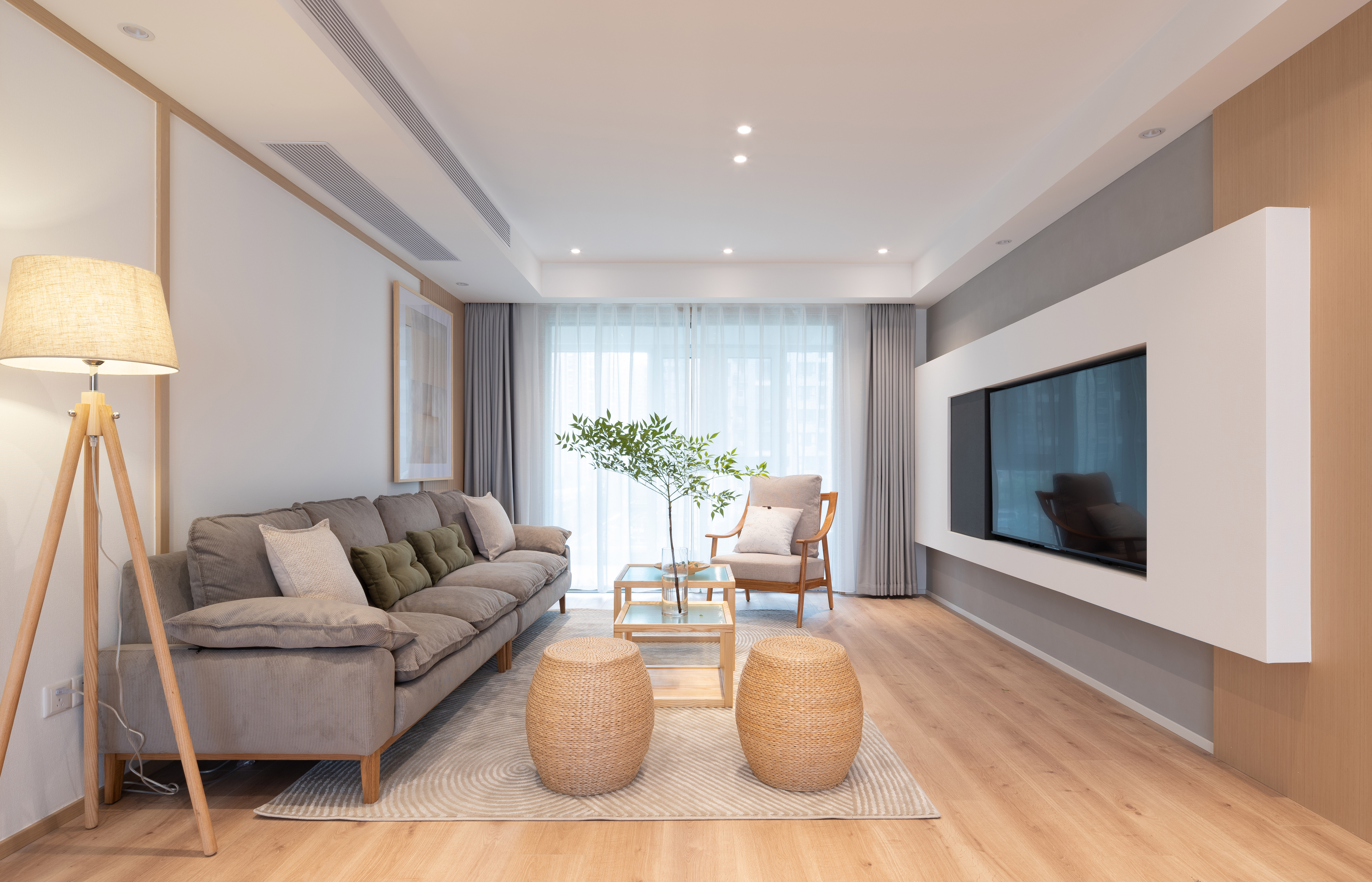 设计选材:墙面用科技木木饰面做背景,环保又经济实惠,电视背景用了一些水泥漆,墙面辅面大面积用了进口海吉布。