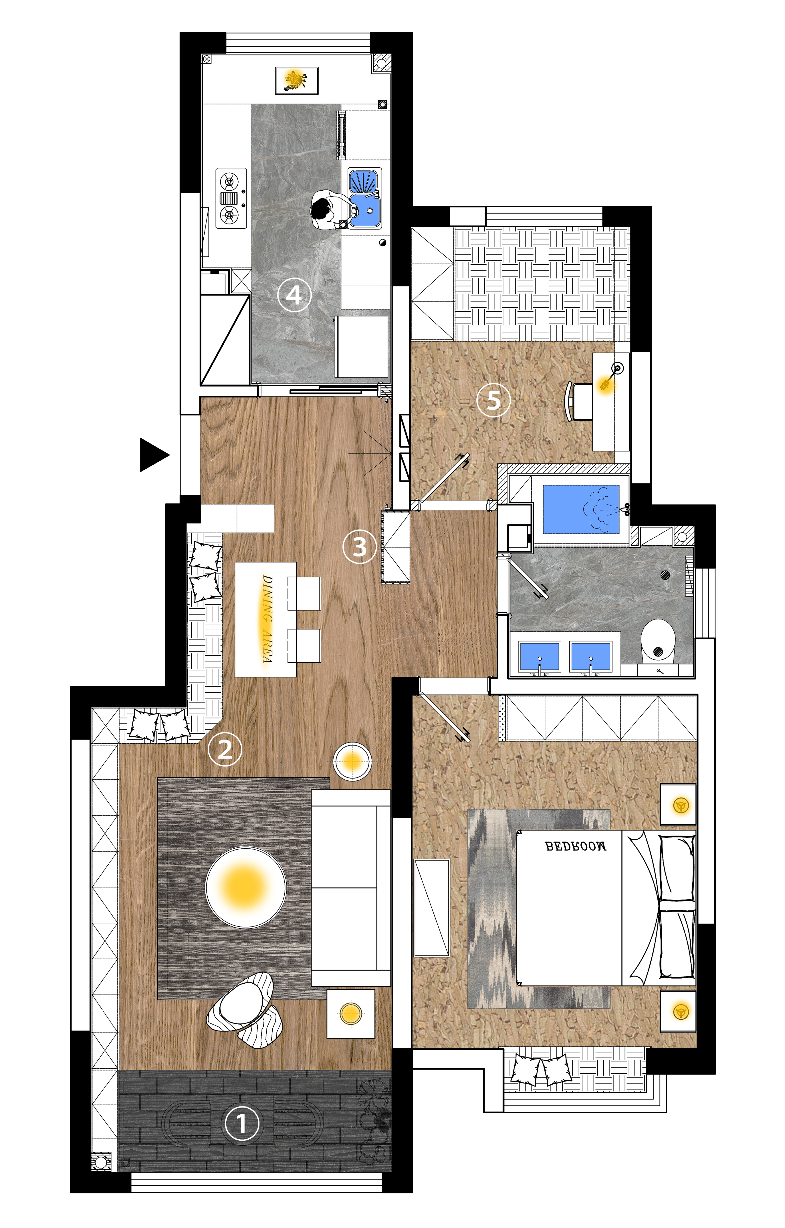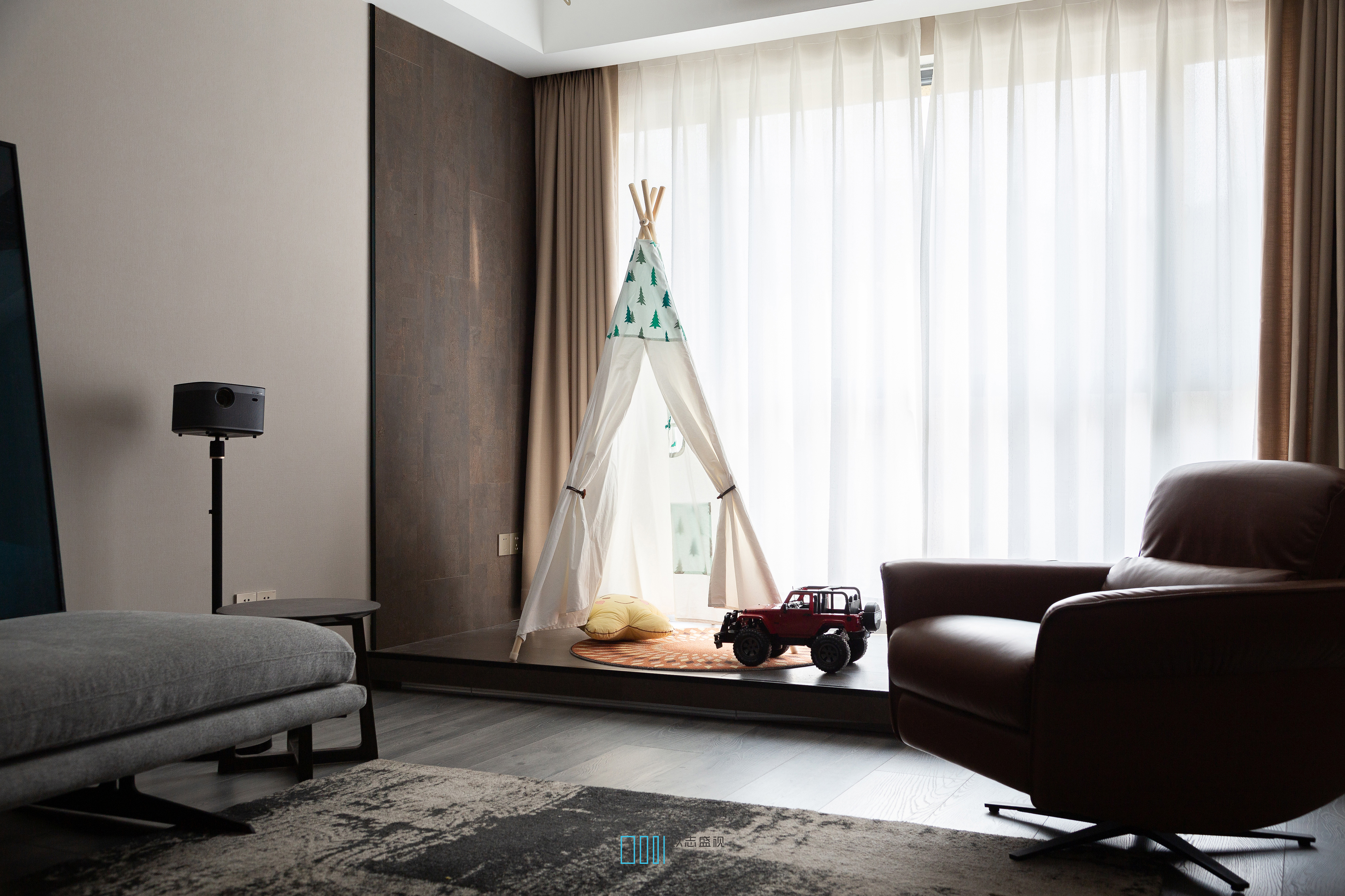 空间布局:1.南阳台两侧墙垛拆除打通公共区域,提升客厅进深视野;在采光充足的南侧作为休闲区,地面抬高150mm,划分空间形势,软木地板延伸至墙面,利用界而未界的概念墙面增加空间层次。