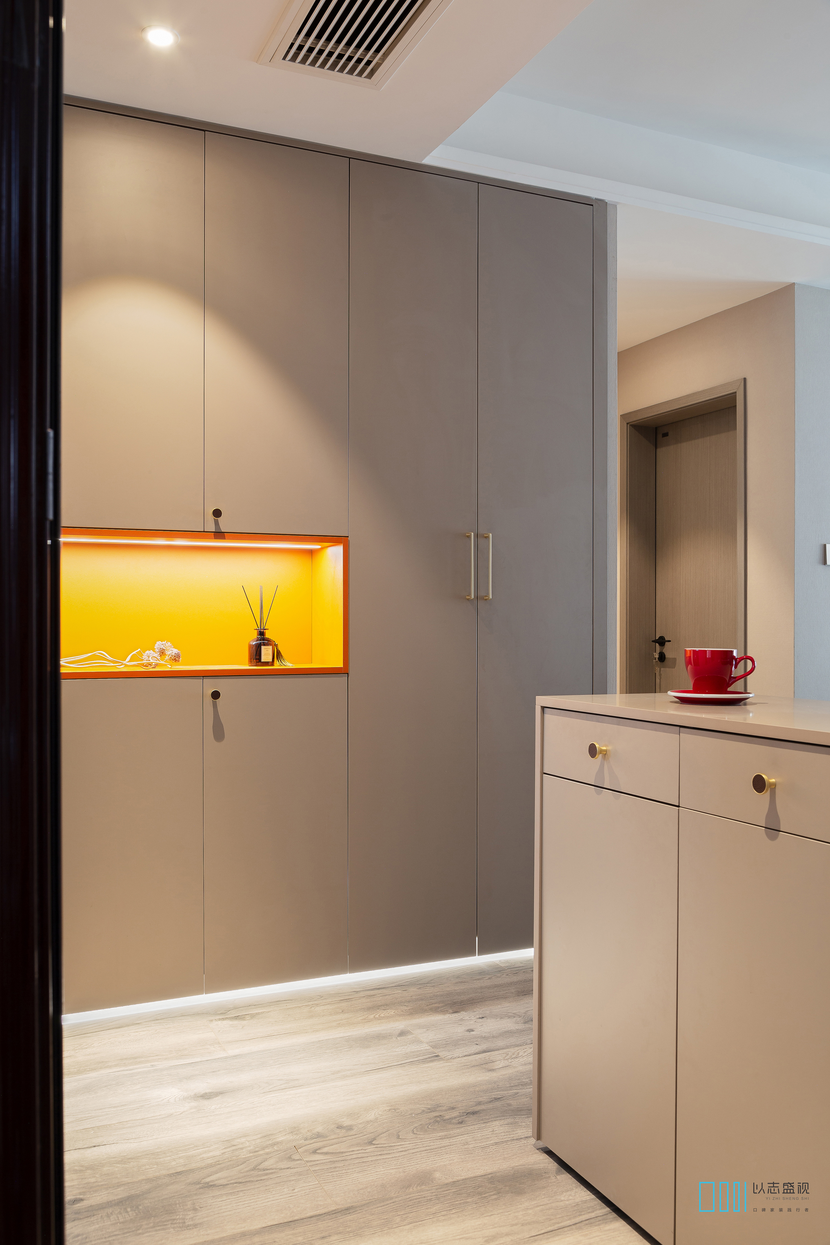 2.进门正对入户门厅,并有强弱电箱,设计为深度350mm的鞋柜,一侧原非承重墙拆除,借一部分走廊区域做深度550mm的衣帽柜,既遮挡了强弱电箱,还实现了鞋子、衣服的分离收纳。