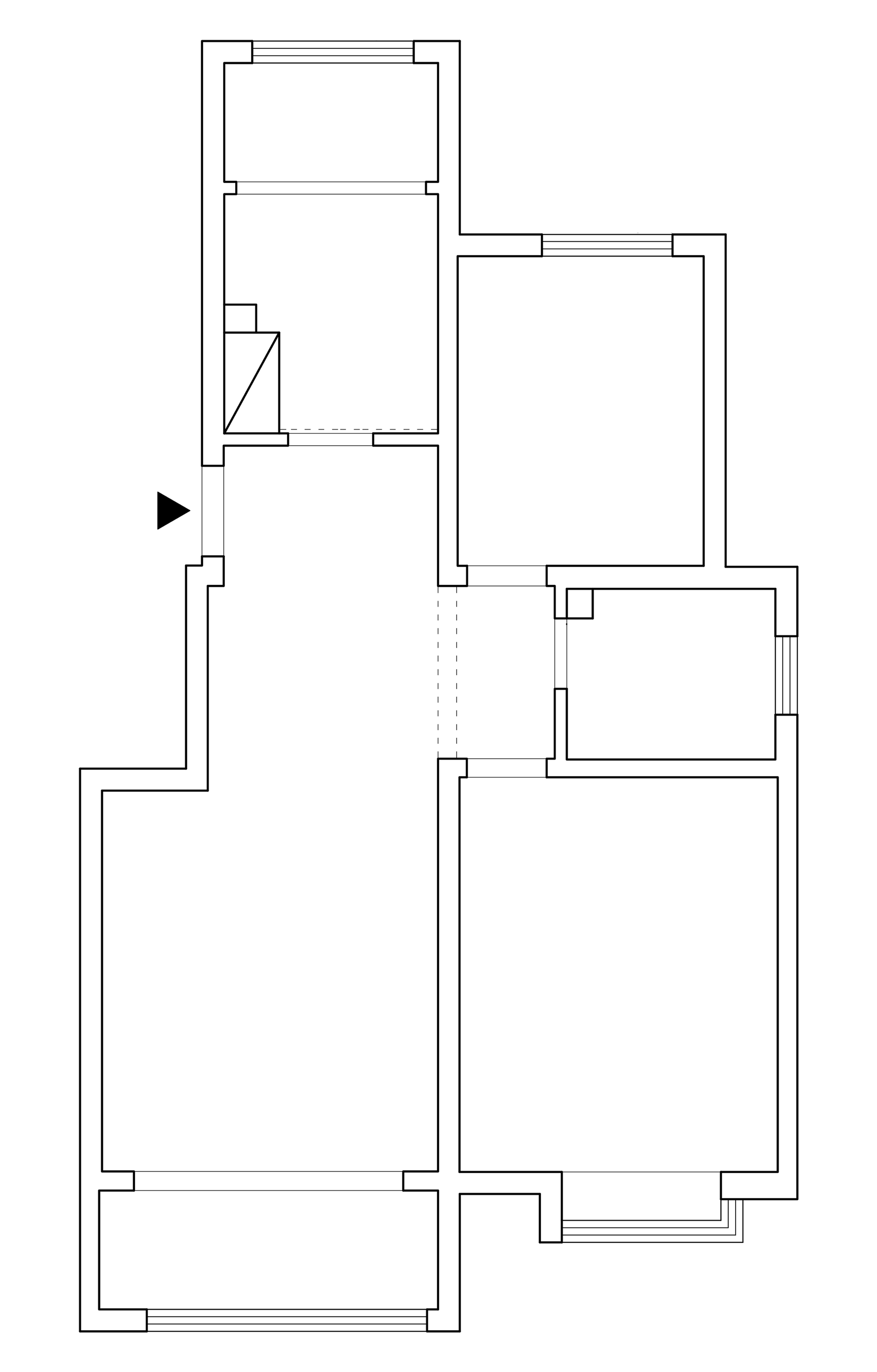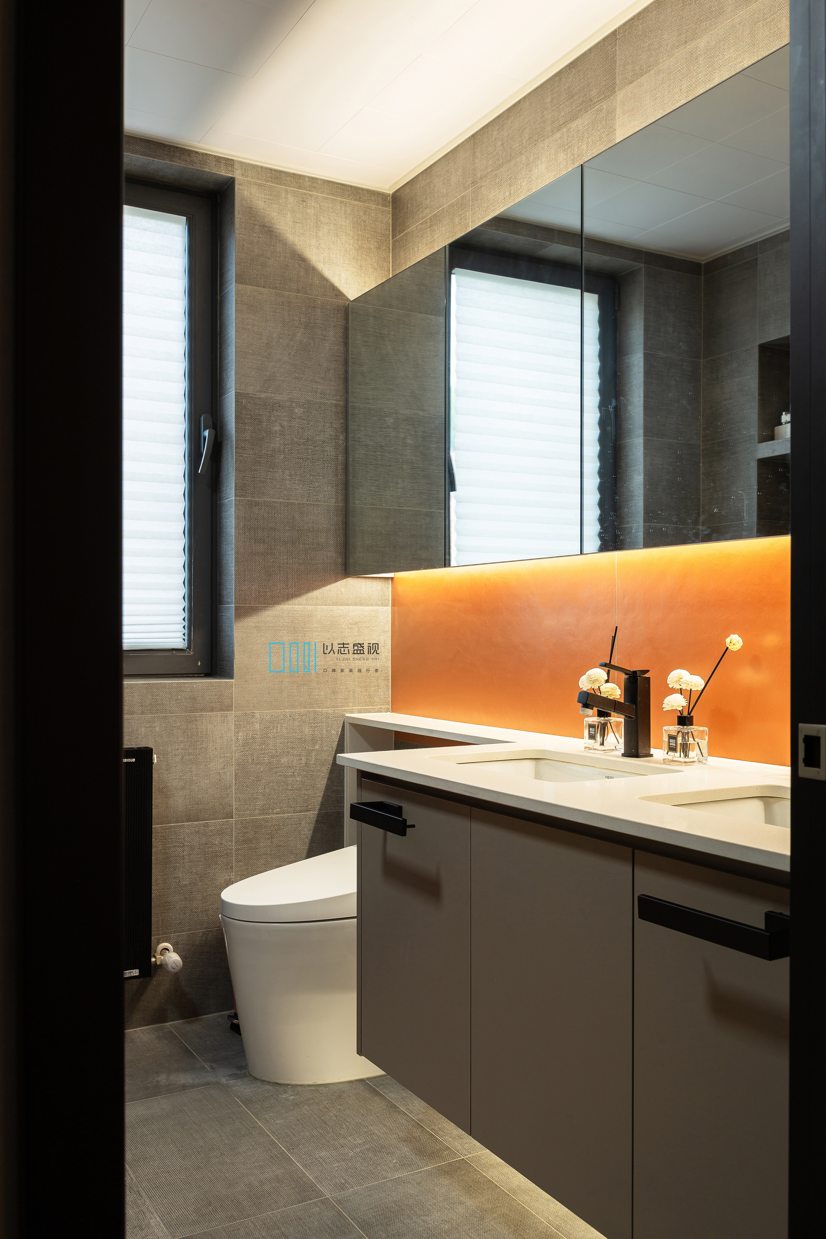 4.原卫生间空间较小,故借用了北卧室的部分尺寸,对面积进行扩充,如果按照原卫生间布置,每个功能区使用都比较局促,还不能实现干湿分离,改造后的卫生间功能区划分明确(干湿分离、储物壁龛、双洗手盆)等。 -