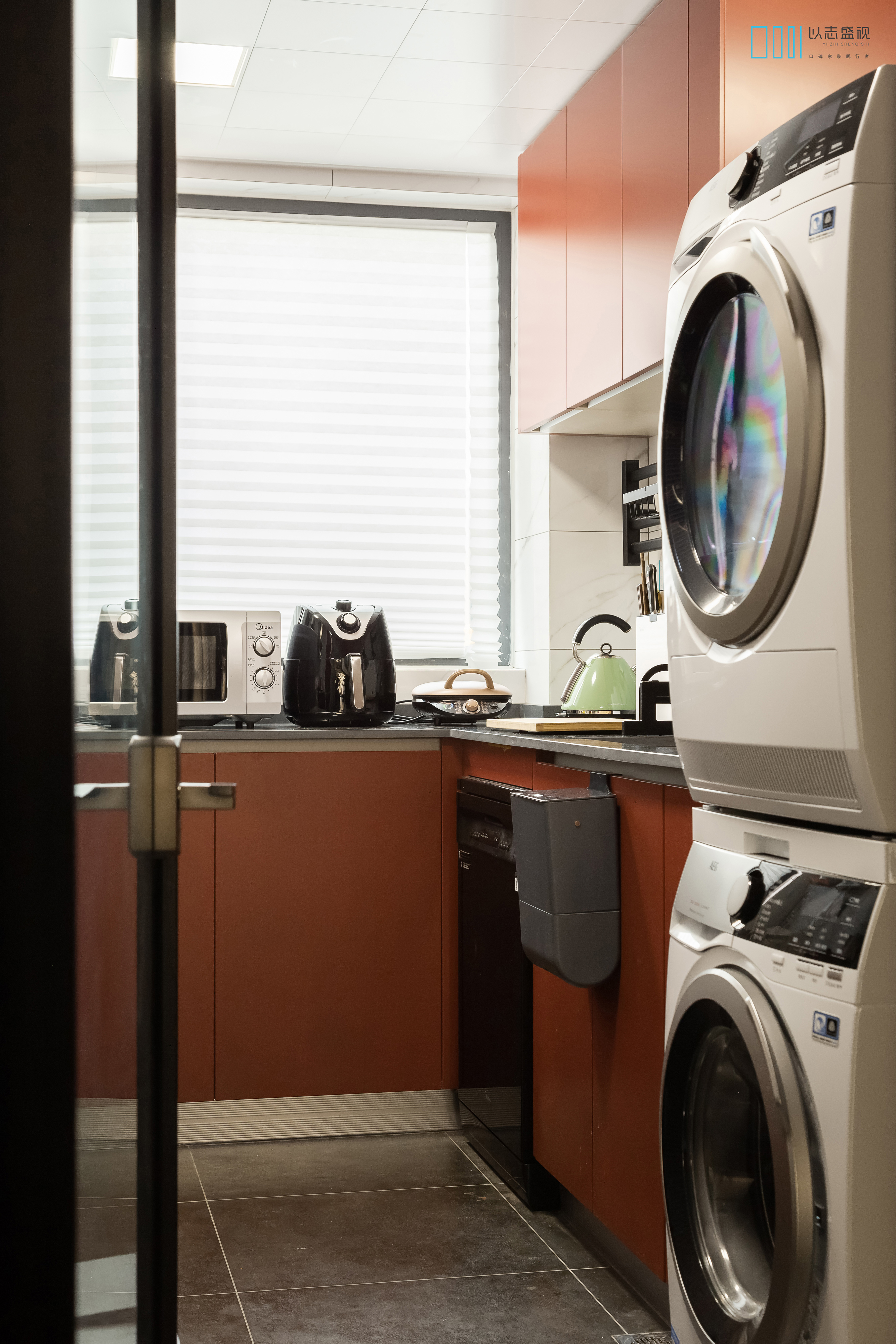 3.厨房改造是业主最关心的问题,小电器较多,但面积有限,还需考虑洗护问题,所以将北阳台和厨房打通,增加操作和收纳空间,将洗衣机、烘干机叠放处理,同橱柜外观齐平处理,整体划一节省空间。