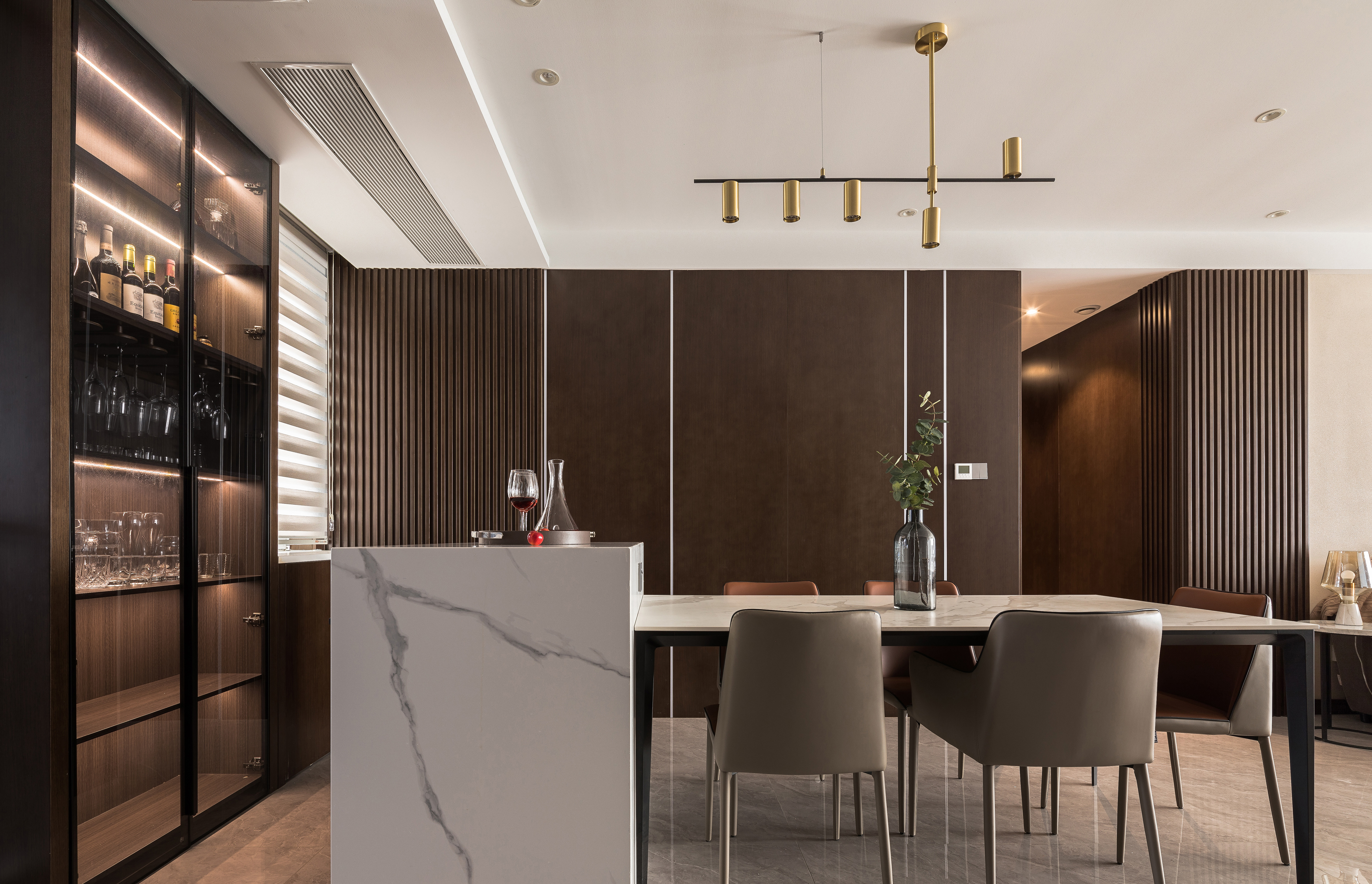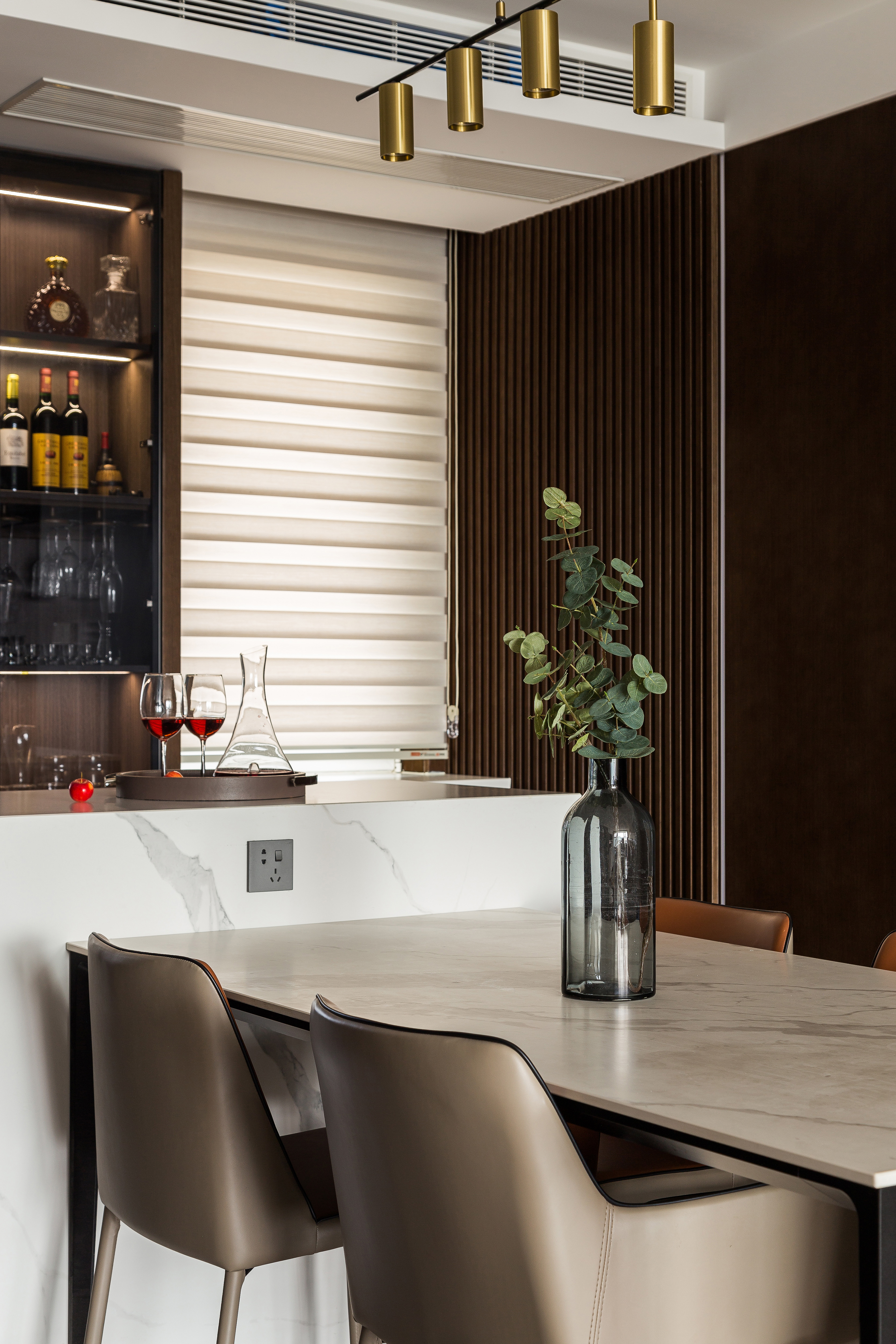 3.环绕动线的岛台餐桌组合,暗藏了蒸烤箱,满足家人其乐融融一起动手烘焙的愿望。身后的大玻璃酒柜,能让三五好友相聚,开一瓶业主的珍藏,把酒言欢。