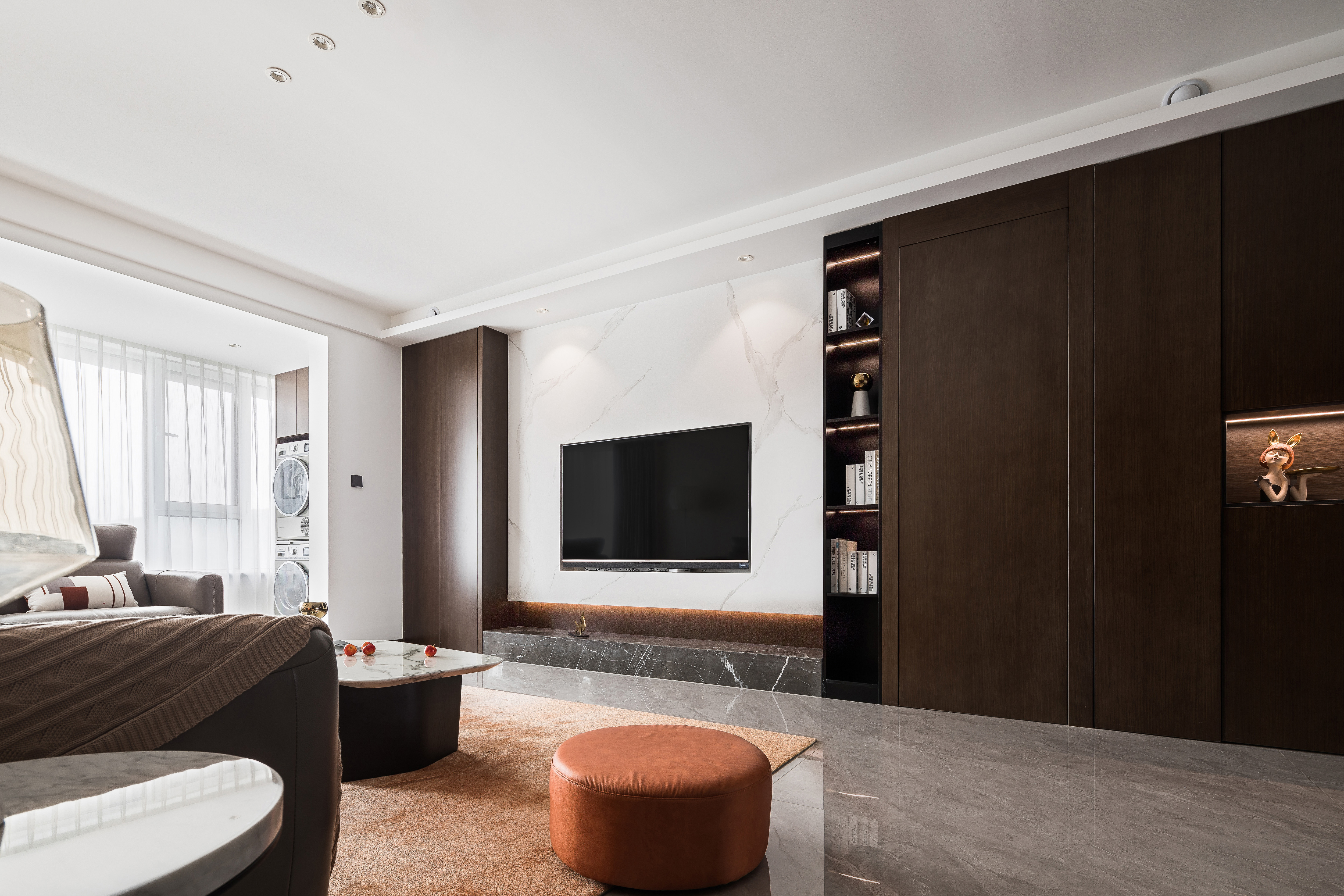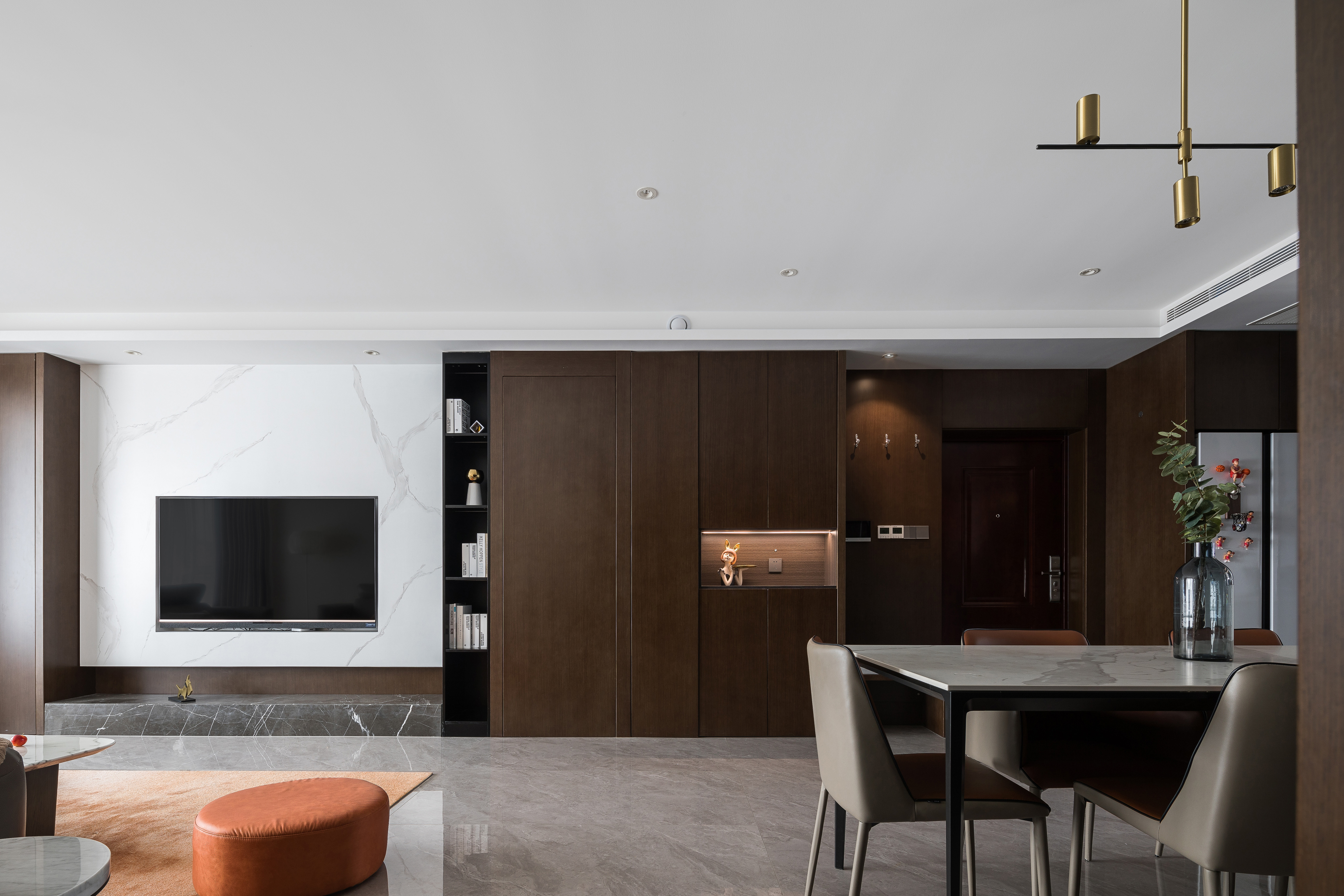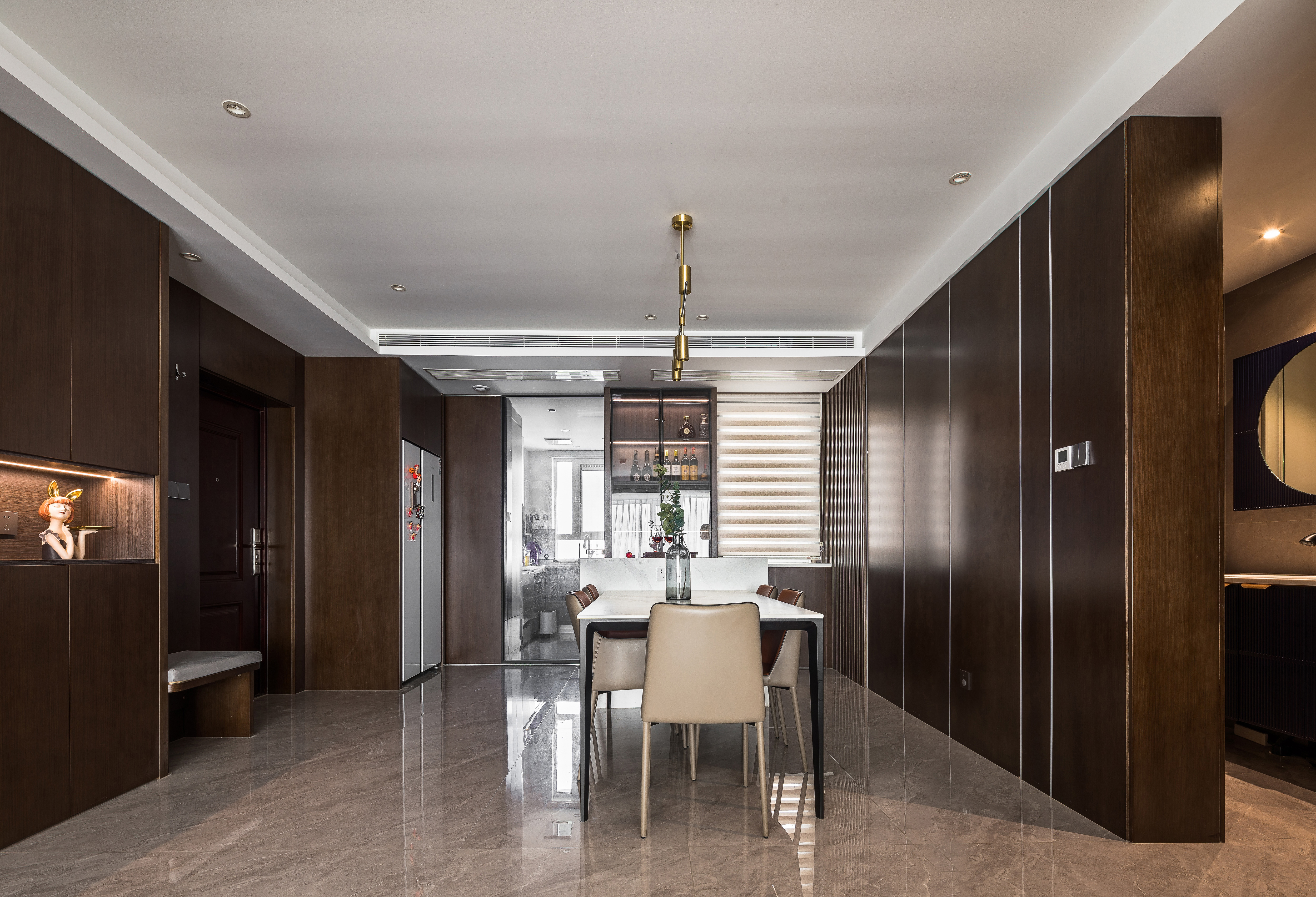 2.面积配比较小的厨房在设计把控上更多了一份心思。冰箱外移和入户的鞋帽柜、书房隐形门、展示柜等同墙造型融为一体。采取外挂移门,平时是开放厨房,煎炒烹炸时又能让中厨不干扰其它空间。