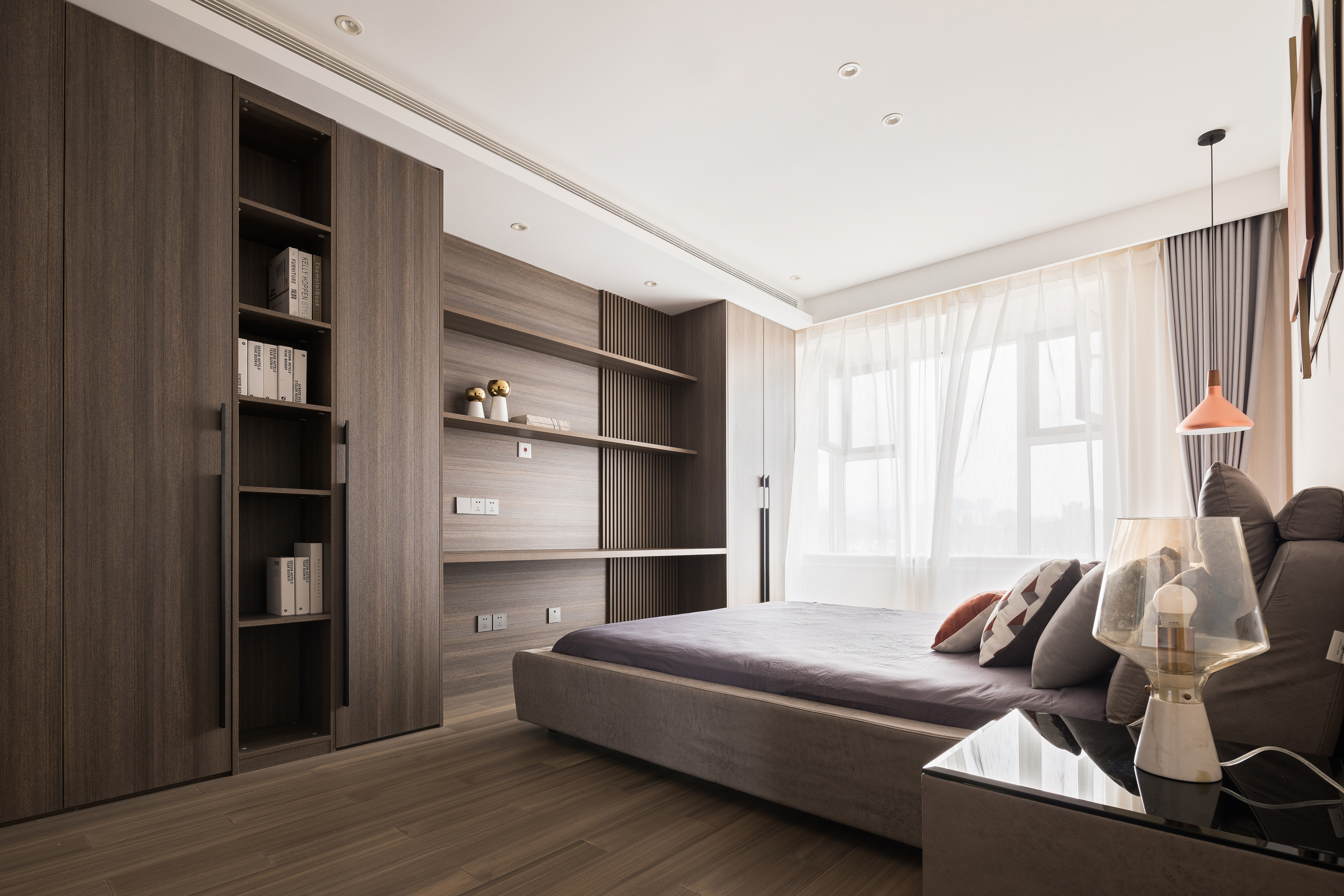 4.主卧室调整床头朝向,化零为整给出更完整的空间来做收纳,同时满足了女业主对超大梳妆台的渴望。 -
