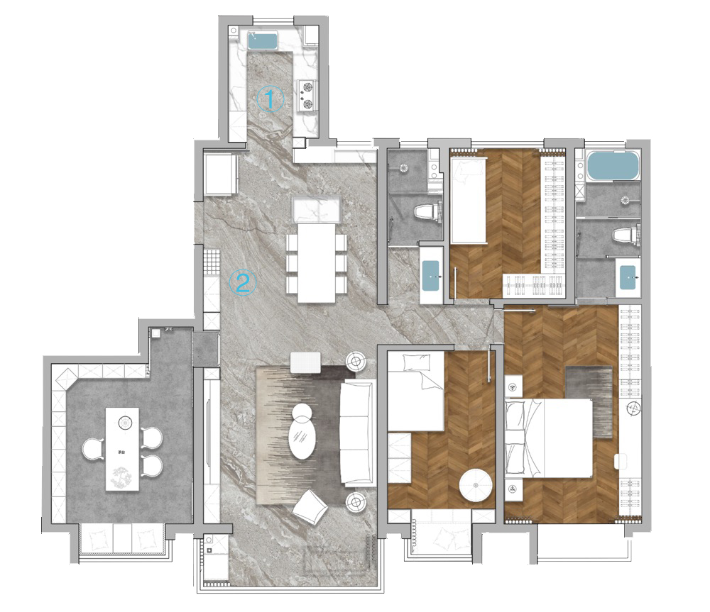空间布局:1.南阳台一侧墙垛打通融入客厅空间,既增加了采光又收获了窗外的无敌山景;另一侧的墙垛处保留了独立的洗烘区,让阳台承担多一份功能。