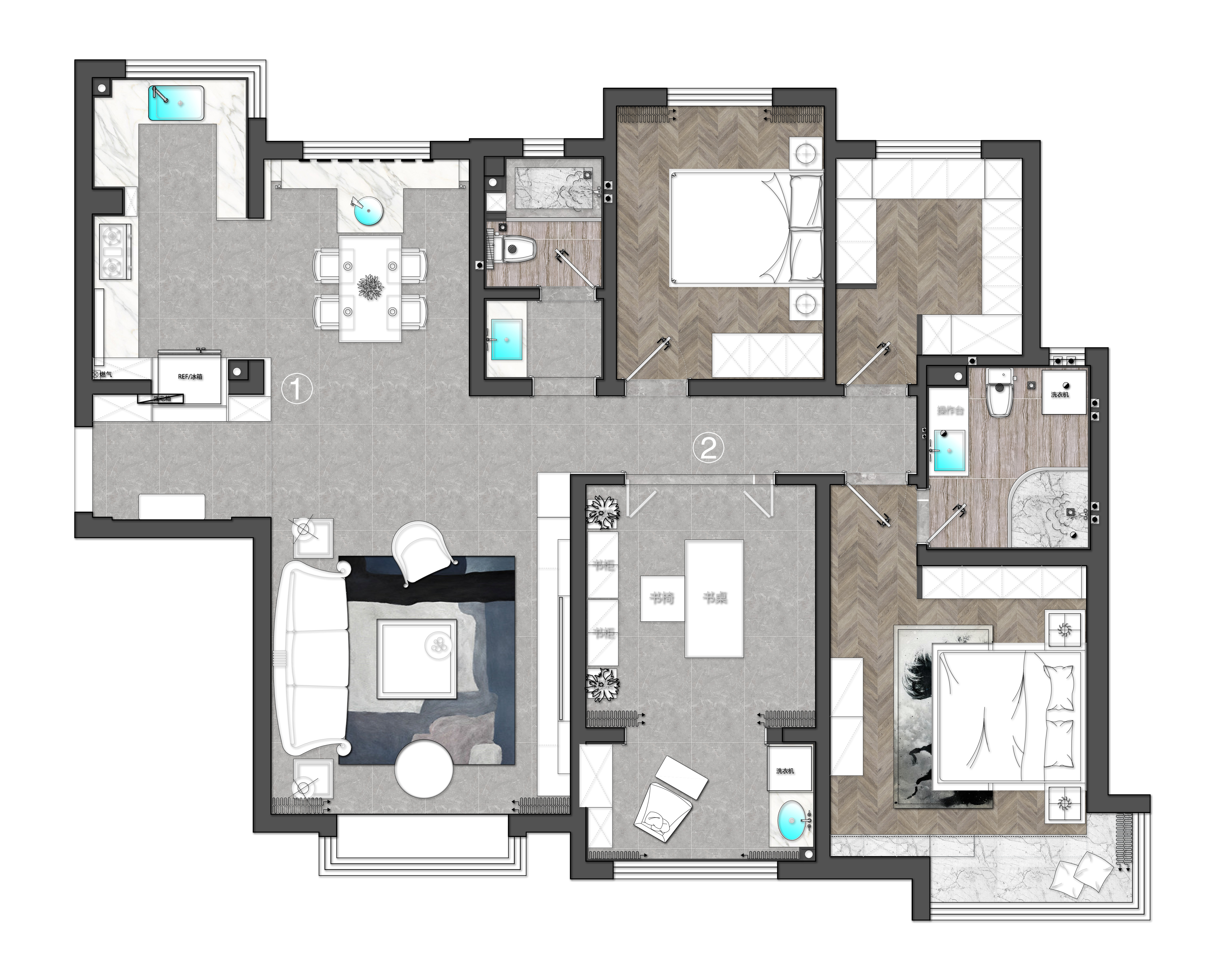 空间布局:书房墙体的拆除,把光引入到走廊空间,让空间更通透有呼吸感;