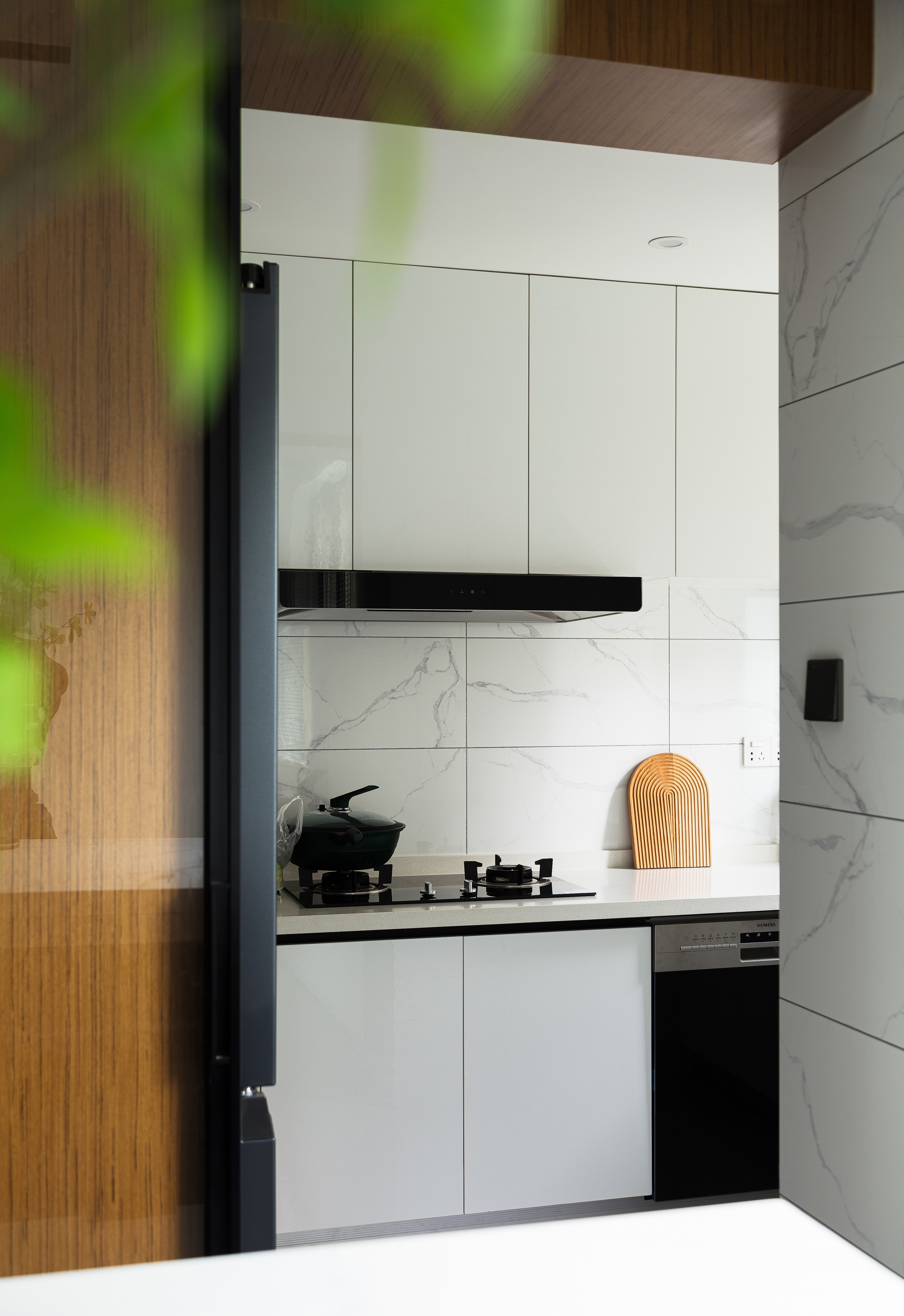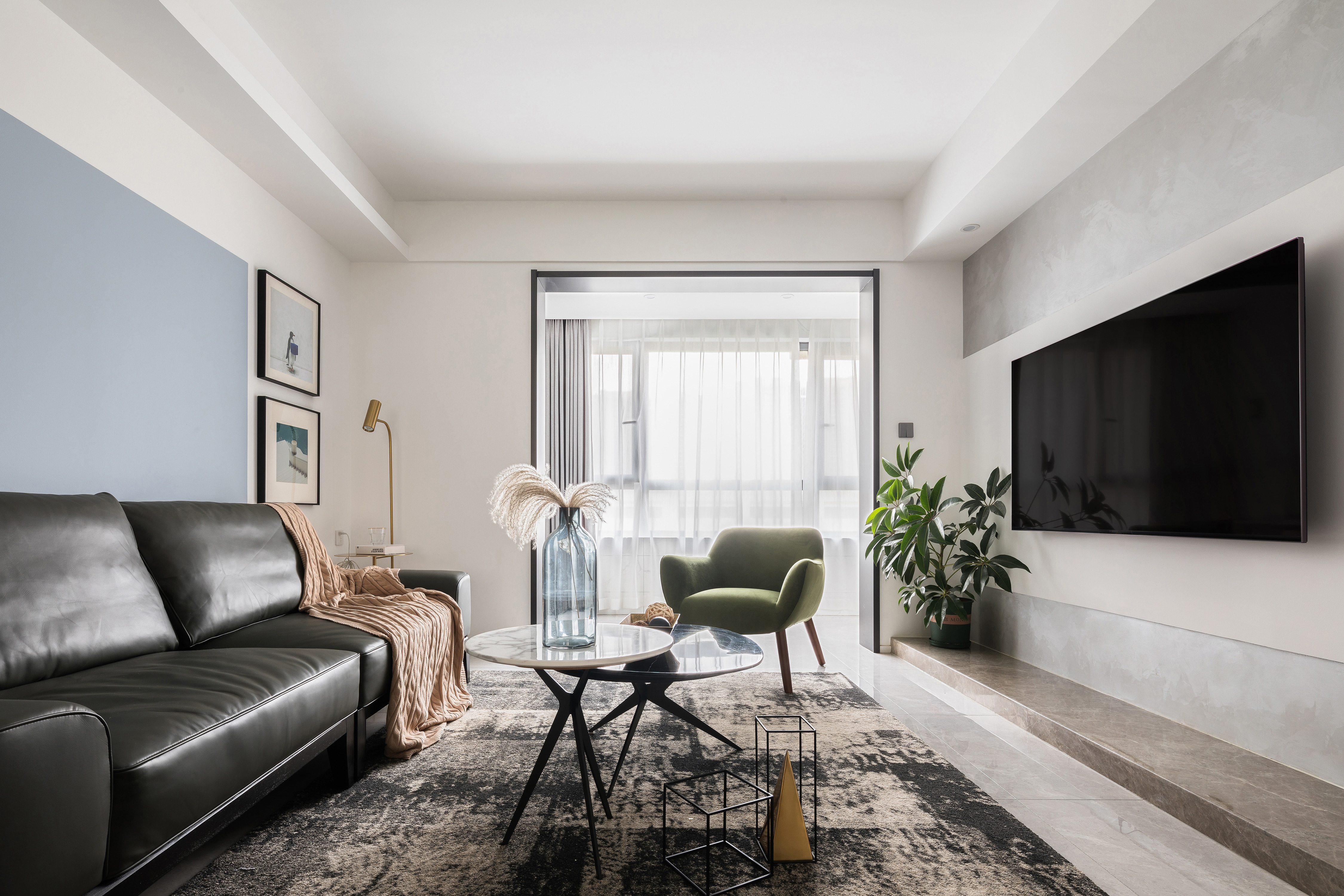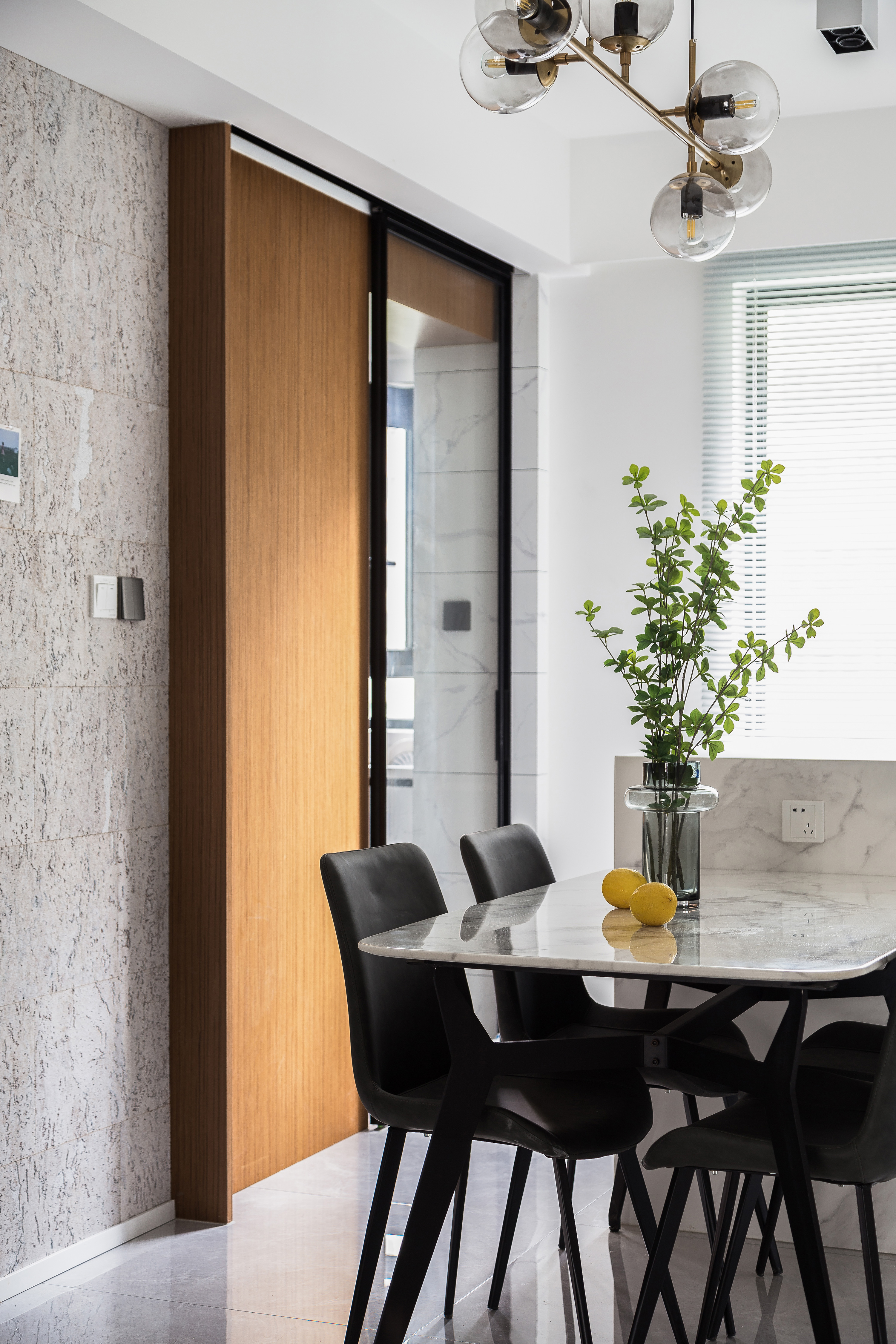 2.客厅阳台两侧墙垛因承重无法打开,在视觉上和地面材质上弱化门洞,拉伸客餐厅的空间