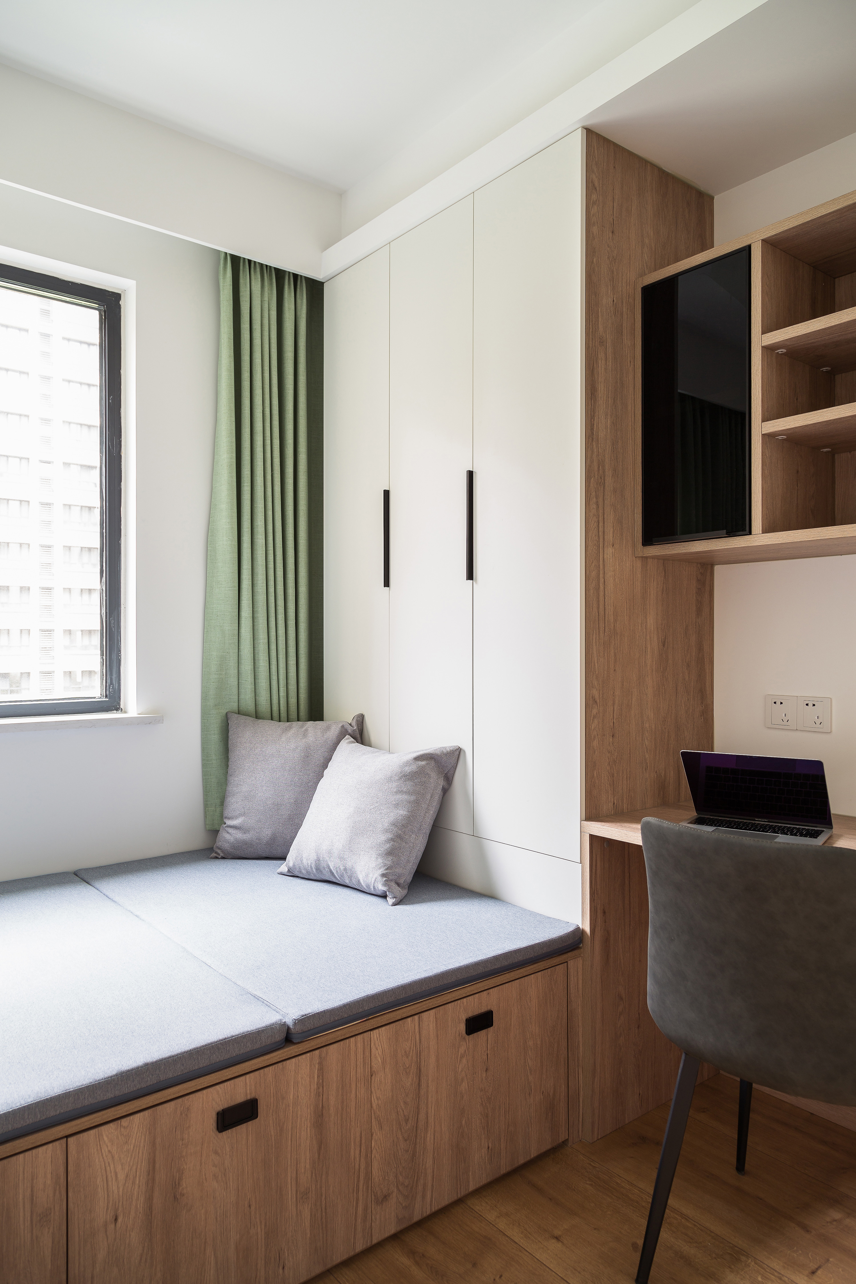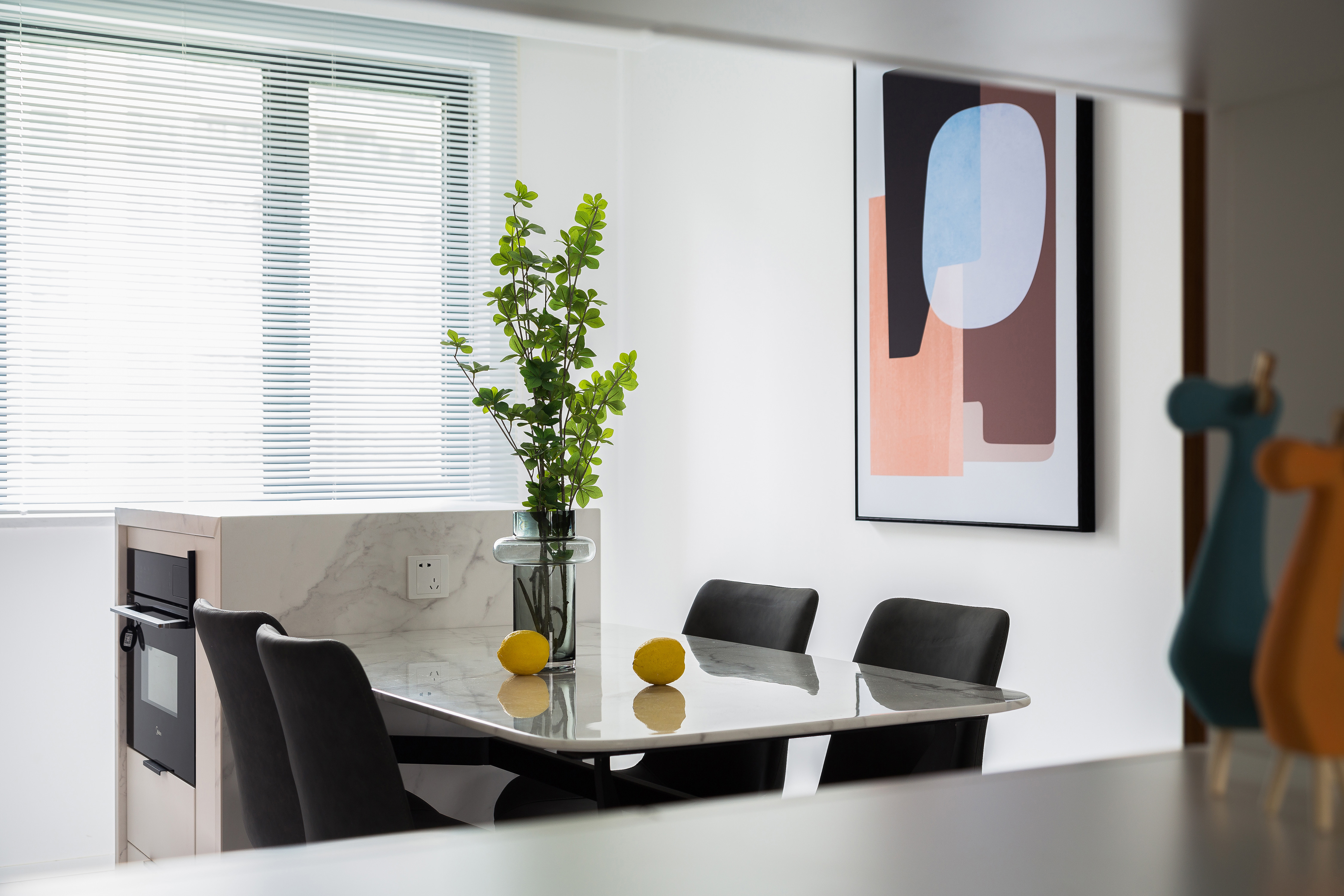 用户体验:门口玄关是客户拿到房子比较愁的一个点,后期在门口设计了对称的鞋柜和摆件台,划出来了一部分空间,既满足了对玄关的需求,也把客厅和餐厅之间做了隔断,不影响通风的前提下巧妙的把原本长方形的空间划分成了单独的客厅和餐厅。