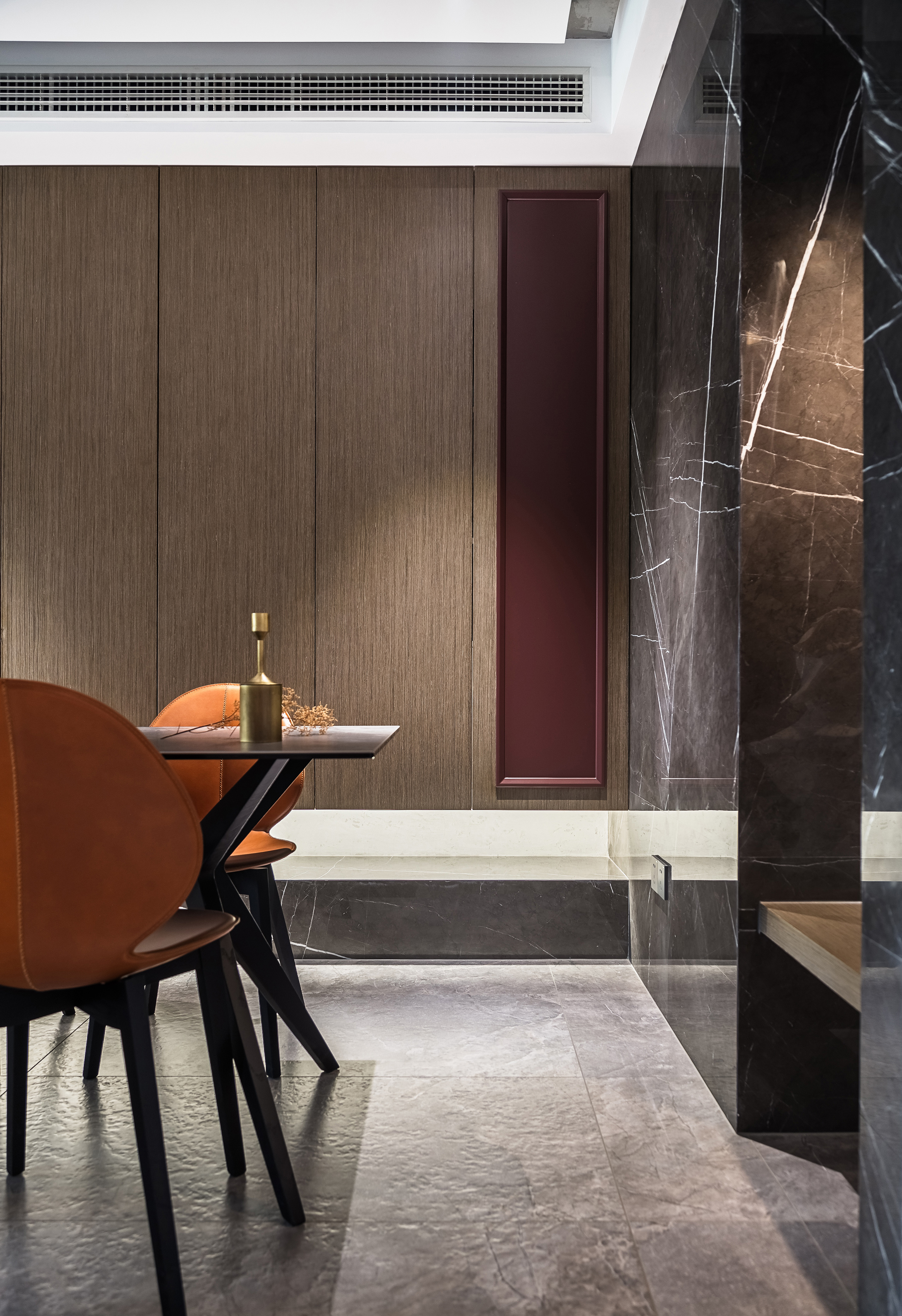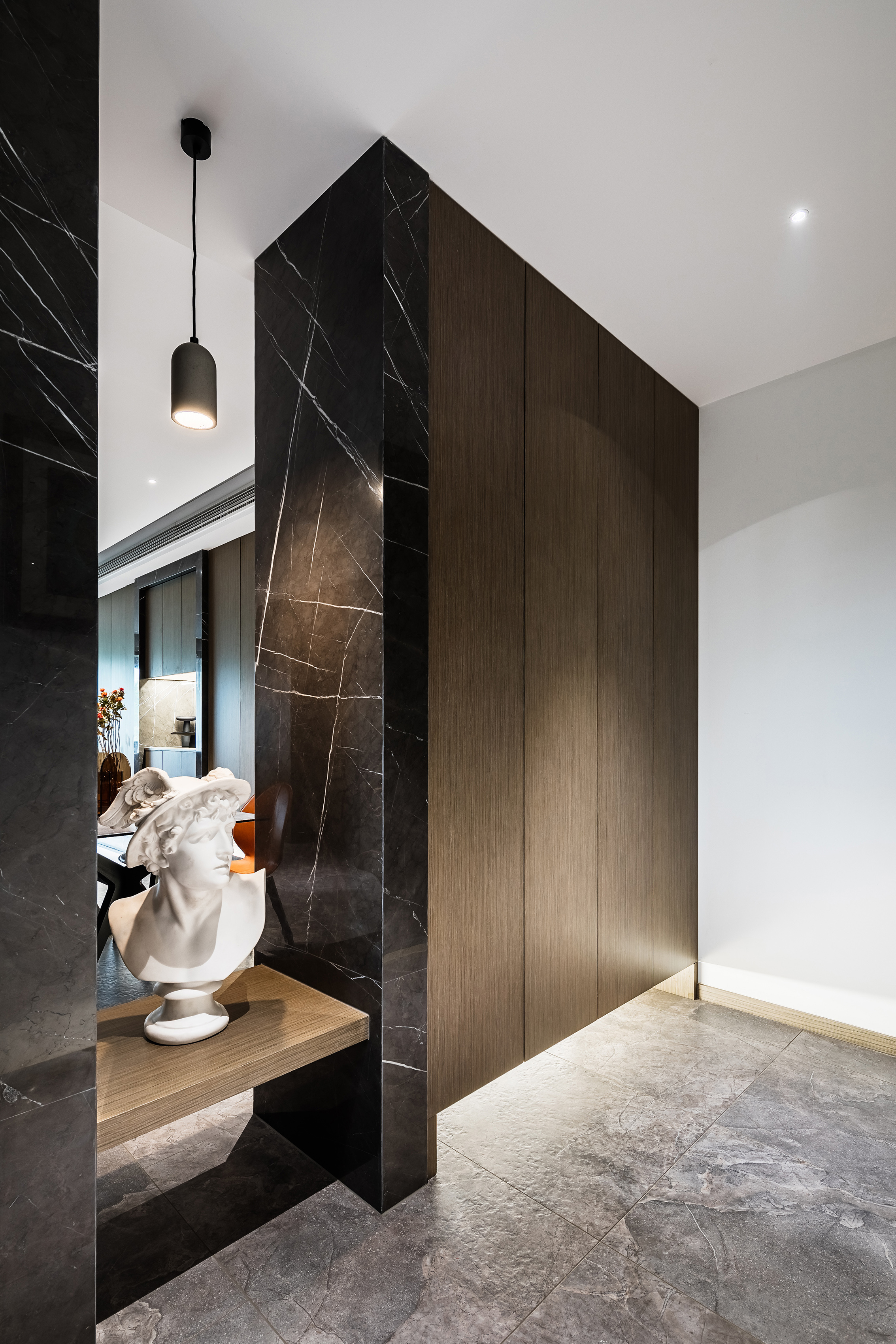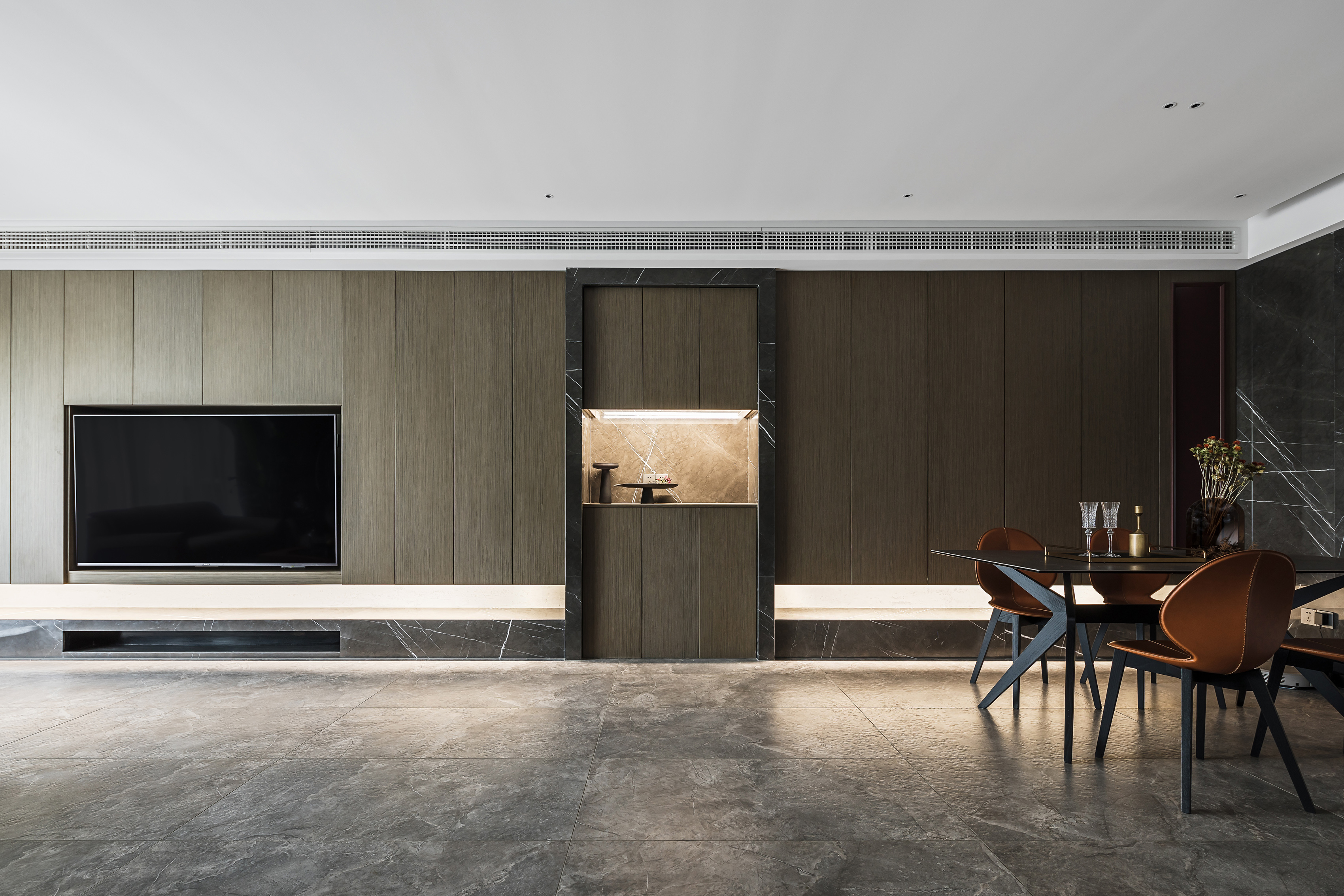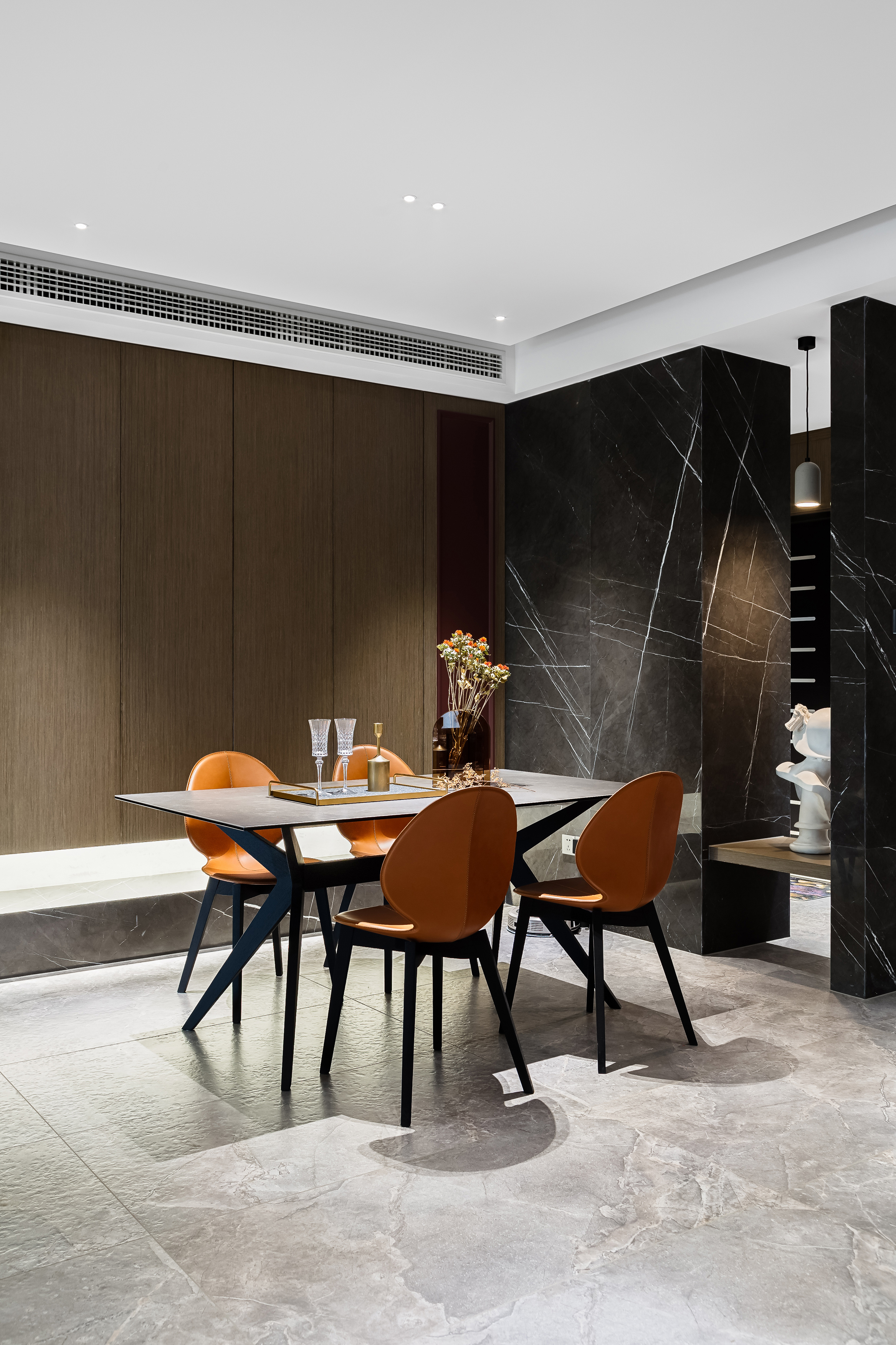 空间意境:视觉上黑白灰的大色调强调干净利索,暖棕色和色彩比例强调着生活感,塑造了一种不受时间影响的家庭感,整个空间比较精巧,搭配设计上的化繁为简,承载丰富的生活。