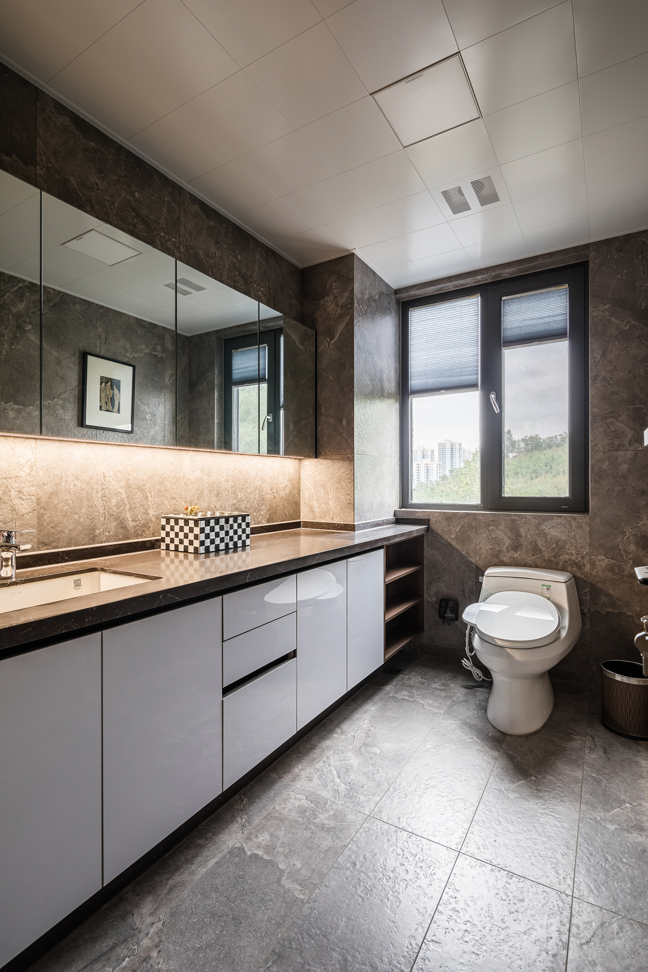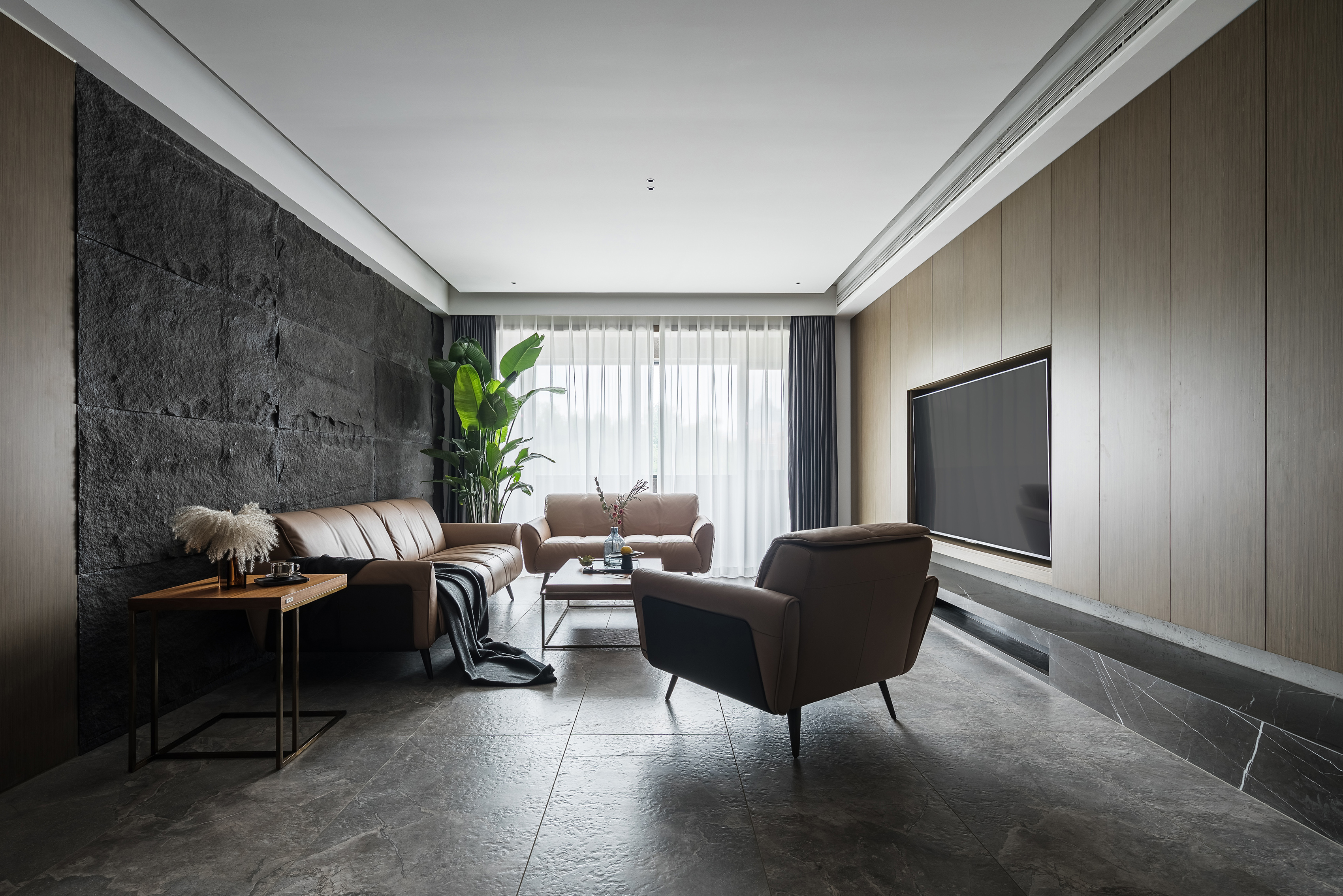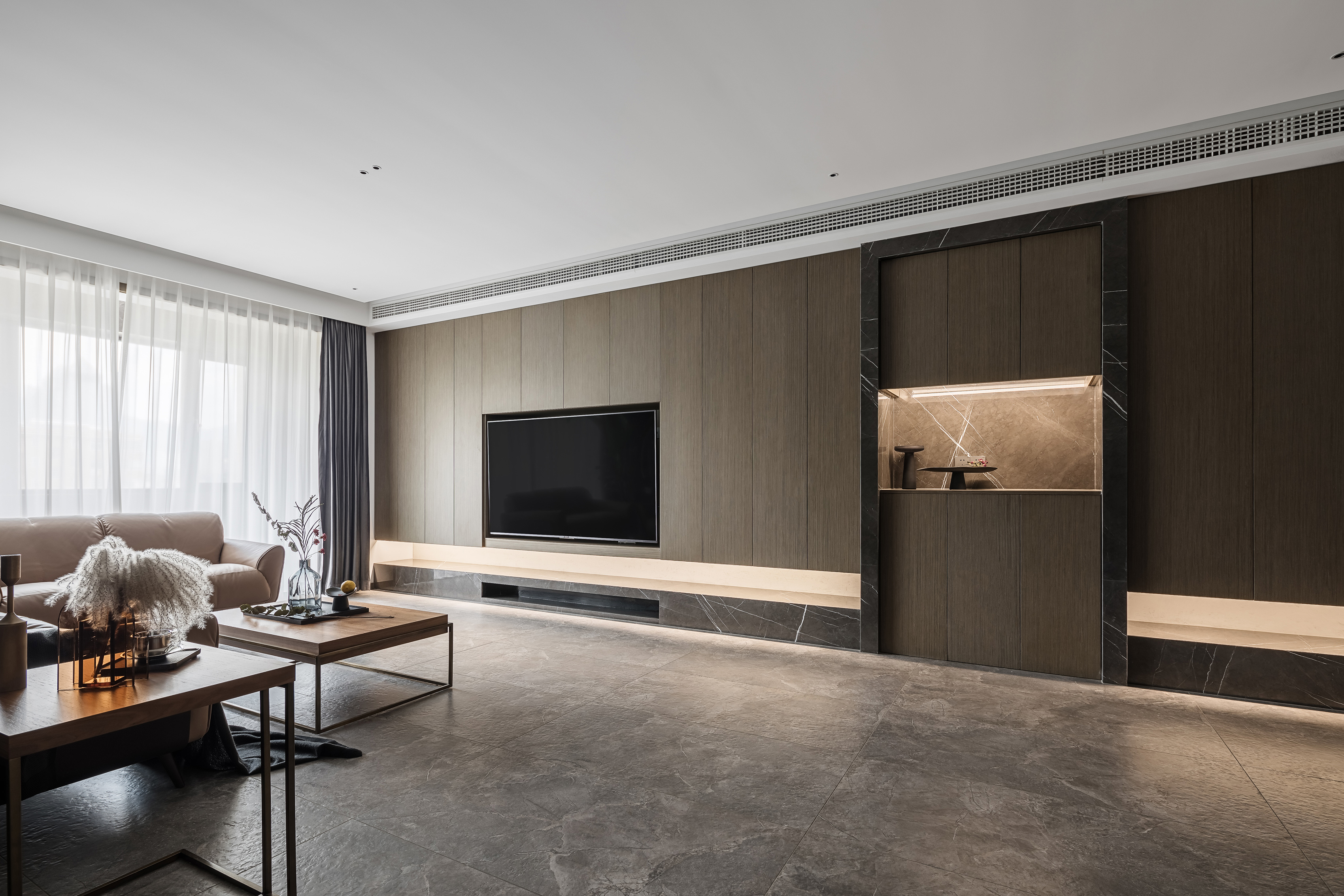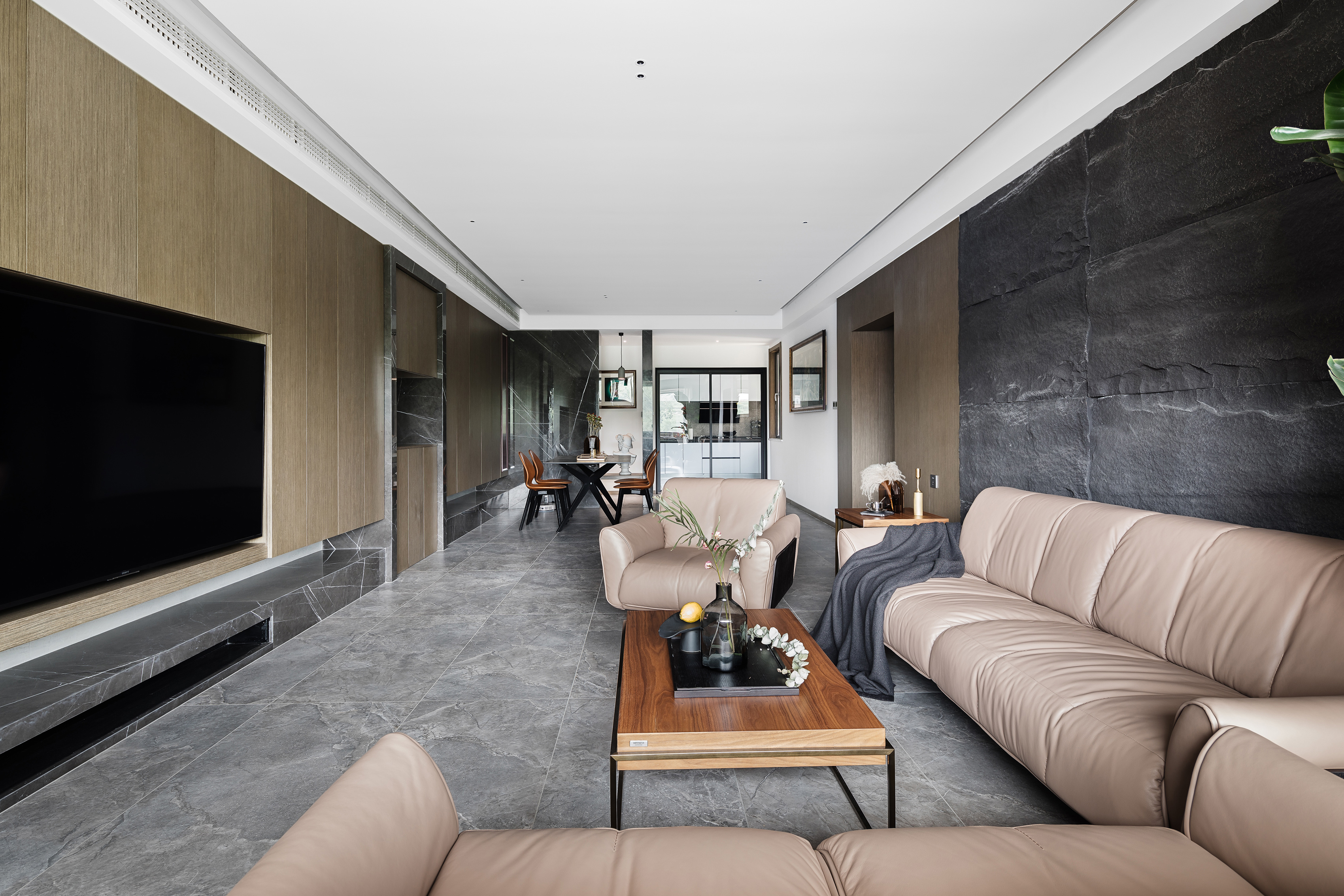 空间意境:视觉上黑白灰的大色调强调干净利索,暖棕色和色彩比例强调着生活感,塑造了一种不受时间影响的家庭感,整个空间比较精巧,搭配设计上的化繁为简,承载丰富的生活。