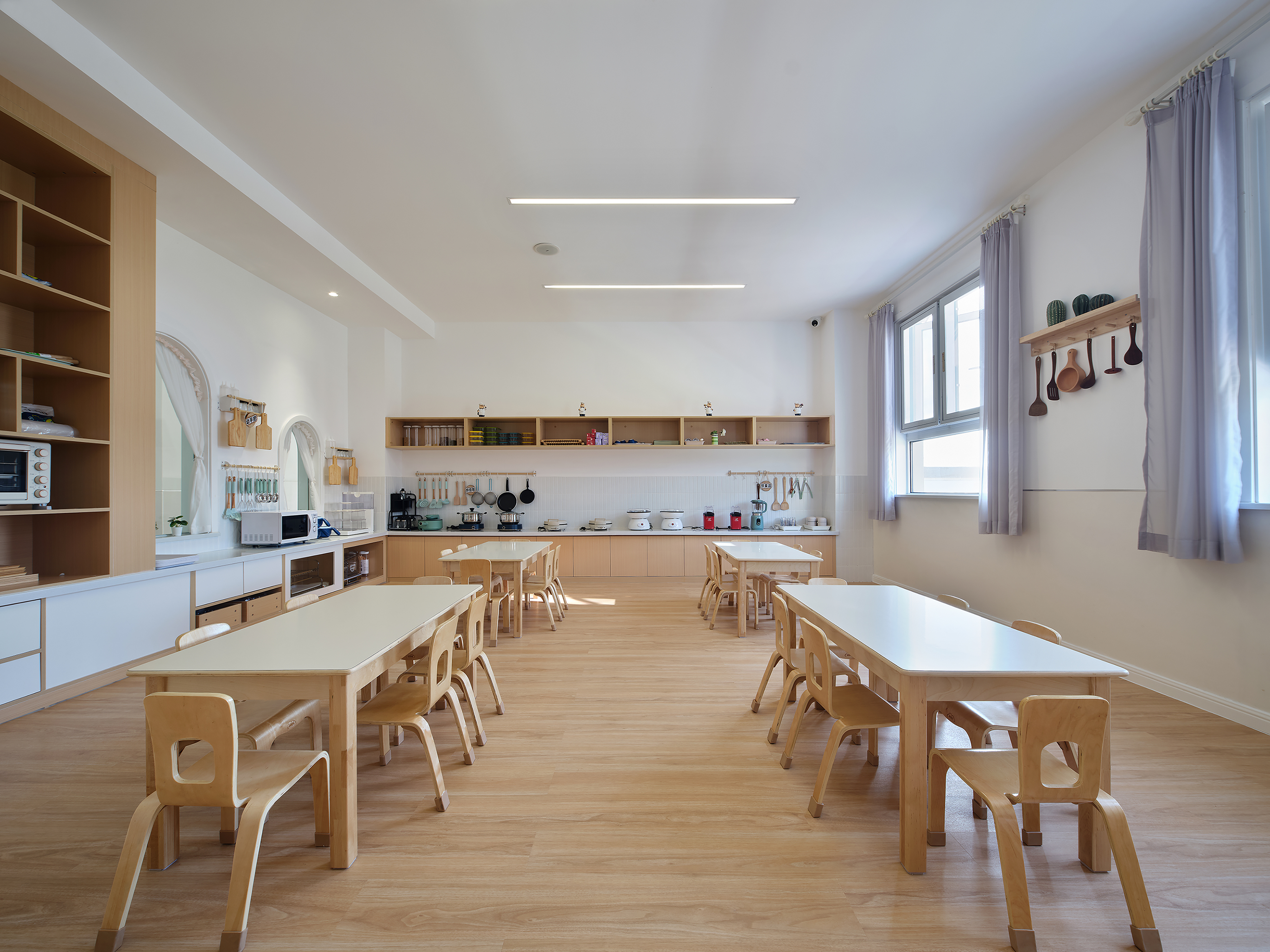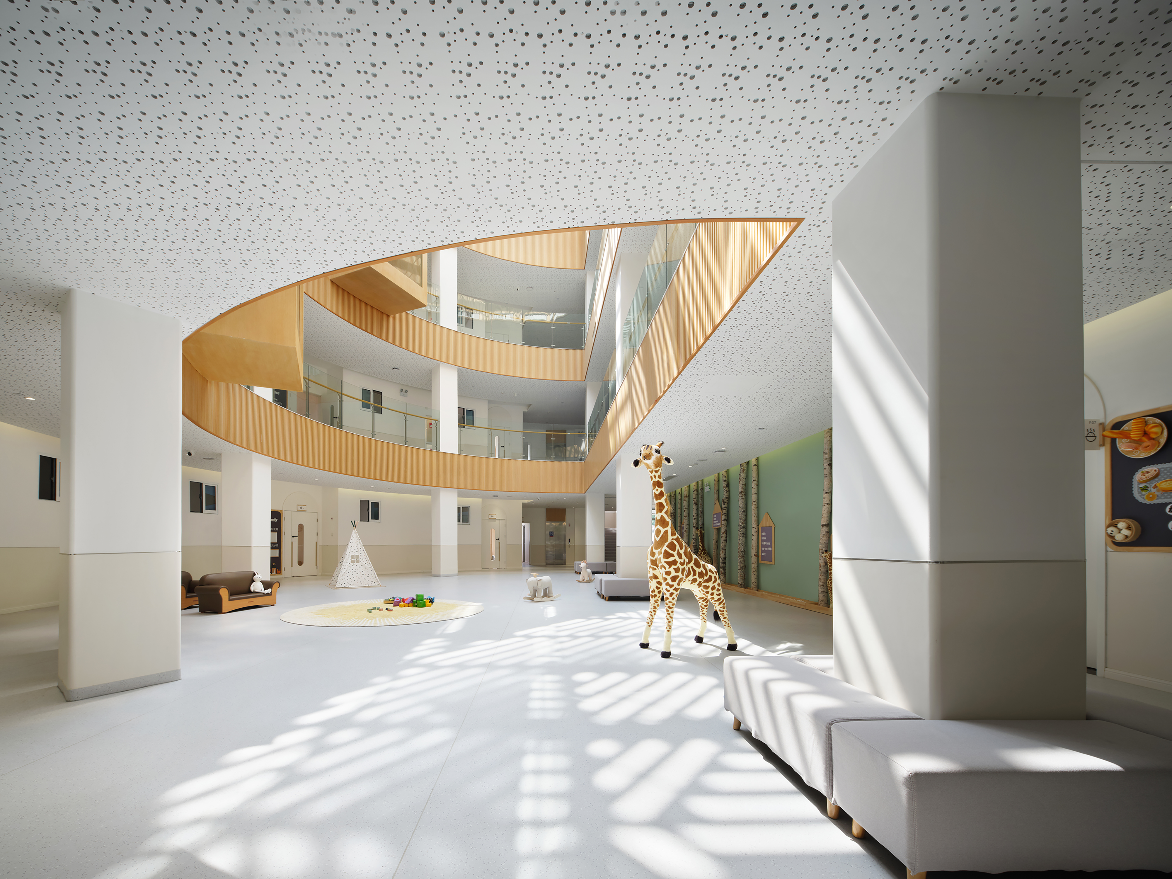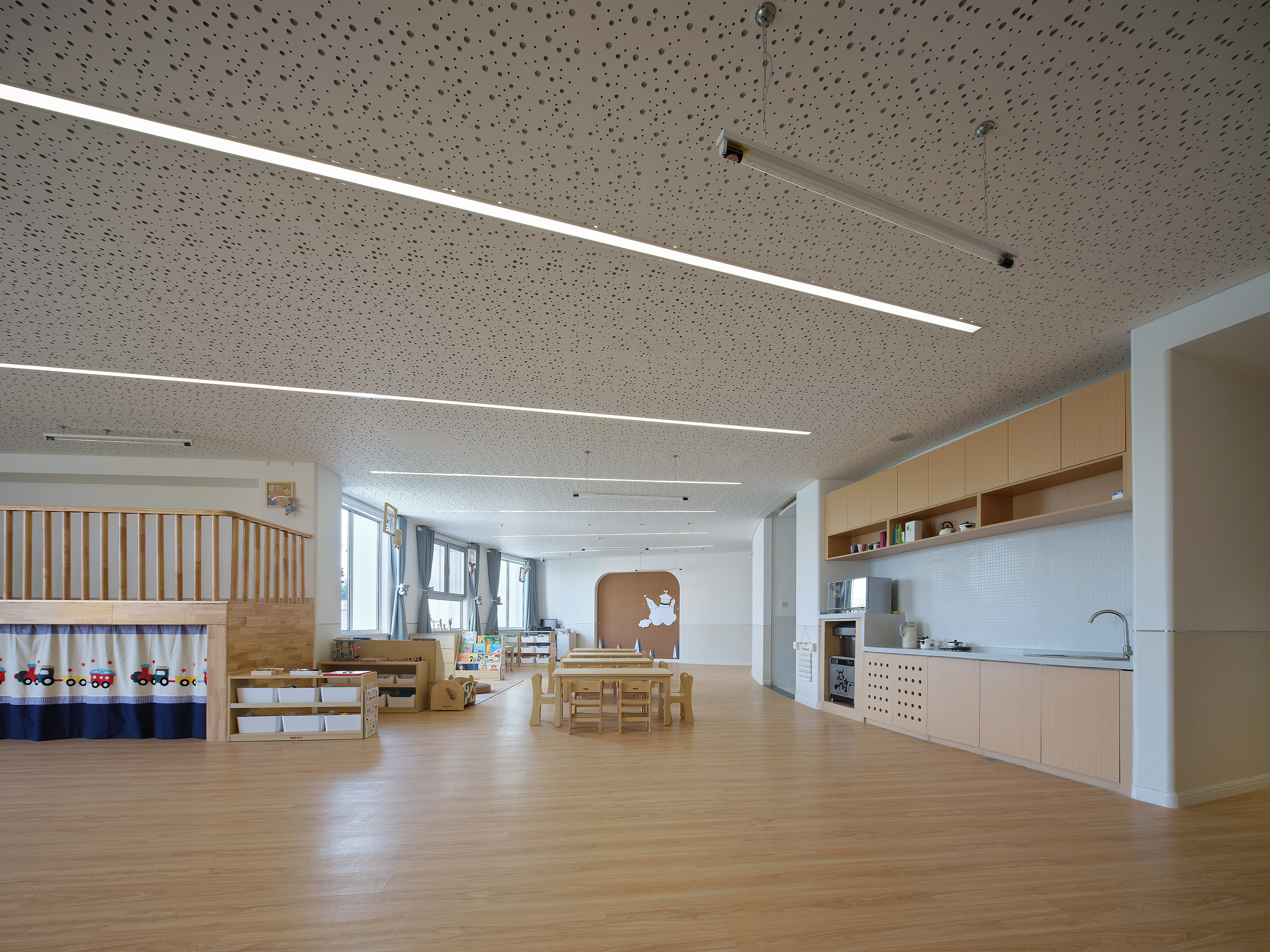 空间意境:环境风格我们采用了弱装饰,重细节的设计手法。建筑外立面的白色首先开启“留白”,室内装饰以白墙和温暖又色调柔和的木饰面,纯净、质朴的空间内将孩童的创造力和想象力无形中放大,同时为教育的丰富性提供底色。