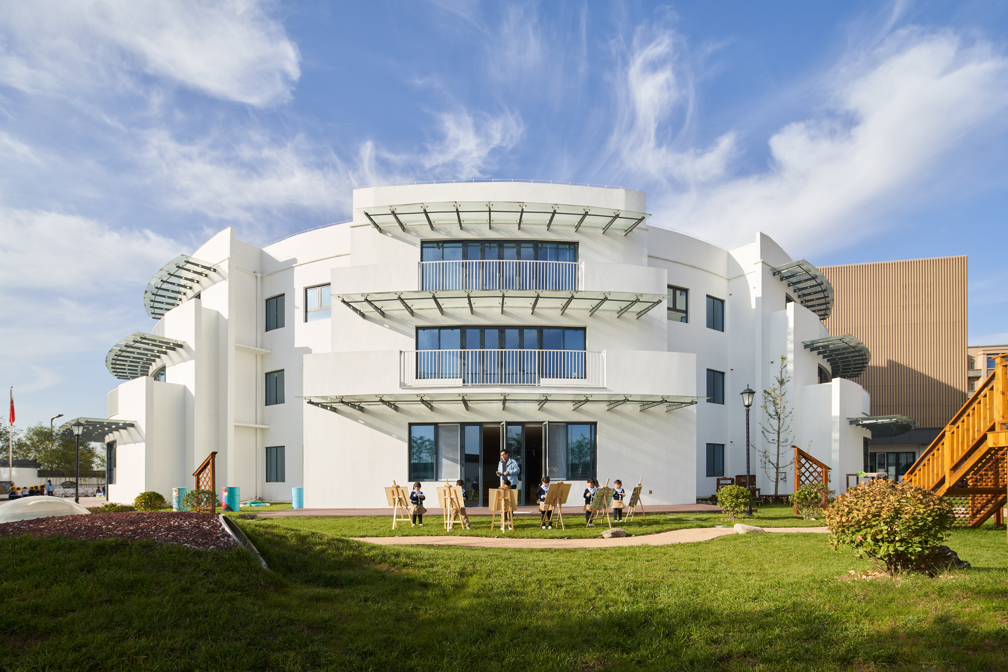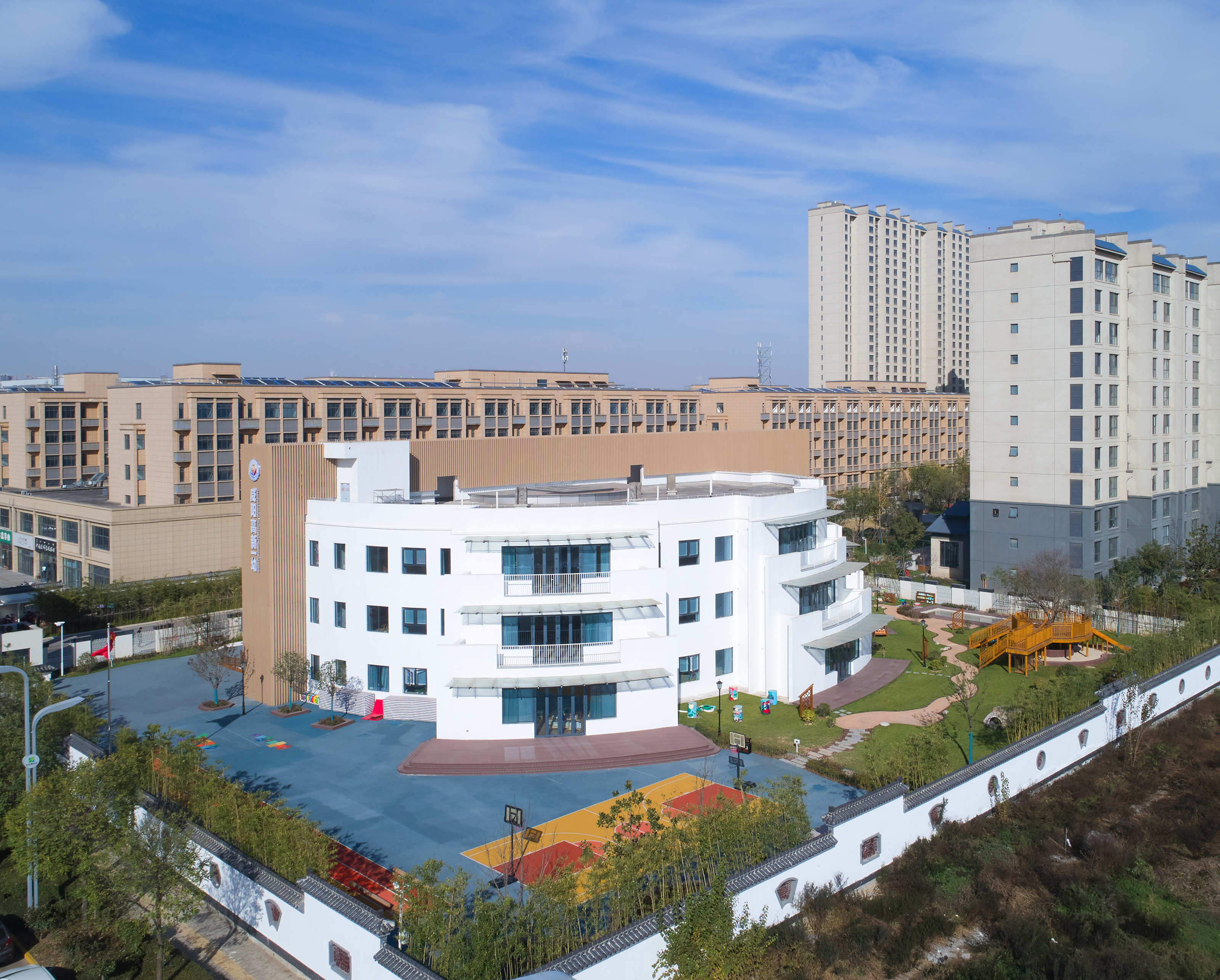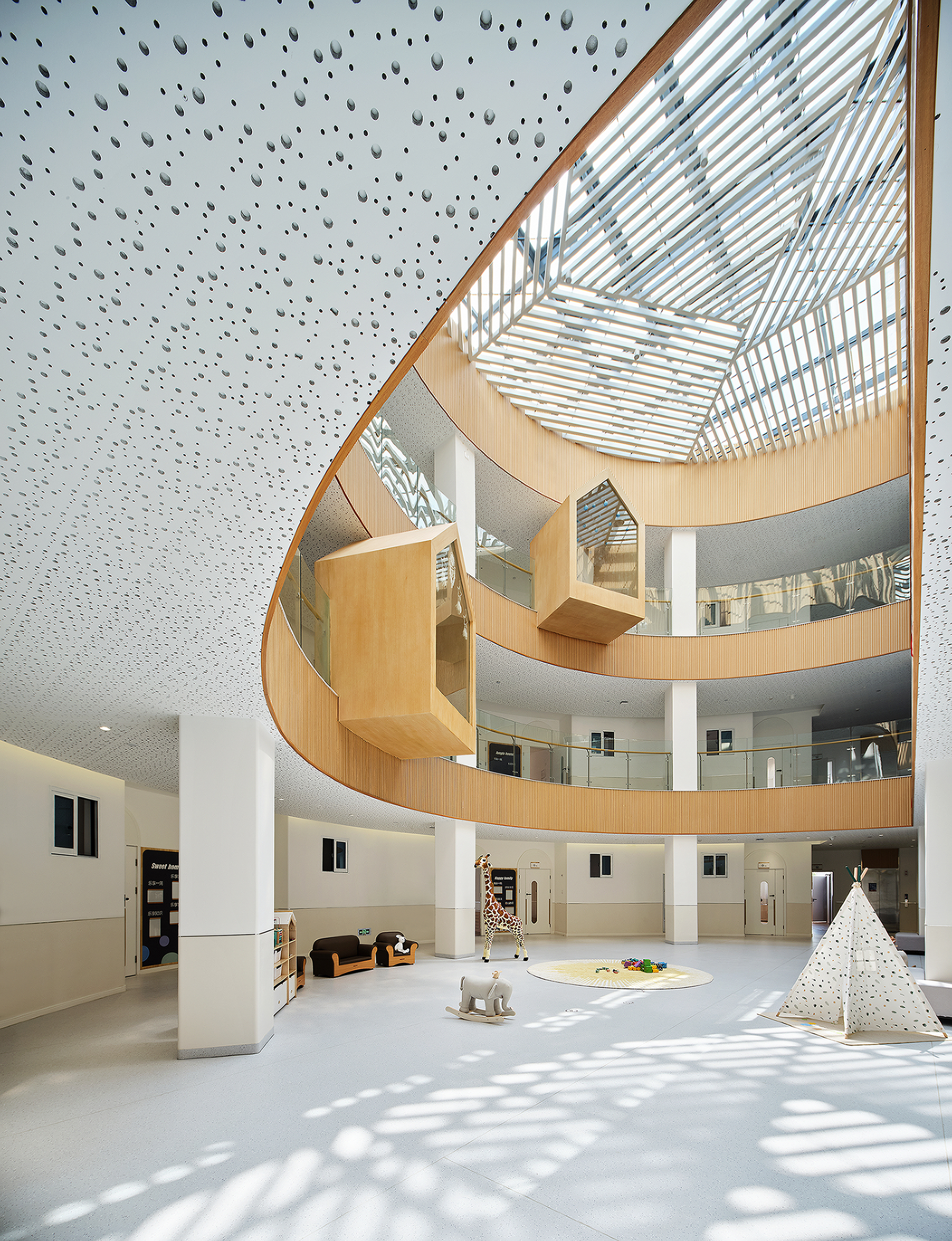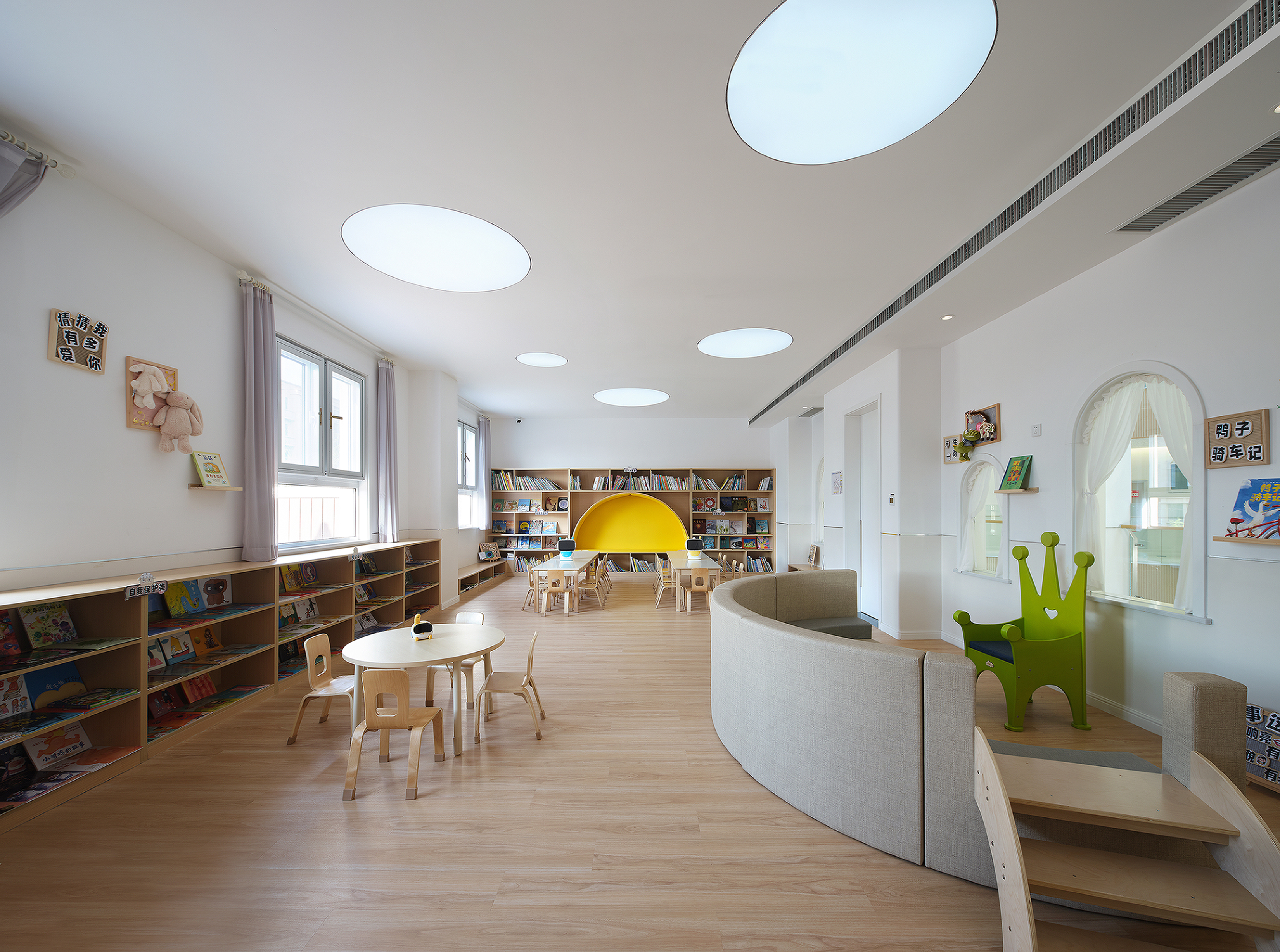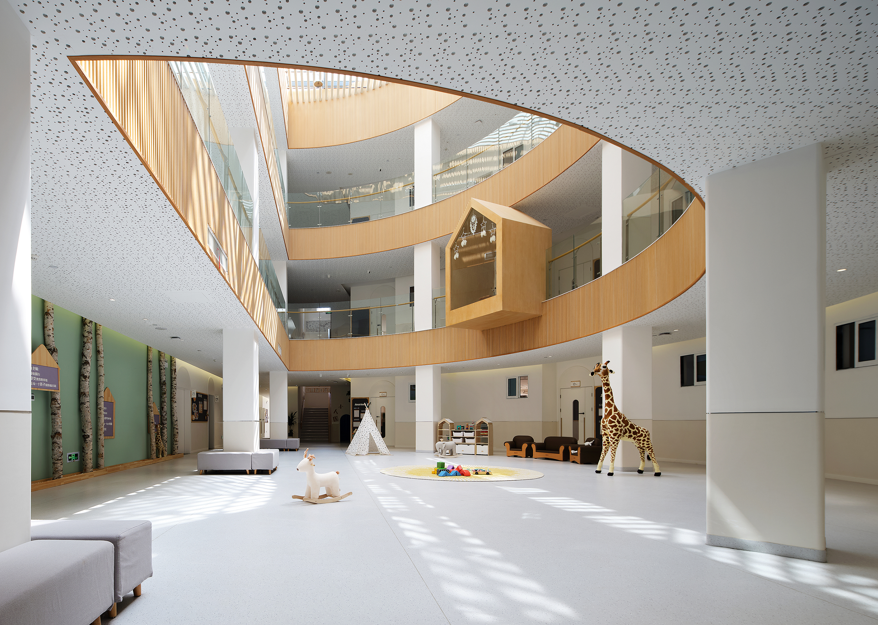 项目定位:幼儿园项目位于陕西省咸阳市高新区,设计以接近自然为主导策略,从孩子的视角和体验为出发点,以简约的设计,创造出一个自由、充满探索的趣味空间。