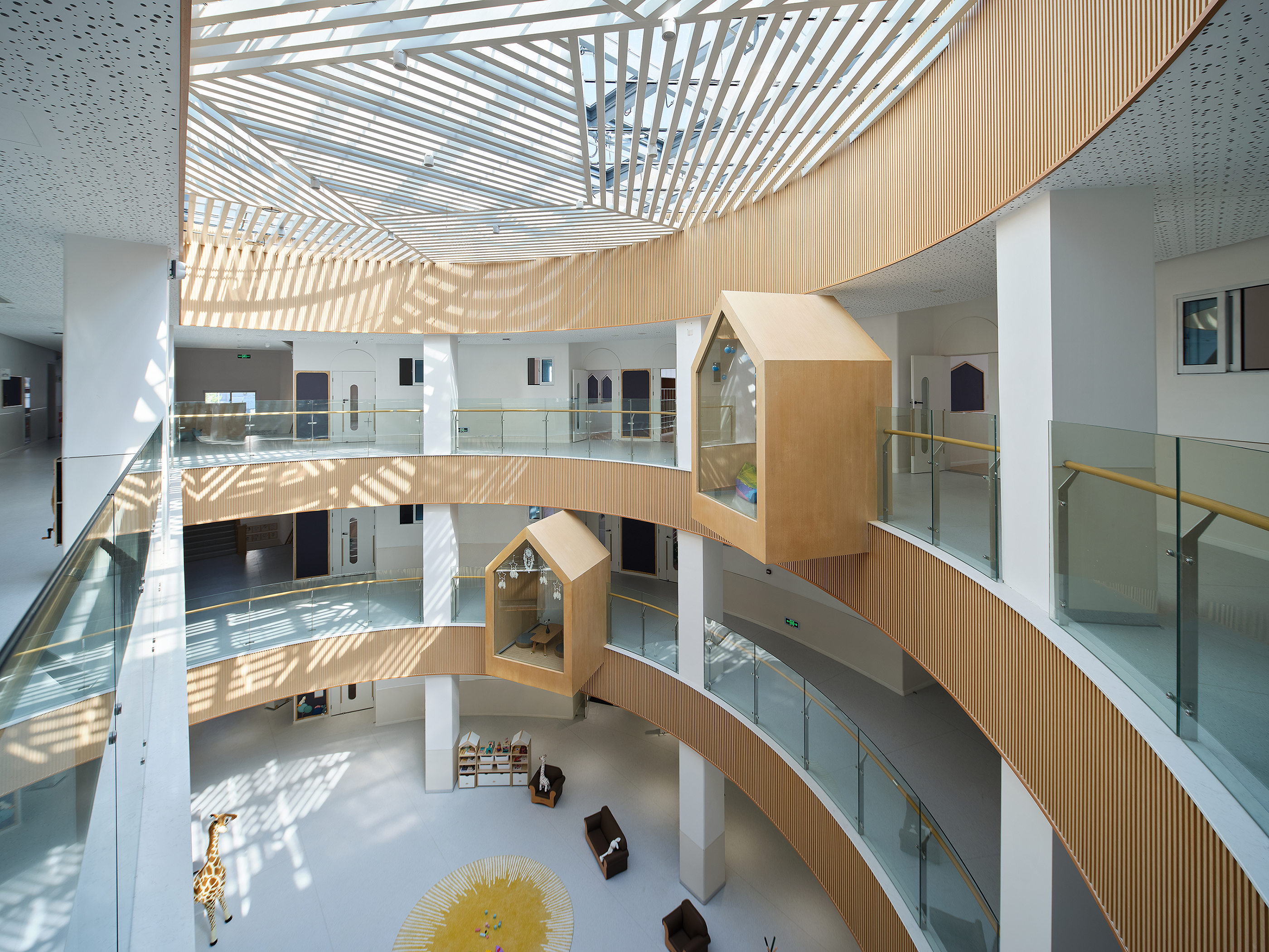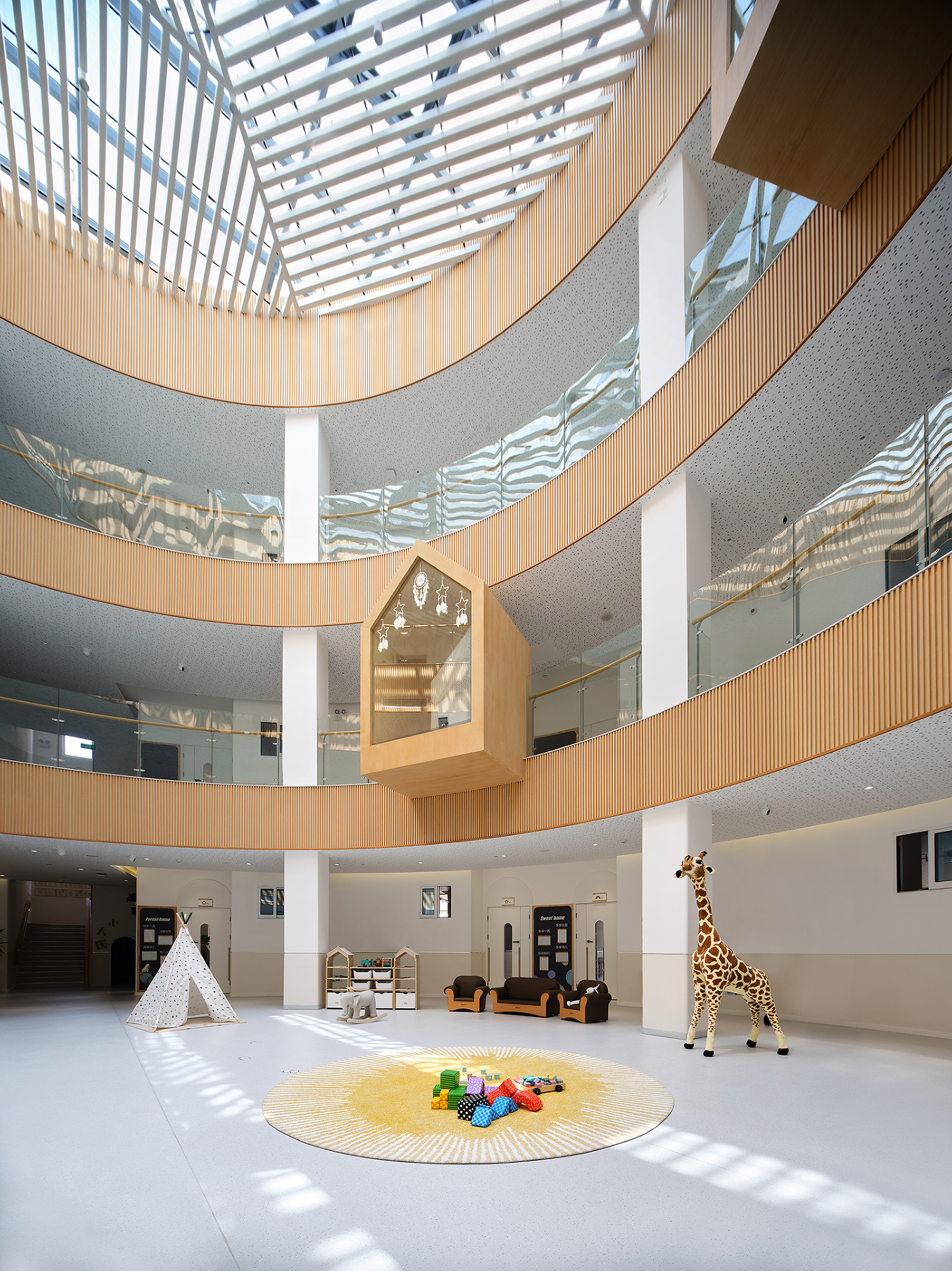 空间布局:中心庭院类似“甜甜圈”的形态围合成一个内聚性空间,所有班级活动单元及辅助用房均围绕该庭院展开。一个三层高、洒满阳光的开放中庭作为空间的中心,具有充分的开放性,呈现出更加轻松与舒适的关系,变化的天窗格扇创造出丰富的光影,使处于空间中的孩子们时刻感受到光线的变化。