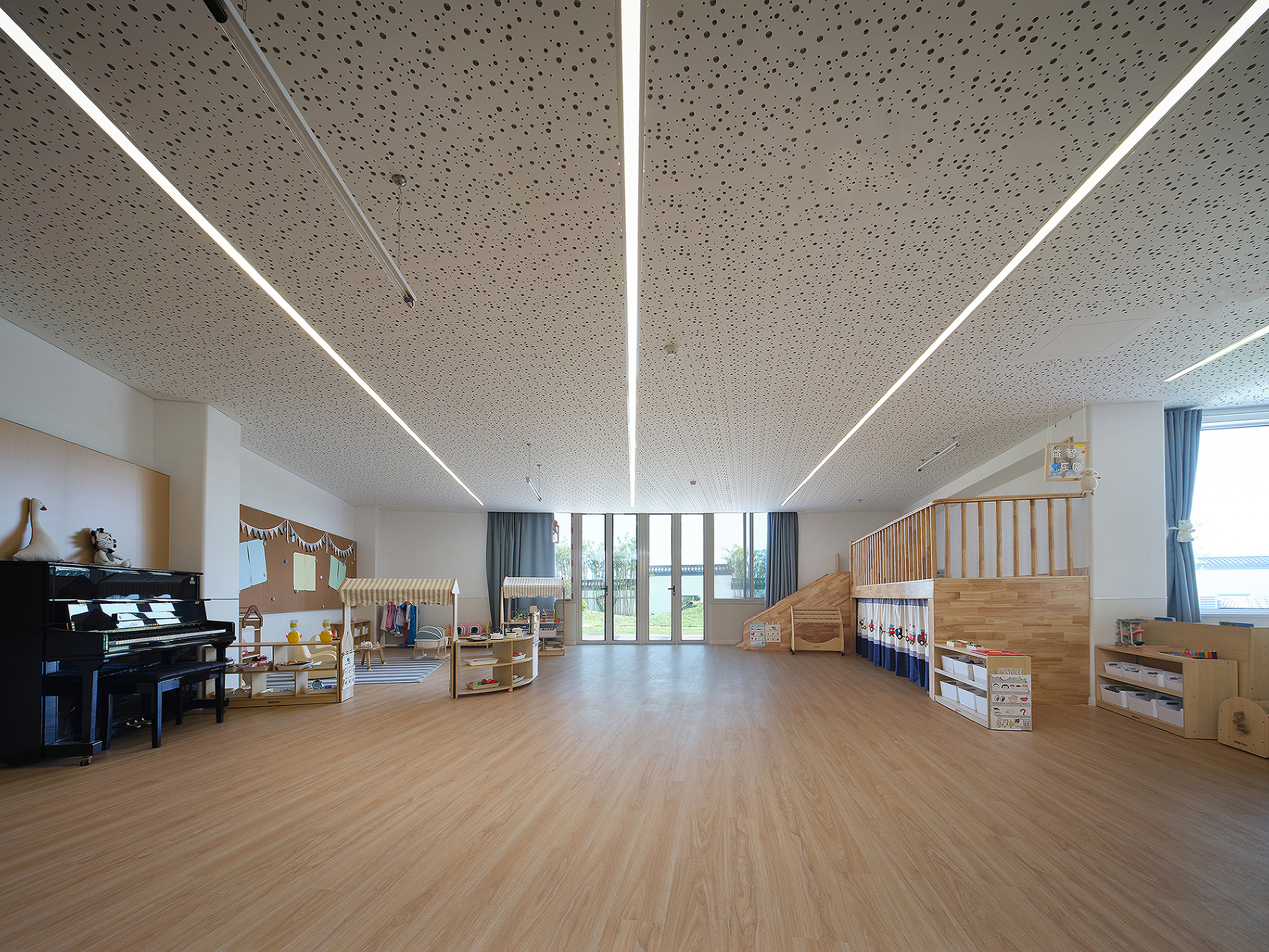 班级活动单元全部安排在建筑南侧,活动室的落地玻璃窗使空间沐浴在充足的自然光线之下,同时将窗外的绿树景致纳入孩童的视线;空气通过室内开启的多扇窗户穿过建筑,带来阵阵清风。建筑的三层空间朝南侧层层递进的关系使得光照最大限度的照射进房间,建筑与环境的关系是自由的,充裕的阳光处处充满在孩子们学习与生活的场景。 -