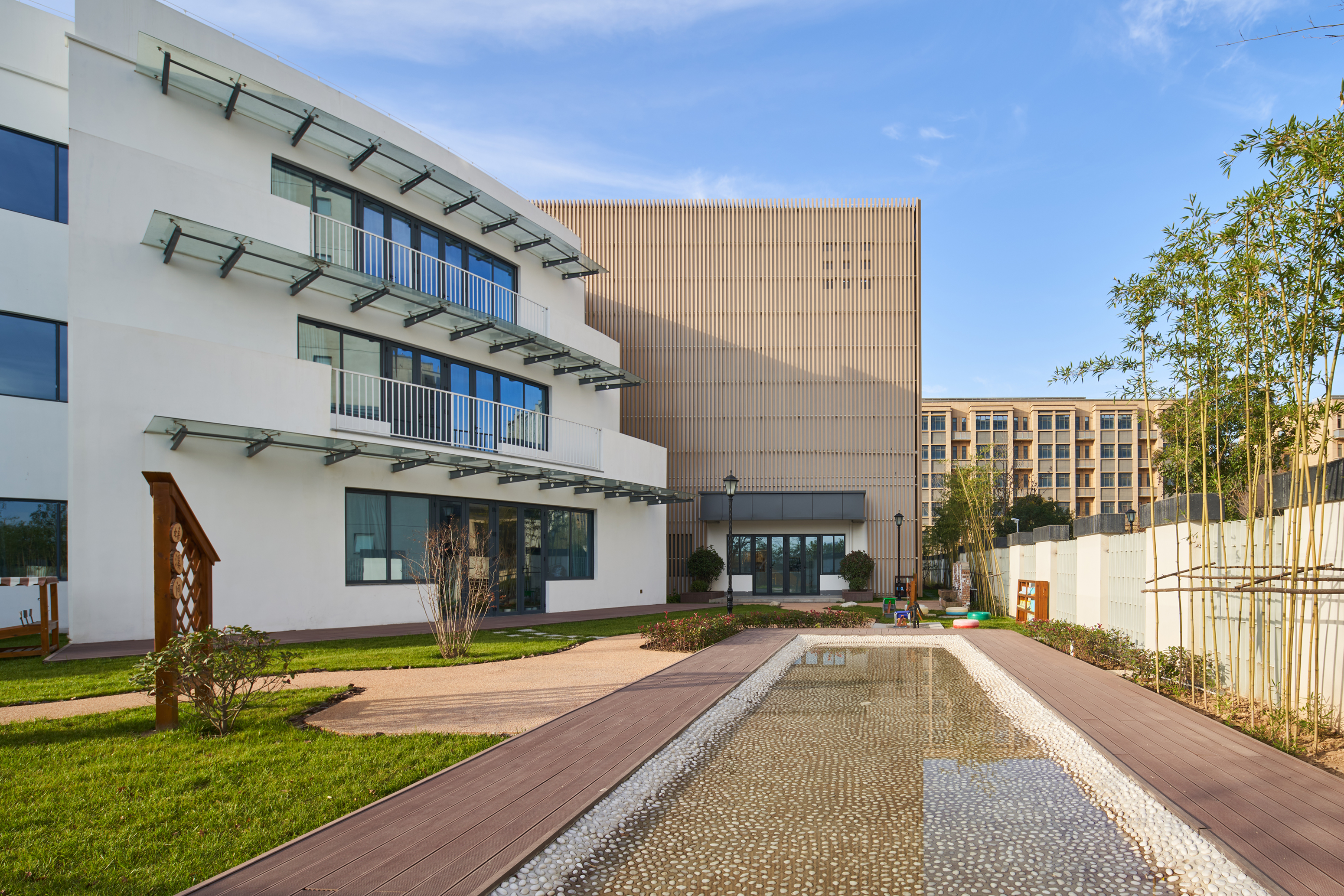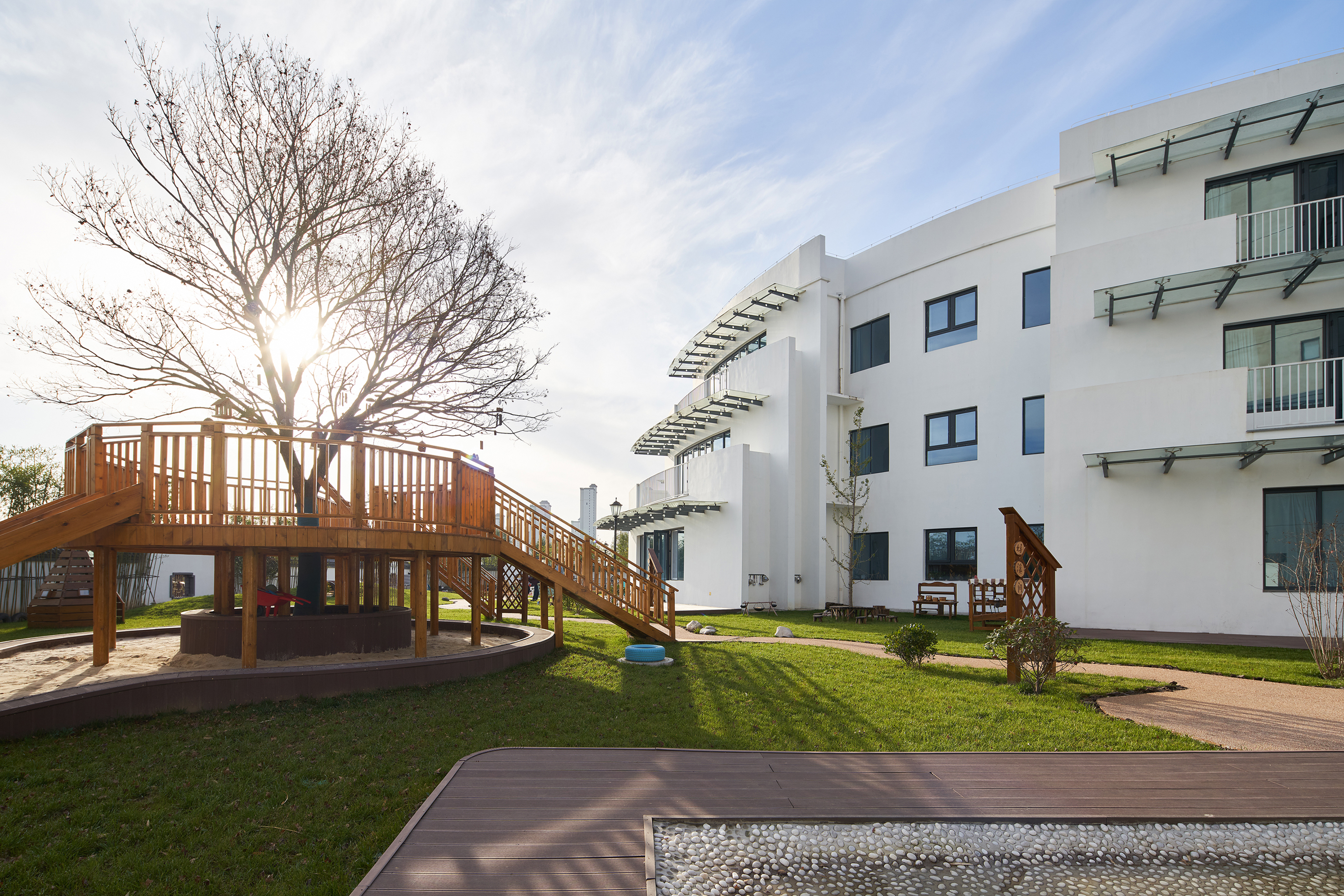室外空间通过水、树、草地,串联起一幅探索自然的景象,种类丰富的果树和观赏性树木,亦是通过大自然实现教育途径的一种尝试。 -