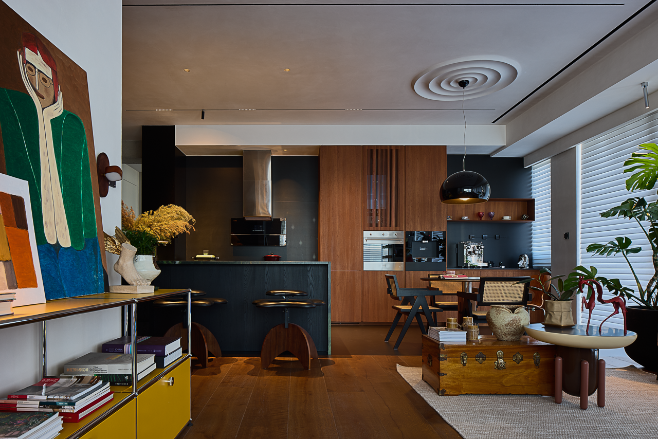 空间布局:设计师摒弃传统的私宅空间排布,通过一张长形岩板桌将客餐厅巧妙融合,实现了会客、办公、用餐等多功能体验,并以开放式布局将书房一并纳入,顿觉清朗开阔。搭配美学色彩的点缀,在自由渲染中明媚焕发,空间塑造大气而灵动。