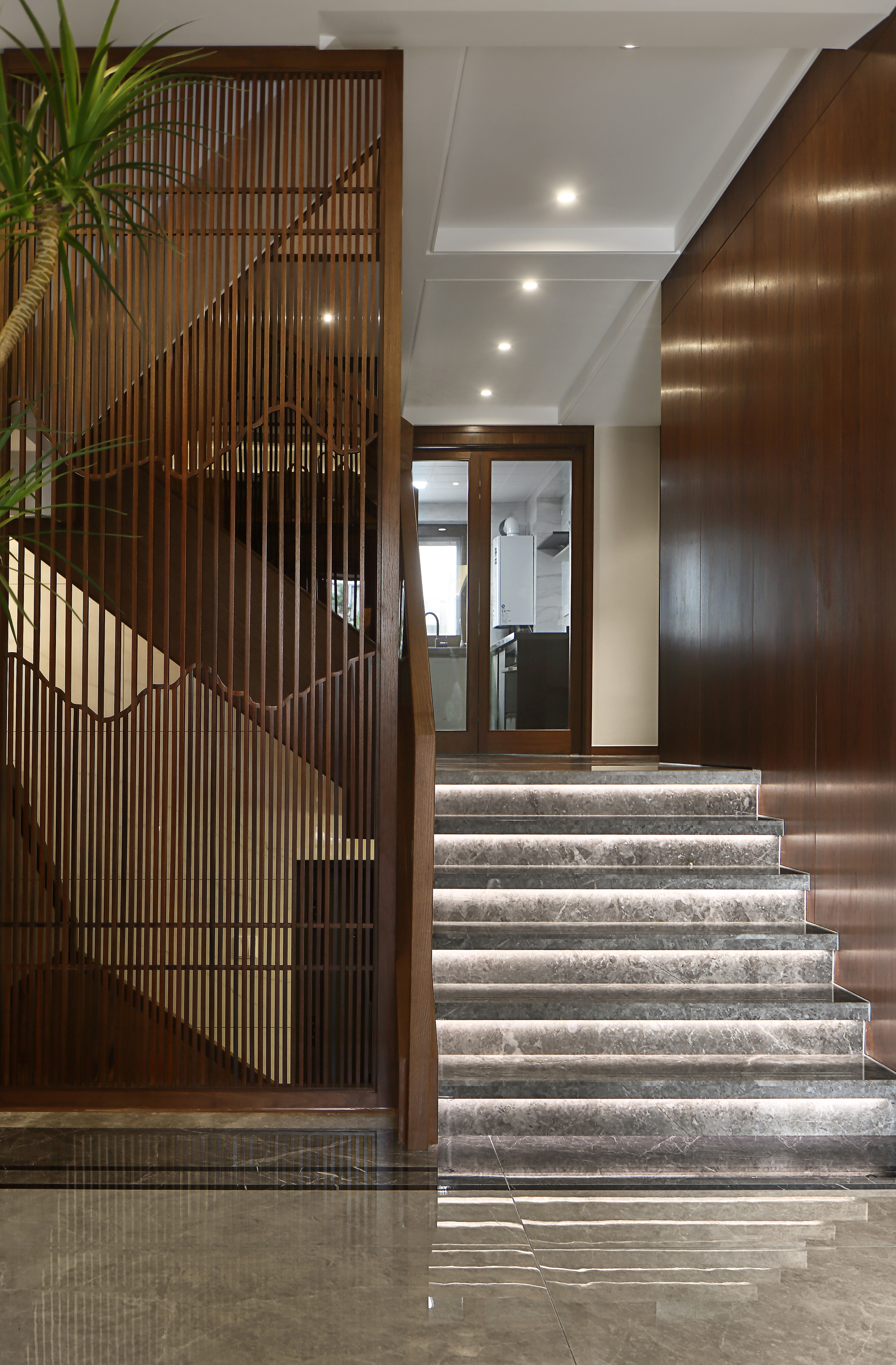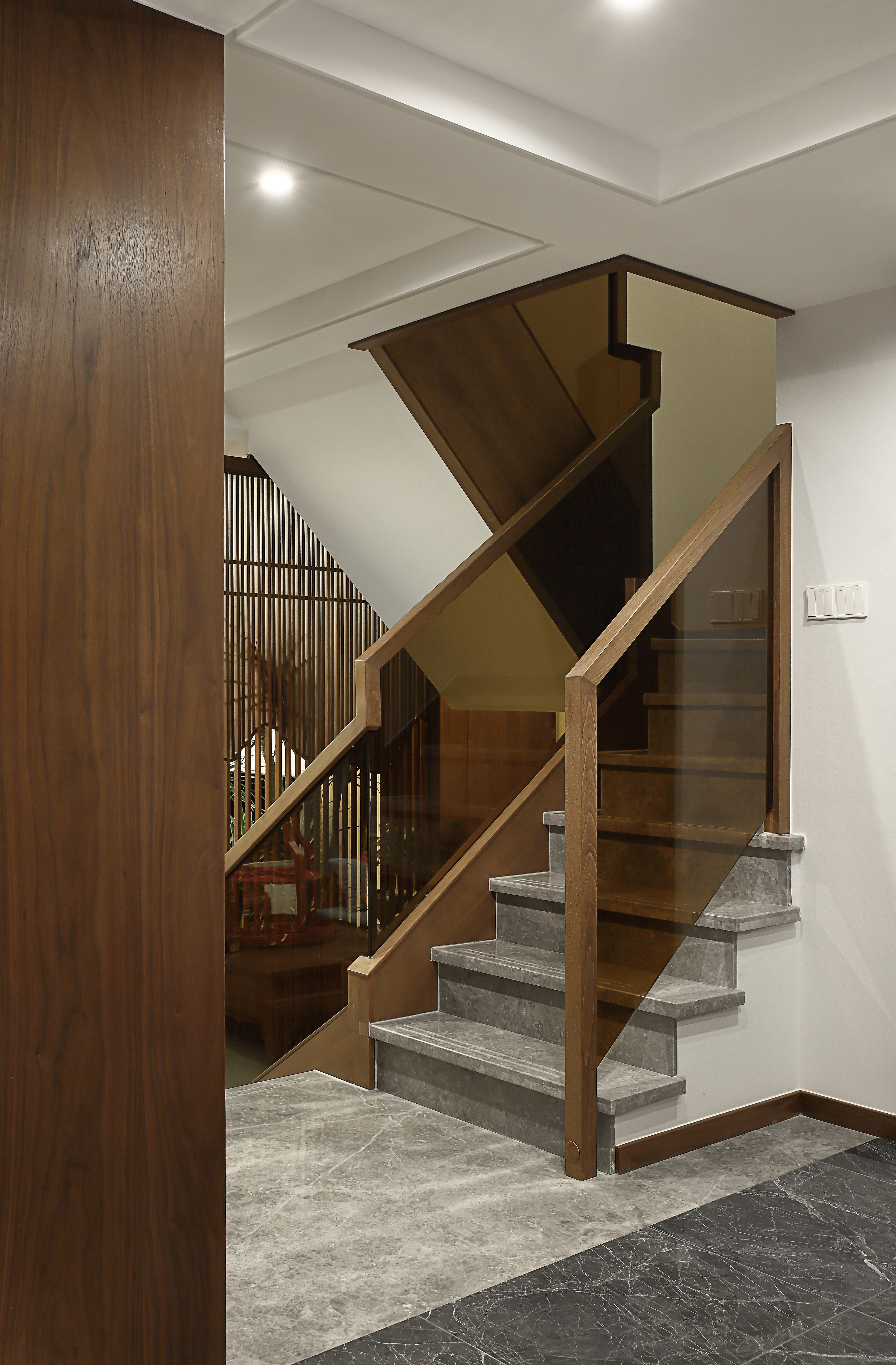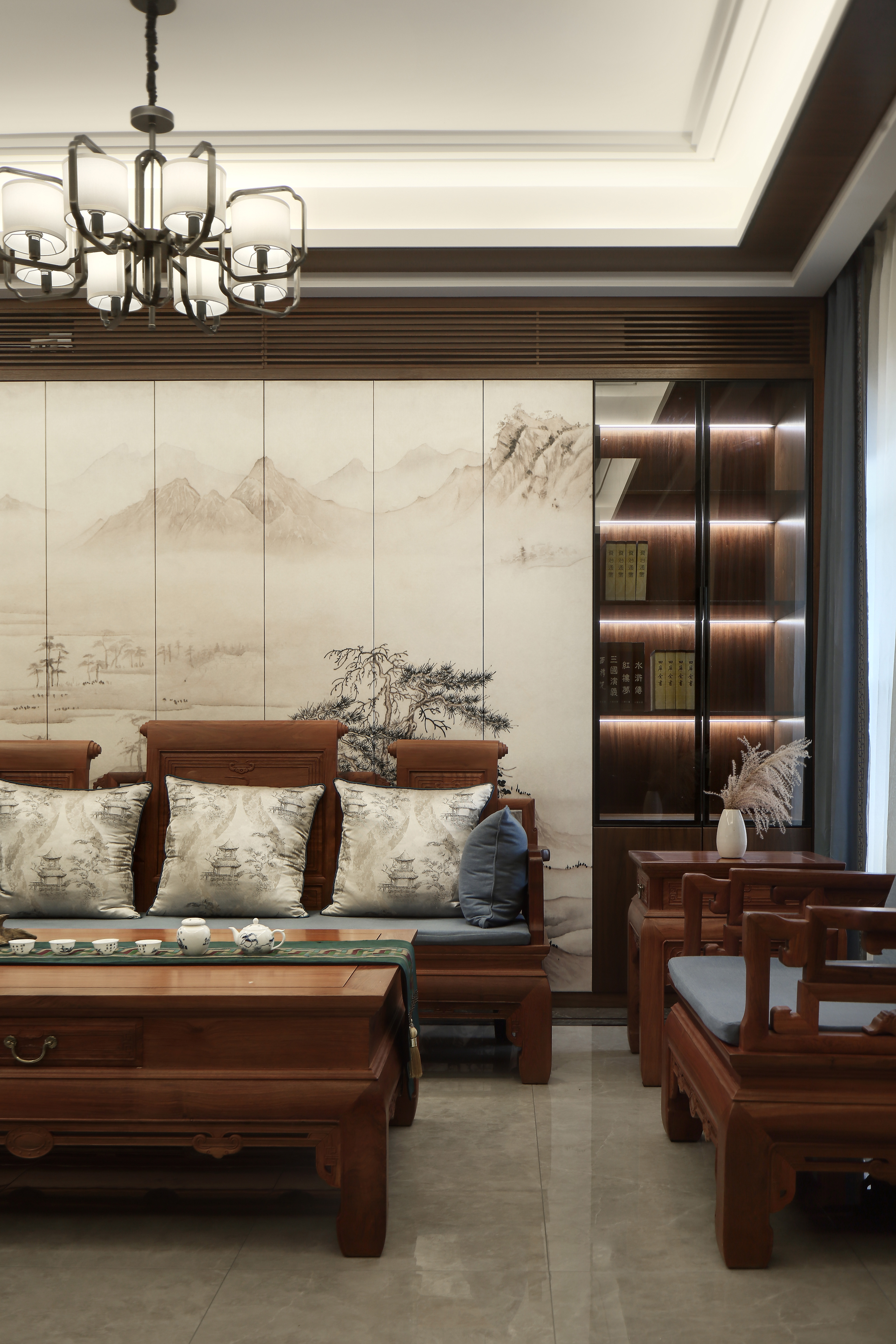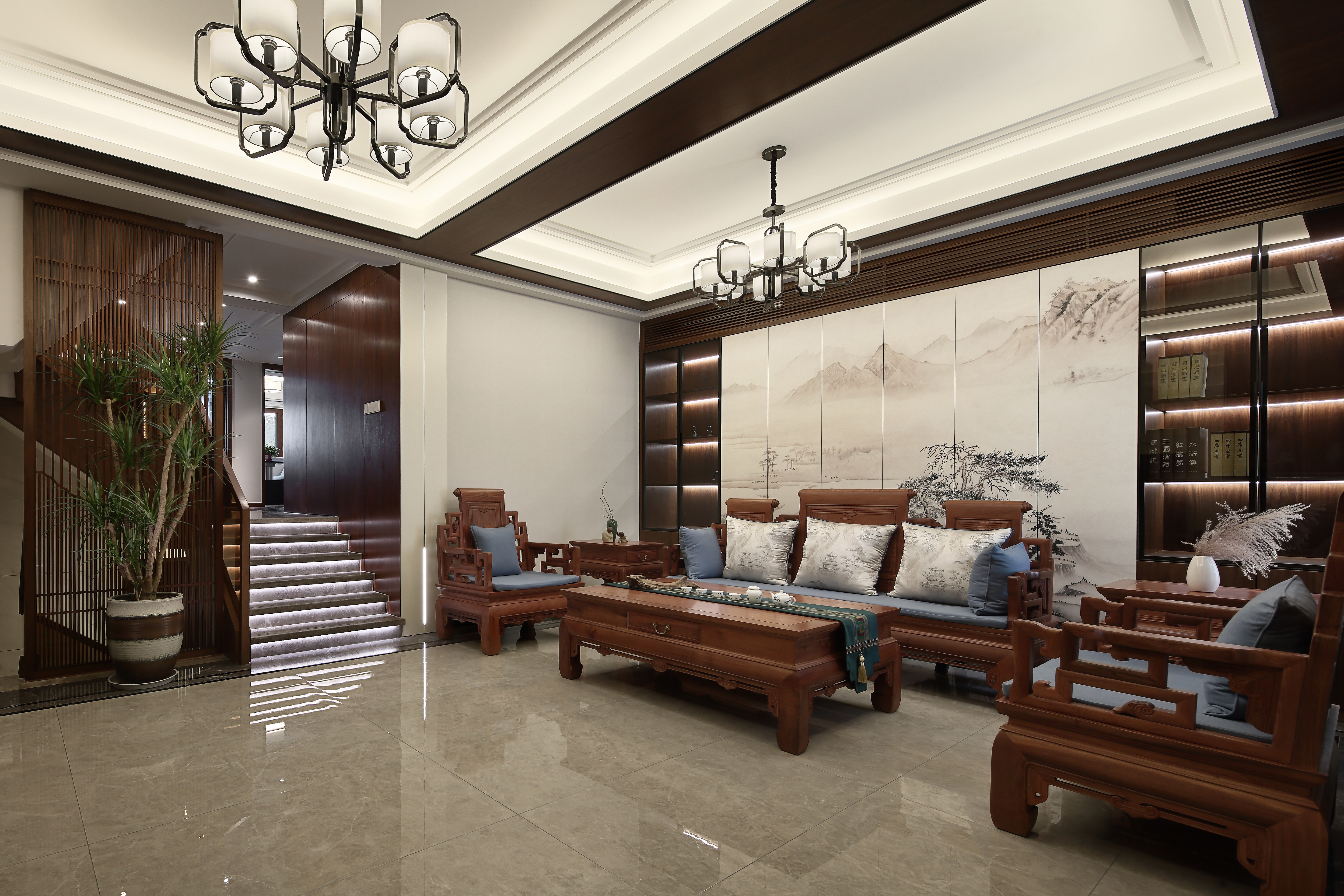 入口玄关的空间规划恰 到好处地实现了储藏和展示的双重功能。客厅整体设计极力呈现别墅空间雅致、安静的力量。满墙书架式设计作为立面极具震撼力的精神载体,搭配水墨大理石背景让整体空间大气凝远、通达而有识鉴。