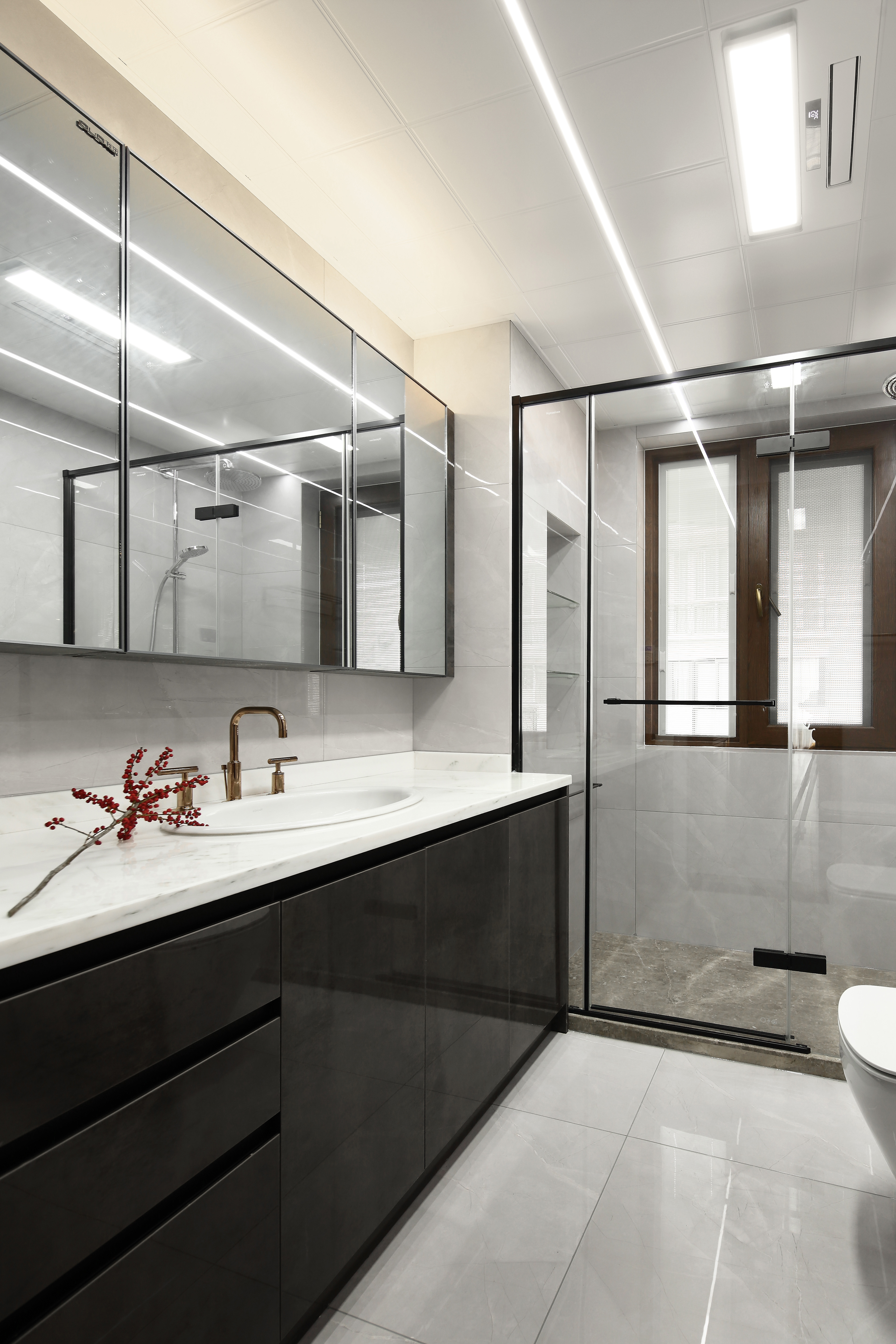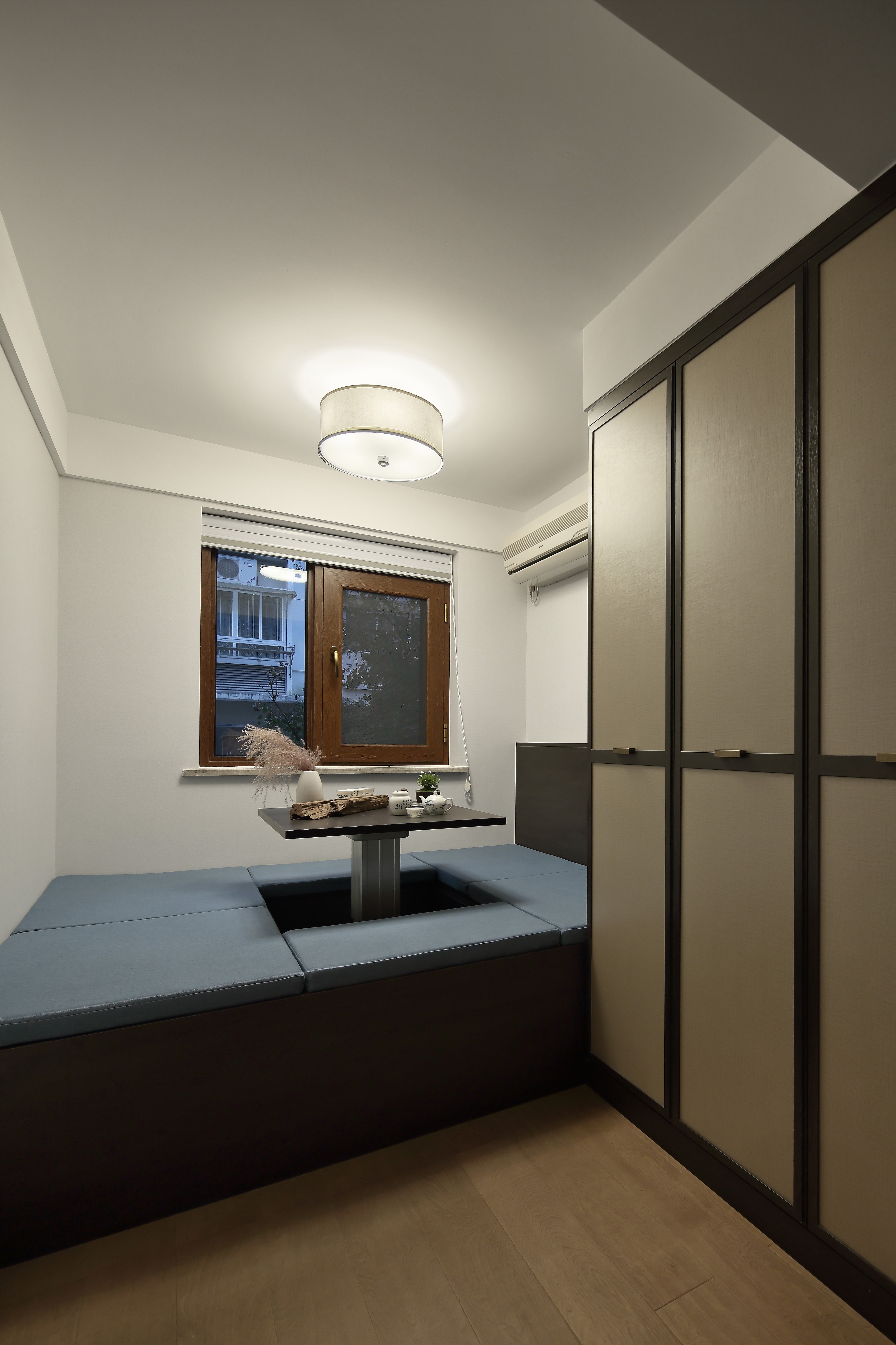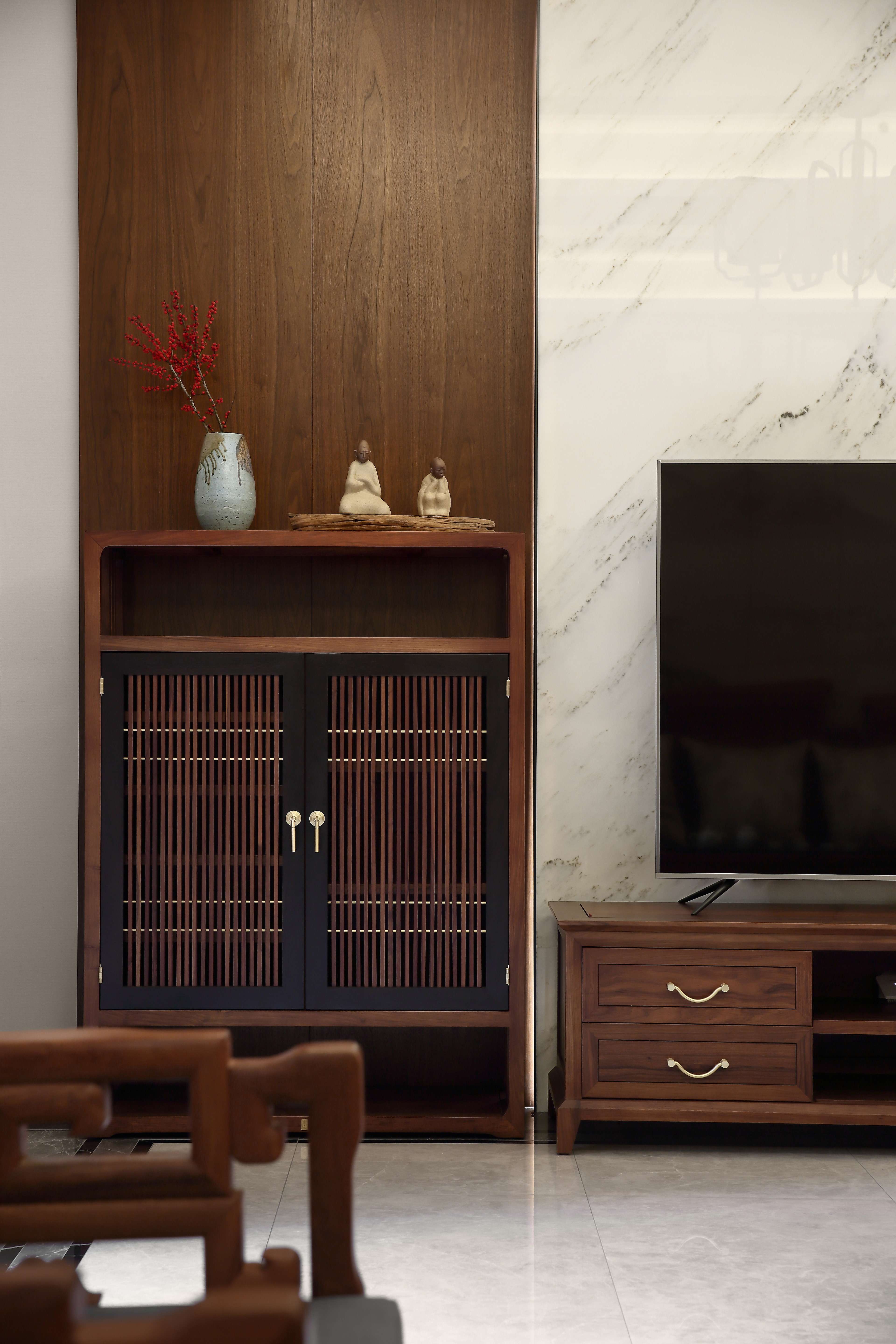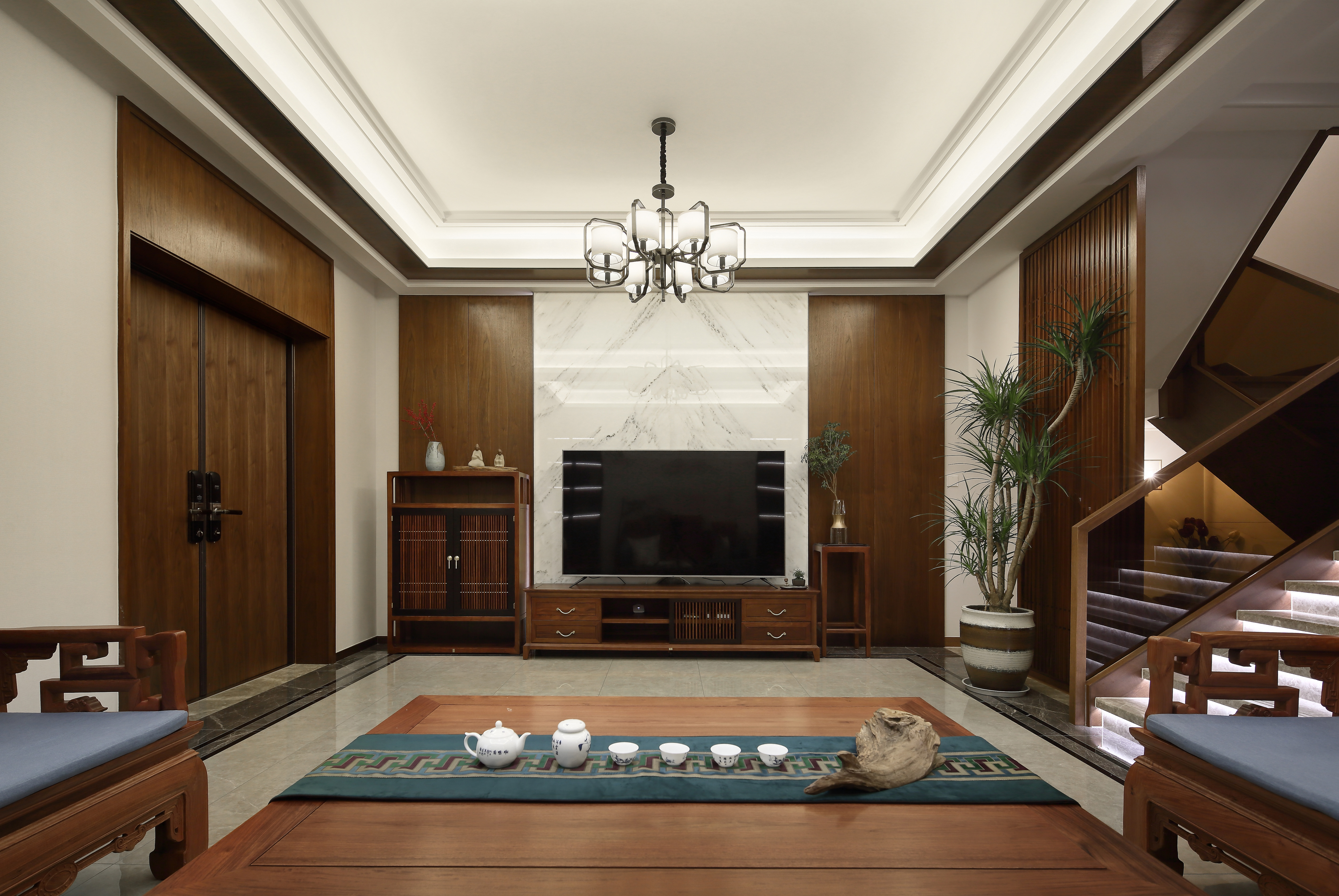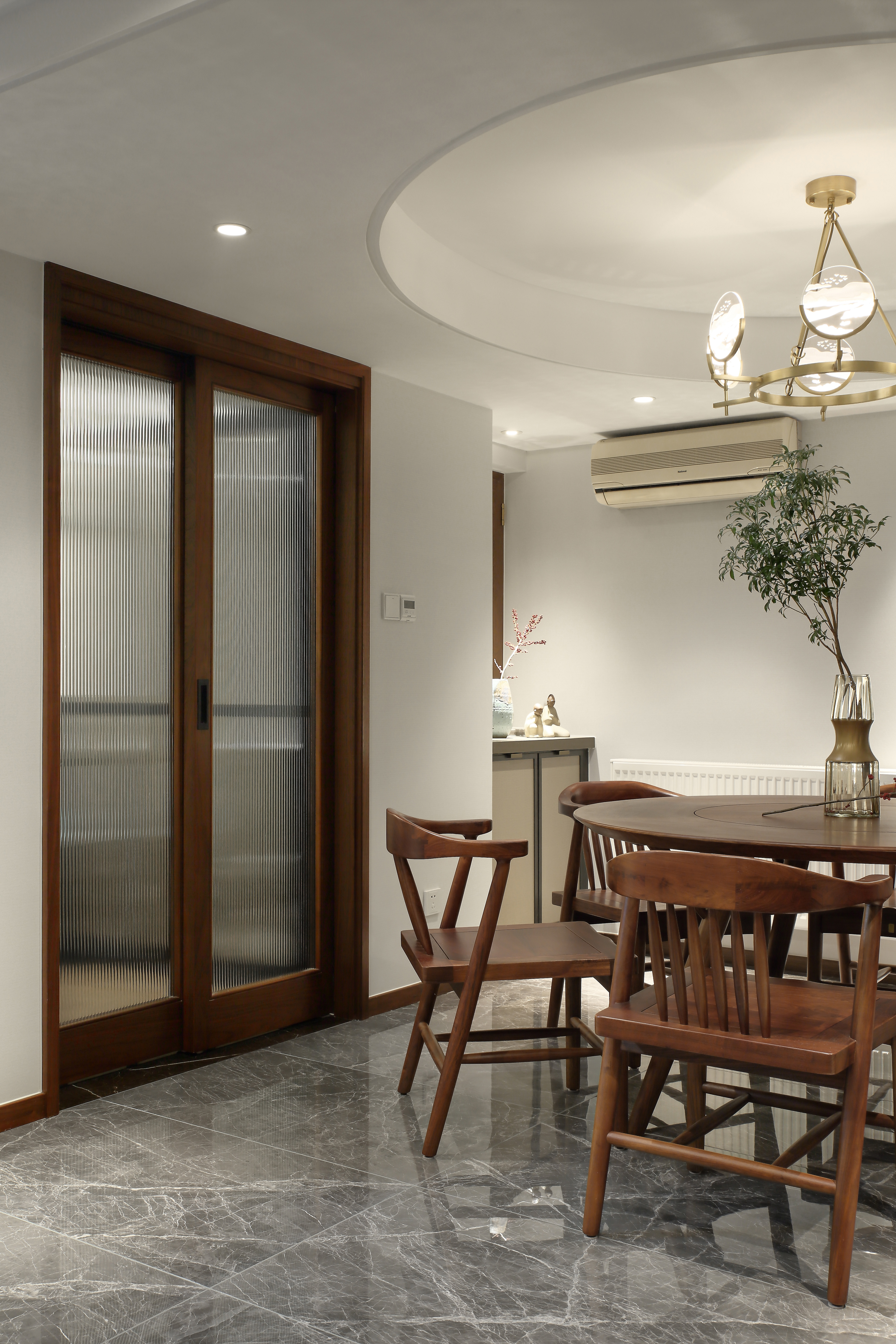 本案对空间对称的结构、材质的运用及软装陈列方式都体现出中式的韵味与仪式感,在东方美学被不断提起的今天,呈现出一种开放的姿态,并保持自我的风格。