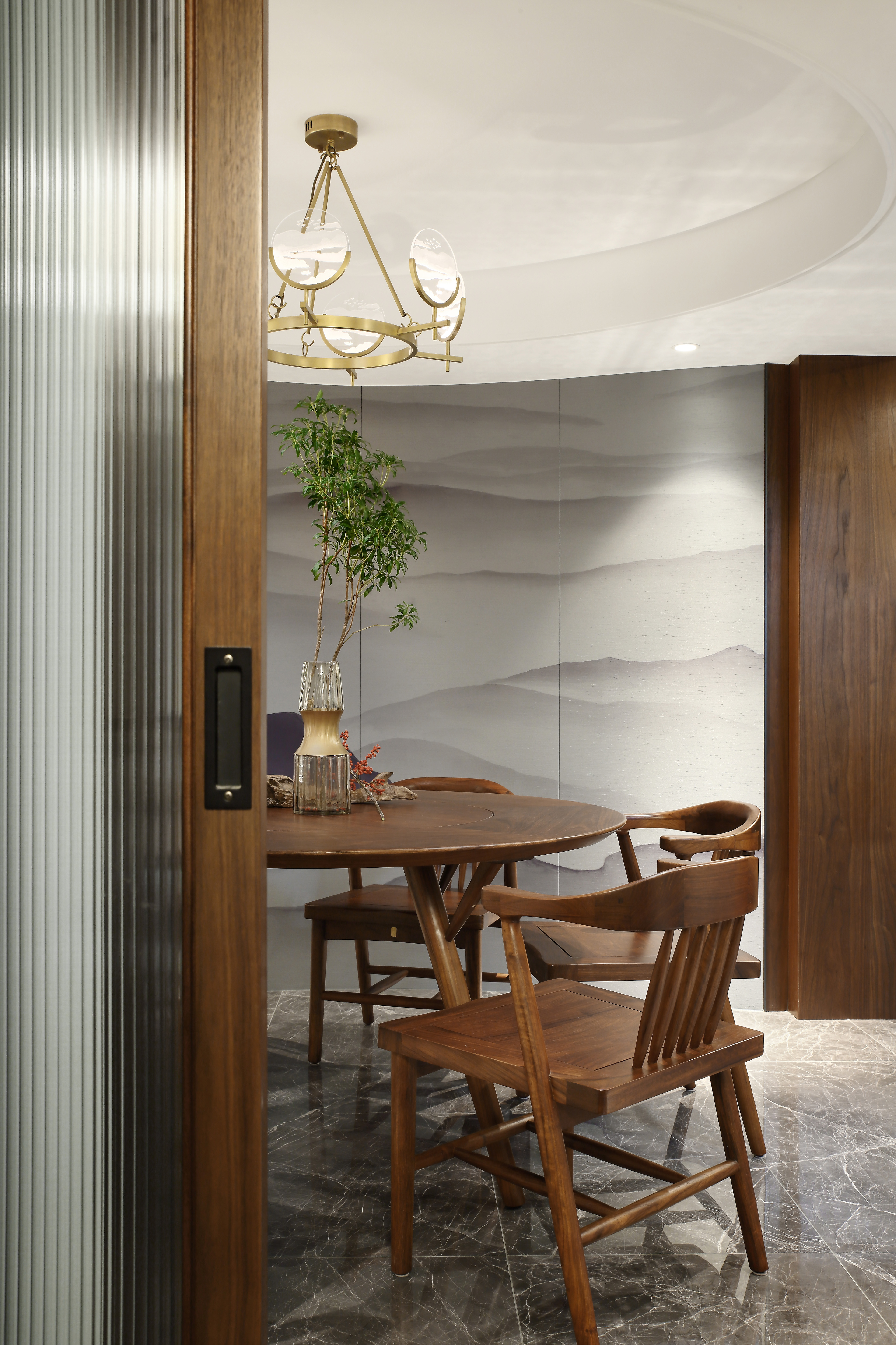 餐厅设计不仅延续了含蓄、高雅的生活方式与礼制之道,提炼出经典元素加以简化和丰富,圆形实木餐桌更显简约与流畅,人性化布局搭配触感顶级的材质,营造安静、舒适的用餐空间。