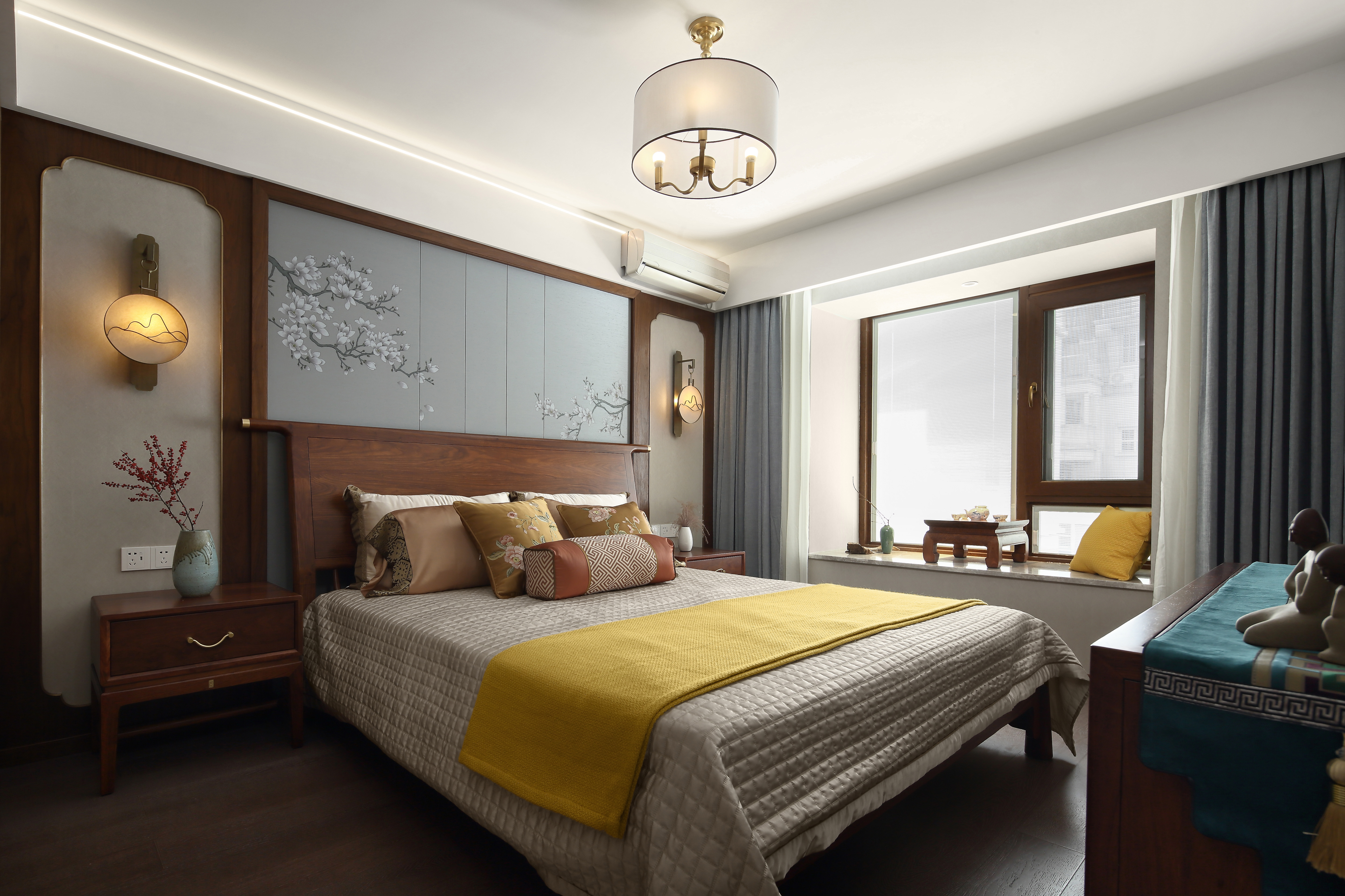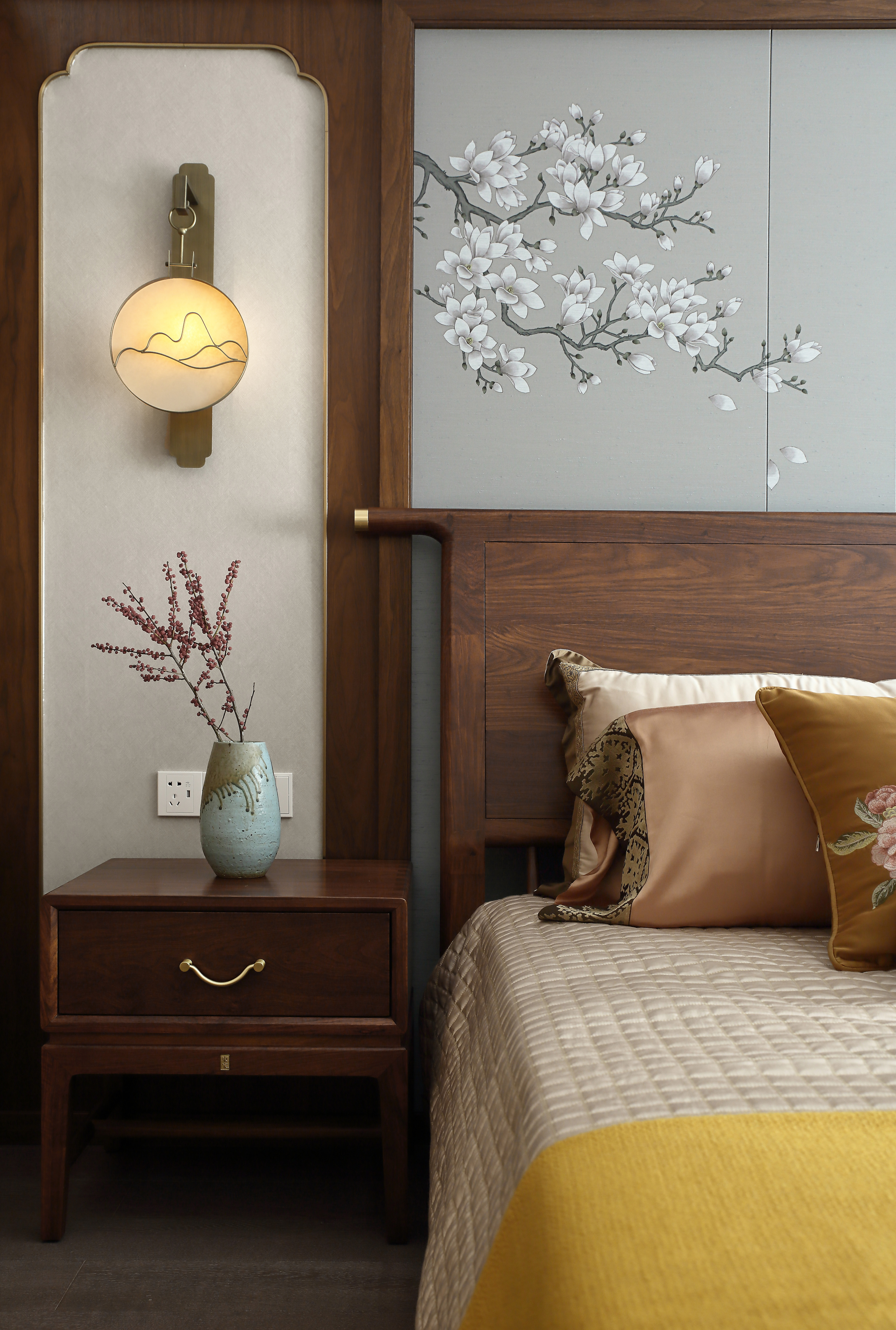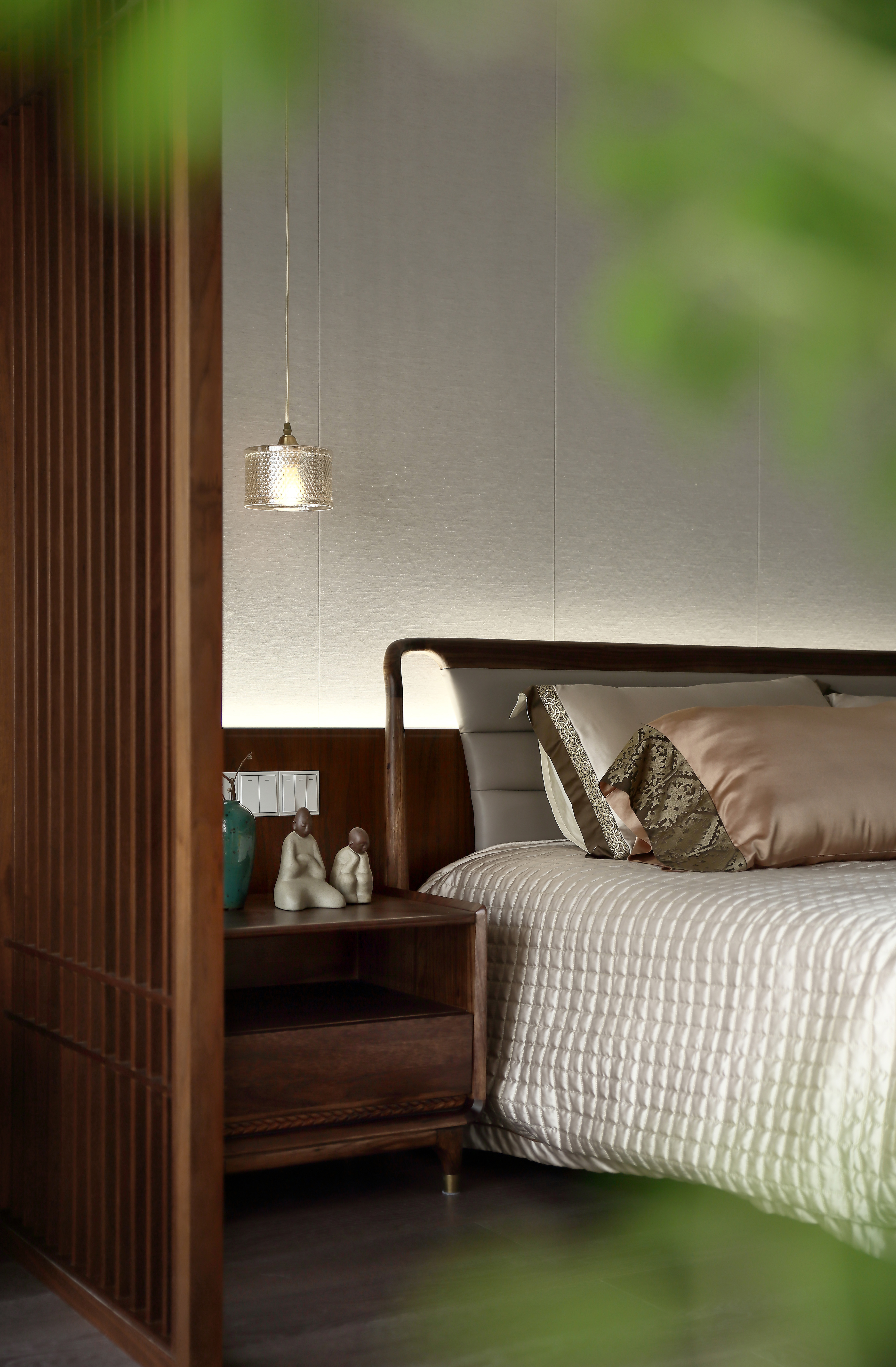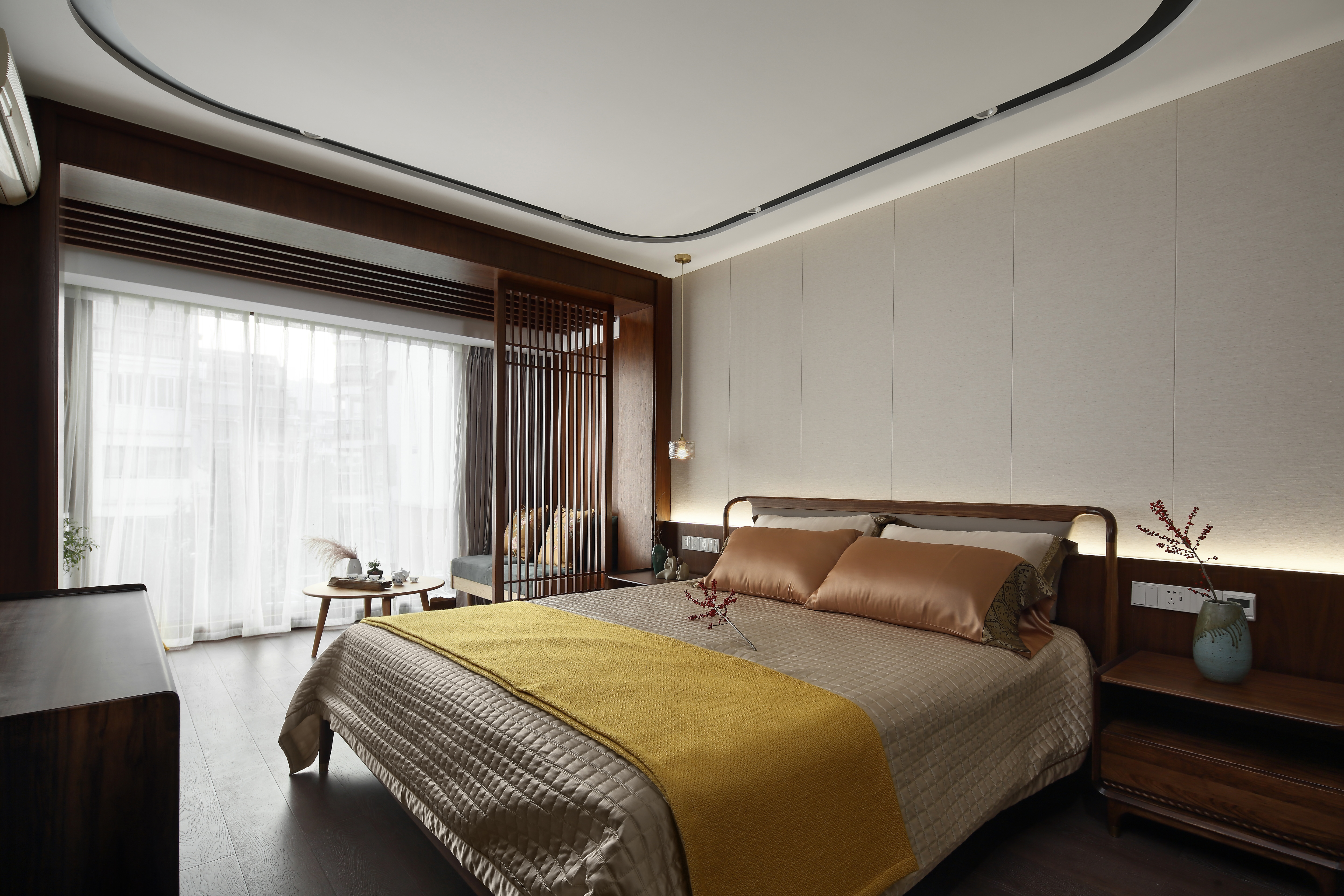 卧室背景墙采用木饰面与硬包的结合,简洁明朗的木质、时尚稳重的家具以及暖色的灯光氛围,使空间兼具温馨舒适与典雅贵气。