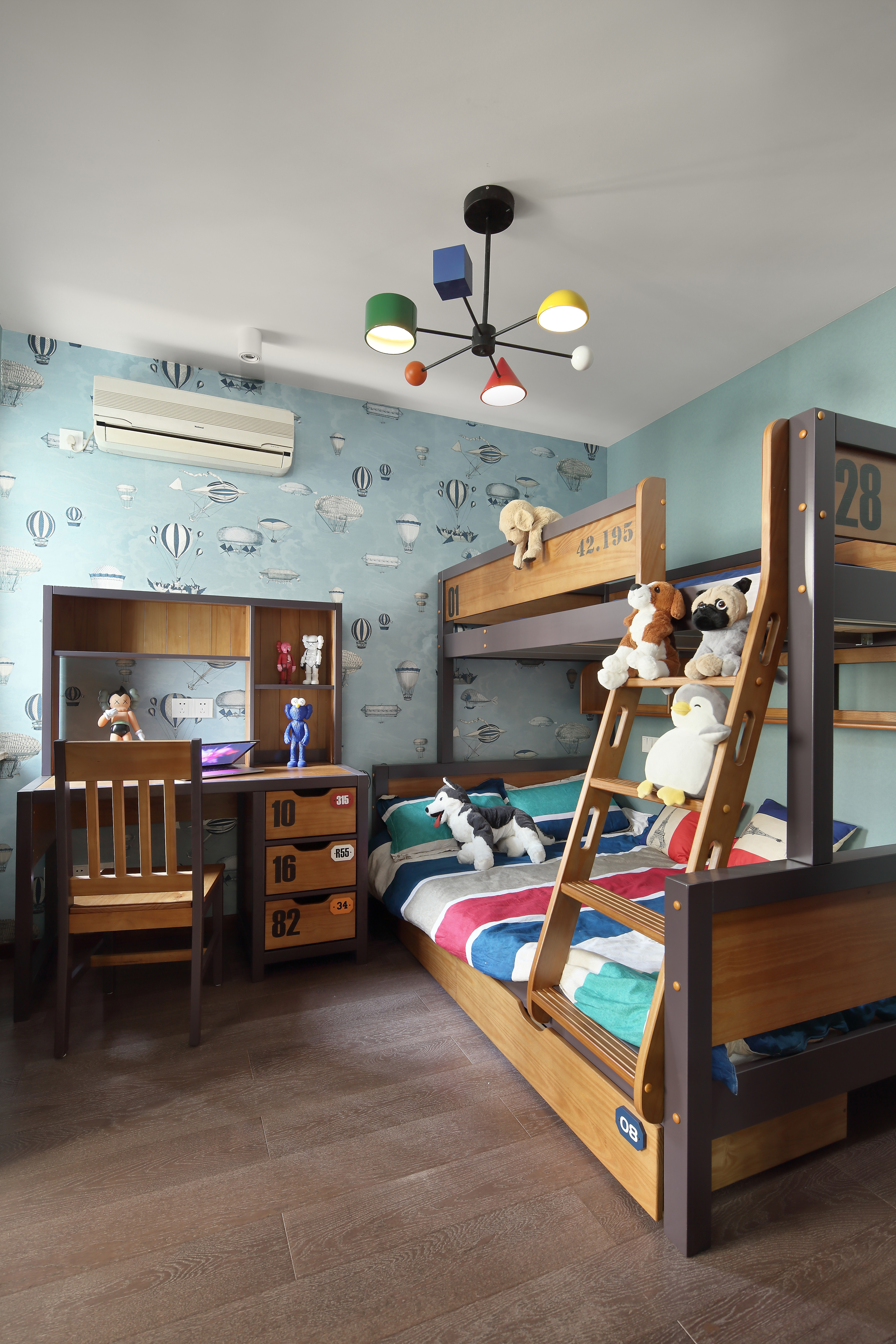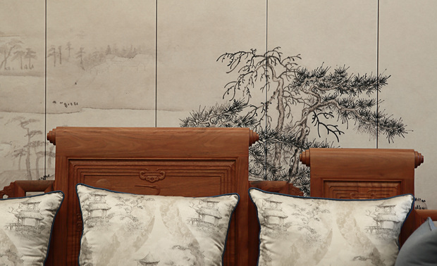 二层作为长辈房与主人房,与整个空间的步调一脉相承。天花设计采用木架斜屋顶造型,大气而稳重;木质温润的触感、淡雅素净的配色及艺术品的点缀为主卧进行了全新的定位。
