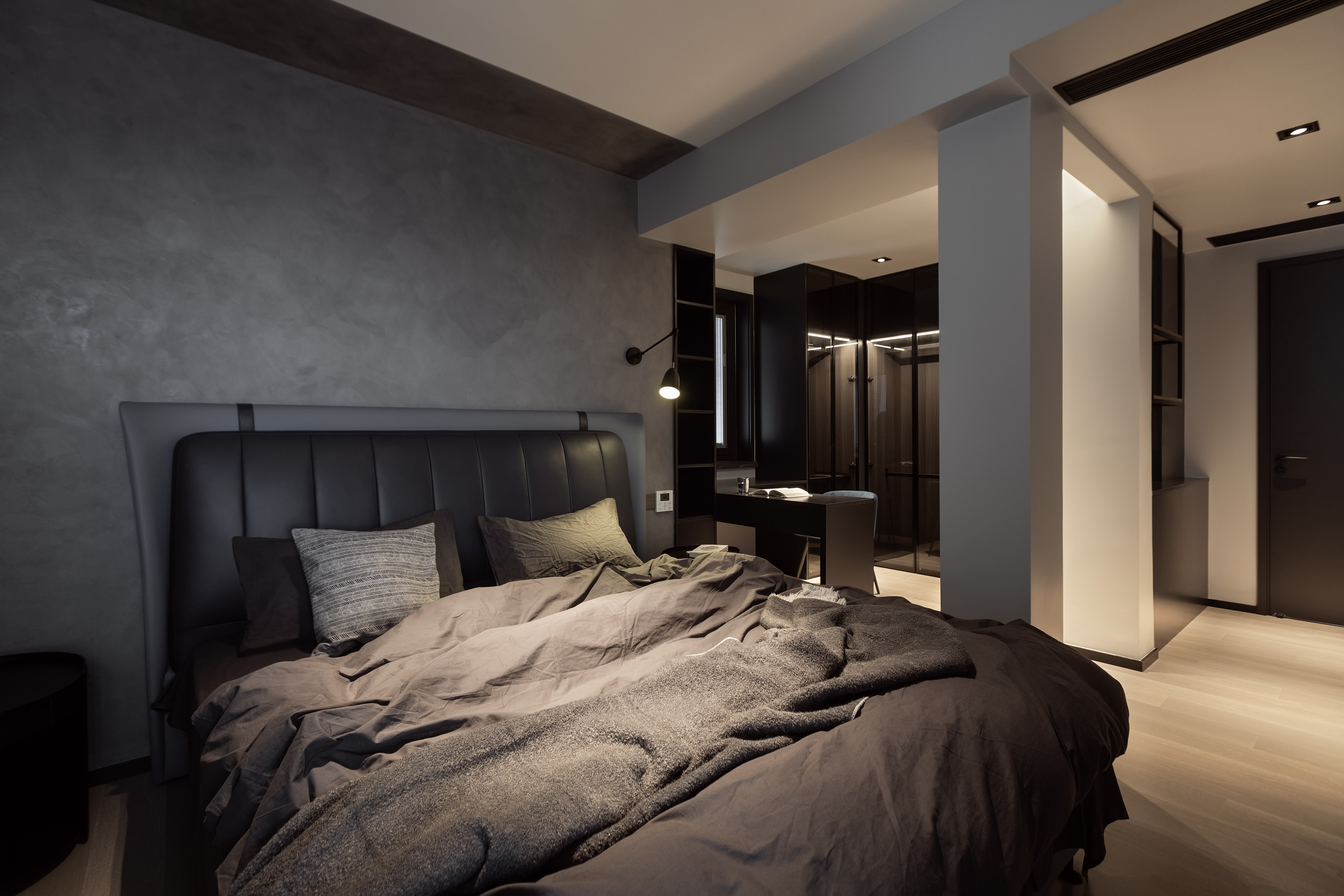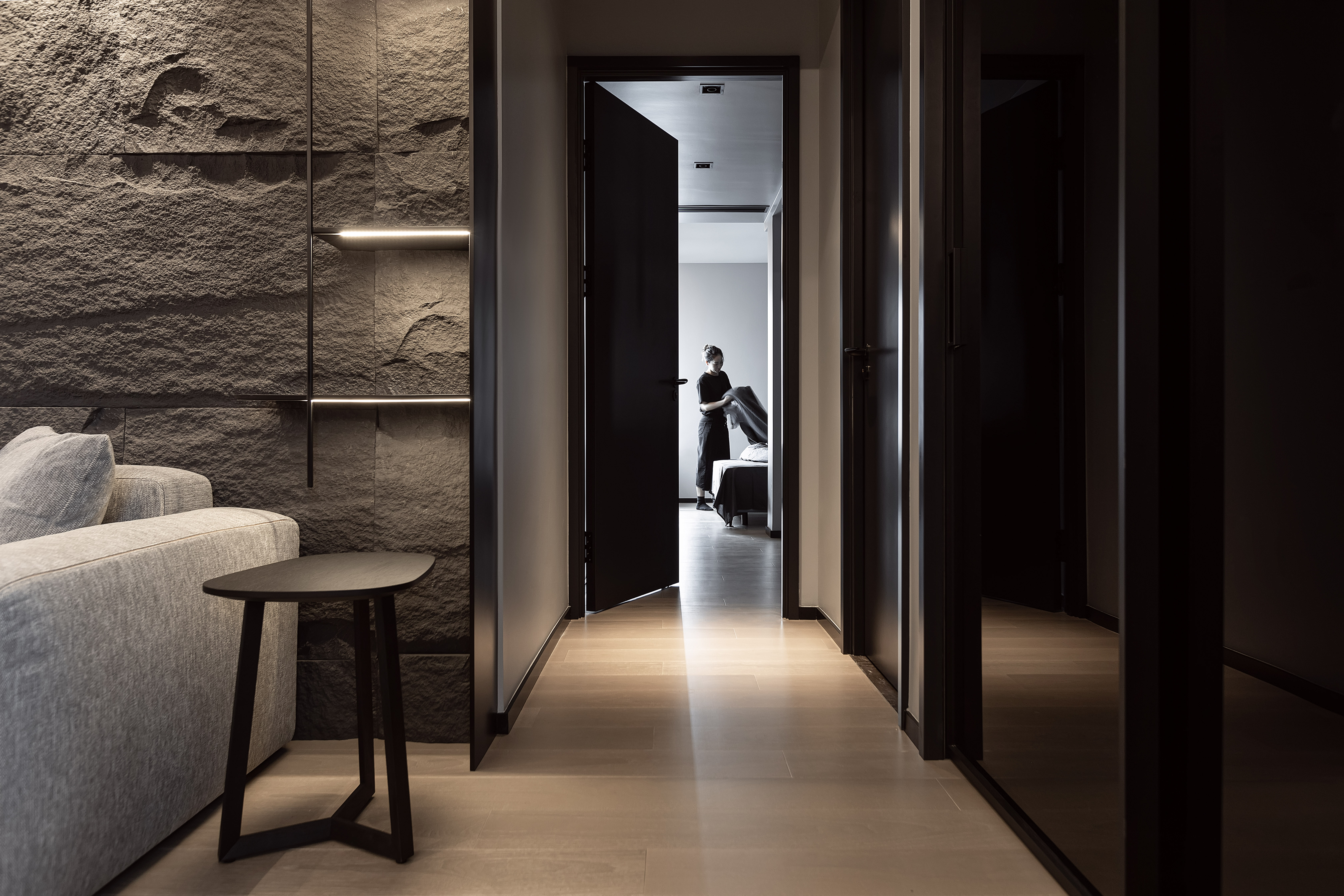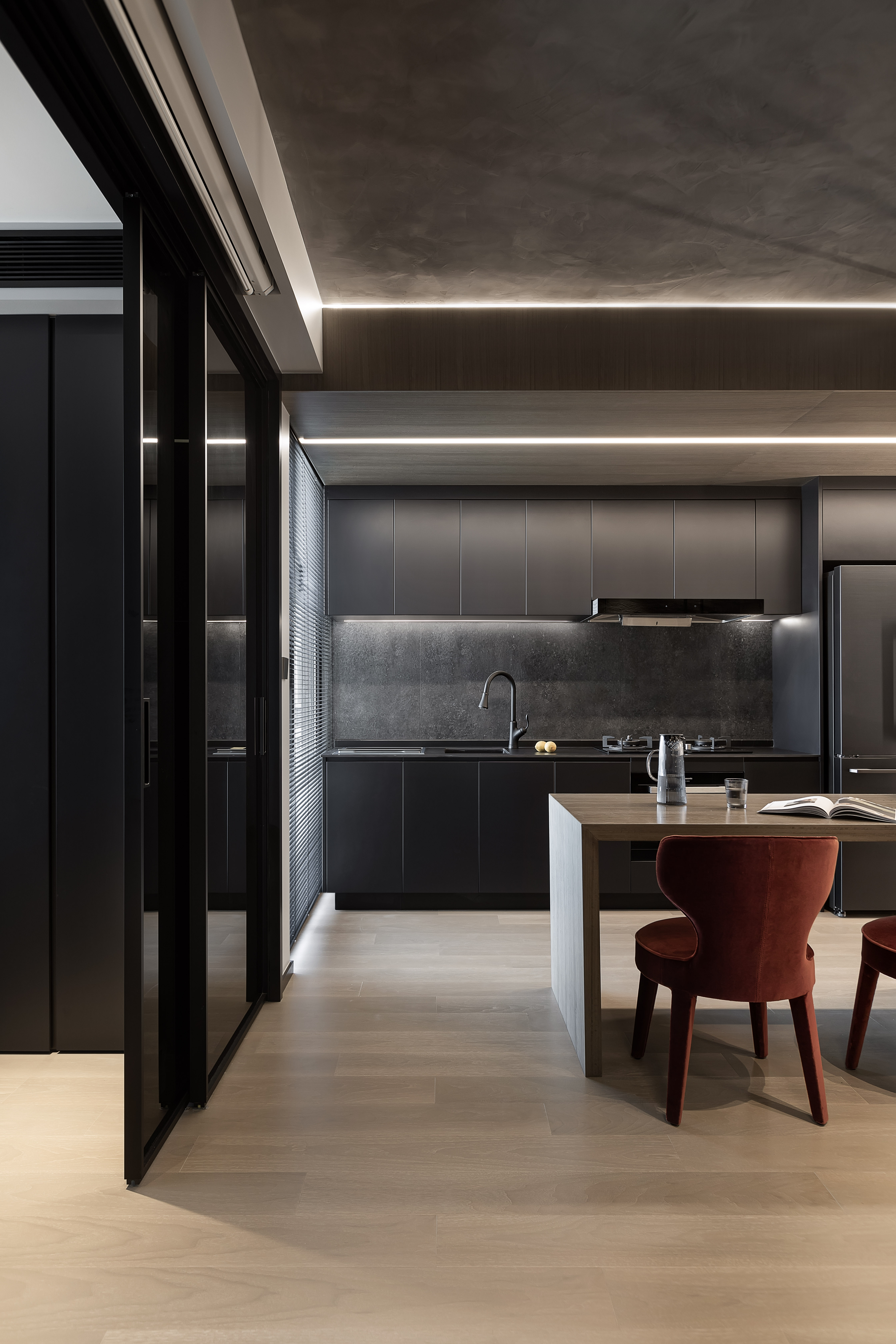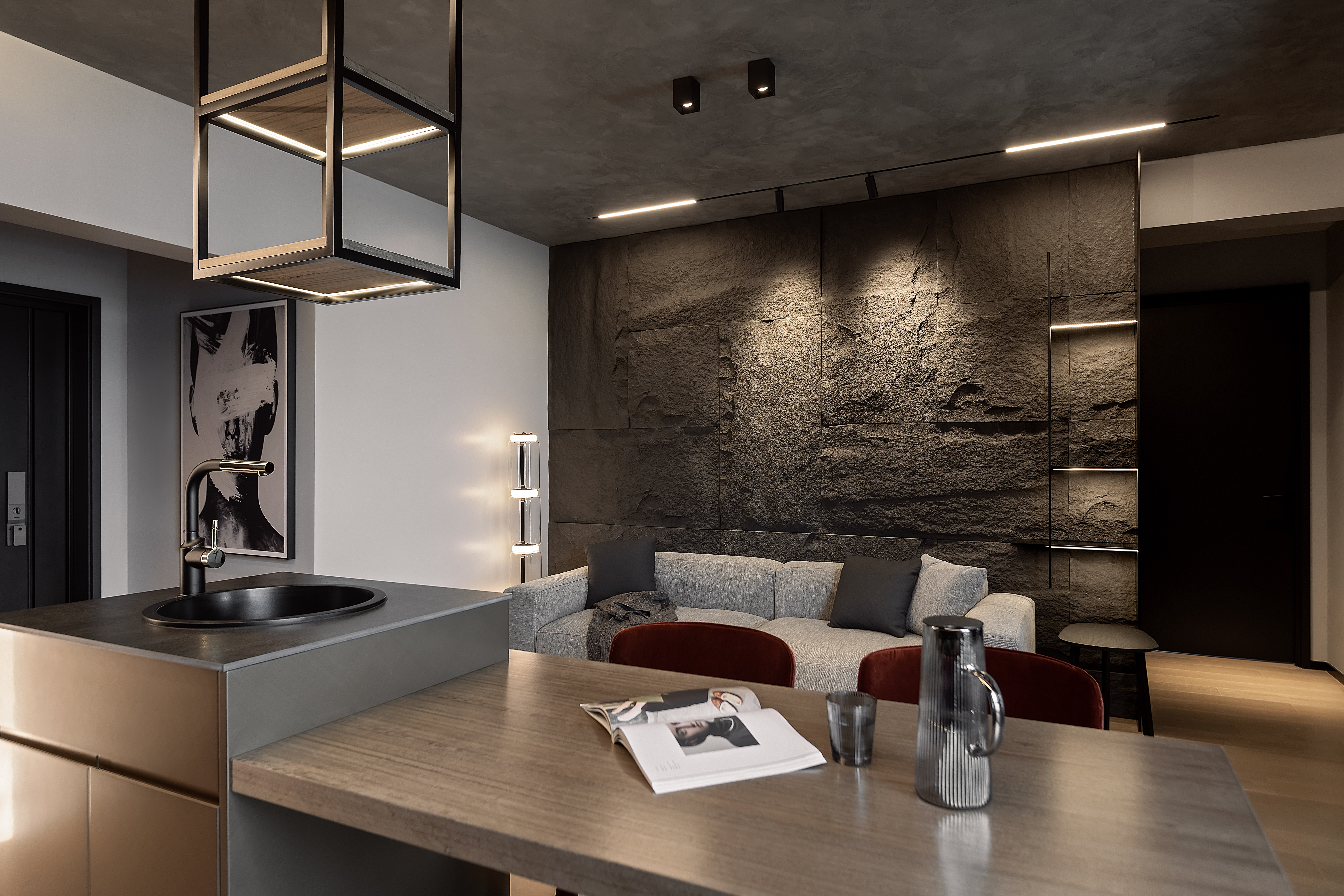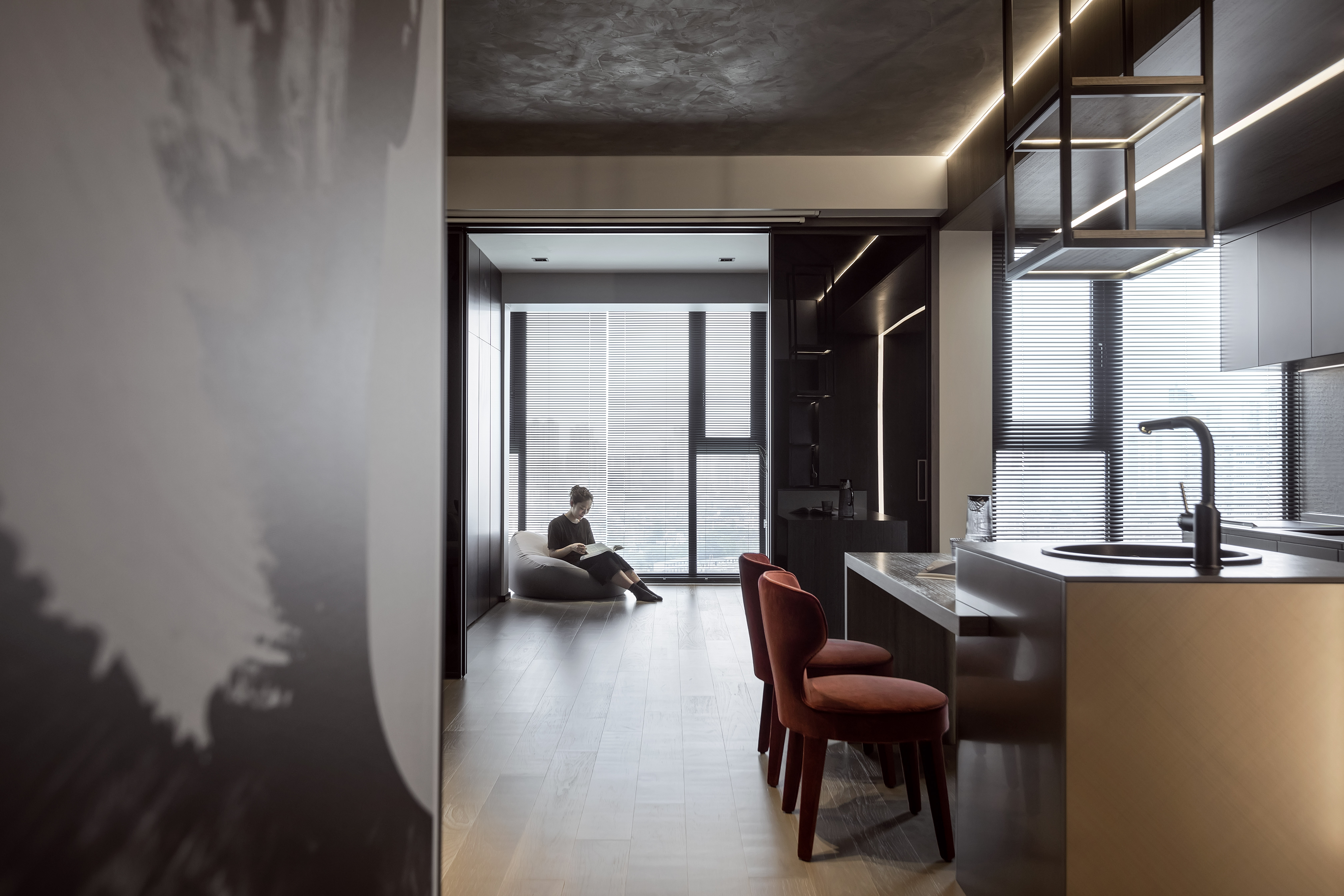 当大脑在处理、操控和过滤视觉信息时,他会留下意识地寻找其中隐藏的结构和意义。——陈大锦 方案的空间上进行了比较大的调整,年轻人的生活方式不再局限于常规布局,更多注重于功能上的需求。改变原有的朝南客厅空间将其跟餐厨区域融合在一起,打开厨房区域跟餐桌做一个融合,结合西厨的功能,既是餐桌也是岛台操作区更是吧台与书桌,增加了休闲娱乐性,反面就是沙发可以放下幕布可以跟朋友一起聚会观影,配合背景的pu石材使空间呈现休闲的空间质感。原有的客厅空间调整为多功能房间,大面积的柜子里面藏有翻版床区域,作为后期的宝宝房间跟临时的客人休息区域,平时更多作为书房的空间使用,大面积的柜体满足家里整体的杂物收纳。调整原先比较小的房间区域,摆放1米8的床的基础上增加了独立衣帽间兼书房的功能,将原先厕所的位置外扩,既扩大功能性也增加了空间的趣味性,使得空间得到不一样的使用方式…… 由平面到三维空间体、采用建筑折叠的方式,置入空间盒子元素有一个或者多个的折叠平面构成的体量空间,展示了内的连续。整体在不同方向上折叠平面,竖向上放置不同功能结合灯光的变化光影于四处流窜,将所到之处都浸染,滤过一片氤氲……