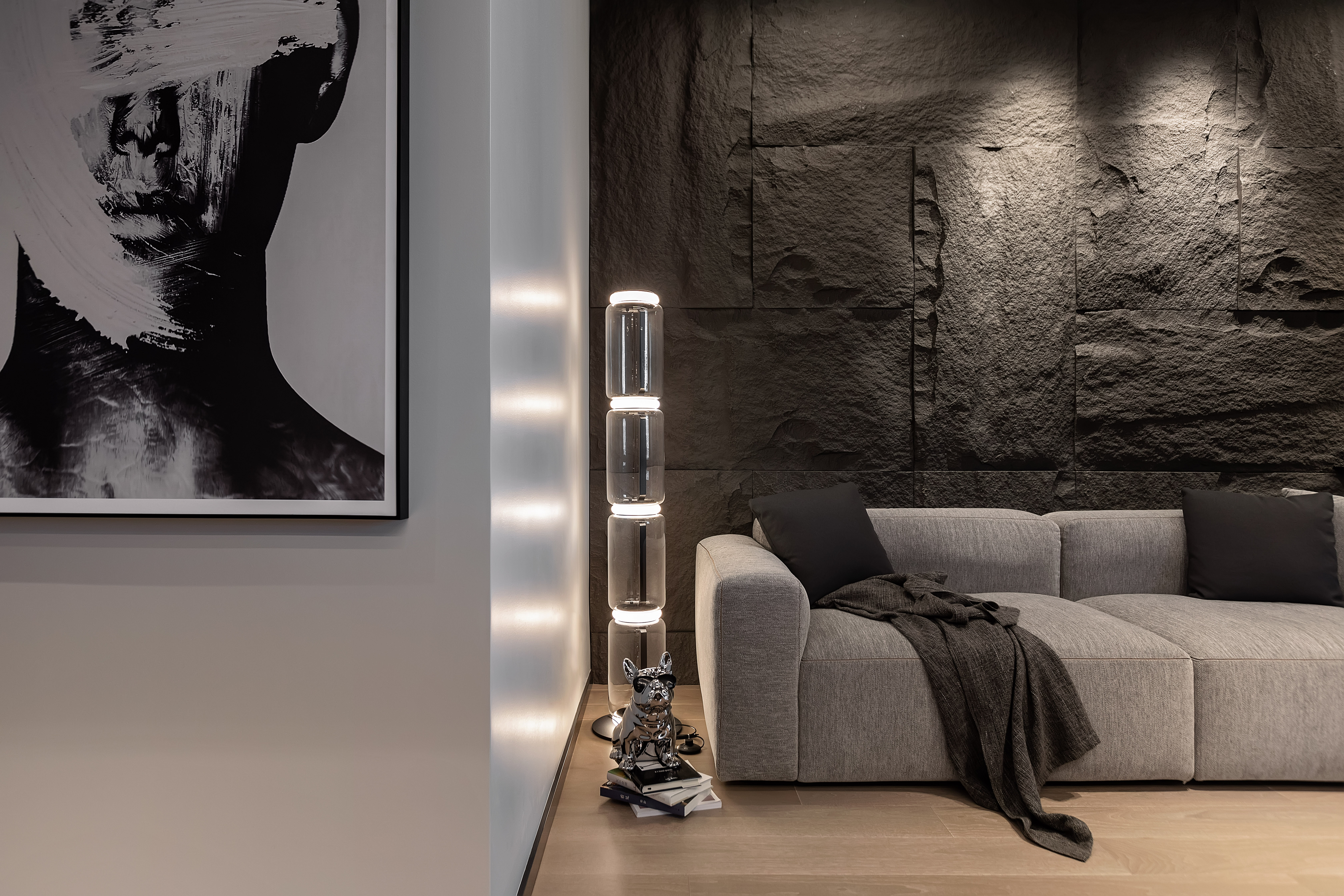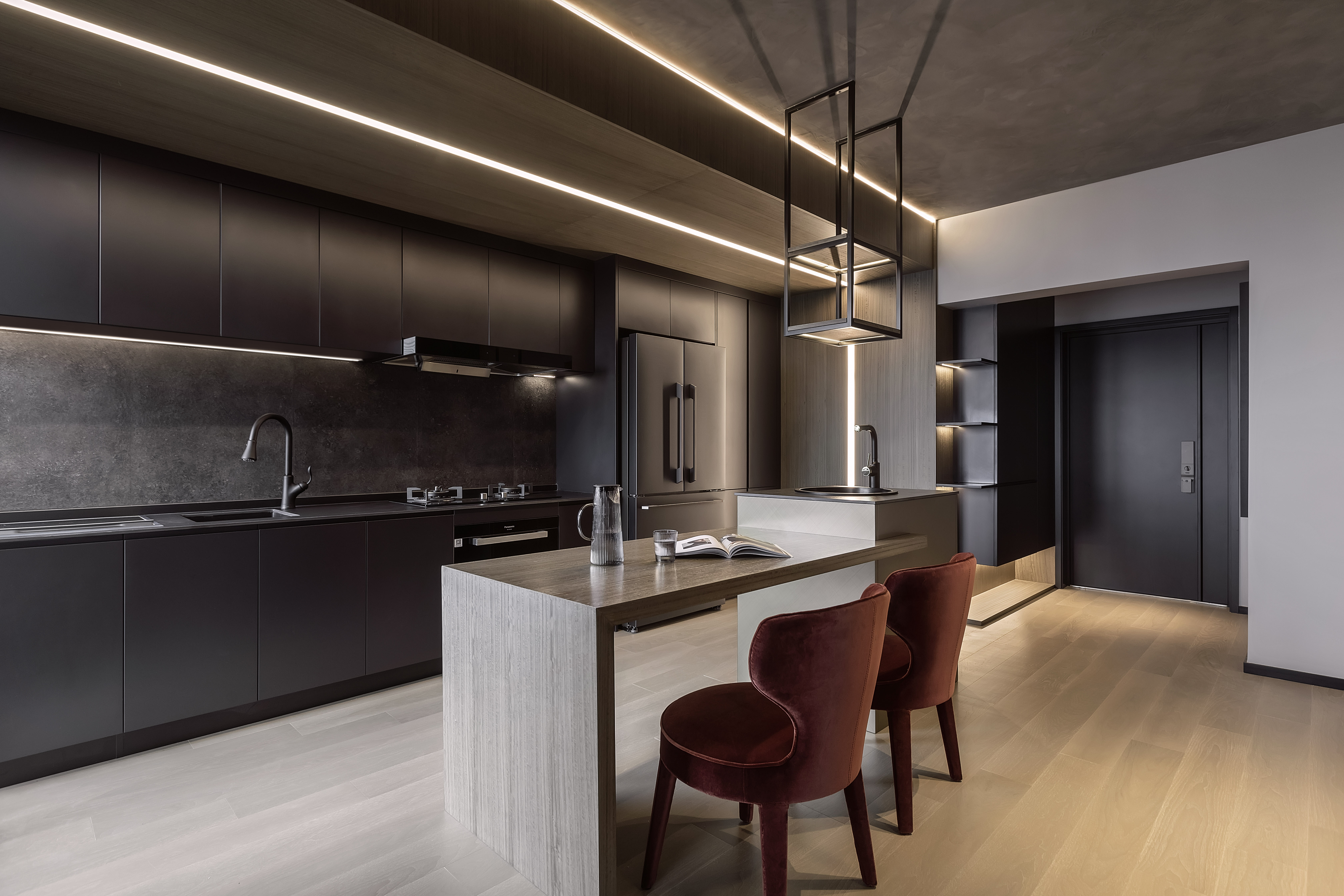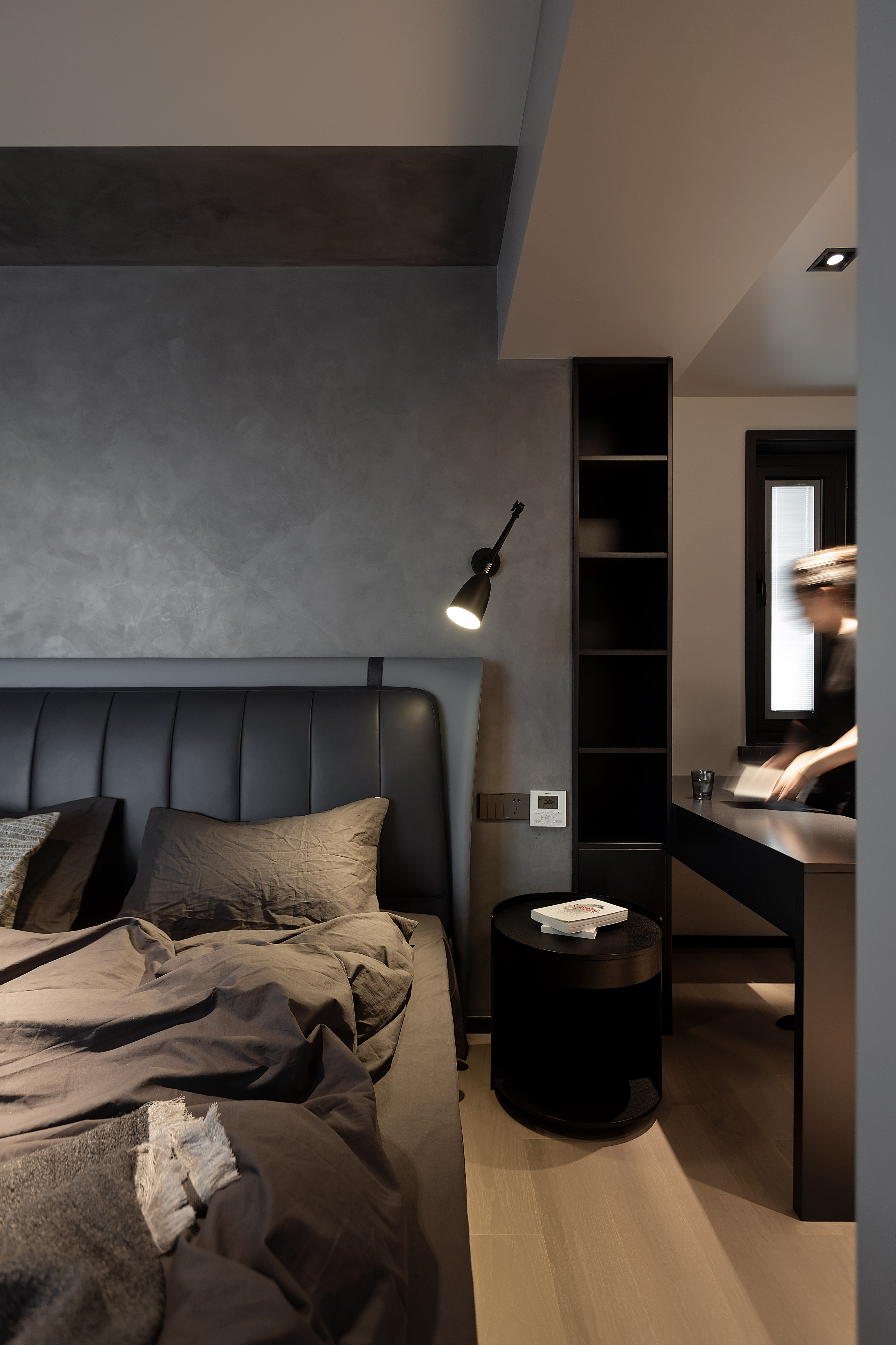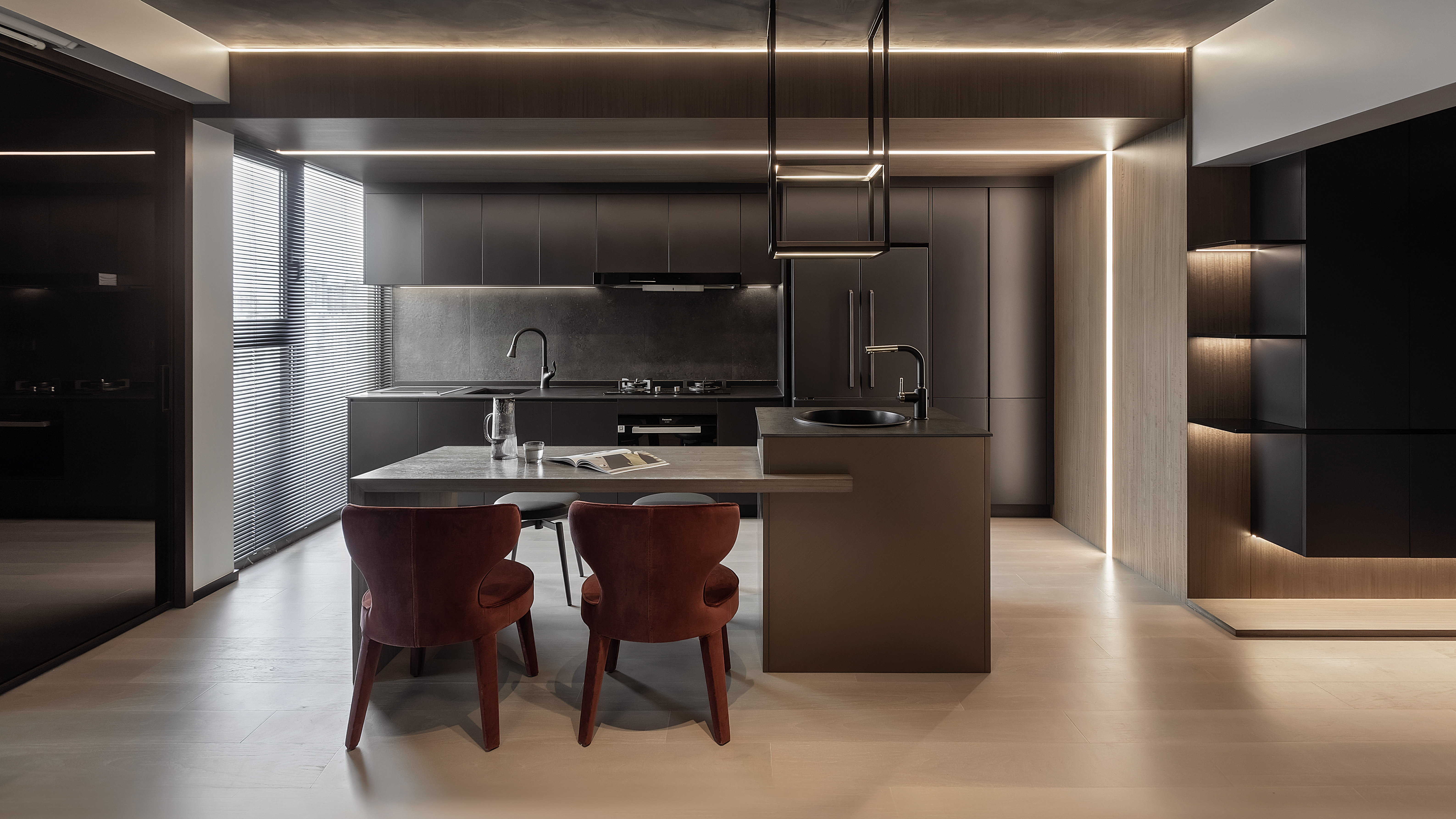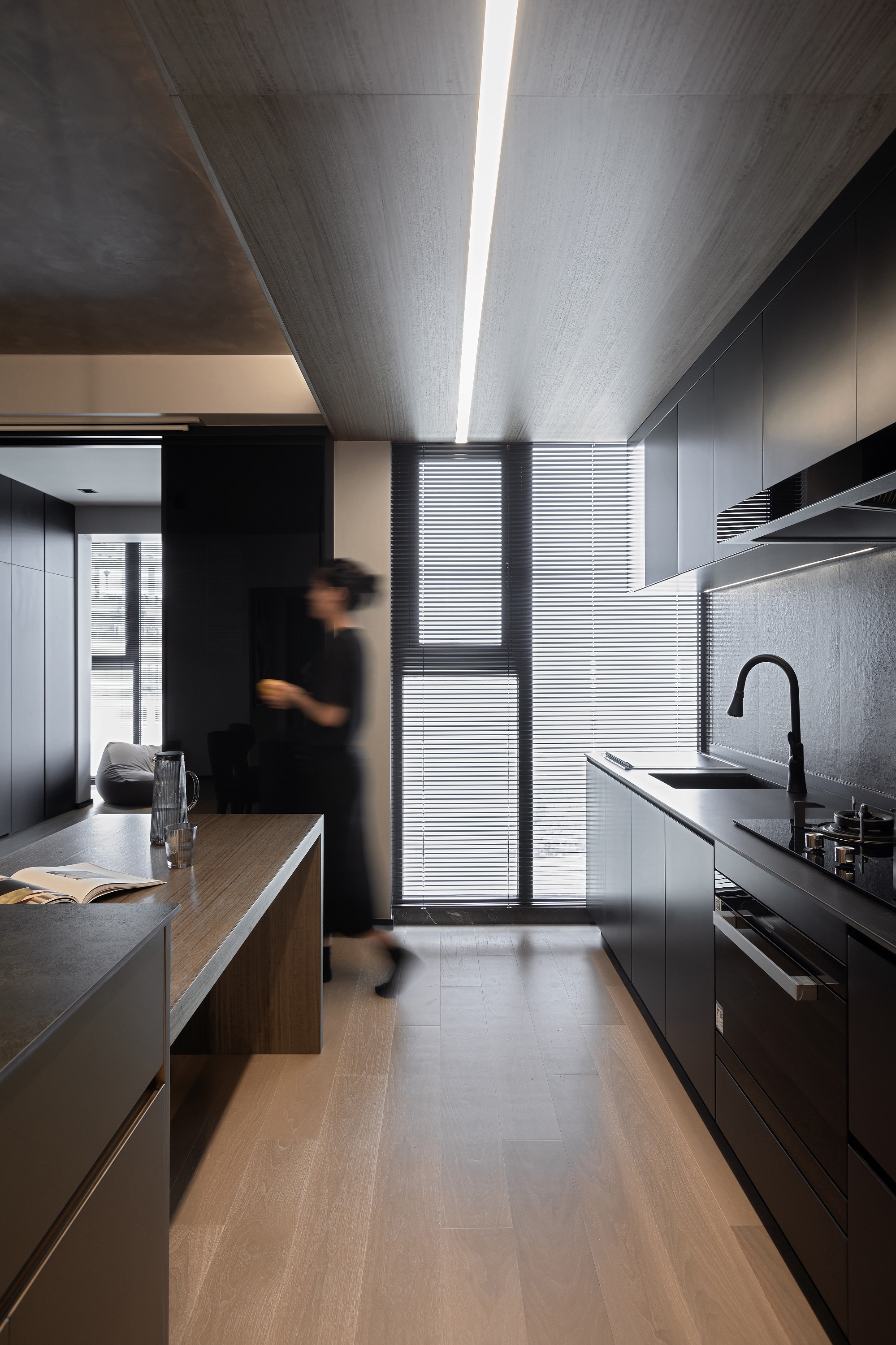 当大脑在处理、操控和过滤视觉信息时,他会留下意识地寻找其中隐藏的结构和意义。——陈大锦 方案的空间上进行了比较大的调整,年轻人的生活方式不再局限于常规布局,更多注重于功能上的需求。改变原有的朝南客厅空间将其跟餐厨区域融合在一起,打开厨房区域跟餐桌做一个融合,结合西厨的功能,既是餐桌也是岛台操作区更是吧台与书桌,增加了休闲娱乐性,反面就是沙发可以放下幕布可以跟朋友一起聚会观影,配合背景的pu石材使空间呈现休闲的空间质感。原有的客厅空间调整为多功能房间,大面积的柜子里面藏有翻版床区域,作为后期的宝宝房间跟临时的客人休息区域,平时更多作为书房的空间使用,大面积的柜体满足家里整体的杂物收纳。调整原先比较小的房间区域,摆放1米8的床的基础上增加了独立衣帽间兼书房的功能,将原先厕所的位置外扩,既扩大功能性也增加了空间的趣味性,使得空间得到不一样的使用方式…… 由平面到三维空间体、采用建筑折叠的方式,置入空间盒子元素有一个或者多个的折叠平面构成的体量空间,展示了内的连续。整体在不同方向上折叠平面,竖向上放置不同功能结合灯光的变化光影于四处流窜,将所到之处都浸染,滤过一片氤氲……