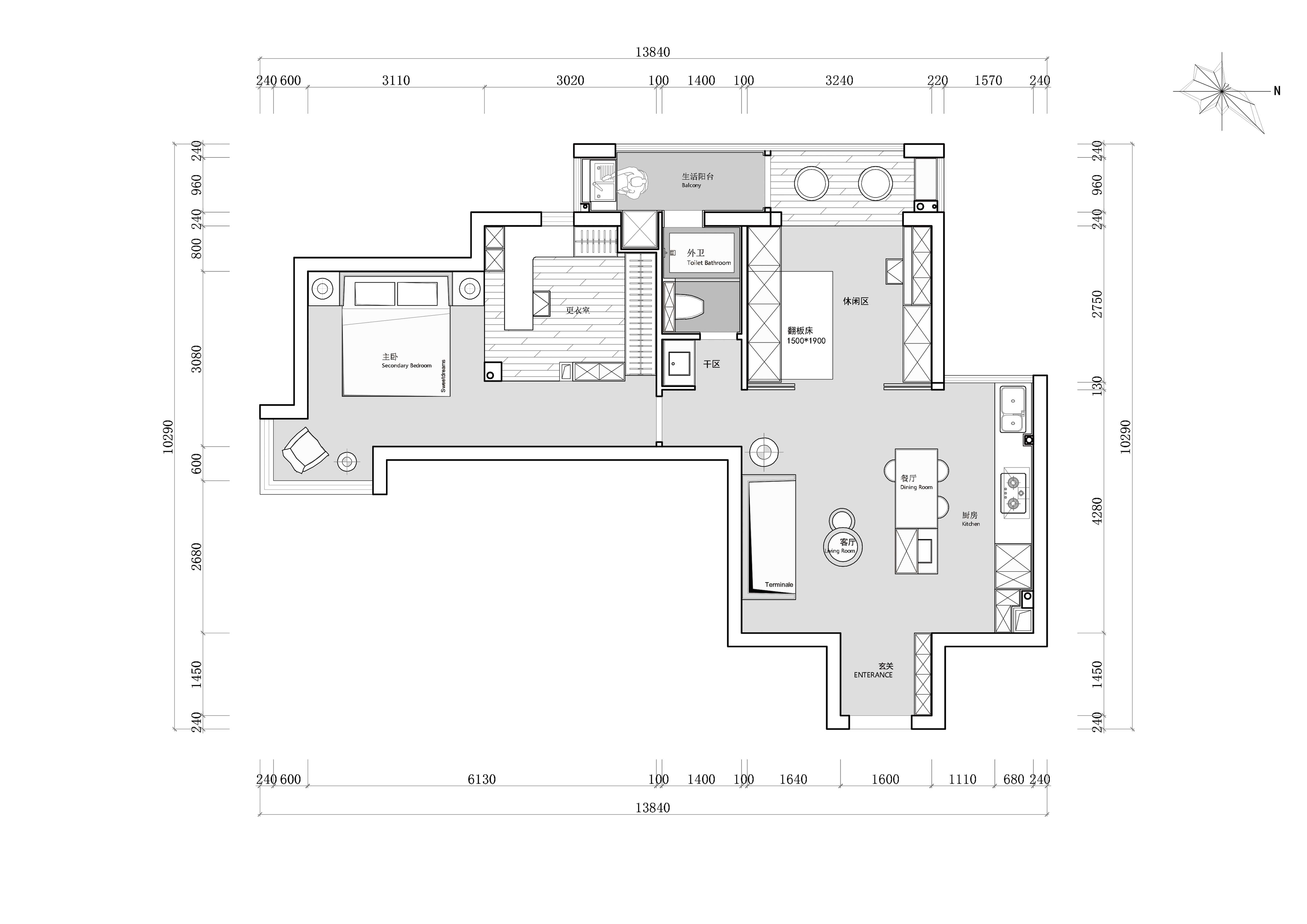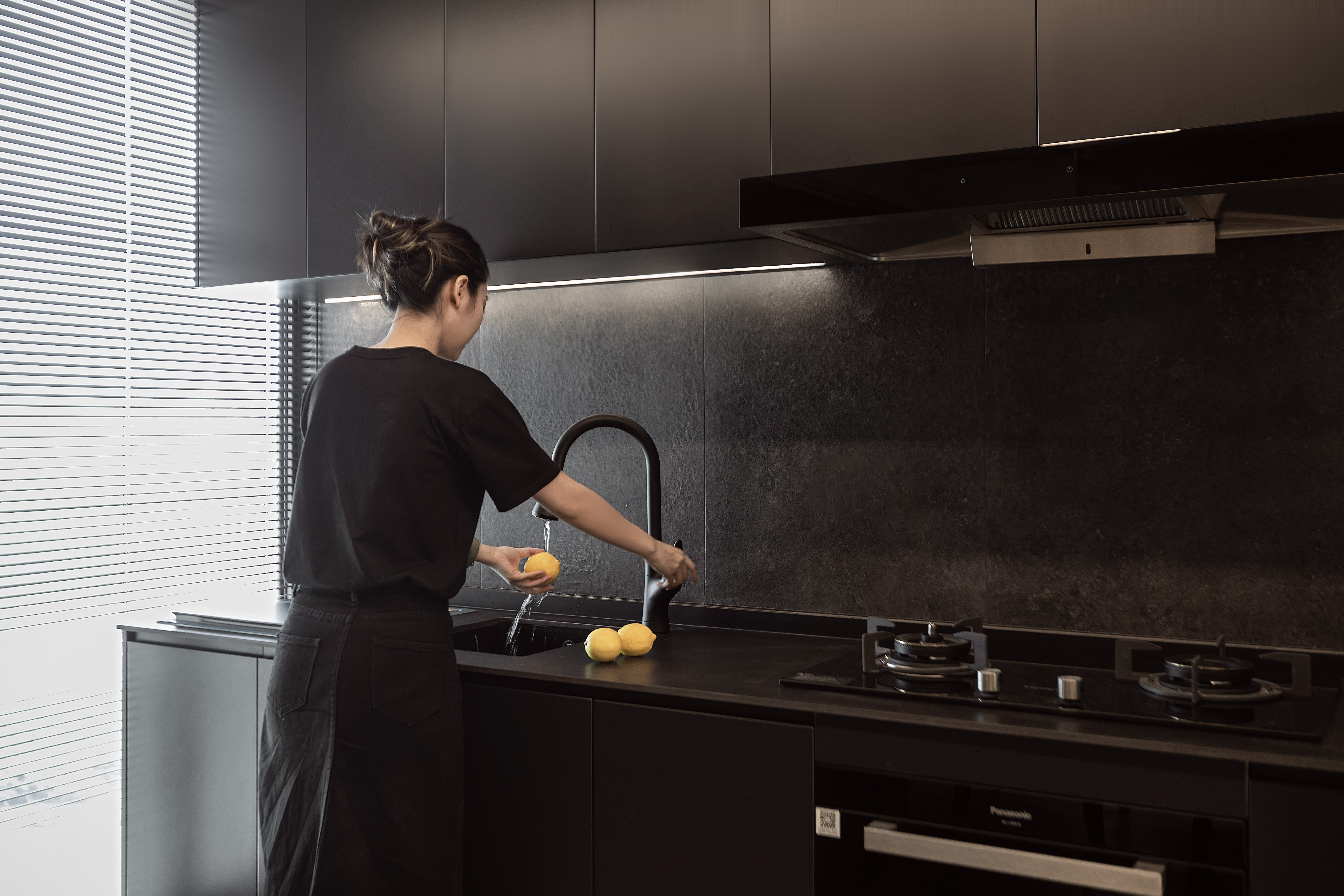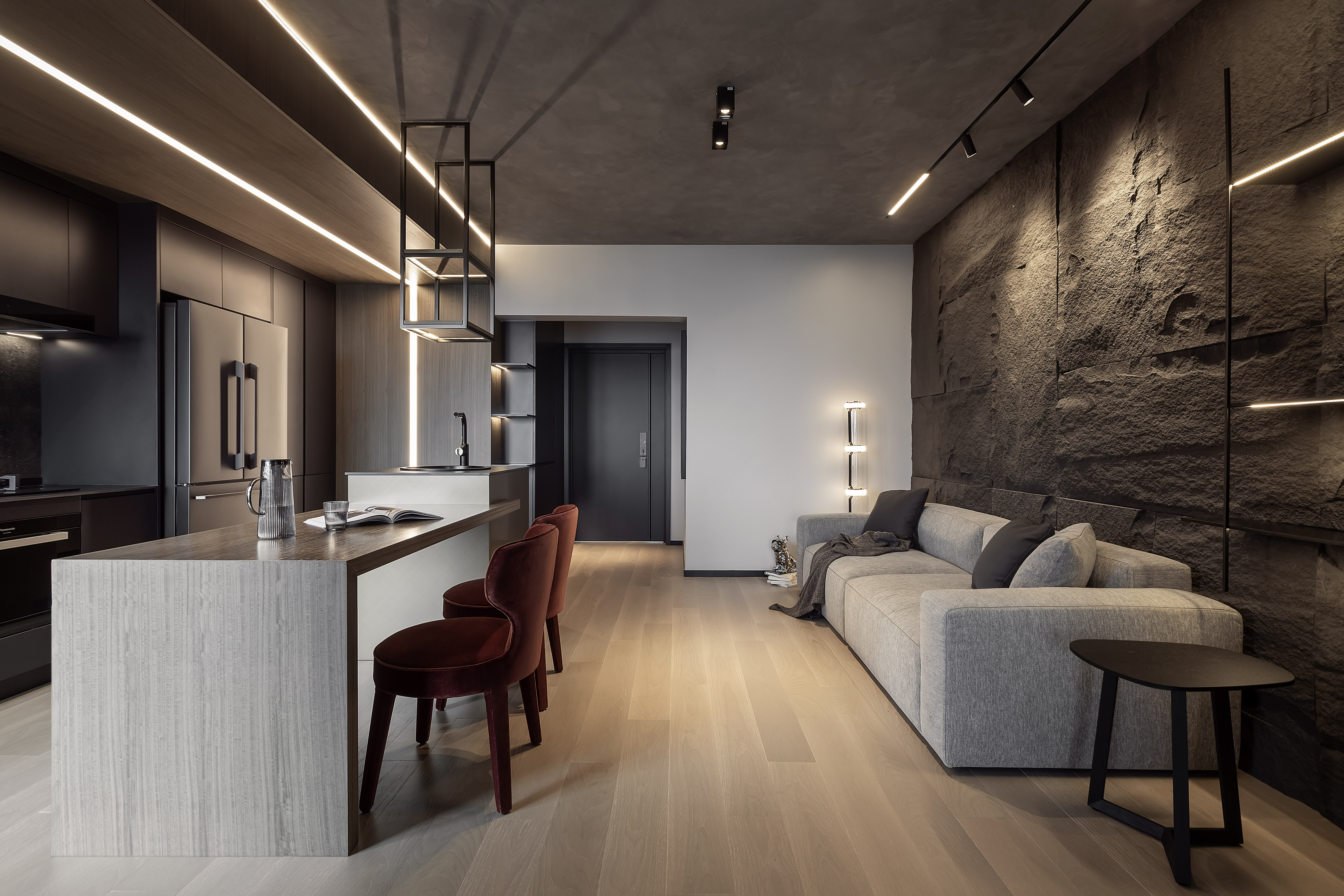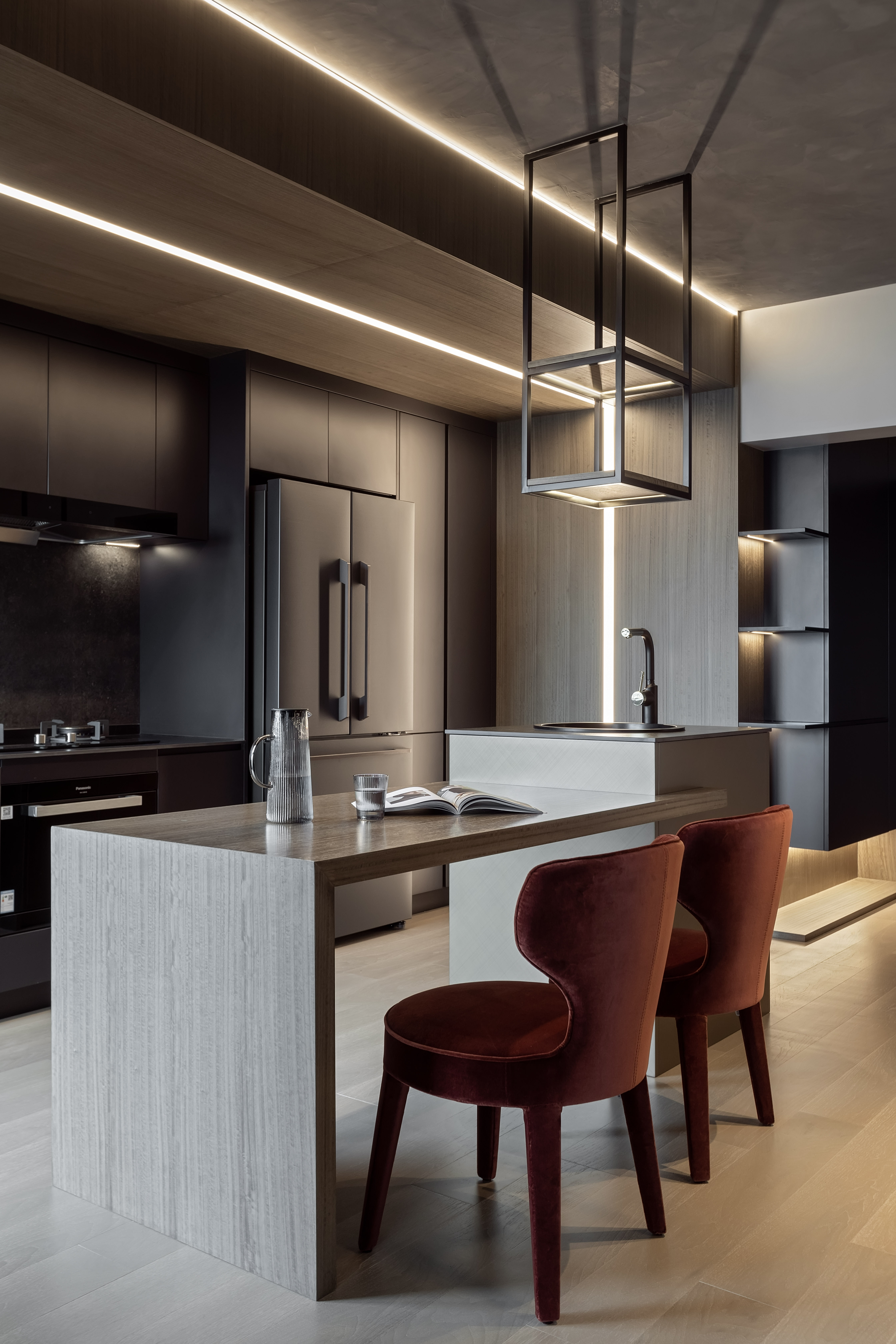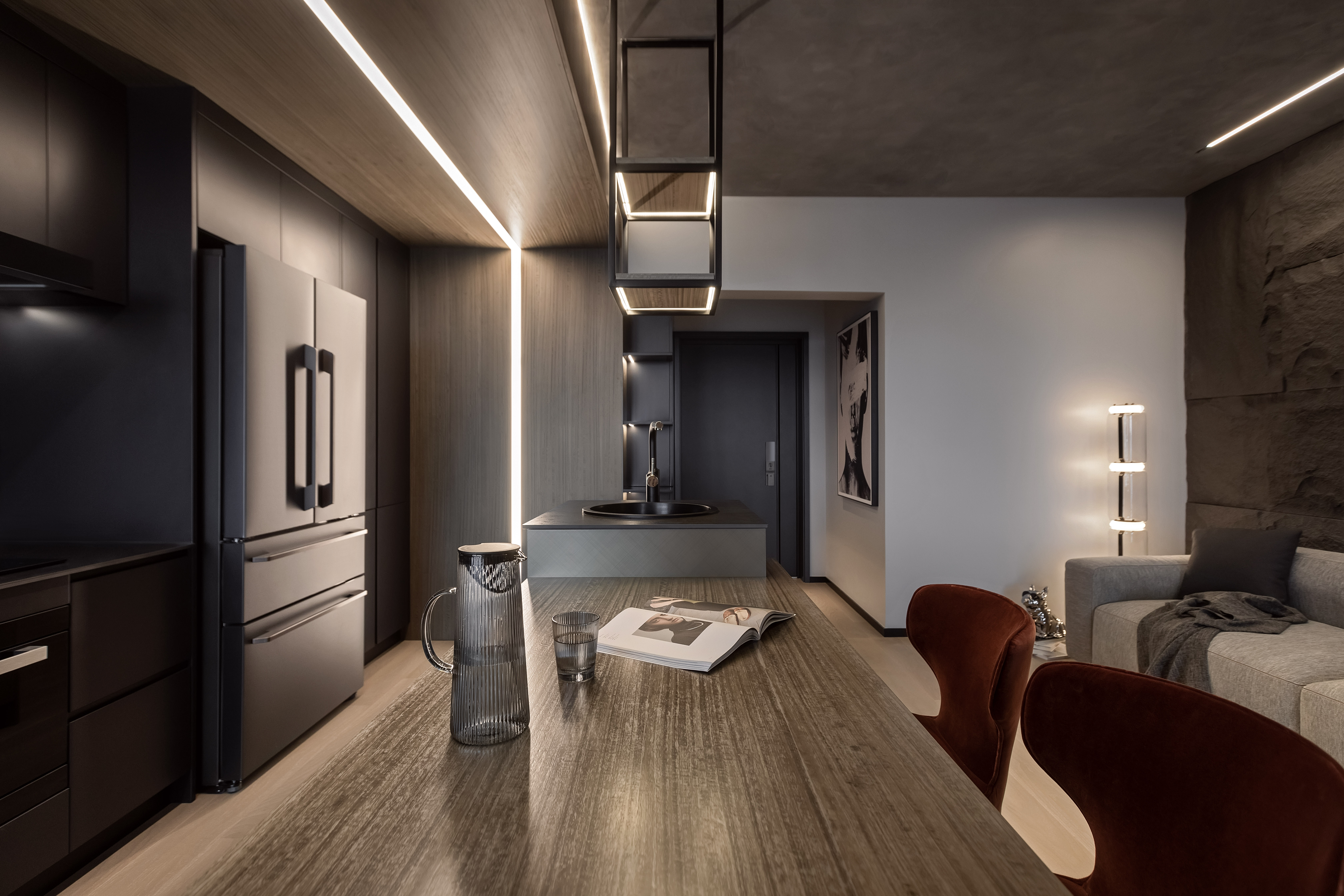 当大脑在处理、操控和过滤视觉信息时,他会留下意识地寻找其中隐藏的结构和意义。——陈大锦 方案的空间上进行了比较大的调整,年轻人的生活方式不再局限于常规布局,更多注重于功能上的需求。改变原有的朝南客厅空间将其跟餐厨区域融合在一起,打开厨房区域跟餐桌做一个融合,结合西厨的功能,既是餐桌也是岛台操作区更是吧台与书桌,增加了休闲娱乐性,反面就是沙发可以放下幕布可以跟朋友一起聚会观影,配合背景的pu石材使空间呈现休闲的空间质感。原有的客厅空间调整为多功能房间,大面积的柜子里面藏有翻版床区域,作为后期的宝宝房间跟临时的客人休息区域,平时更多作为书房的空间使用,大面积的柜体满足家里整体的杂物收纳。调整原先比较小的房间区域,摆放1米8的床的基础上增加了独立衣帽间兼书房的功能,将原先厕所的位置外扩,既扩大功能性也增加了空间的趣味性,使得空间得到不一样的使用方式…… 由平面到三维空间体、采用建筑折叠的方式,置入空间盒子元素有一个或者多个的折叠平面构成的体量空间,展示了内的连续。整体在不同方向上折叠平面,竖向上放置不同功能结合灯光的变化光影于四处流窜,将所到之处都浸染,滤过一片氤氲……