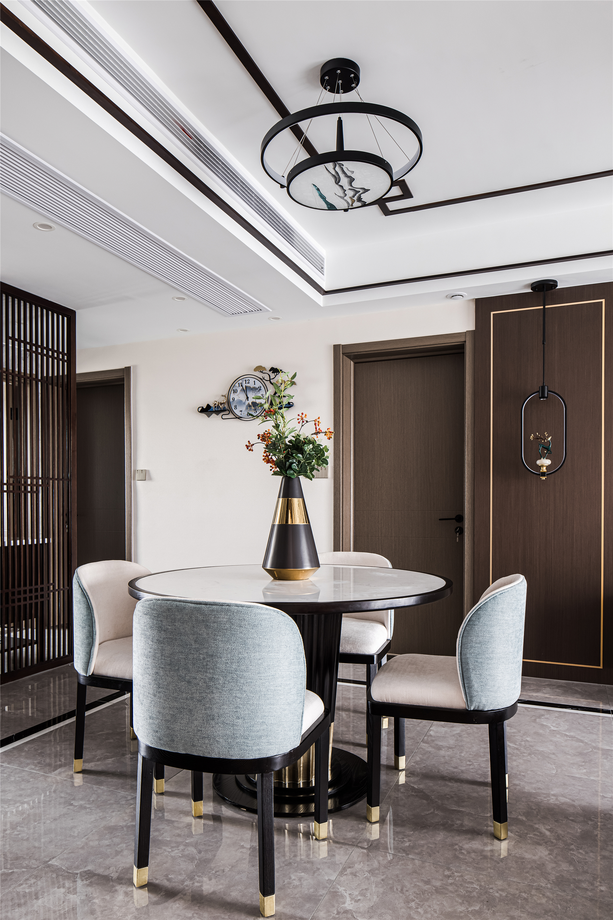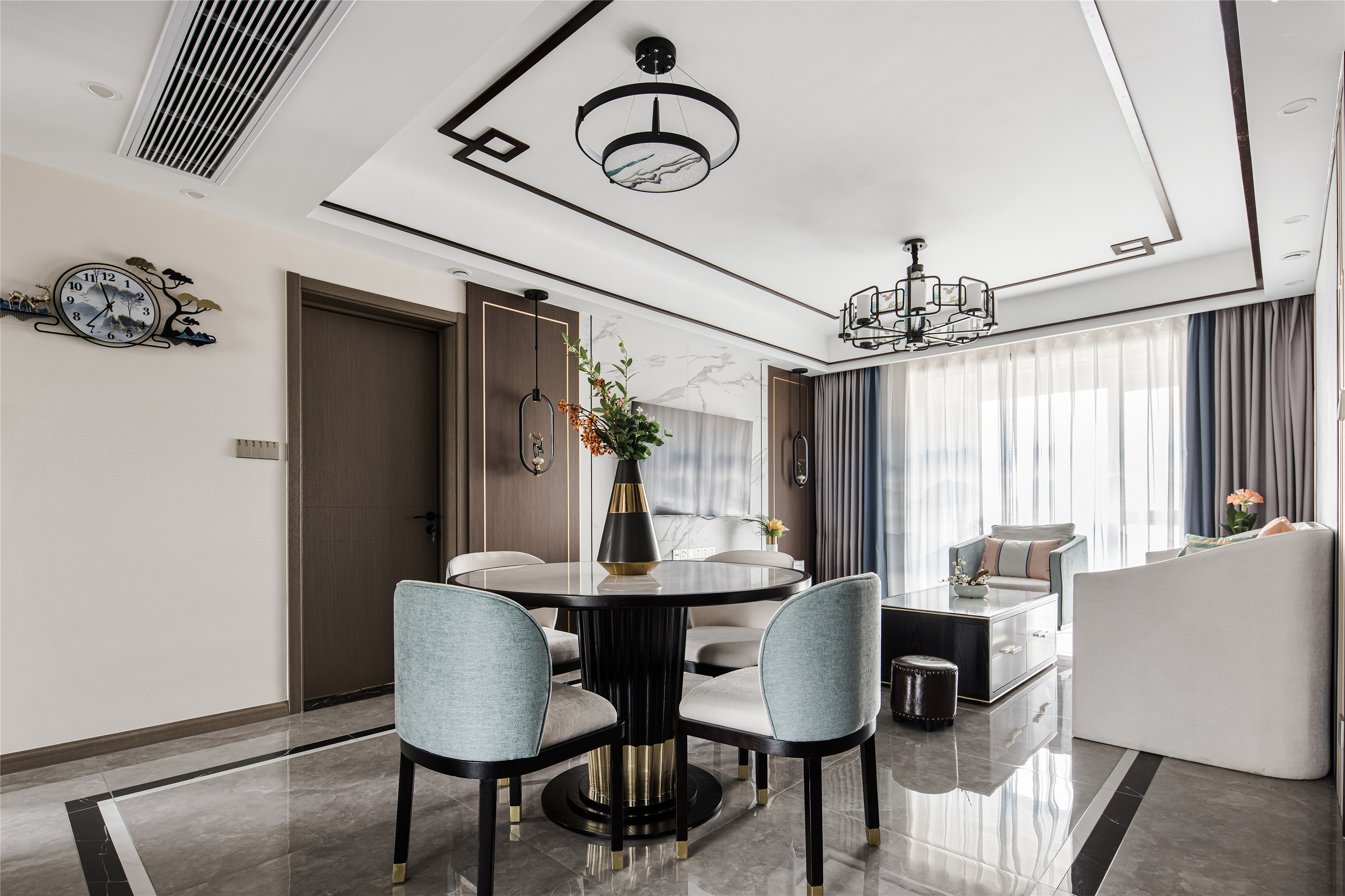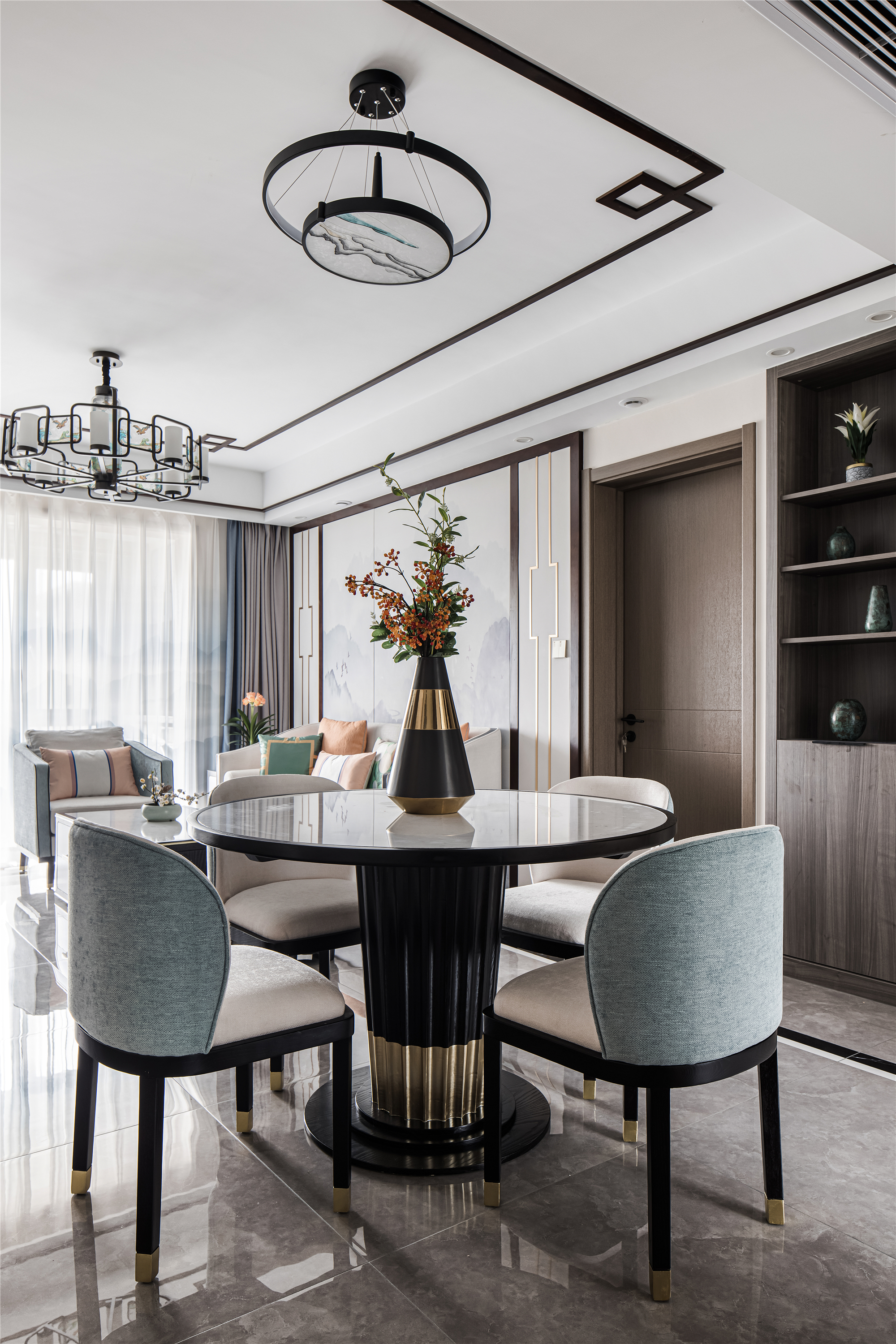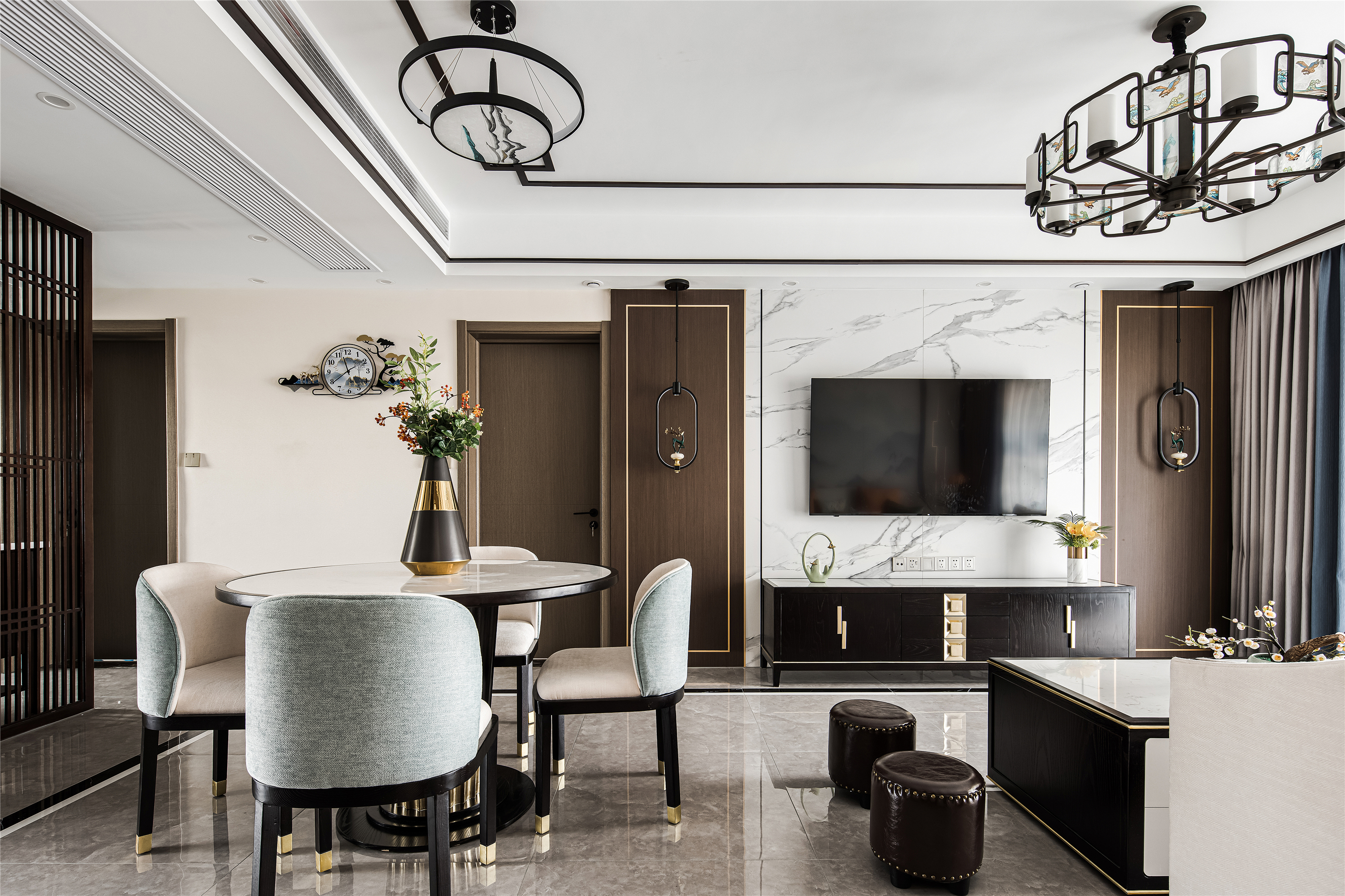 空间布局:客餐厅空间衍脉自深厚邈远的传统文化,从家具的形制、流线、色泽,到灯具,均镌刻着东方诗性的肌理,流露出自信大方的悠悠风骨。