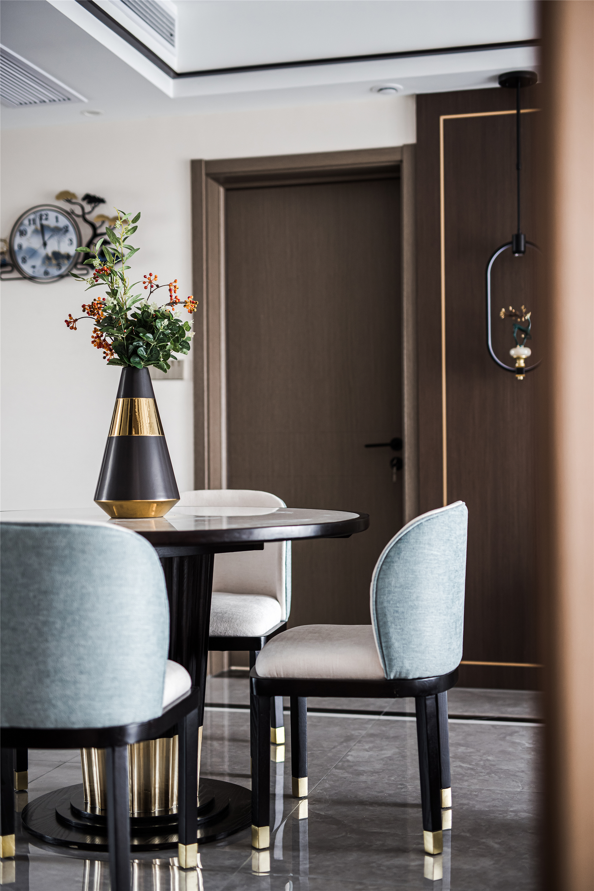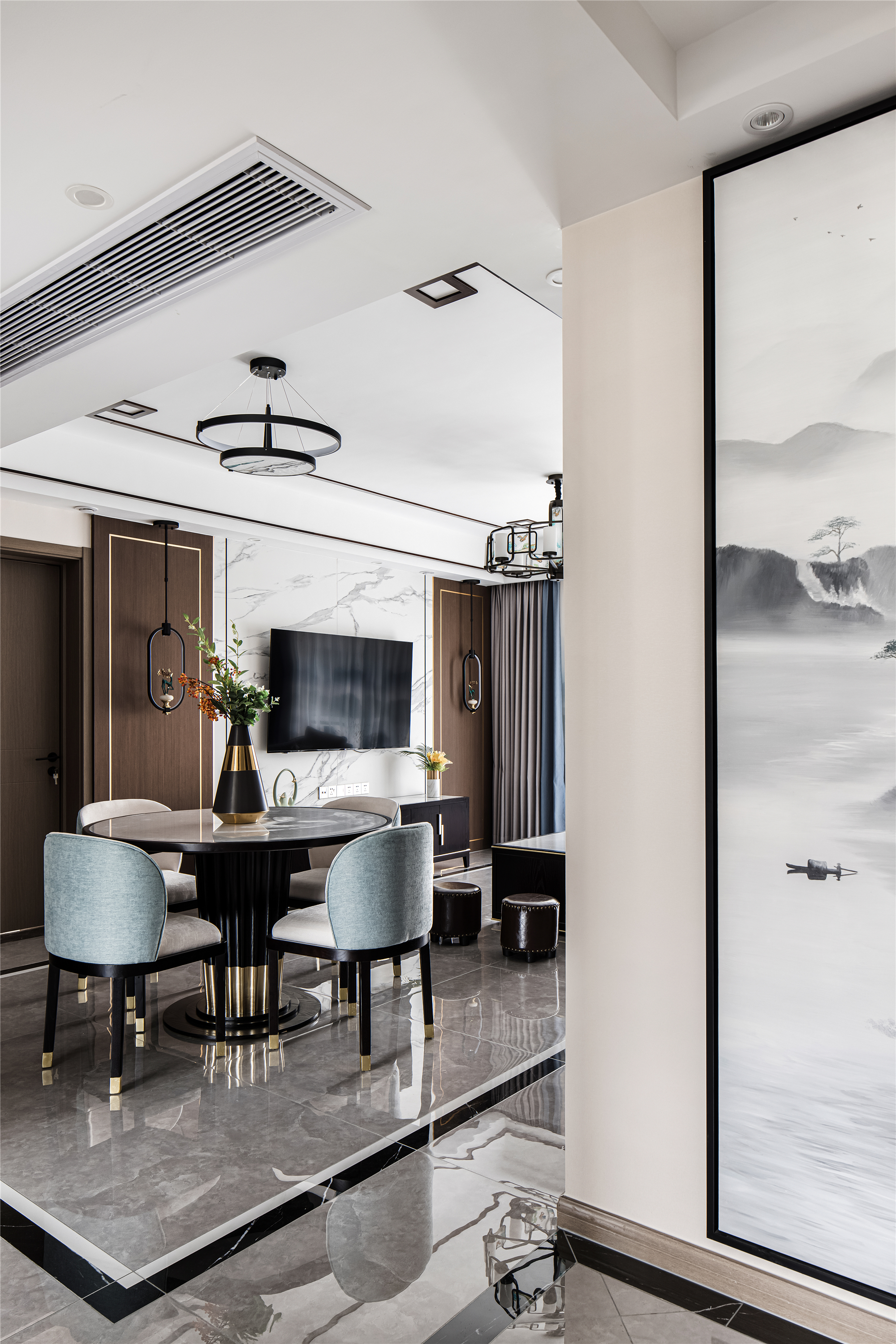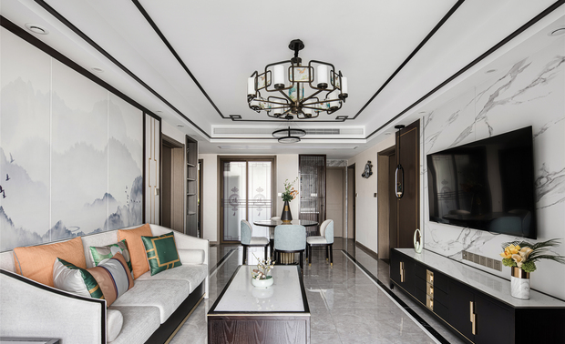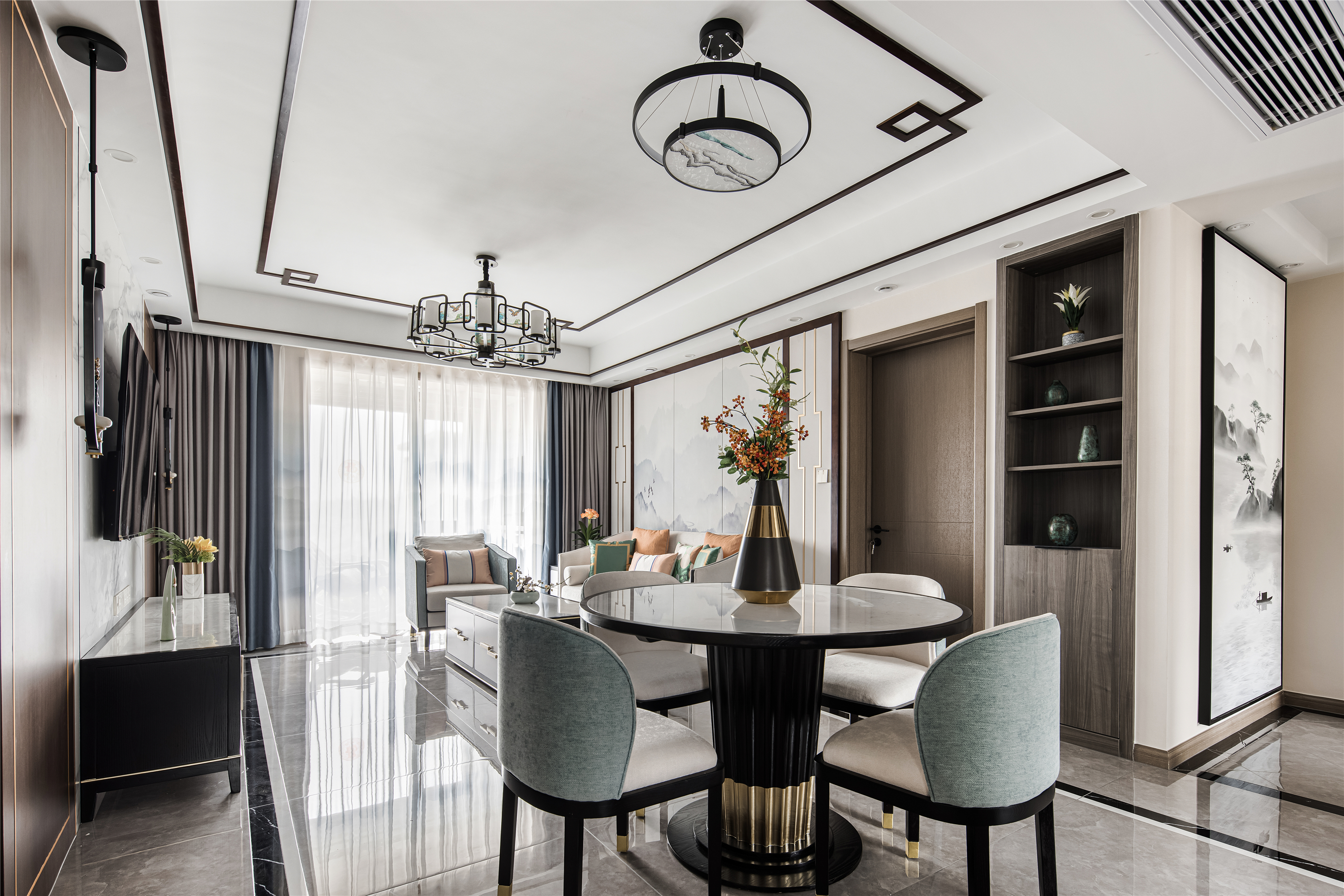 空间布局:客餐厅空间衍脉自深厚邈远的传统文化,从家具的形制、流线、色泽,到灯具,均镌刻着东方诗性的肌理,流露出自信大方的悠悠风骨。