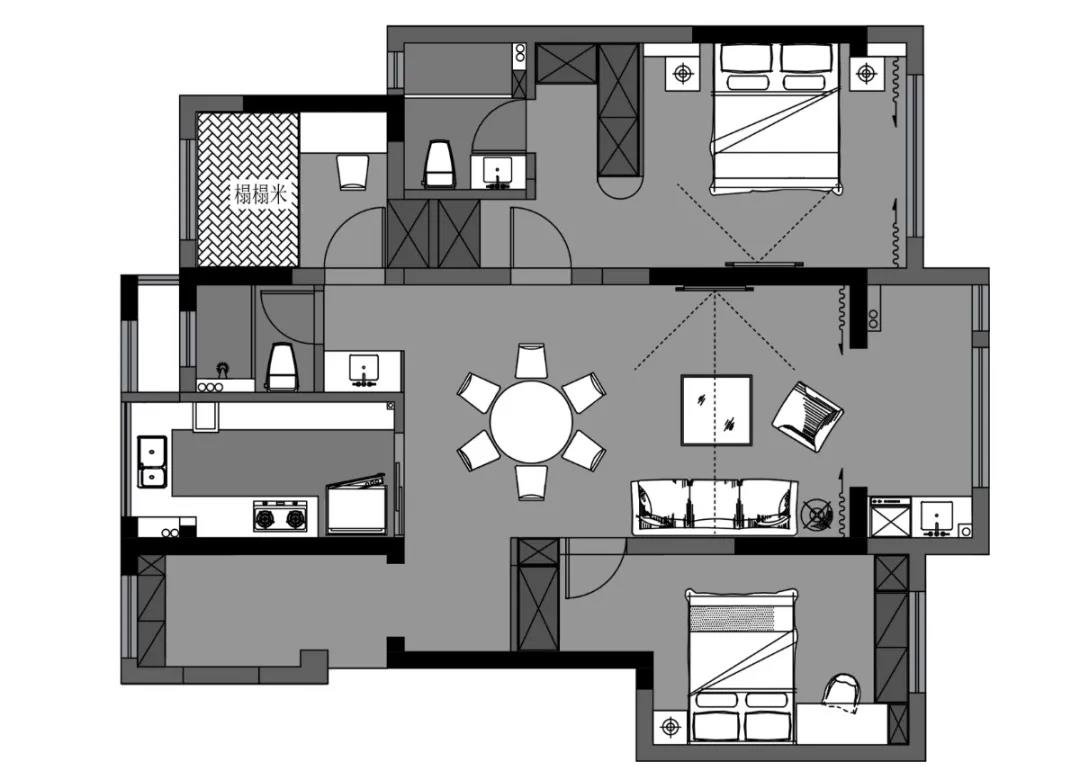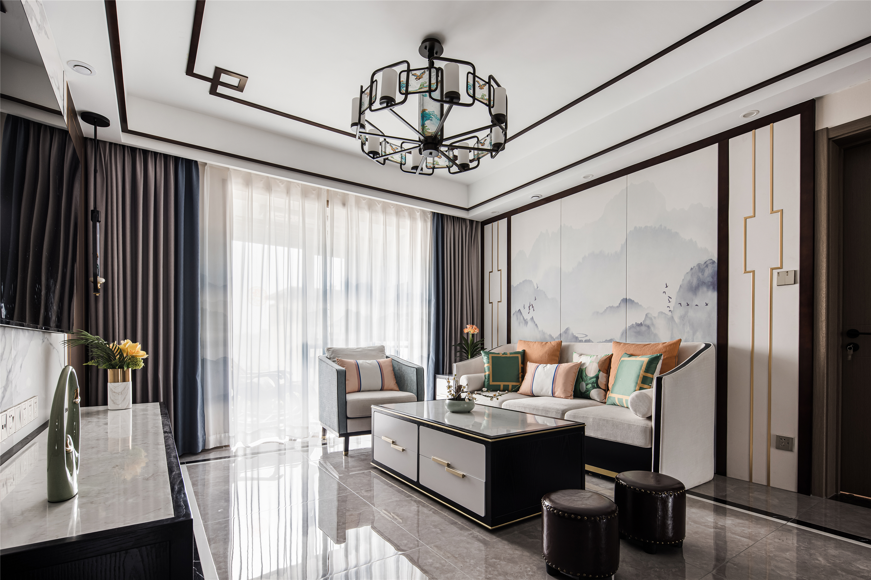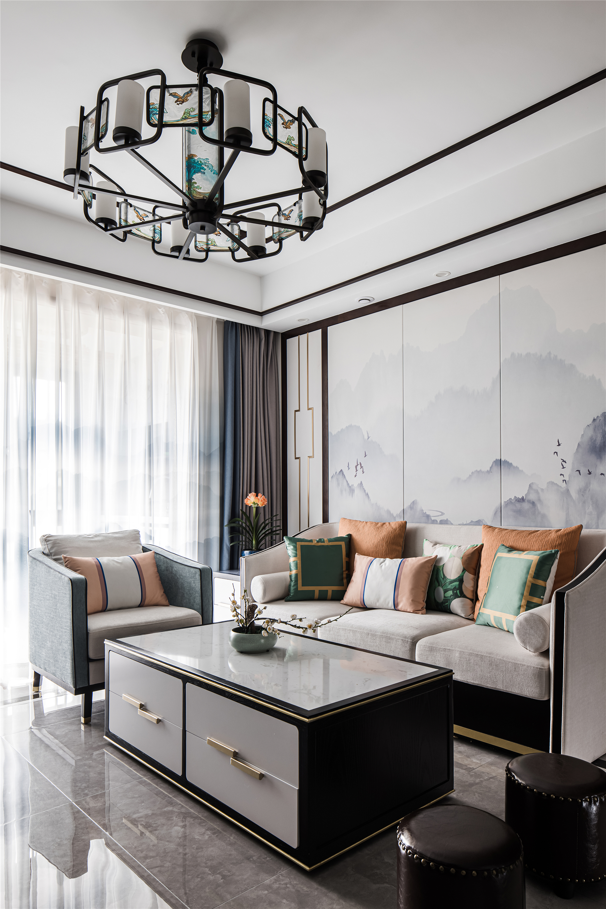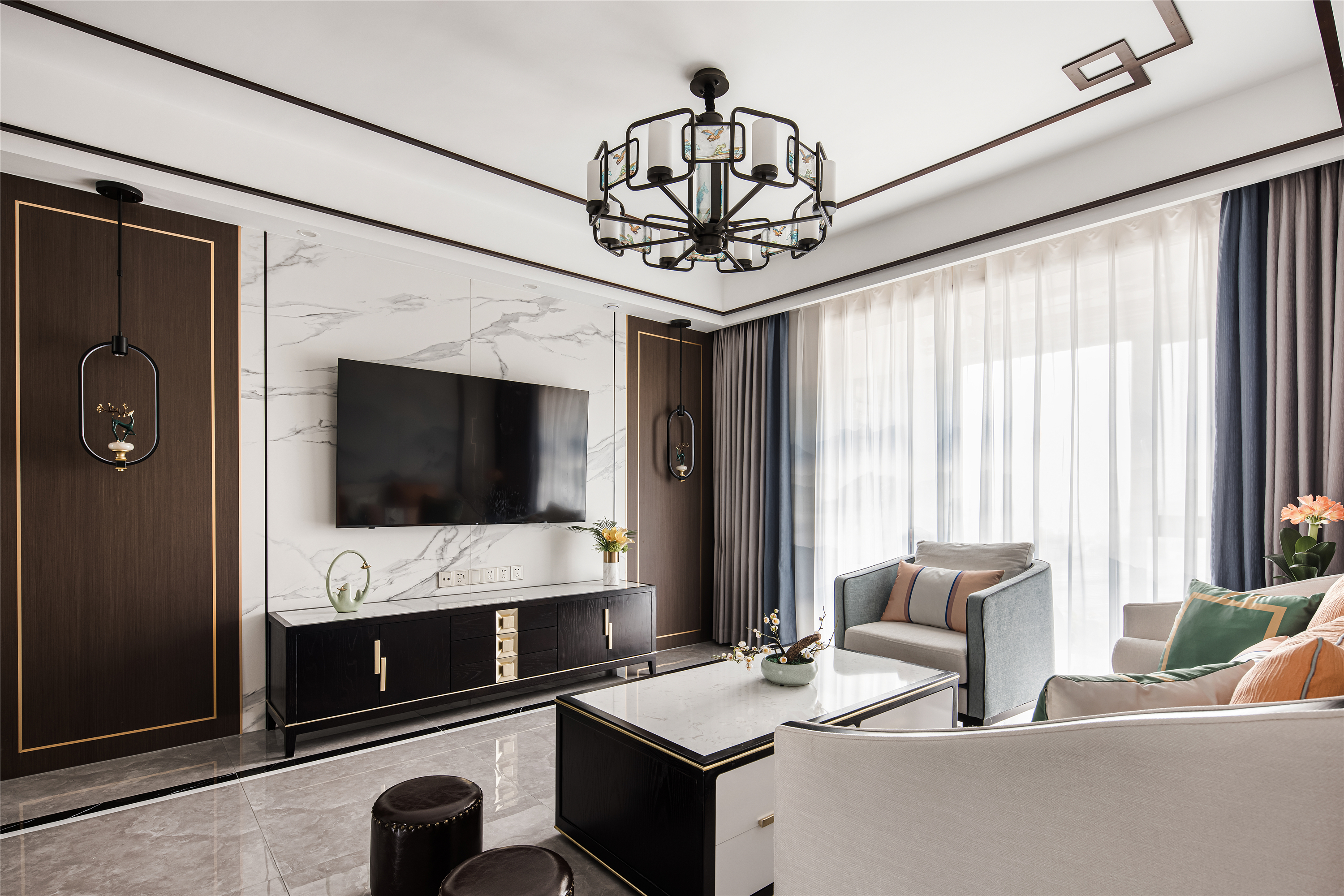 空间布局:客餐厅空间衍脉自深厚邈远的传统文化,从家具的形制、流线、色泽,到灯具,均镌刻着东方诗性的肌理,流露出自信大方的悠悠风骨。