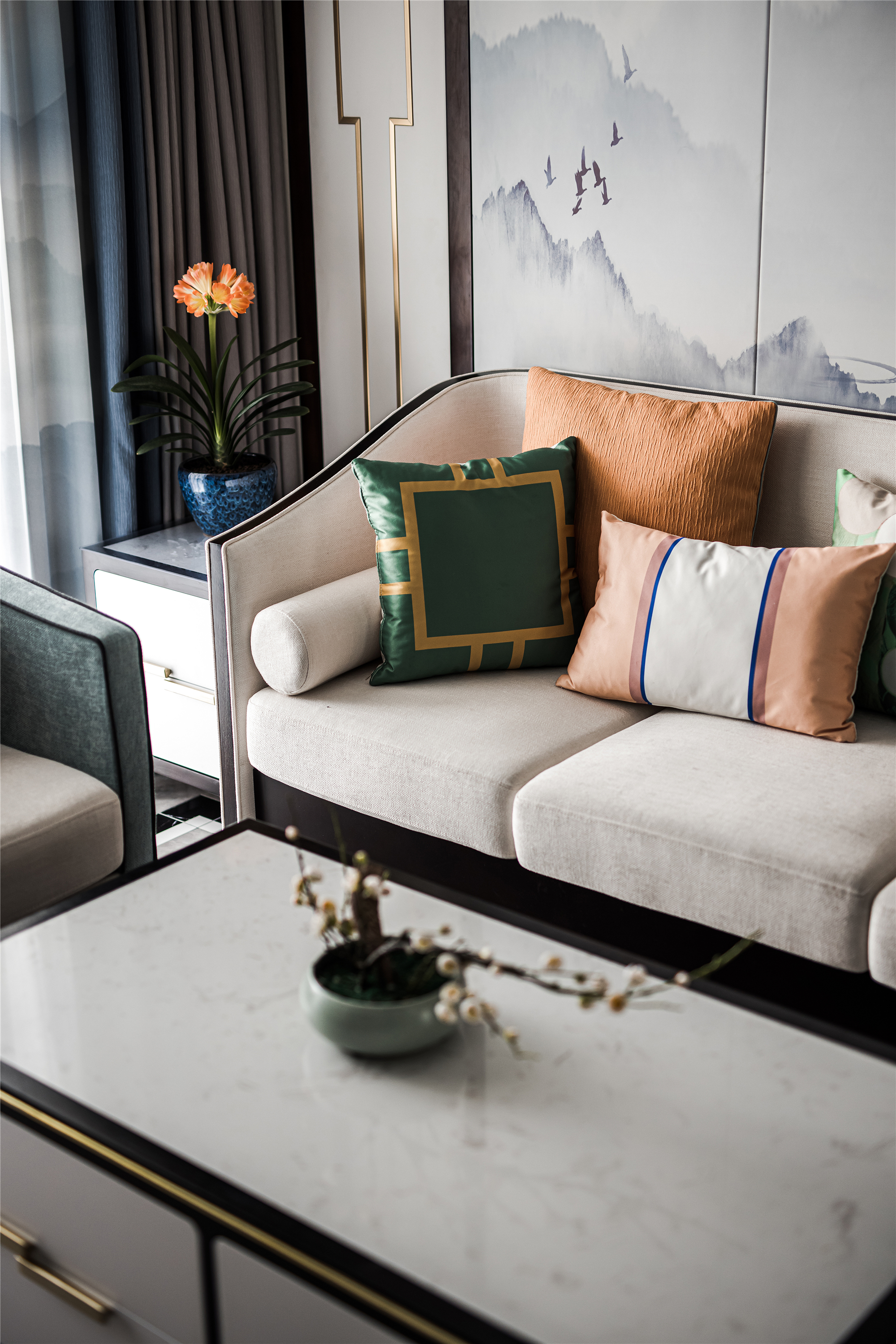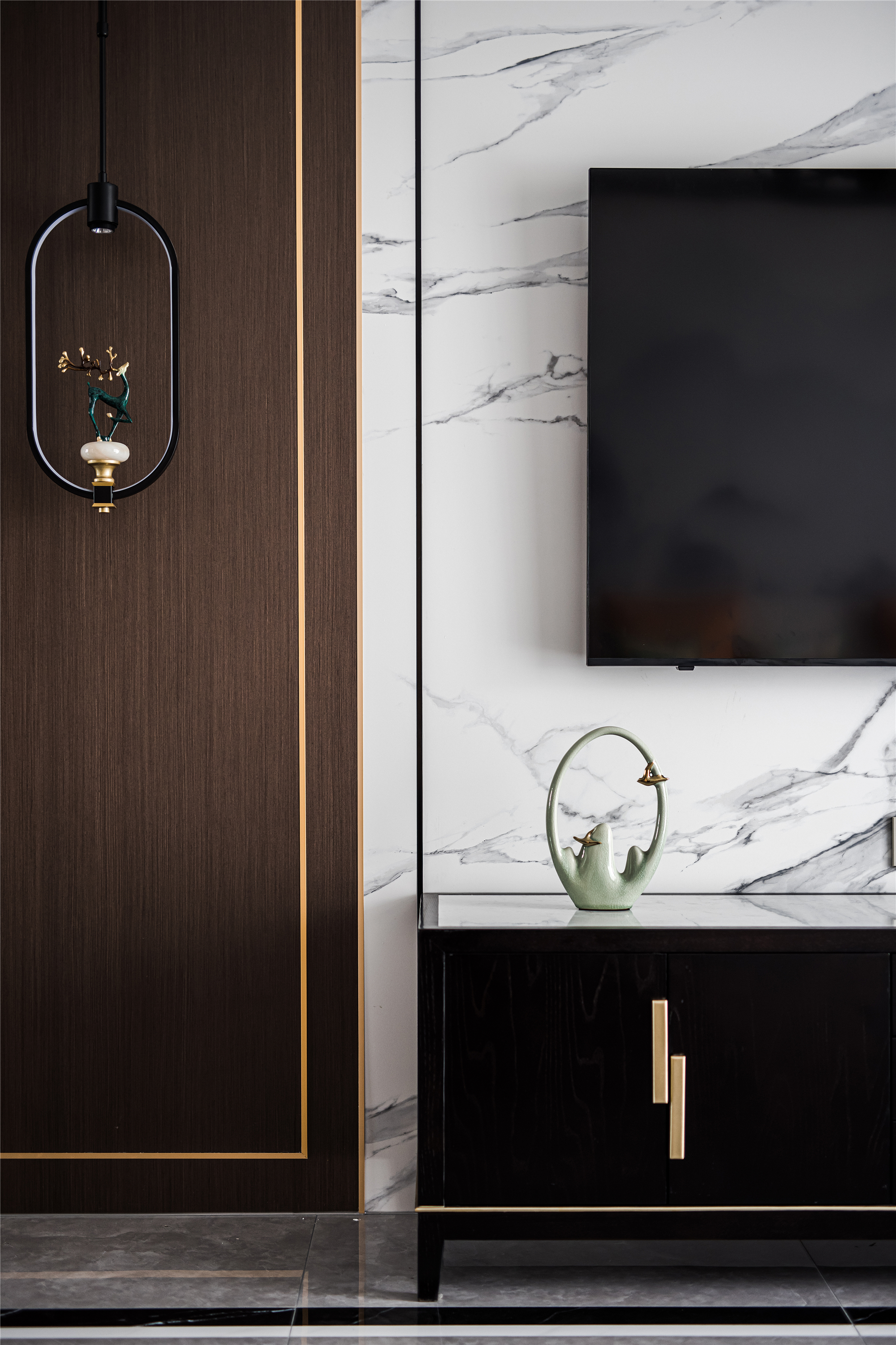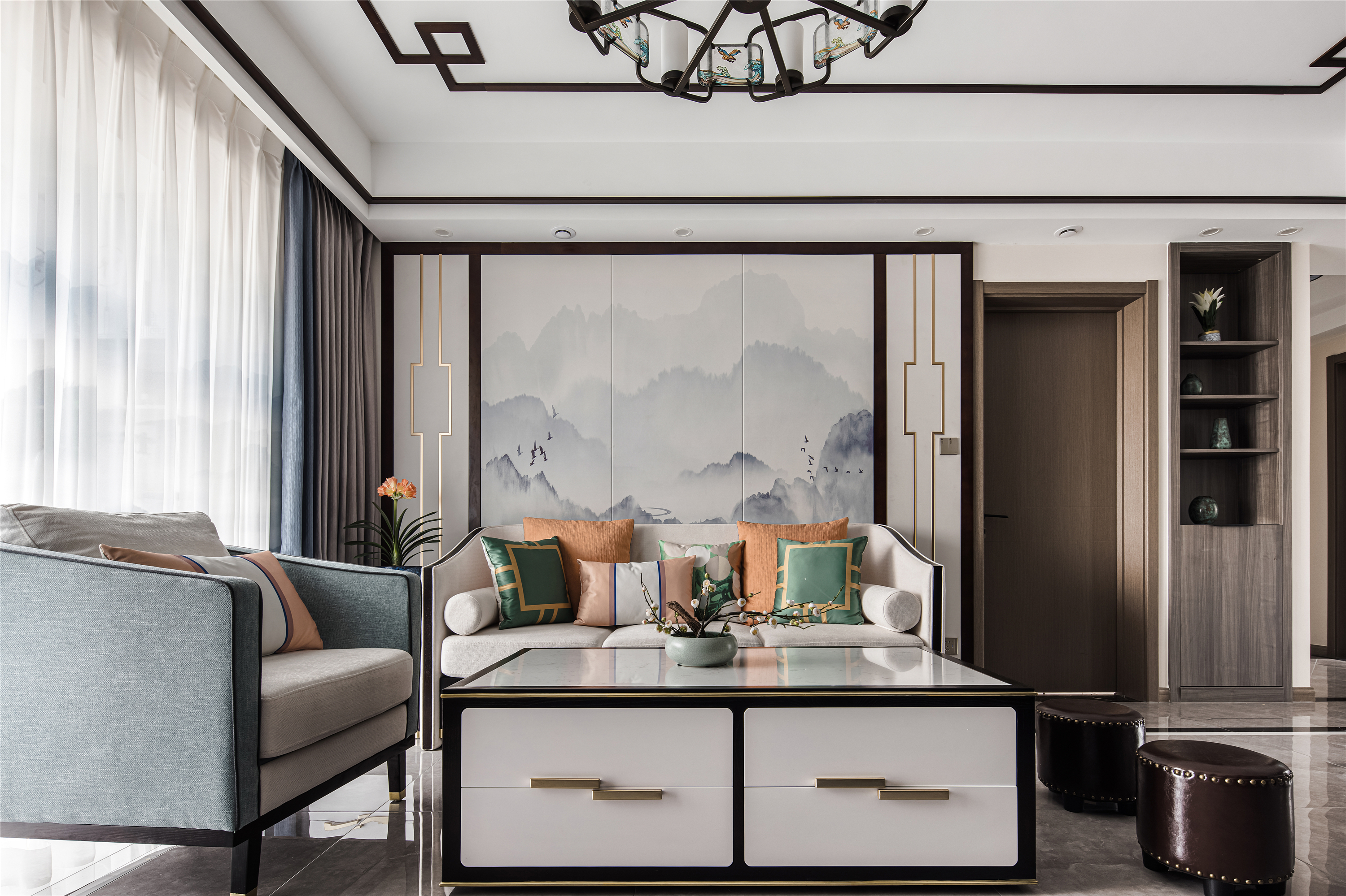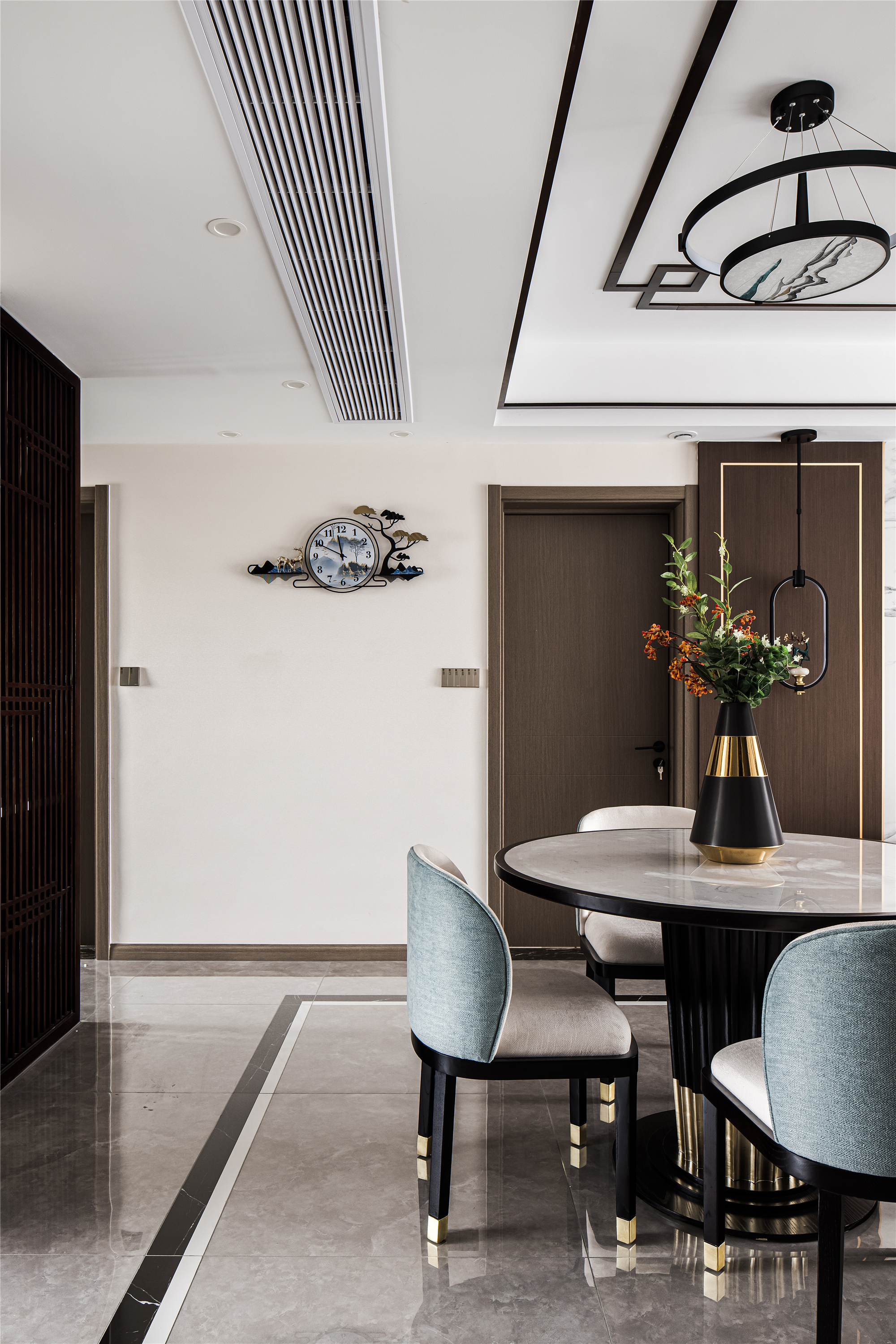 以木纹、水波、花鸟、湖绿色等自然元素为灵感,采用简洁的设计语言融入到序列感十足的中式花纹吊顶、吊灯、花艺等家具的点缀上,赋予整个空间现代东方的美学观感。 -
