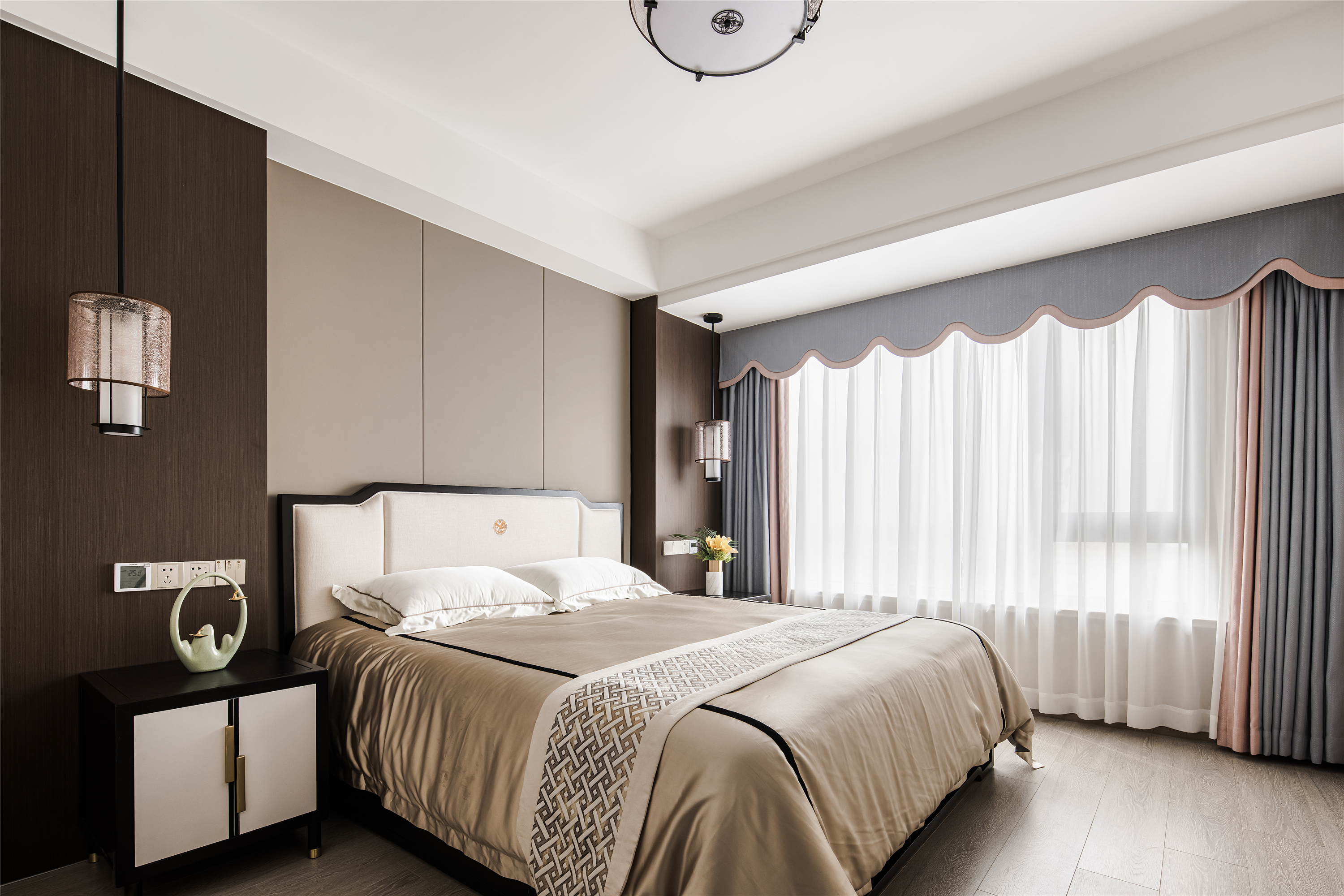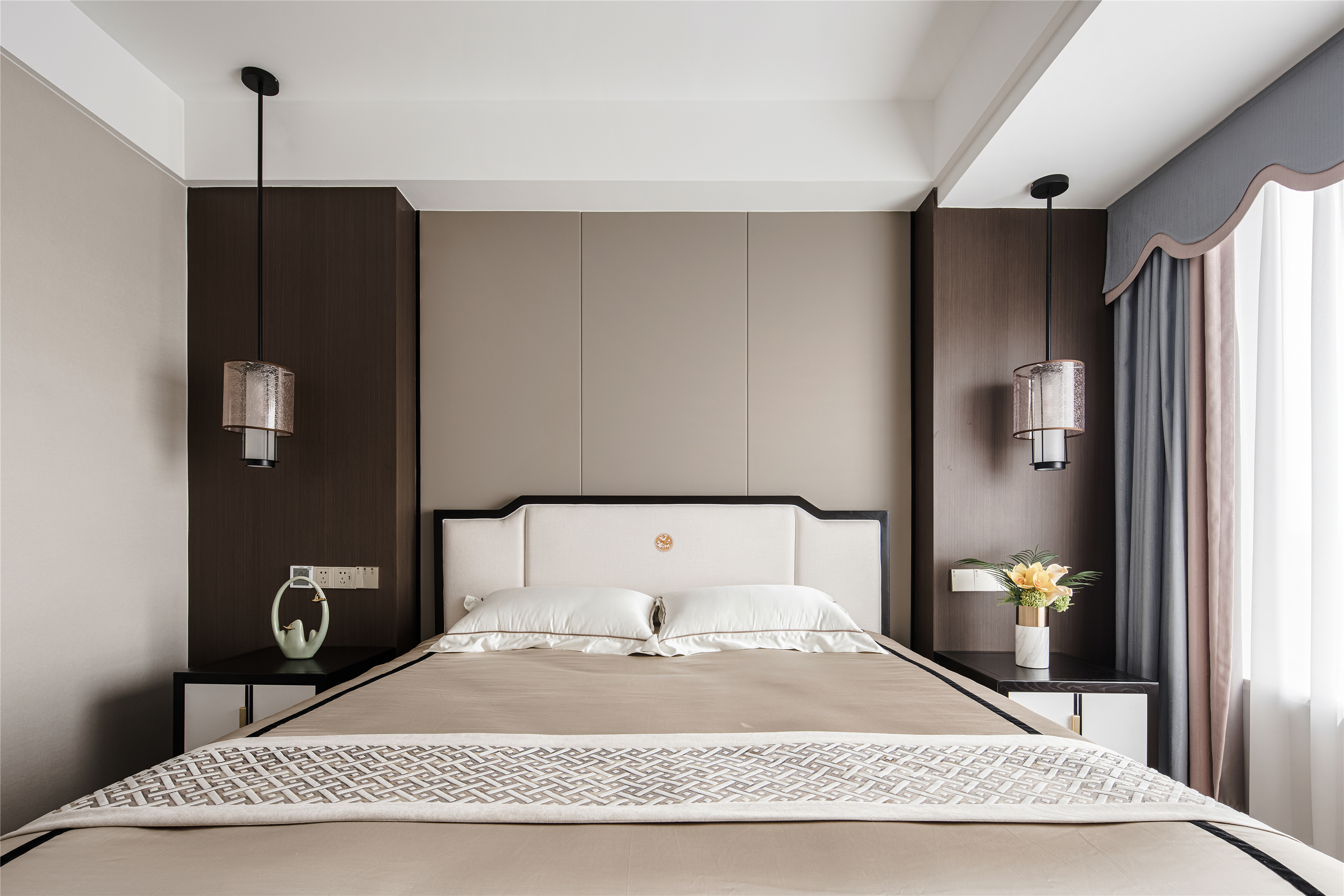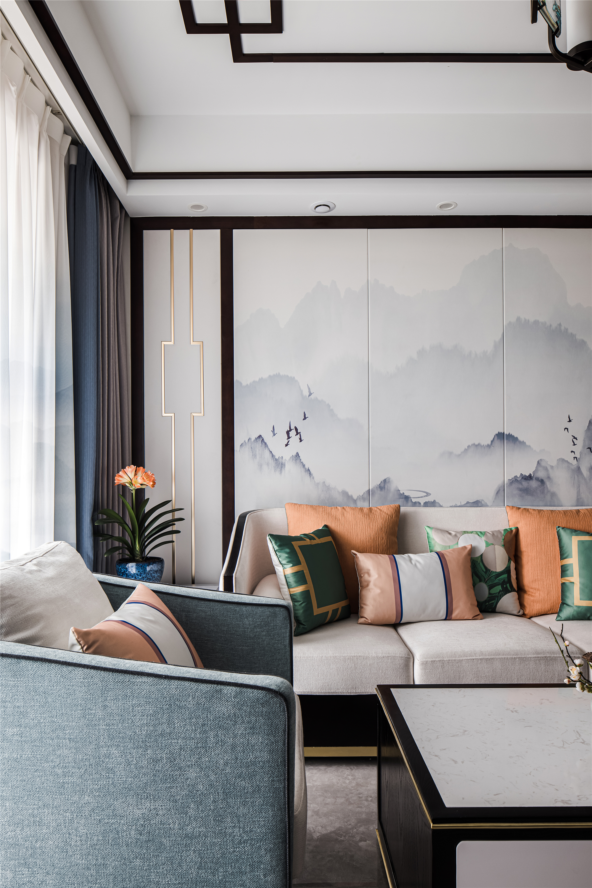 以木纹、水波、花鸟、湖绿色等自然元素为灵感,采用简洁的设计语言融入到序列感十足的中式花纹吊顶、吊灯、花艺等家具的点缀上,赋予整个空间现代东方的美学观感。 -