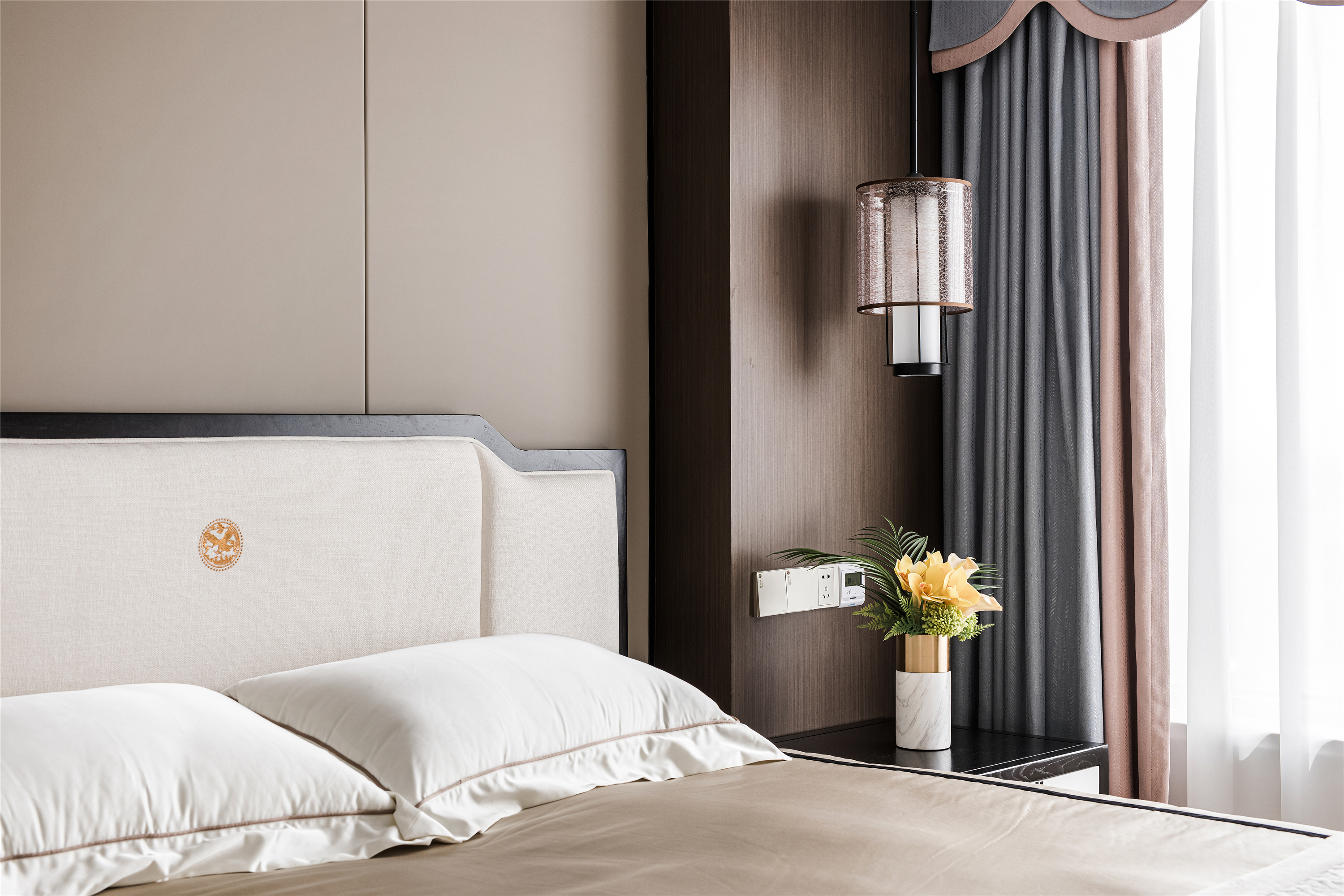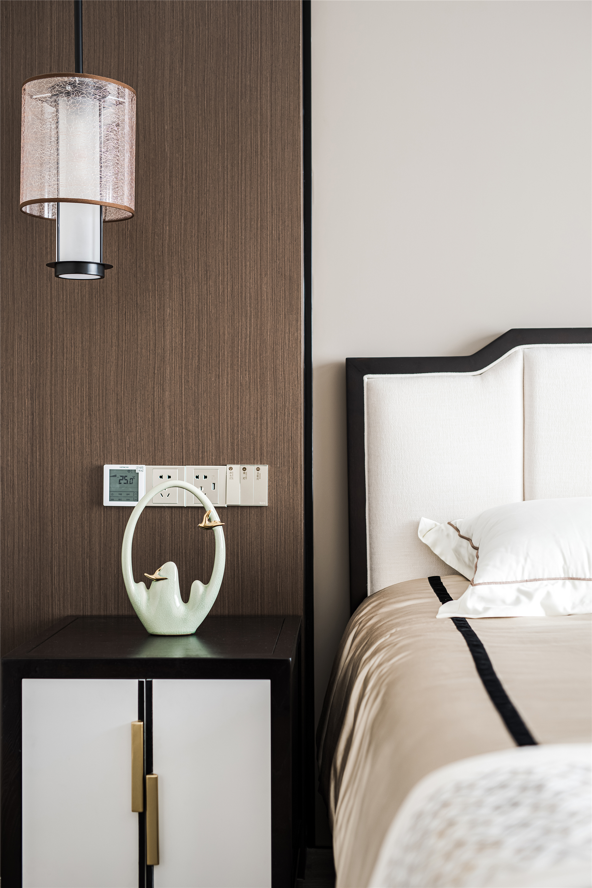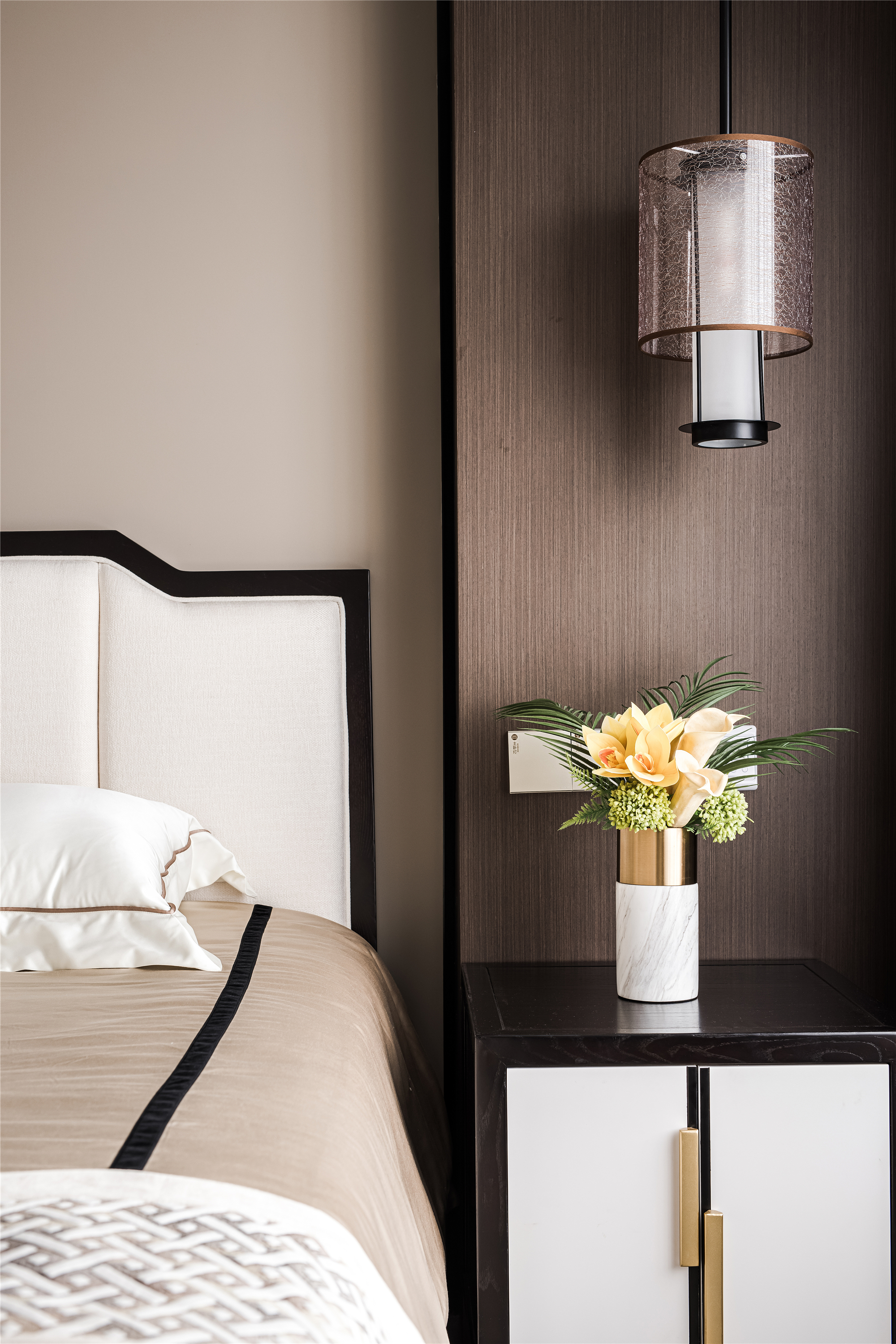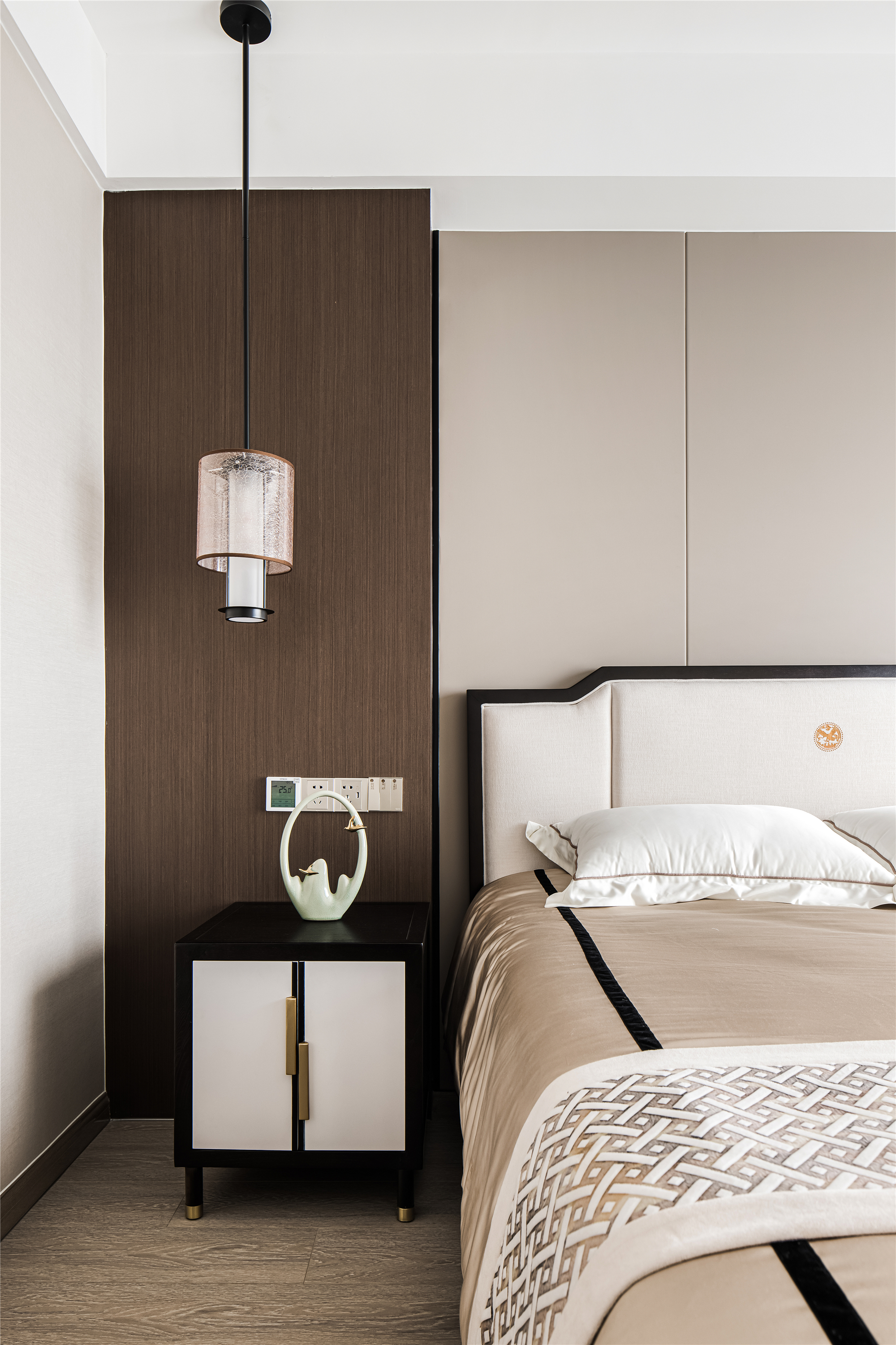 以木纹、水波、花鸟、湖绿色等自然元素为灵感,采用简洁的设计语言融入到序列感十足的中式花纹吊顶、吊灯、花艺等家具的点缀上,赋予整个空间现代东方的美学观感。 -