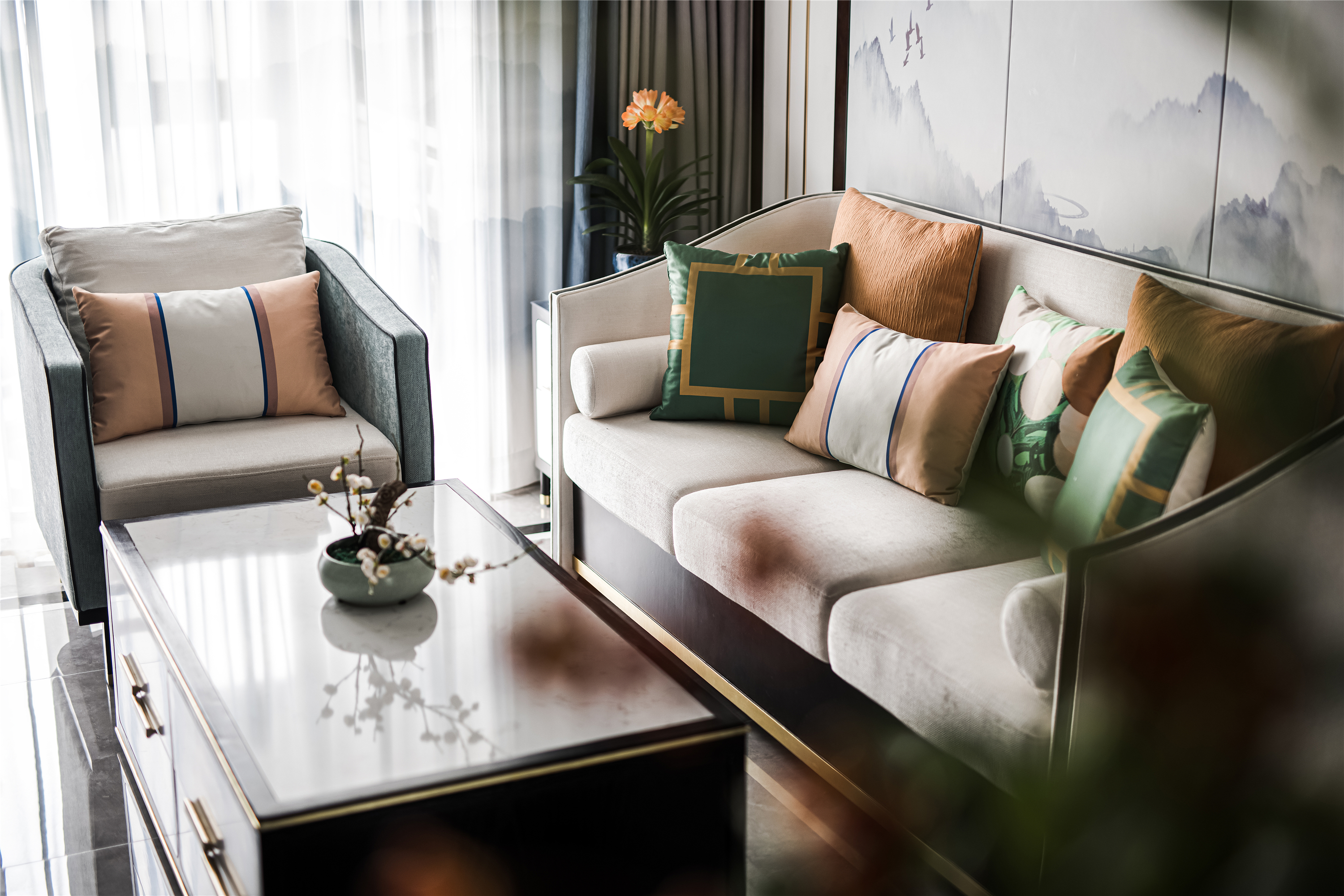 空间意境:淡雅灰调,暖光铺韵,尘世繁华间隐匿着的宁静祥和由画及室,延展到整个室内,一时竟分不清到底是人在画中,还是画在房中。