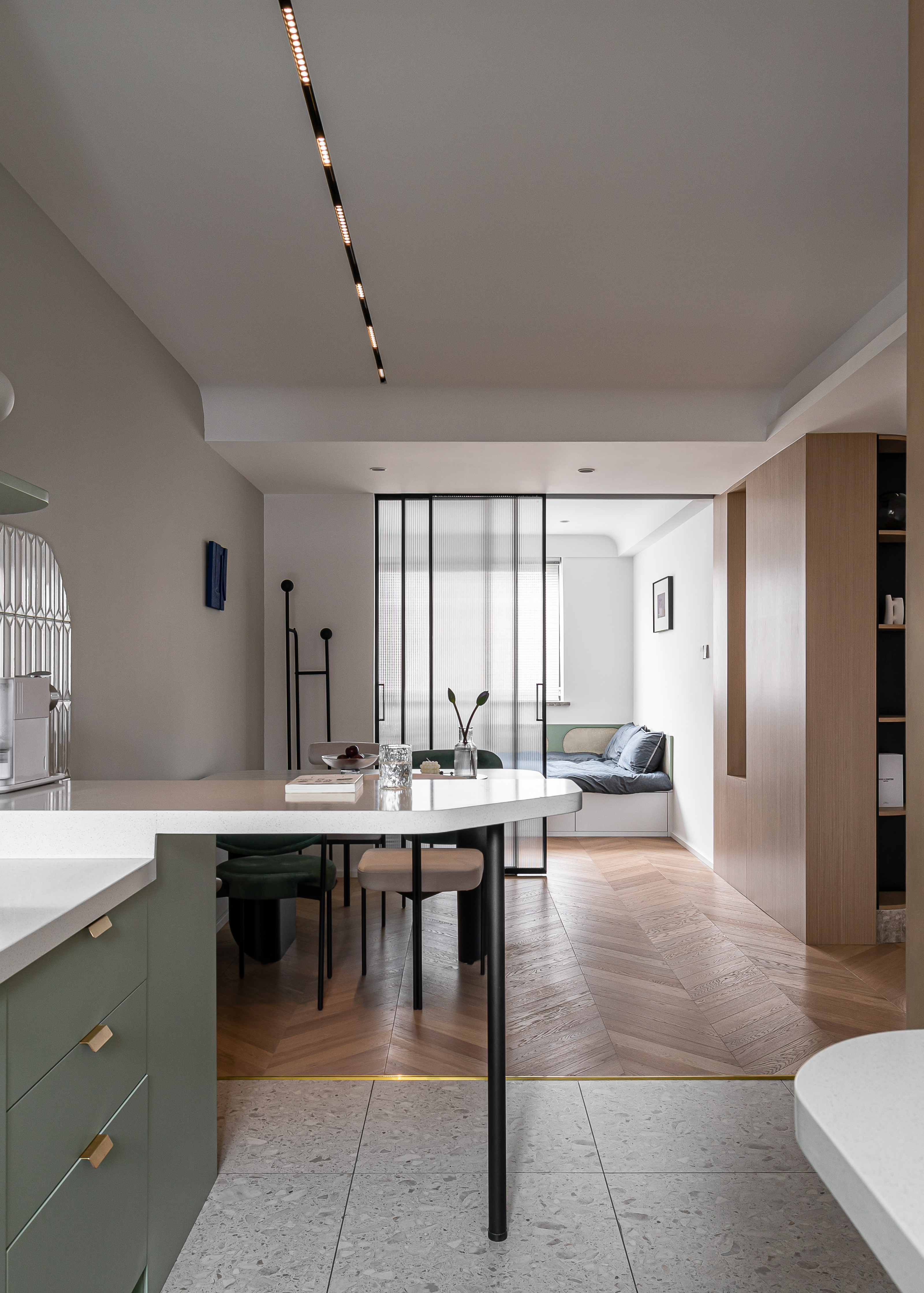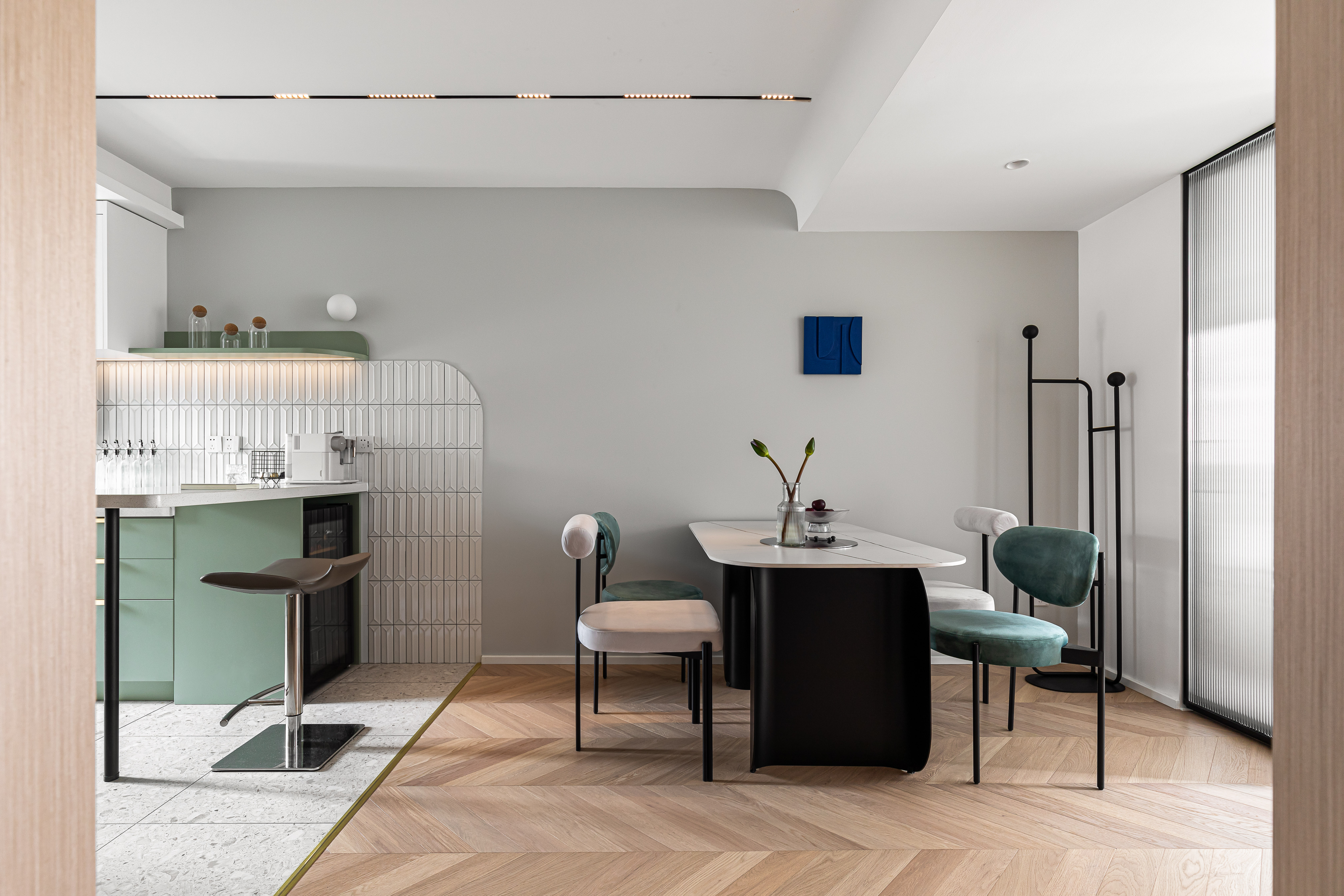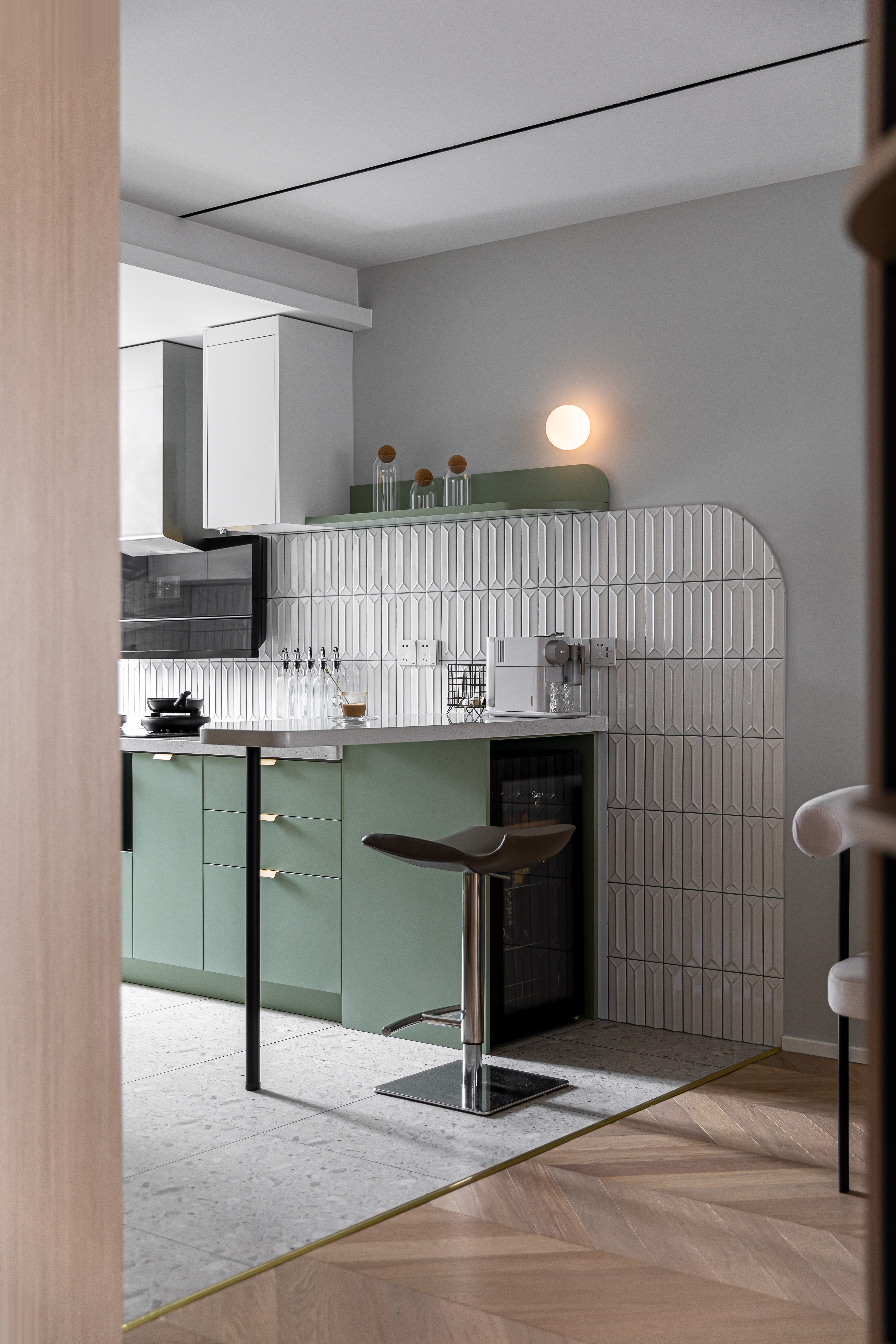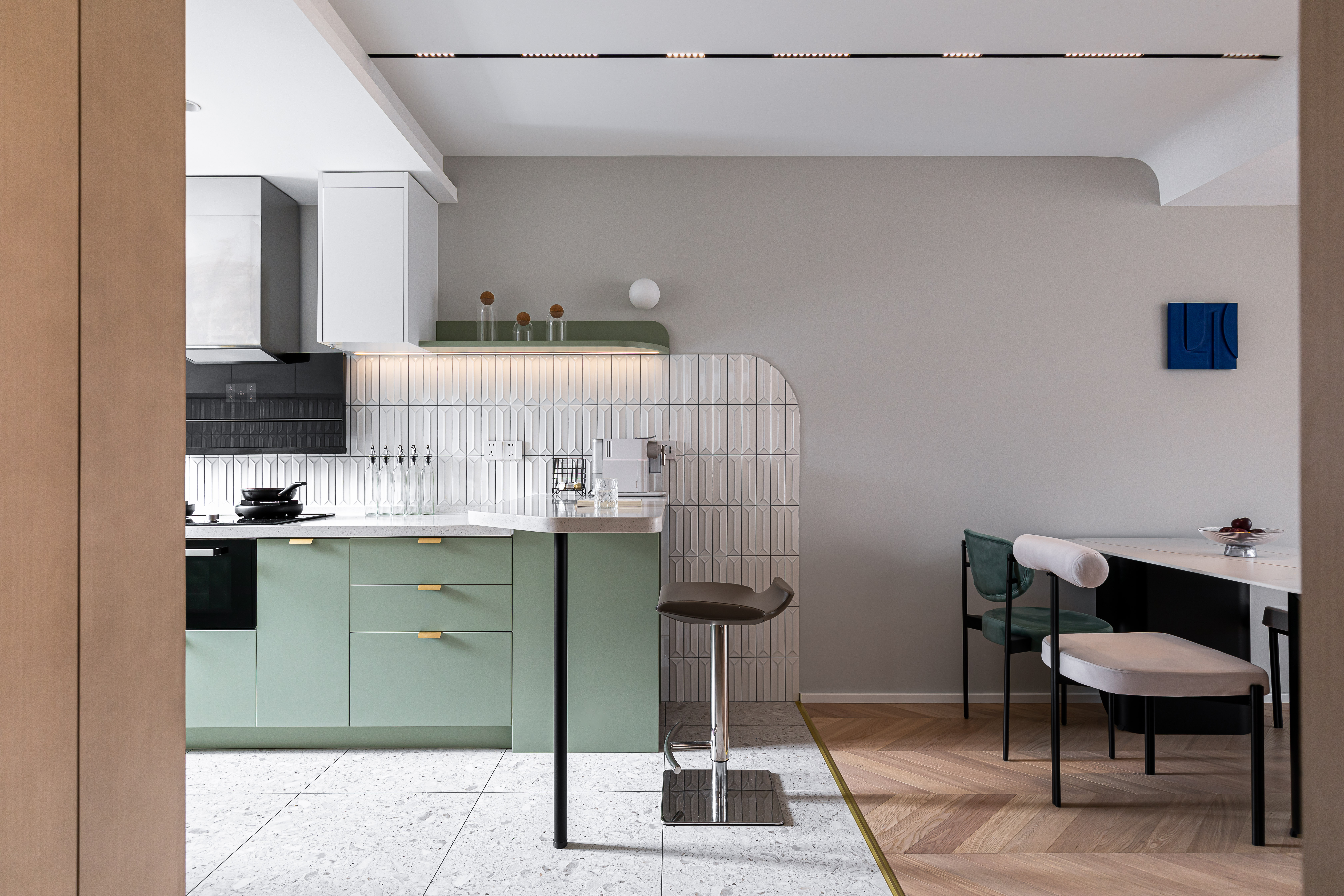 入户映入眼帘的是厨房吧台区,没有过度缓冲,干净的白色立体砖搭配着灰绿色橱柜,墙砖转角处做弧形弱化棱角;灰色的水磨石地砖与木质的地板碰撞张弛有度,呈现一种岁月静好的安稳和素朴.